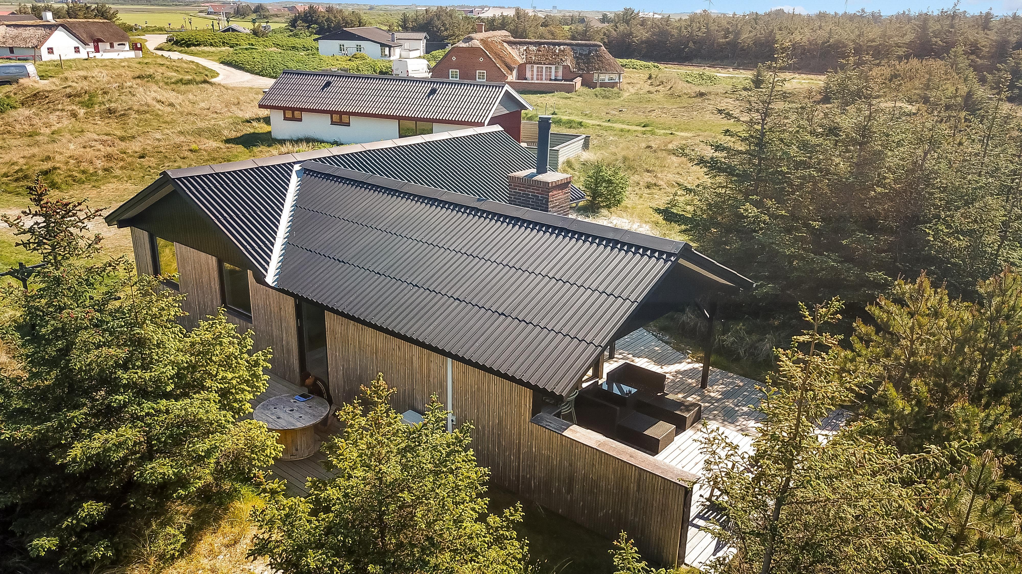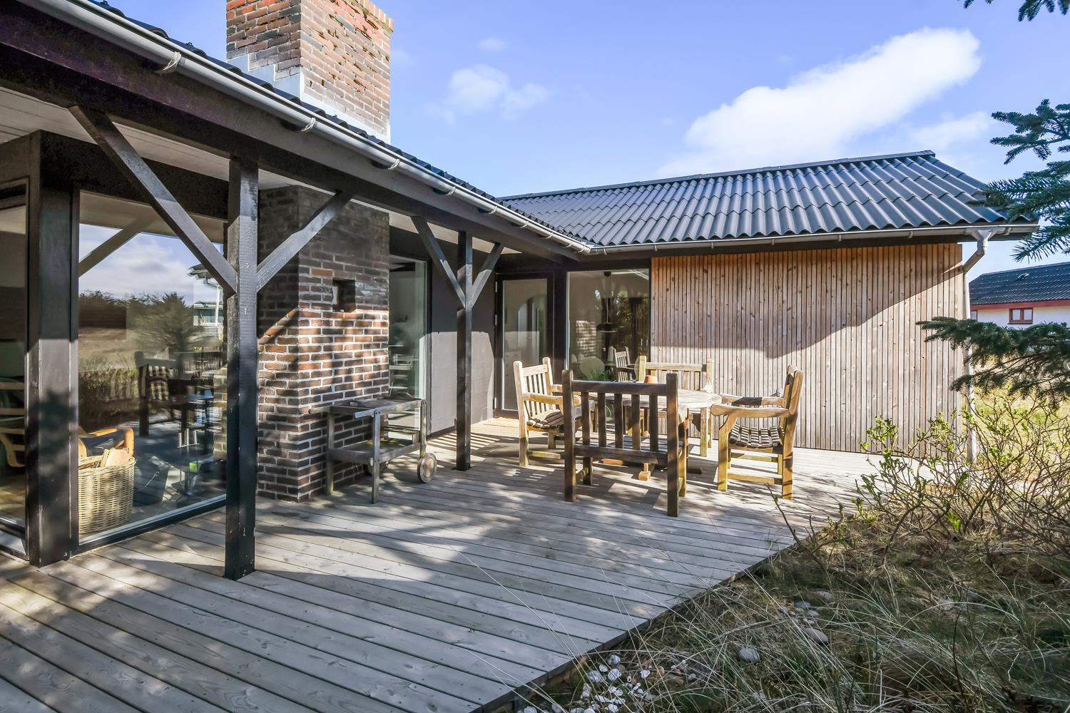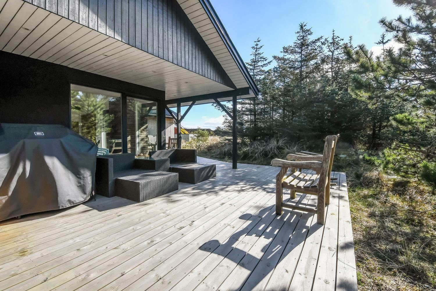 Huset er omgivet af et dejlig stort, delvis overdækket træterrasseanlæg med forskellige havemøbler, loungesæt og gasgrill, så der altid kan findes en plads i solen eller i læ for vind. Fra spiseafdelingen og opholdsstuen er der adgang til terrasserne. Gratis gas til grillen.