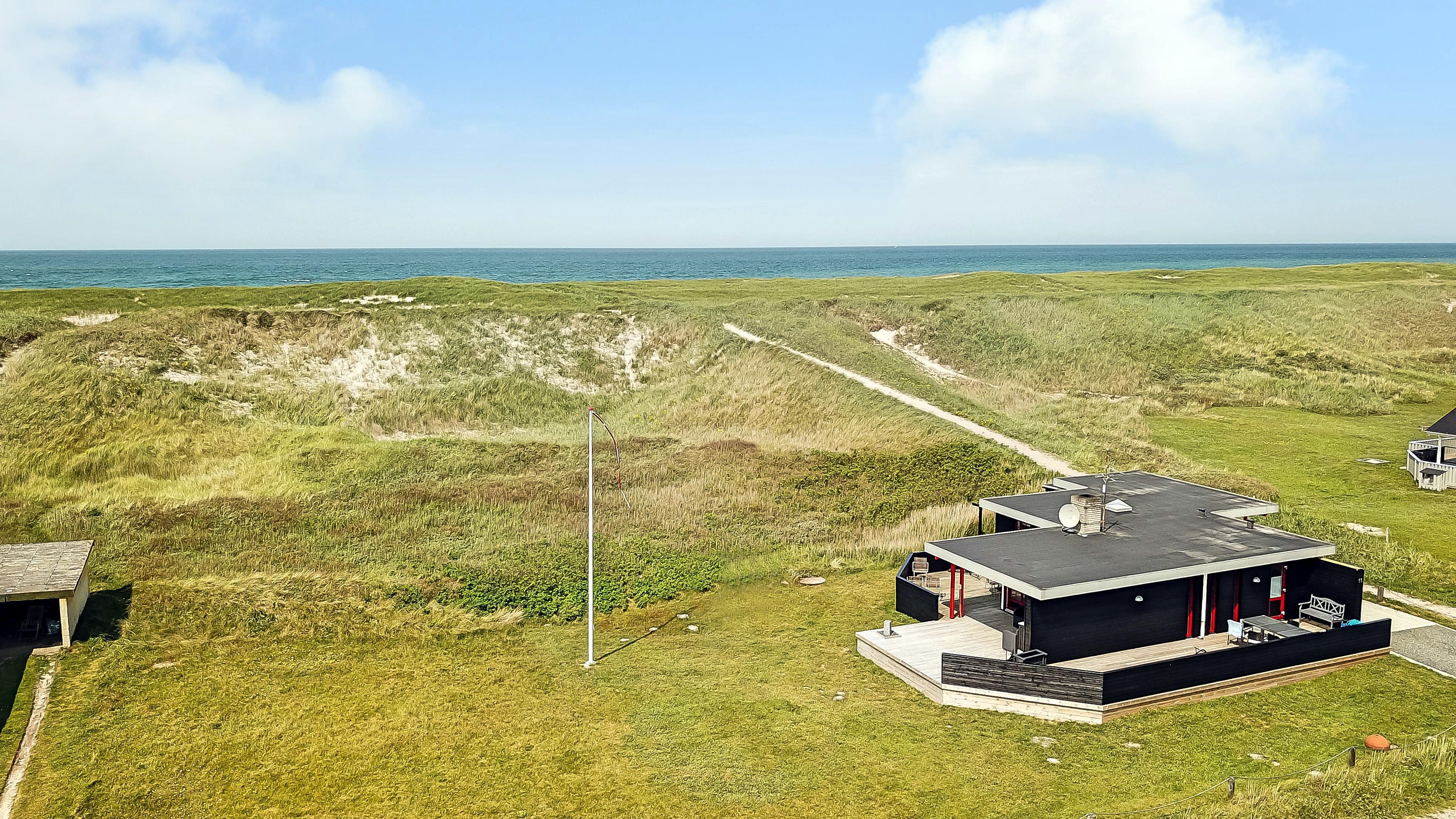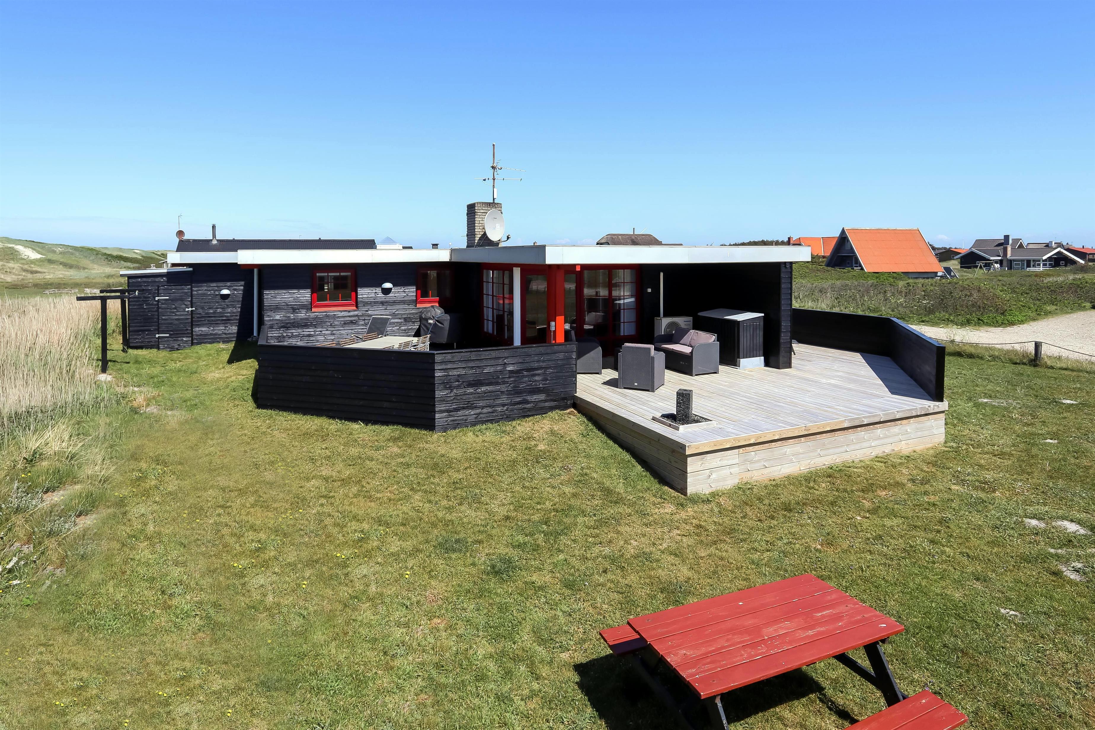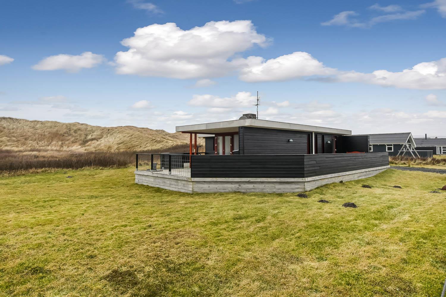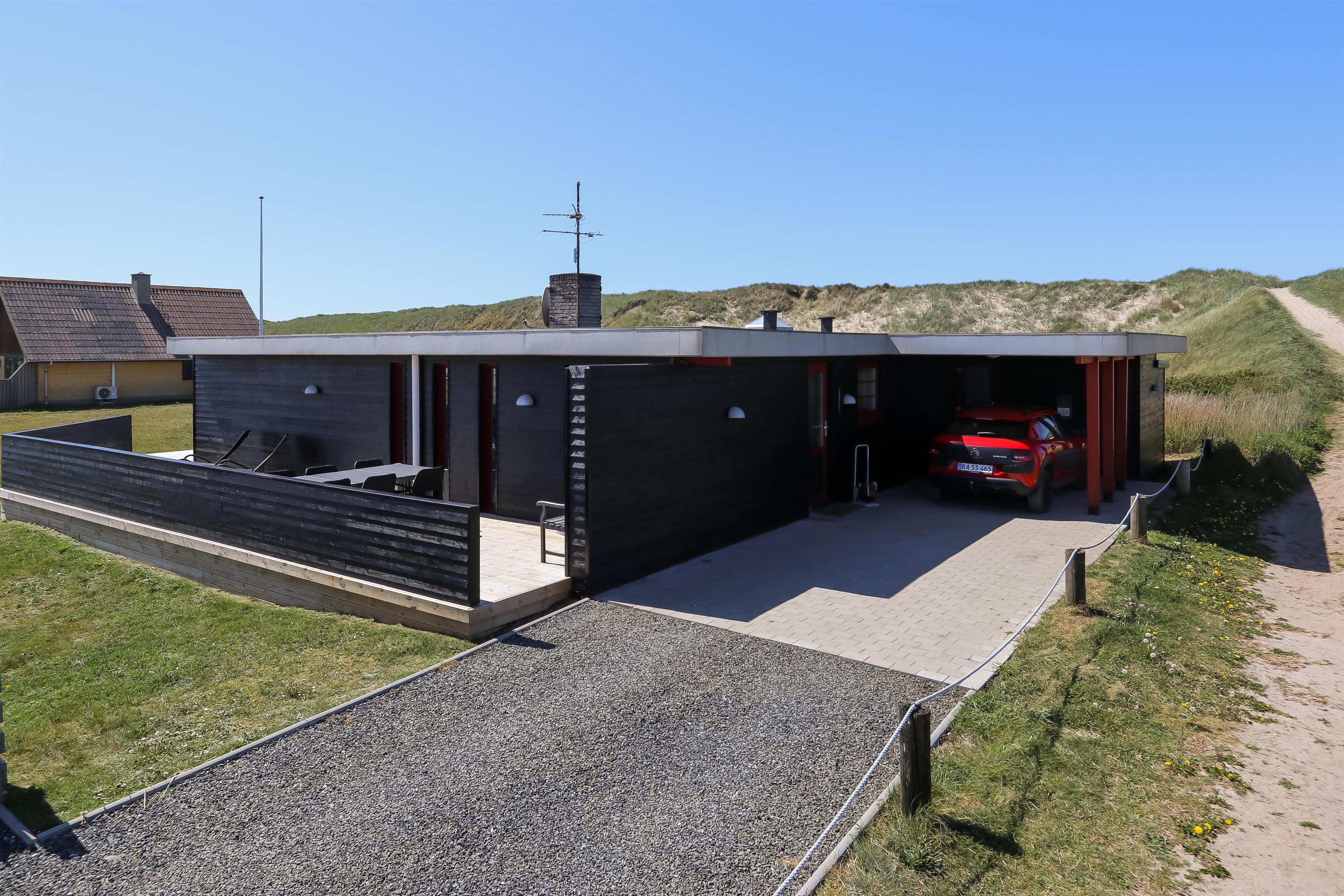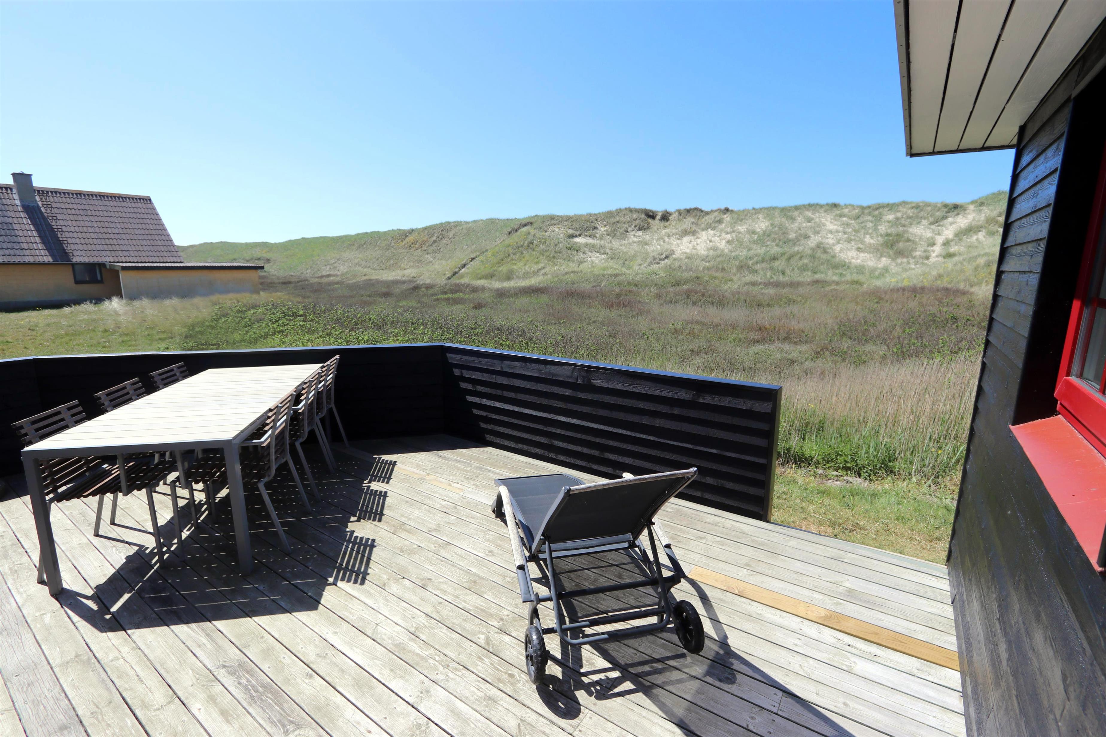 Huset har udgang til en dejlig, delvis overdækker, indhegnet terrasse med udsigt til de høje klitter. Der er havemøbler og liggestole. Er der børn er der rige muligheder på den over 3.000 m2 store grund. Parker bil og nyd dette charmerende sommerhus tæt ved Vesterhavet. Tænd grillen og spis aftensmaden på den dejlige terrasse til lyden af bølger der som skyller i land lige på den anden side af de betagende klitter som ligger ca. 100 m fra huset.