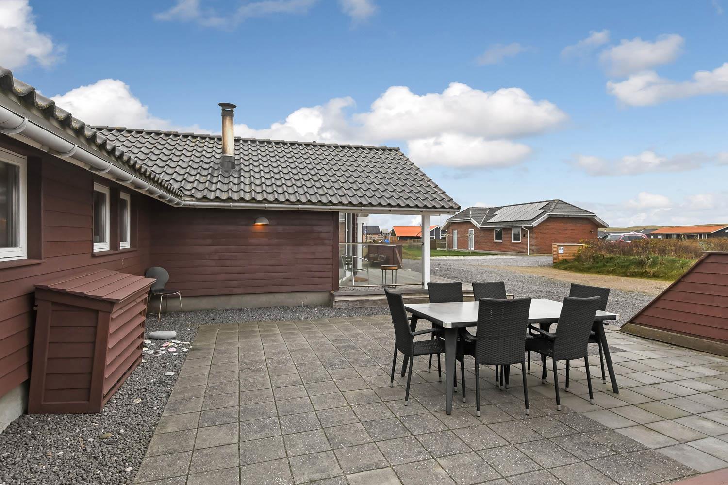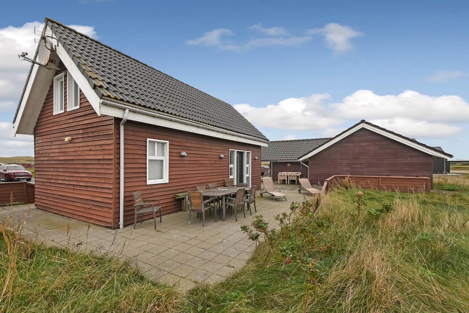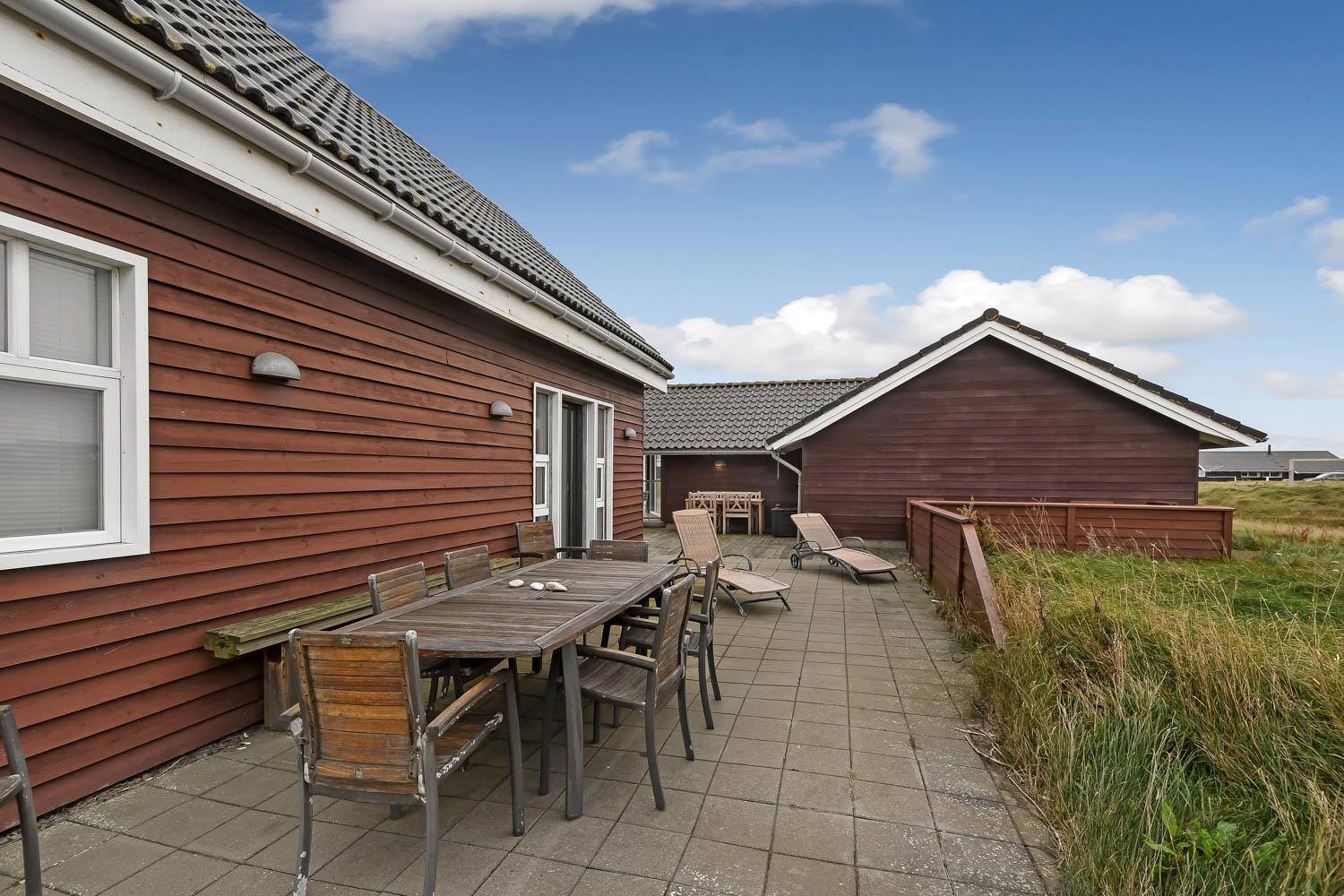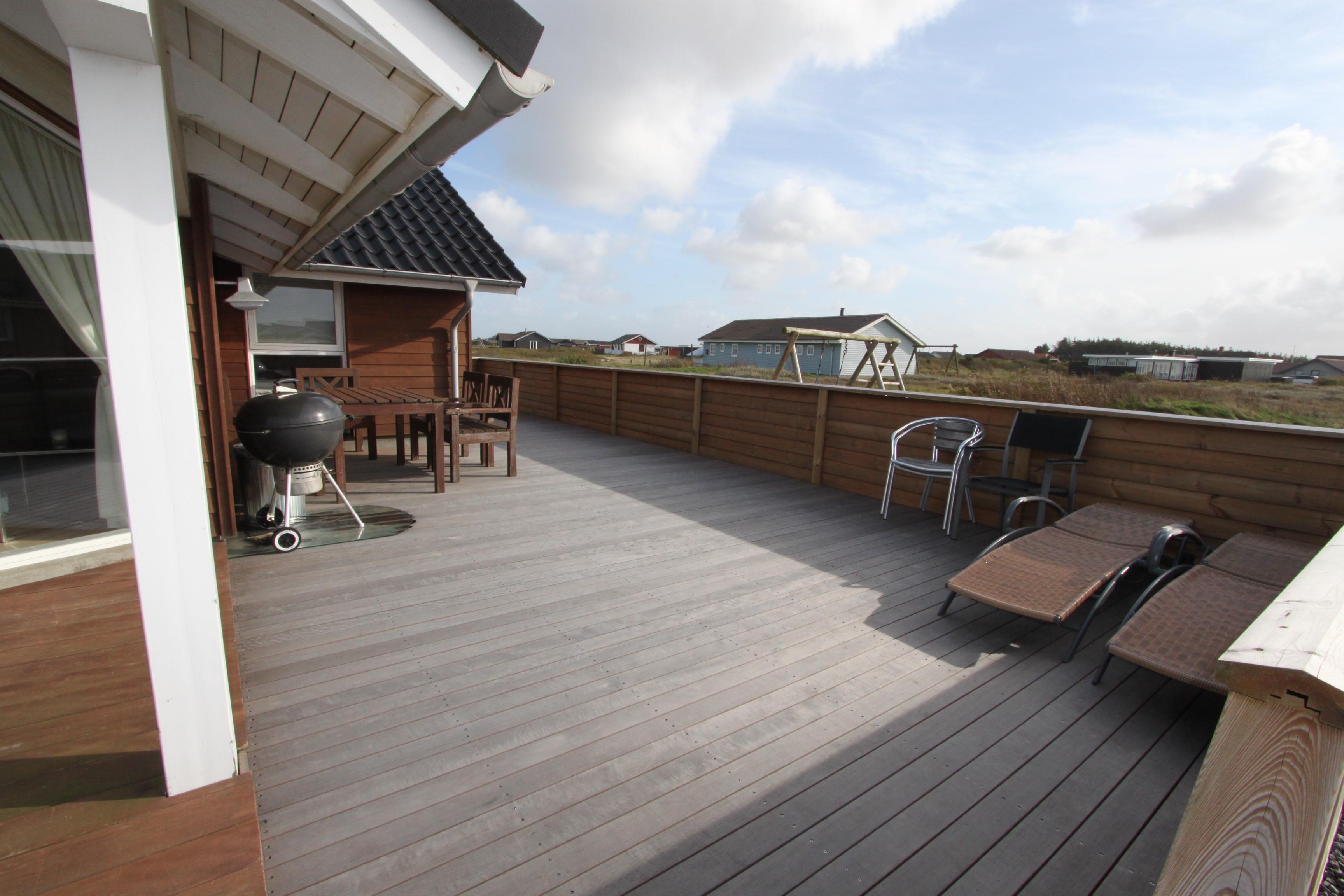 Huset er beliggende på en 1440 m2 naturgrund tæt på Vesterhavet. Dejlige terrasse hvoraf noget af det er overdækket. Der er altid mulighed for at finde et læ hjørne eller en plads i solen på terrassen. Havemøbler, solvogne og grill er også standard. Anneks med playstation 3, WII, musikanlæg, TV og bordtennis kan lejes med ekstra for kr. 725 pr. uge bestilles og betales ved ankomst. Et fantastisk feriehus for en stor familie eller 2 familier som ønsker at rejse sammen.