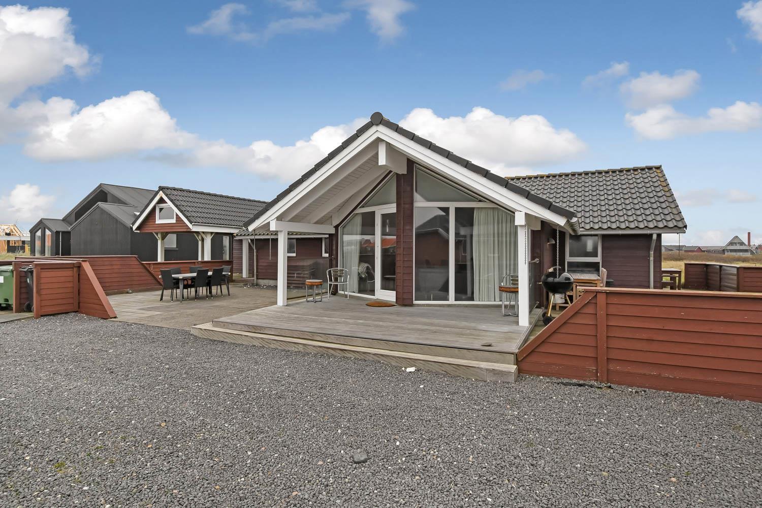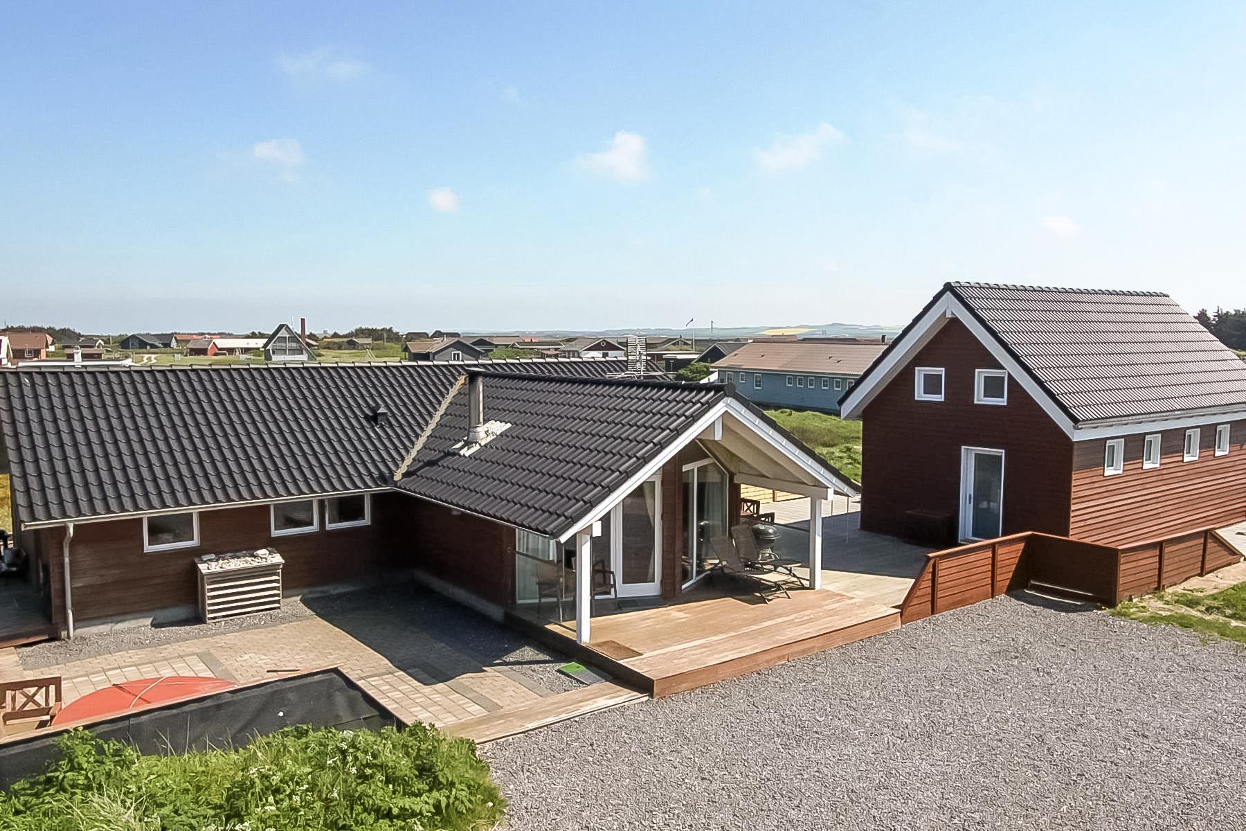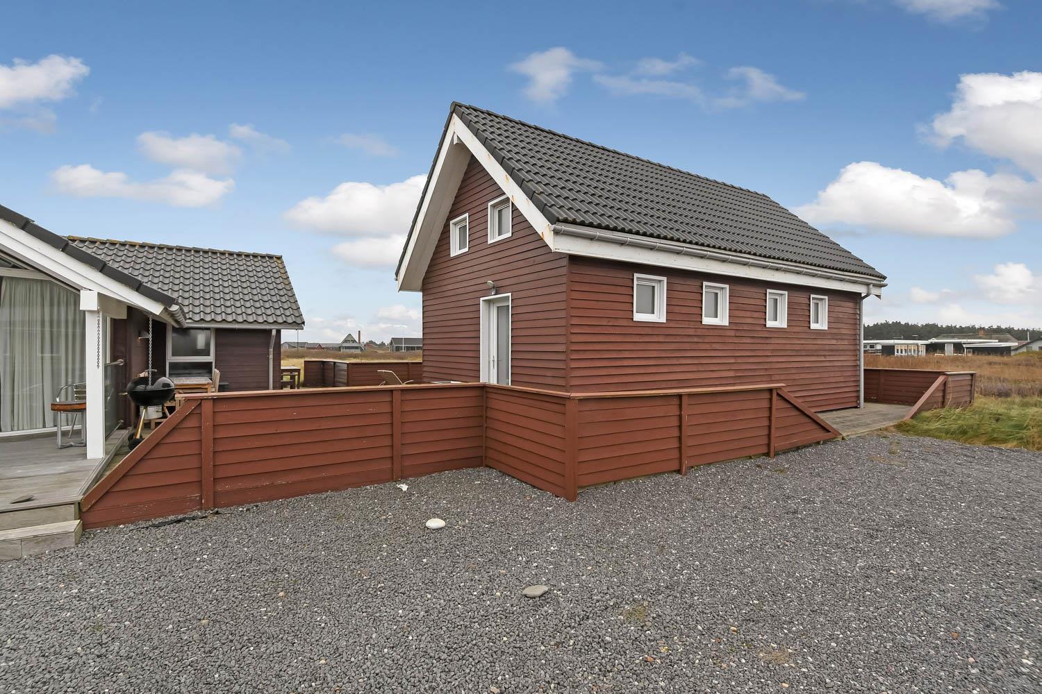 Huset er beliggende på en 1440 m2 naturgrund tæt på Vesterhavet. Dejlige terrasse hvoraf noget af det er overdækket. Der er altid mulighed for at finde et læ hjørne eller en plads i solen på terrassen. Havemøbler, solvogne og grill er også standard. Anneks med playstation 3, WII, musikanlæg, TV og bordtennis kan lejes med ekstra for kr. 725 pr. uge bestilles og betales ved ankomst. Et fantastisk feriehus for en stor familie eller 2 familier som ønsker at rejse sammen.