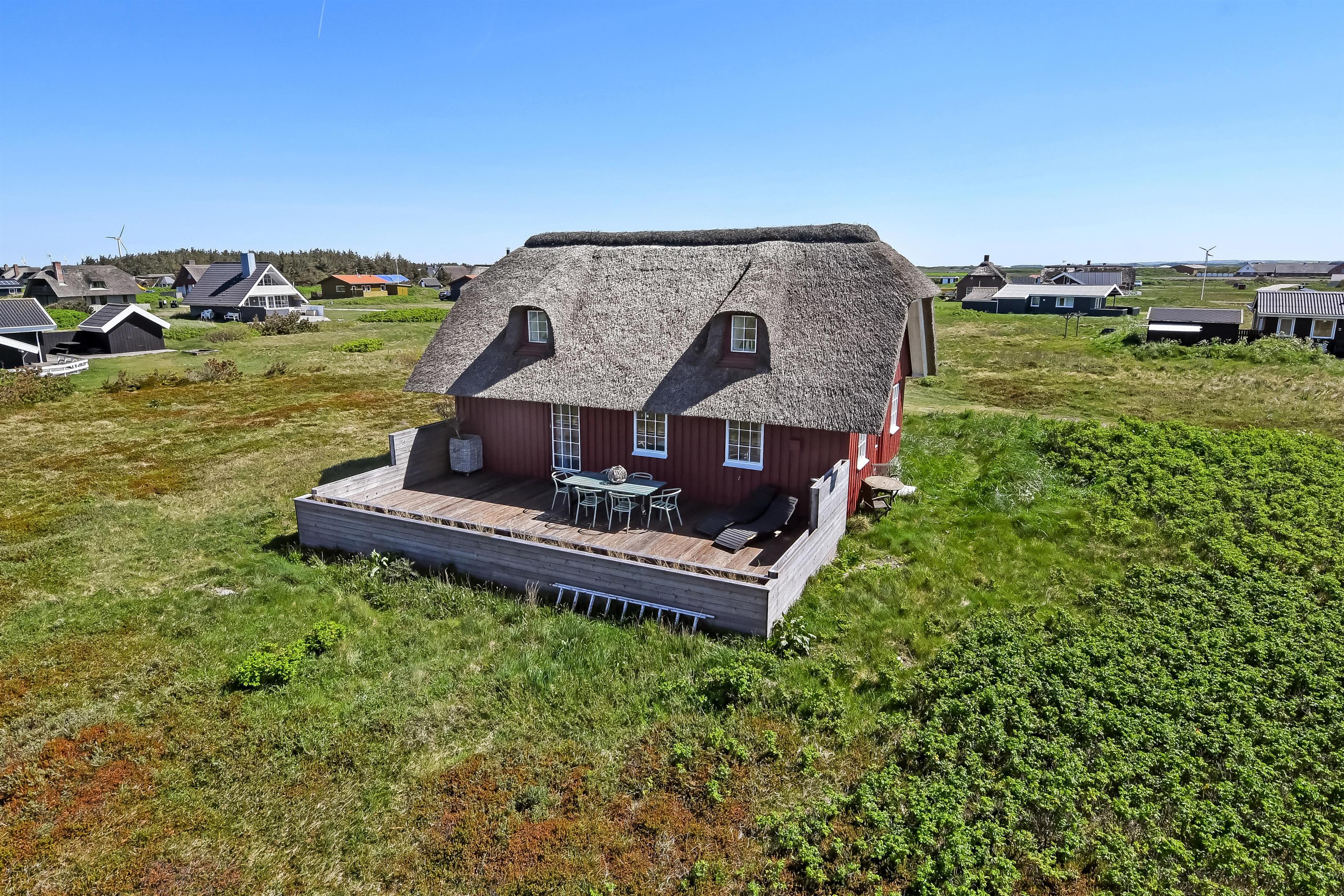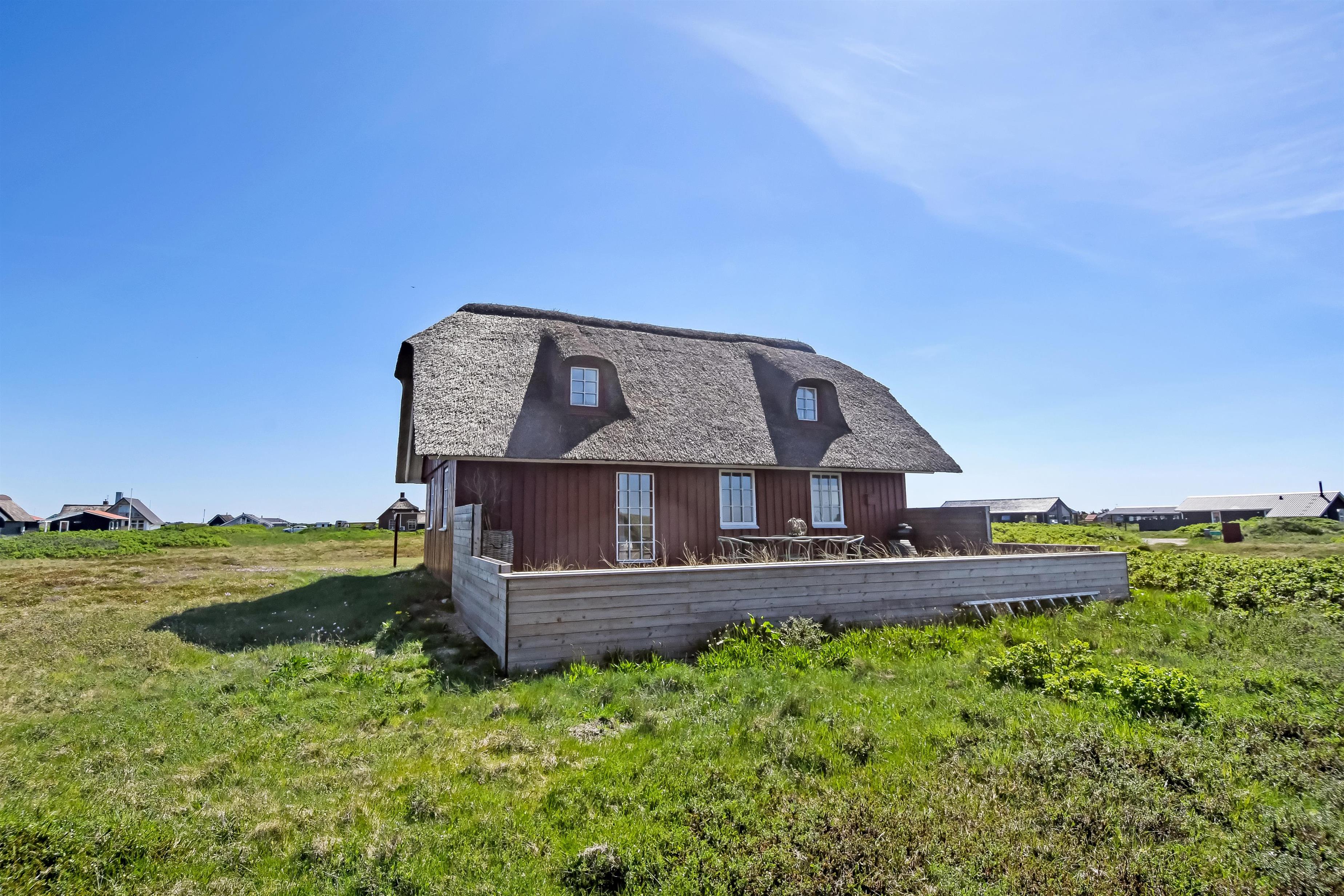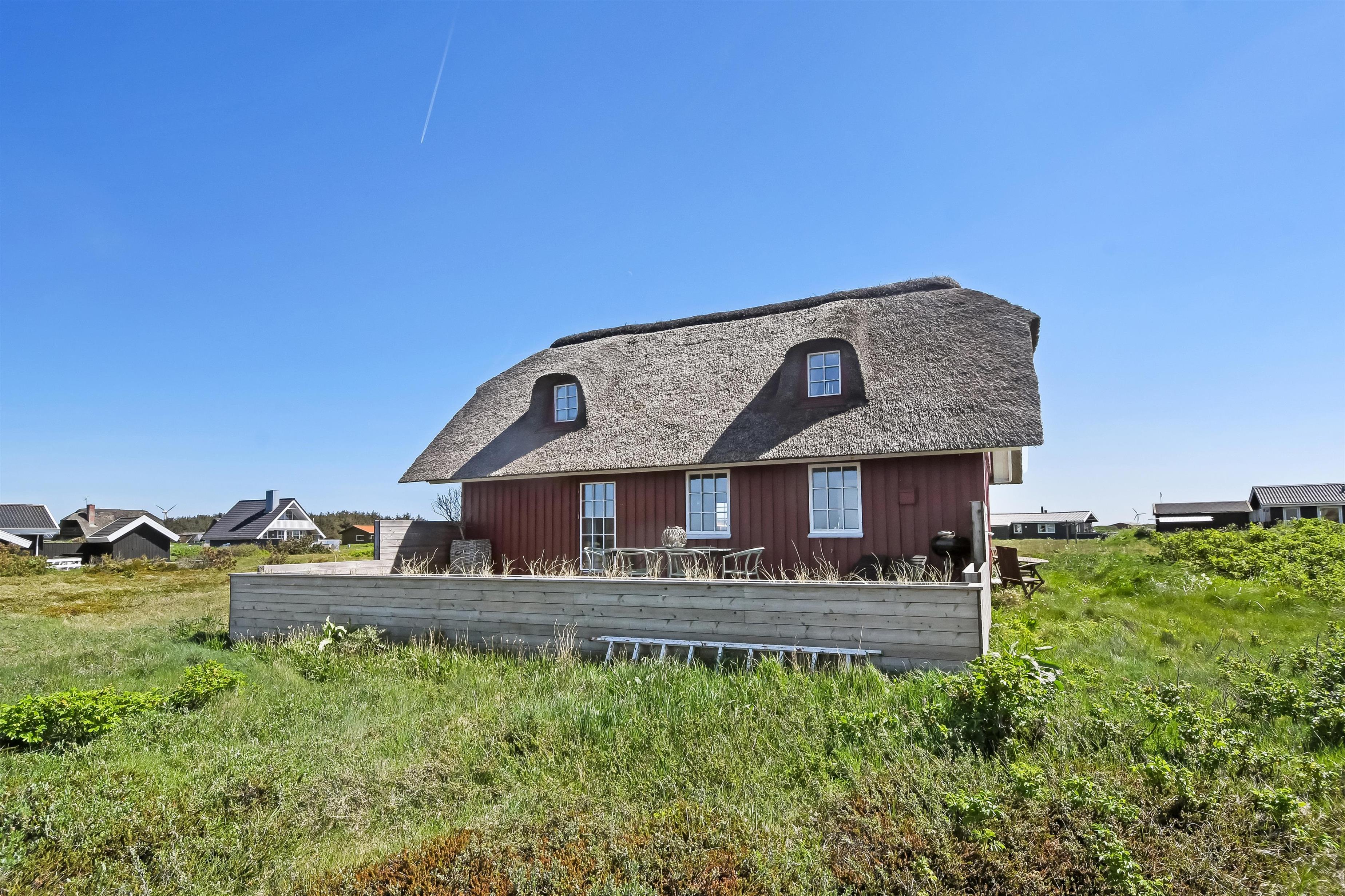 Dette idylliske nyrenoveret feriehus i træ med stråtag er beliggende på en naturgrund tæt på Vesterhavet, huset er bygget i 2 etager, og har plads til 6 personer. I 2023 er huset moderniseret blandt andet nye møbler og nyt køkkenservice m.m. Der er gratis trådløs internetadgang.