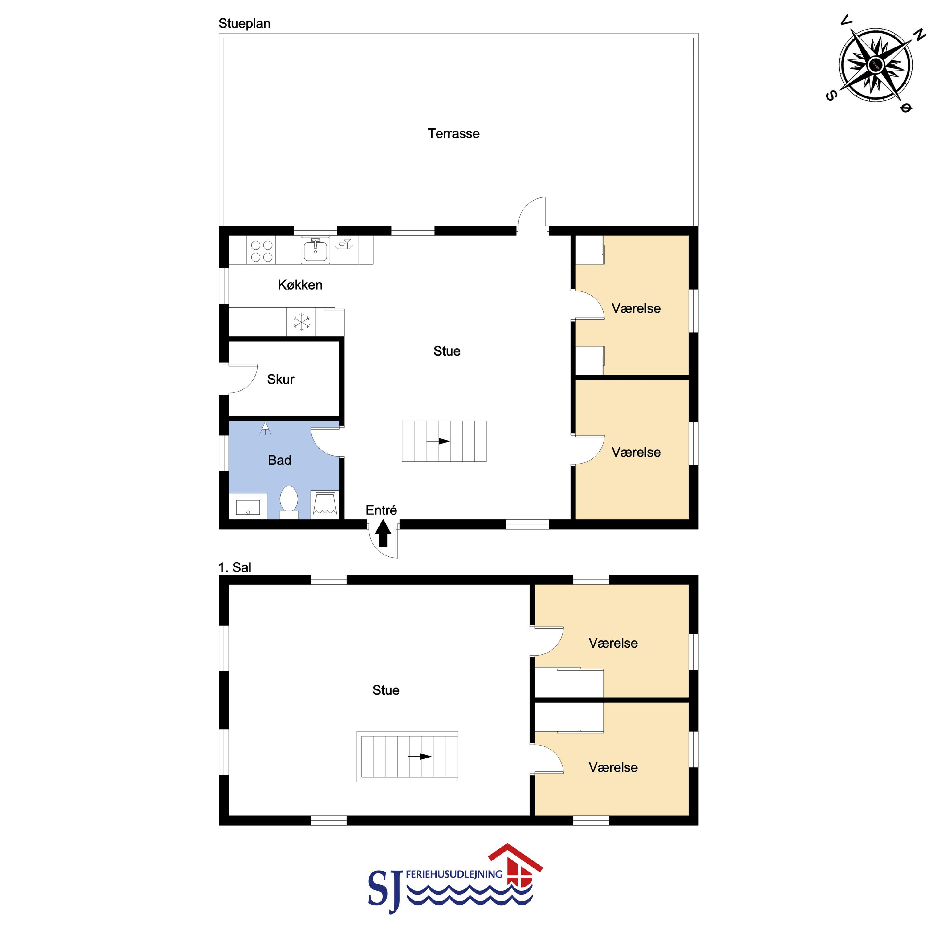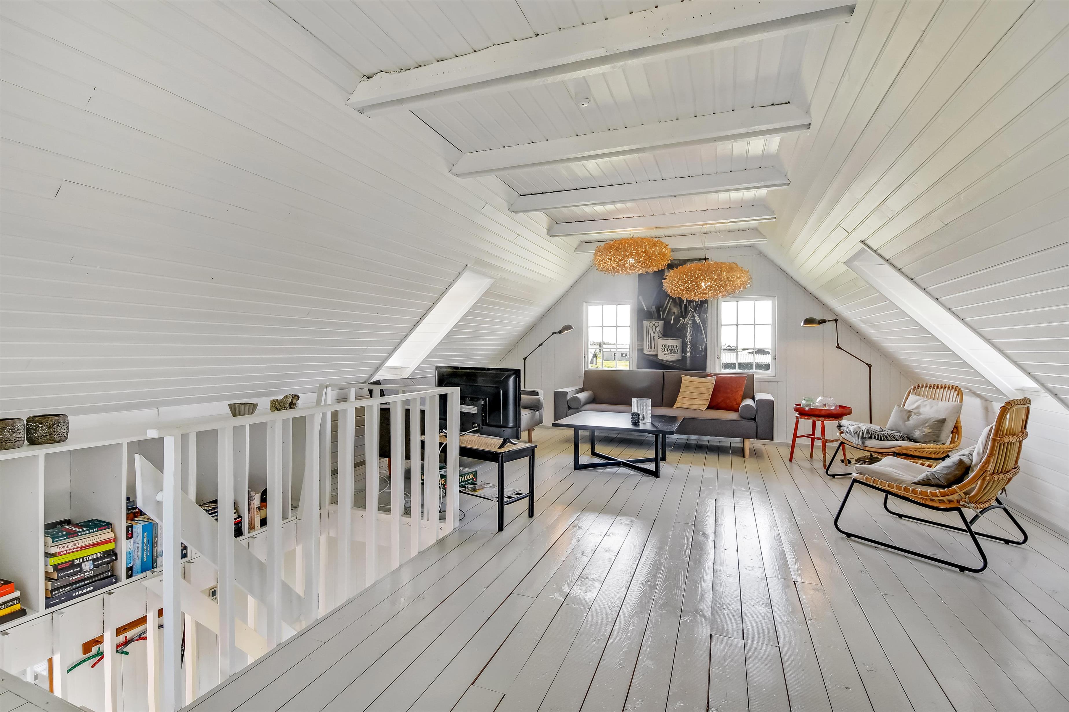 Via den brugervenlige trappe i køkken – alrum kommer I let op på 1. Etage. Stuen er ovenpå med sofagruppe smart-TV med tyske og danske kanaler. På 1. etage findes også 2 dejlige soverum (1DS) + (1DS) med nye senge og nye dyner og puder. Fra stuen på 1. sal er der en flot udsigt til klitterne ved Vesterhavet.