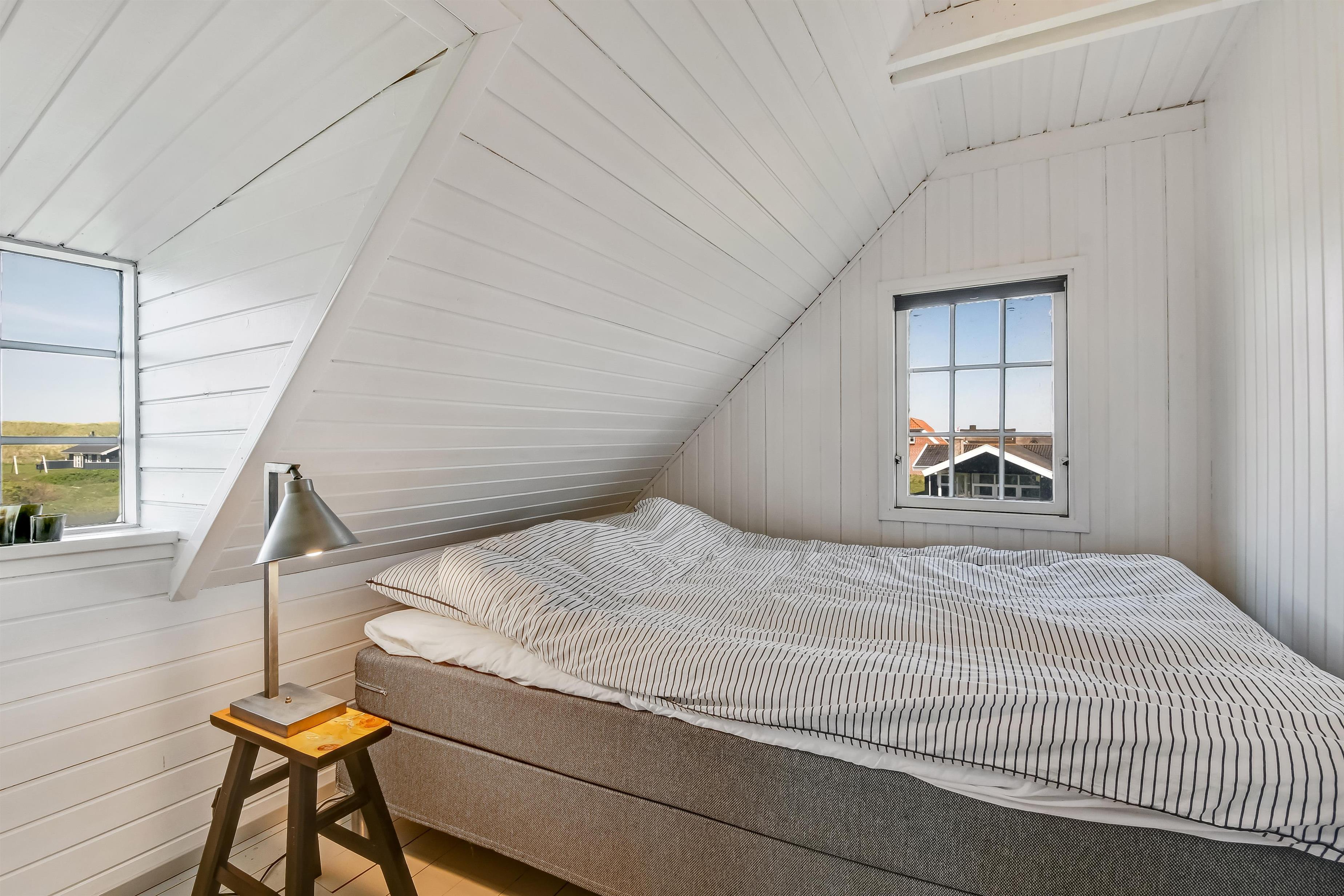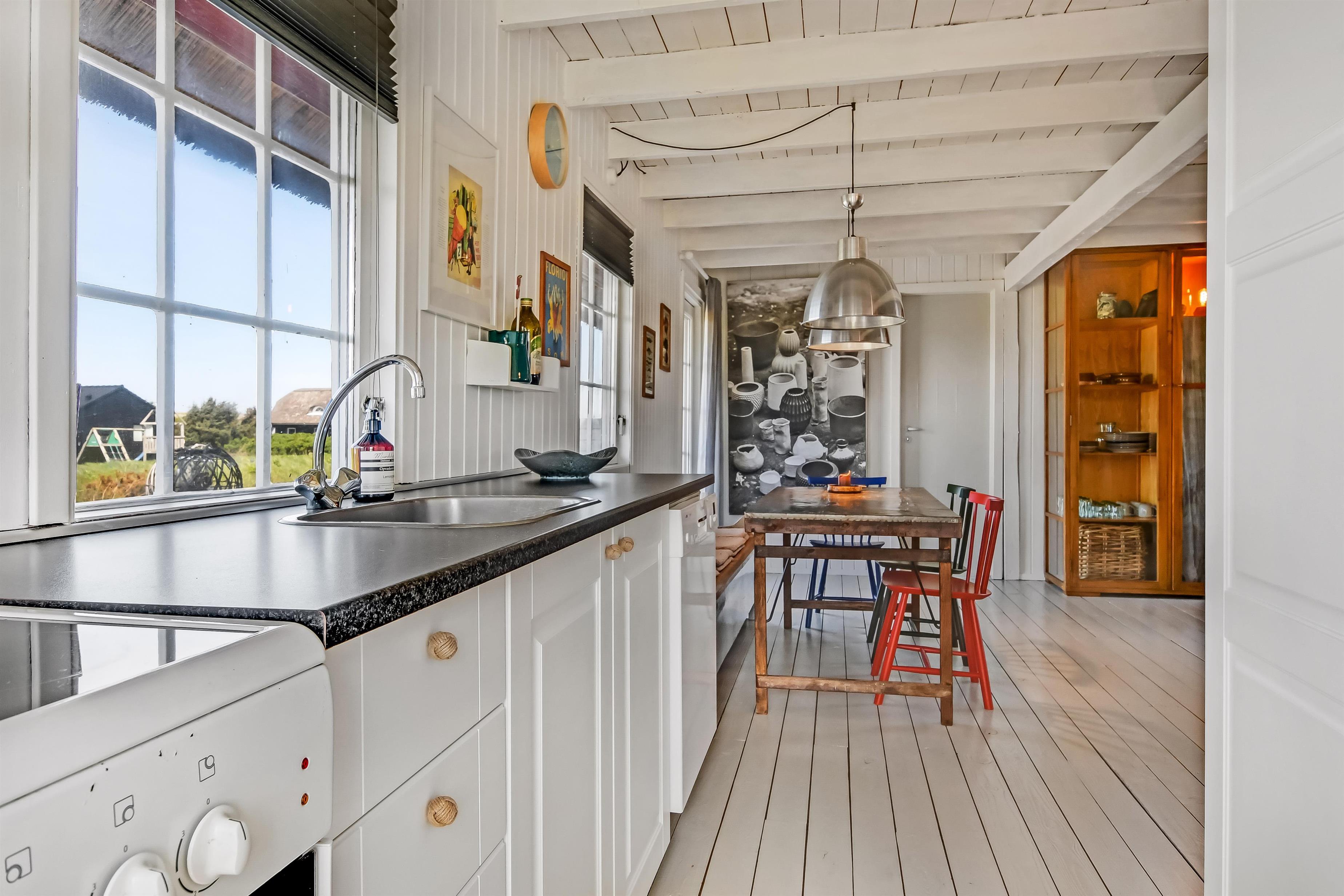 I stueetagen er der et stort hyggeligt køkken-alrum. Flot Køkkenhjørne. Med udsigt til de høje klitter ved Vesterhavet. Komfur med glaskeramiske kogeplader, køleskab med fryseboks, opvaskemaskine og vinkøler. Tæt ved køkkenet er spisebordet placeret og der er udgang til en flot nyanlagt, indhegnet træterrasse. Der er også en praktisk vamepumpe som hjælper med at spare på forbruget i de kolde måneder – og som kan køle huset ned i de varme måneder. Dejligt badeværelse med toilet, bruser, vaskemaskinen og klinkegulv. Huset hat i alt 4 gode soverum, hvoraf de 2 de soverum er i stueetagen (1DS, 1DS) med gode senge og nye dyner og puder. Ikke-ryger hus. Max 1. husdyr tilladt.