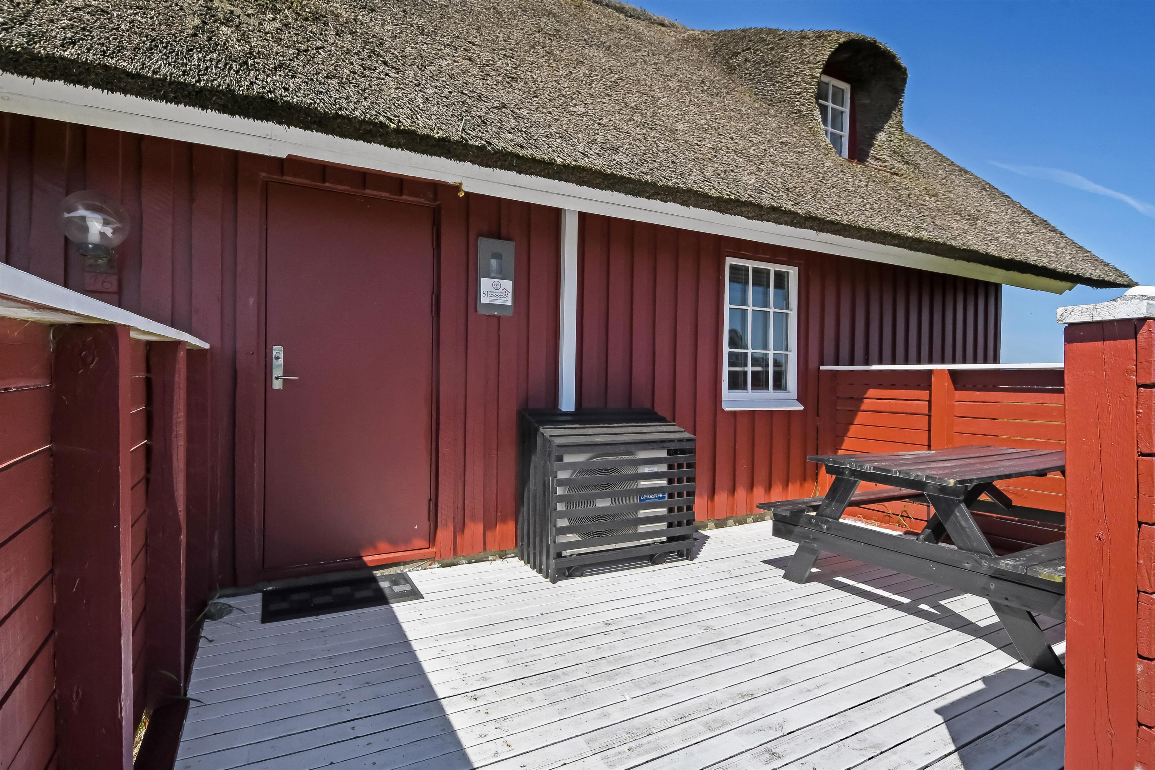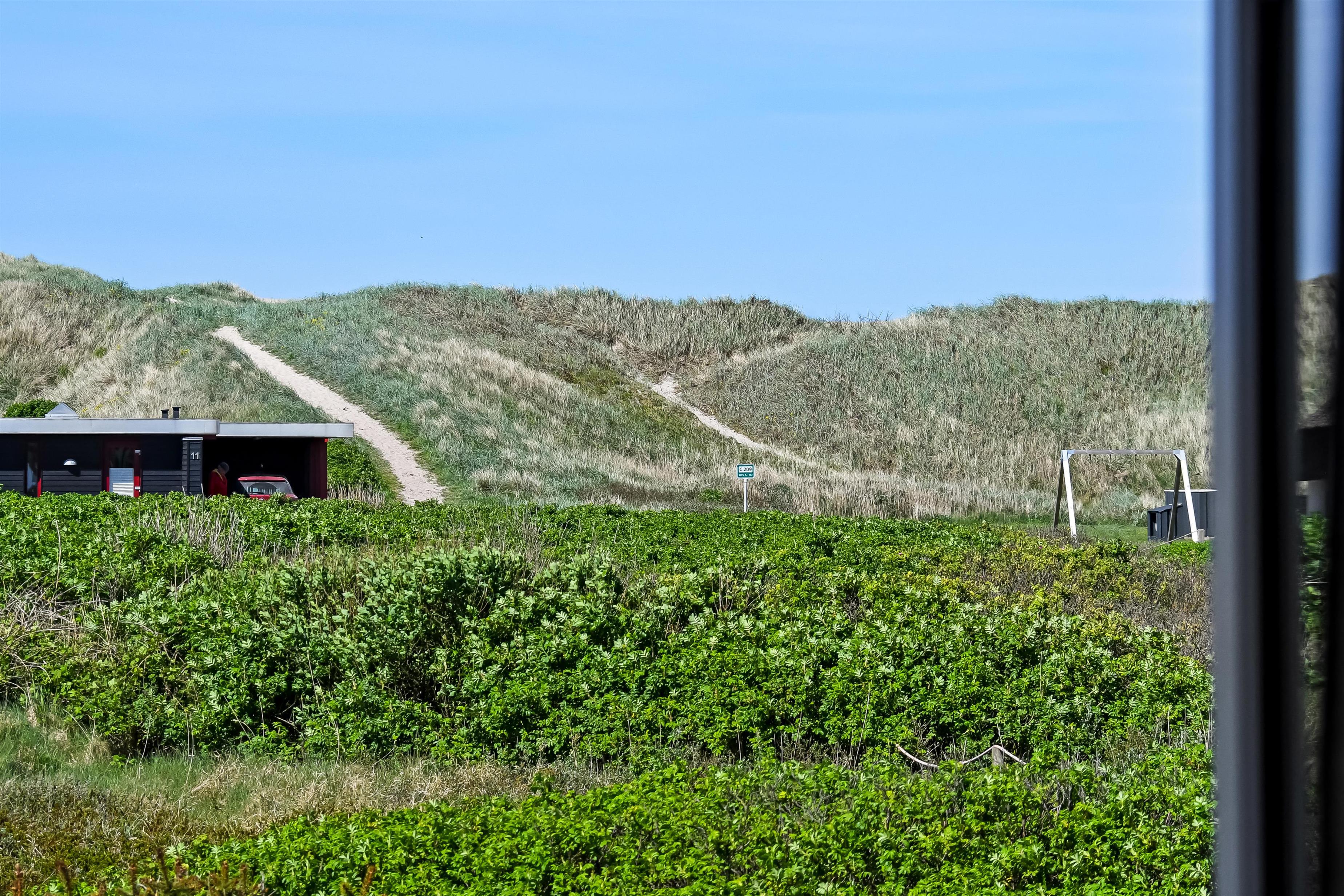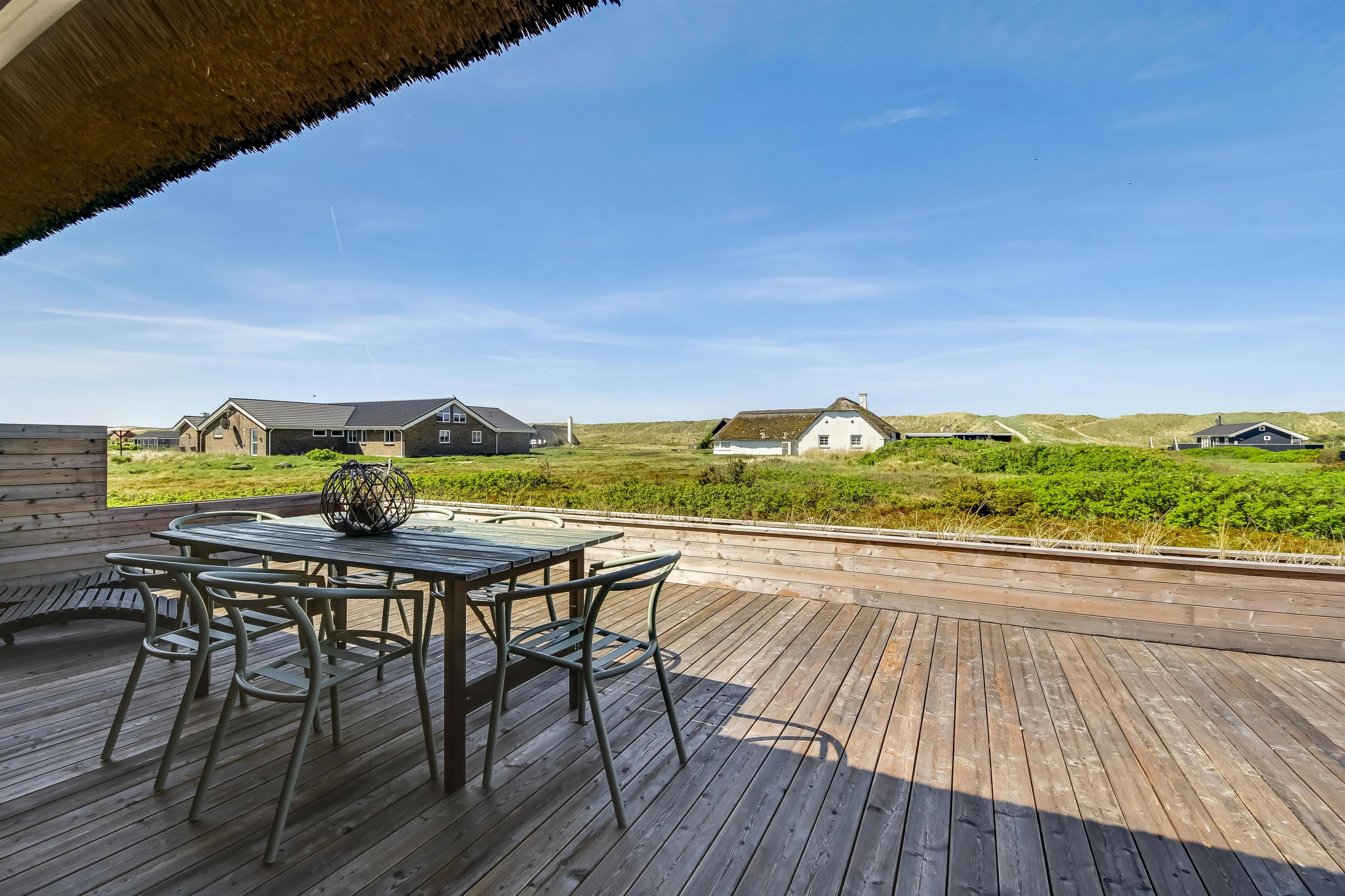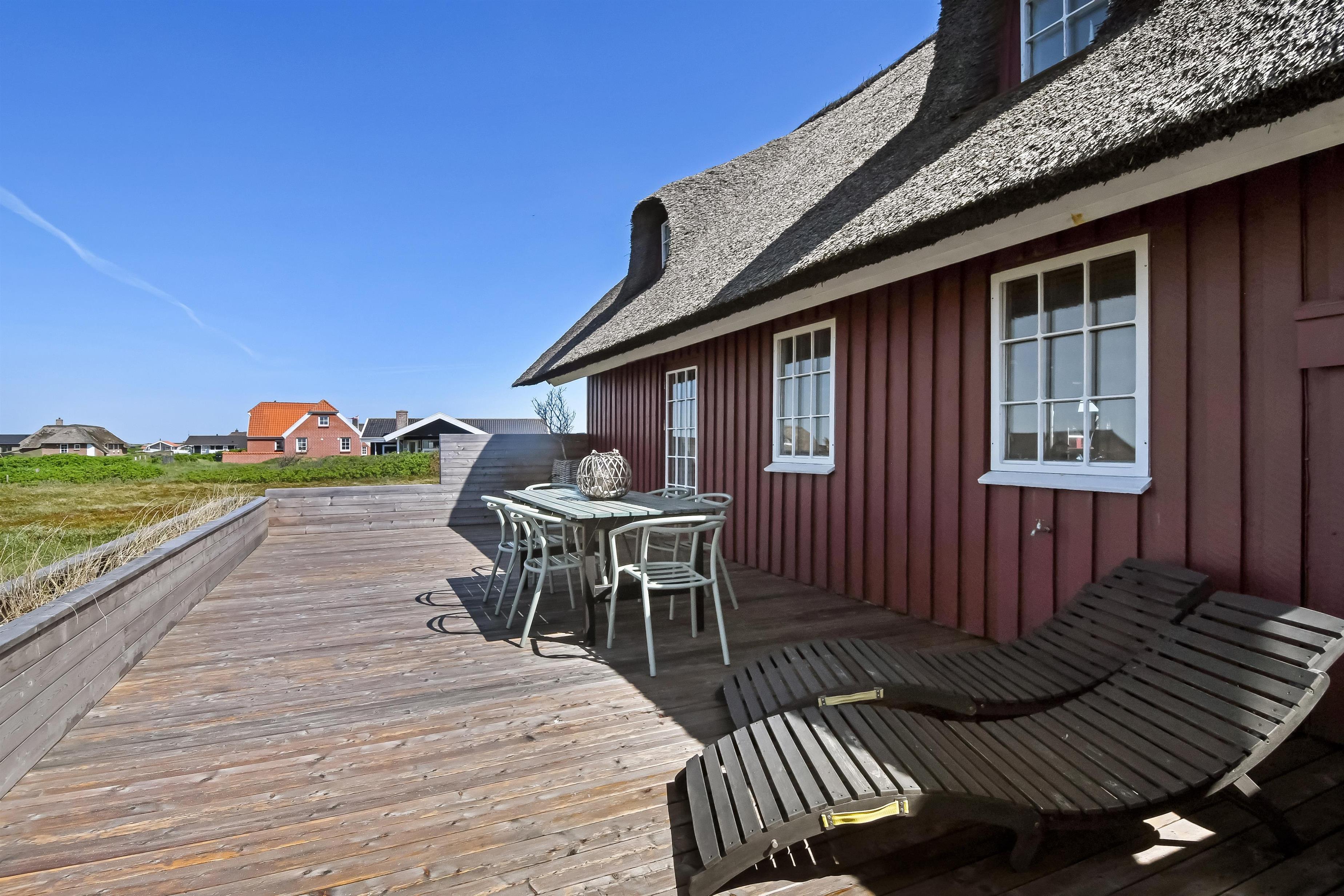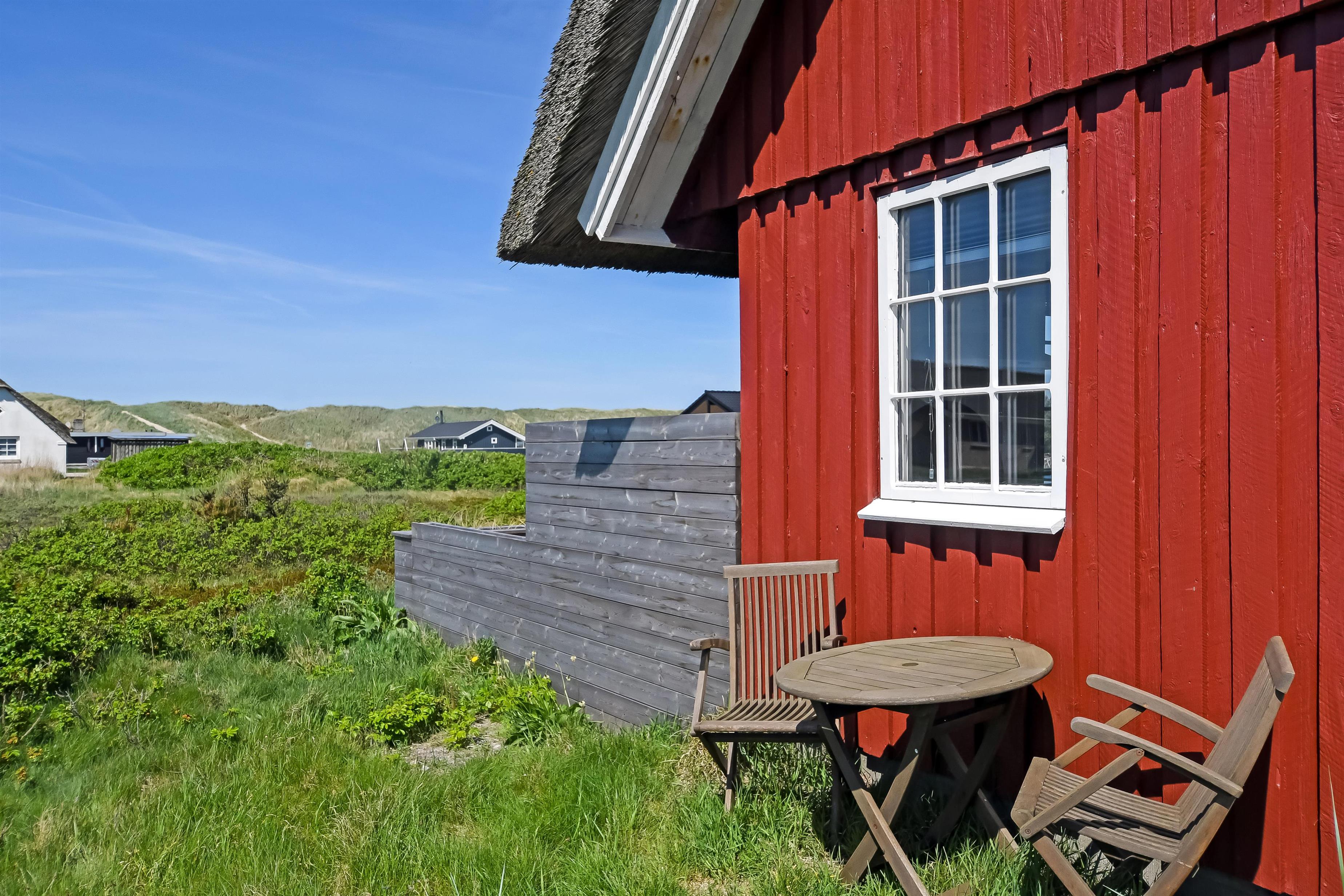 Udenfor har huset en dejlig, nyanlagt sydvendt træterrasse med indhegning mod vest og syd. Her kan man benytte husets solvogne og havemøbler samt grill. Huset byder endda også på en østvendt terrasse hvor man kan sidde og nyde morgensolen. Ellers ligger havet jo kun en kort tur væk og det er altid en fornøjelse at komme op at se hvordan havet nu "har det". Om sommeren er der fine bademuligheder og børnene kan få timevis til at gå med at lave sandborge eller små dæmninger i sandet, mens de voksne kan ligge og slappe af. Her er nemlig altid masser af plads, så man føler man får stranden for sig selv. Der er 1,5 km til nærmeste indkøbsmulighed i Vrist, som dog kun har åbent i fra påske til november. Aldi og Brugsen i Harboøre er der 2 km til hvis man går og kører man i bil er der 3,5 km.