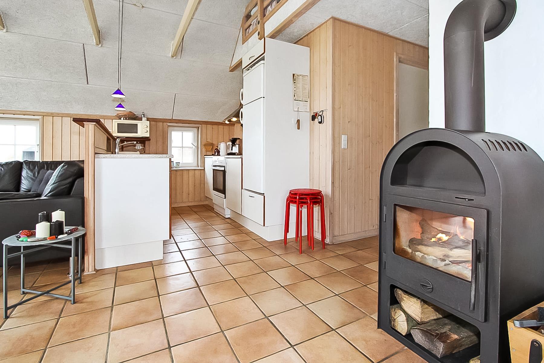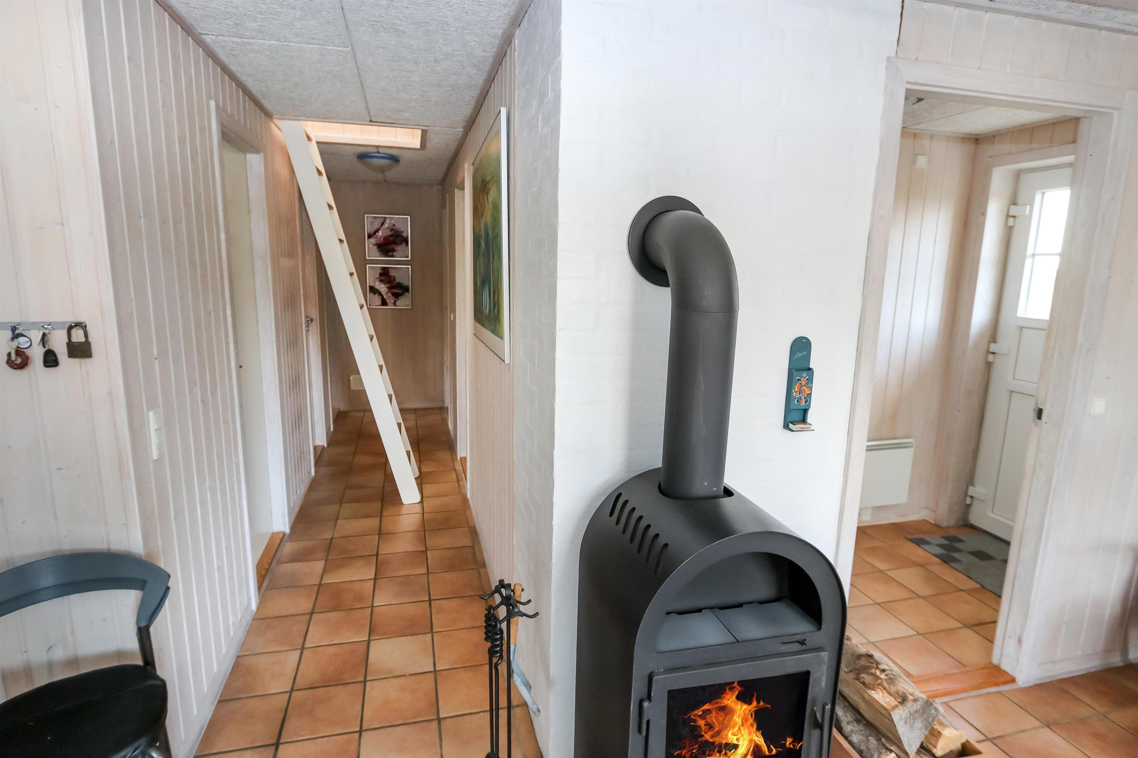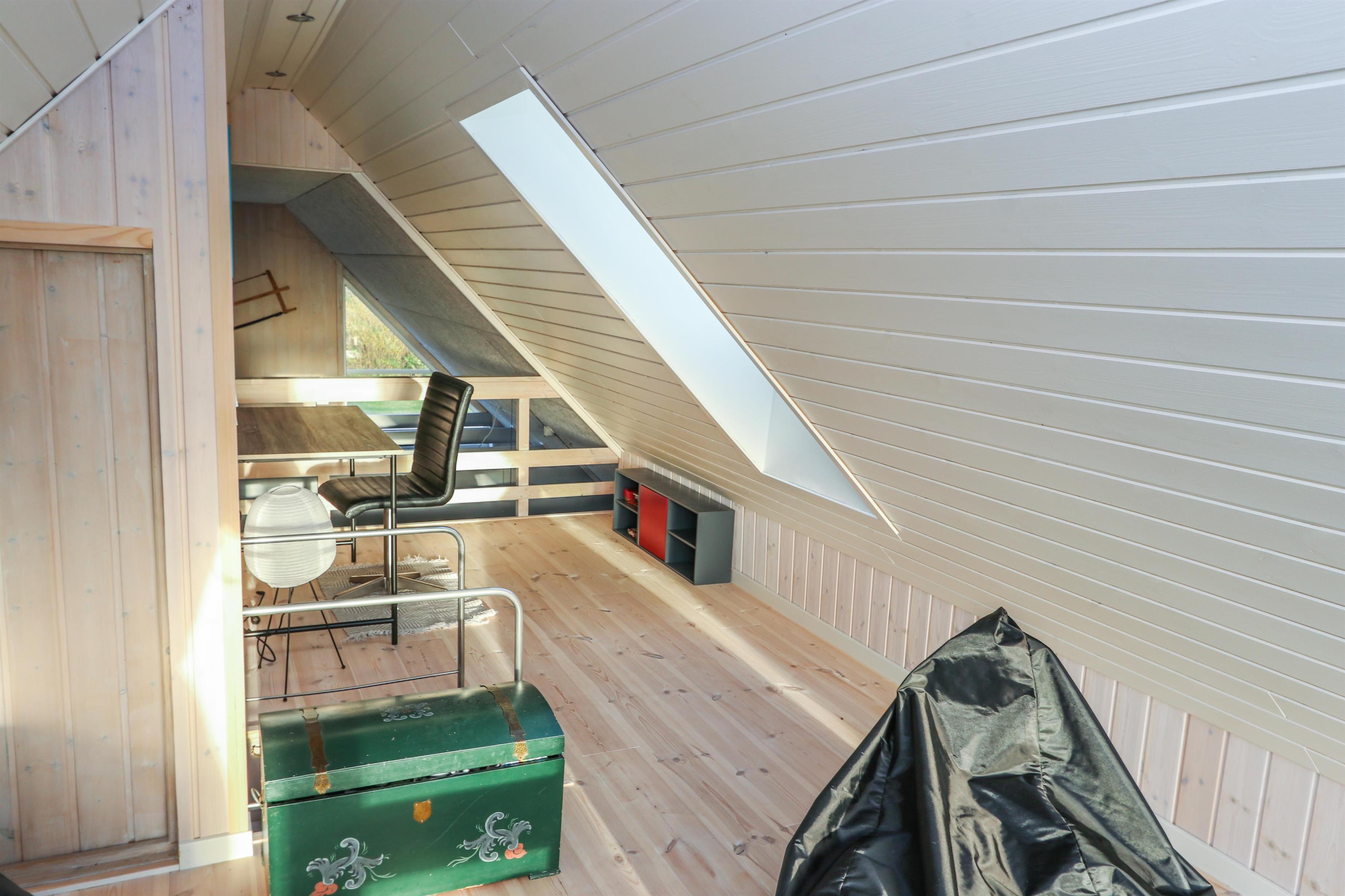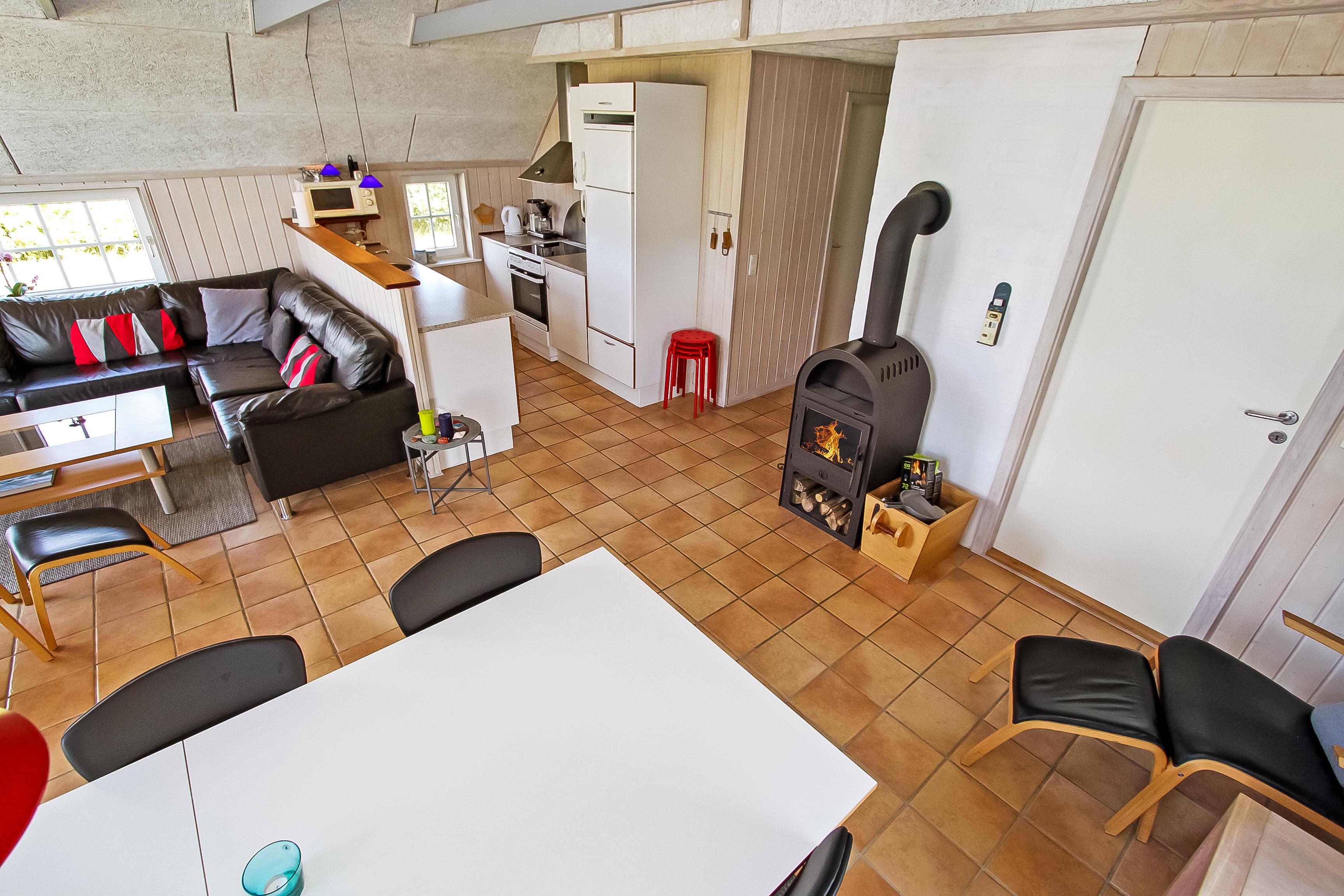Feriehuset er fordelt på to etager. På 1. sal finder I en hyggelig stue med flot udsigt over området. Bemærk, at stigen til stuen er ret stejl. Stuen har klinkegulv og en lys og venlig indretning med åbent til kip og synlige bjælker.