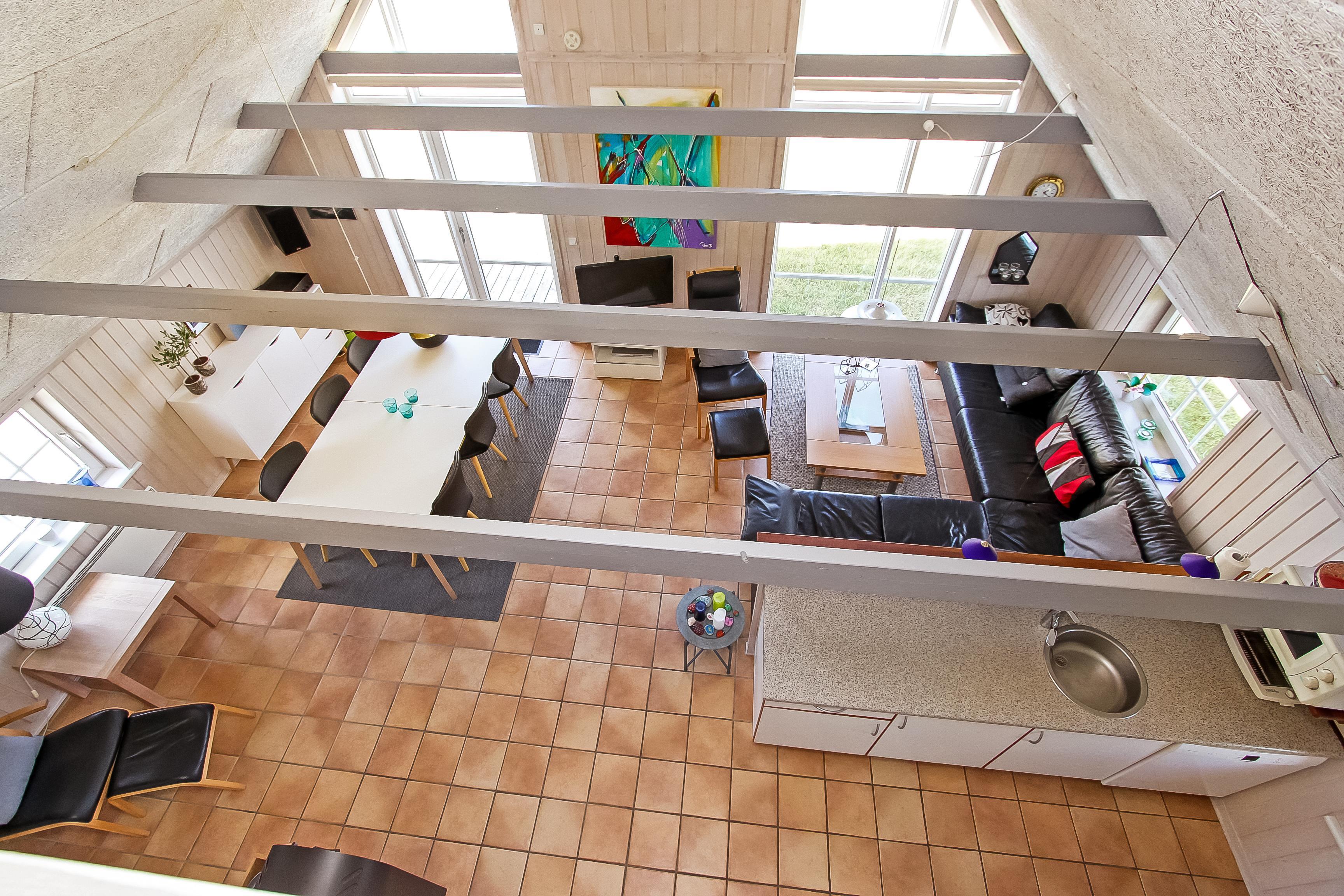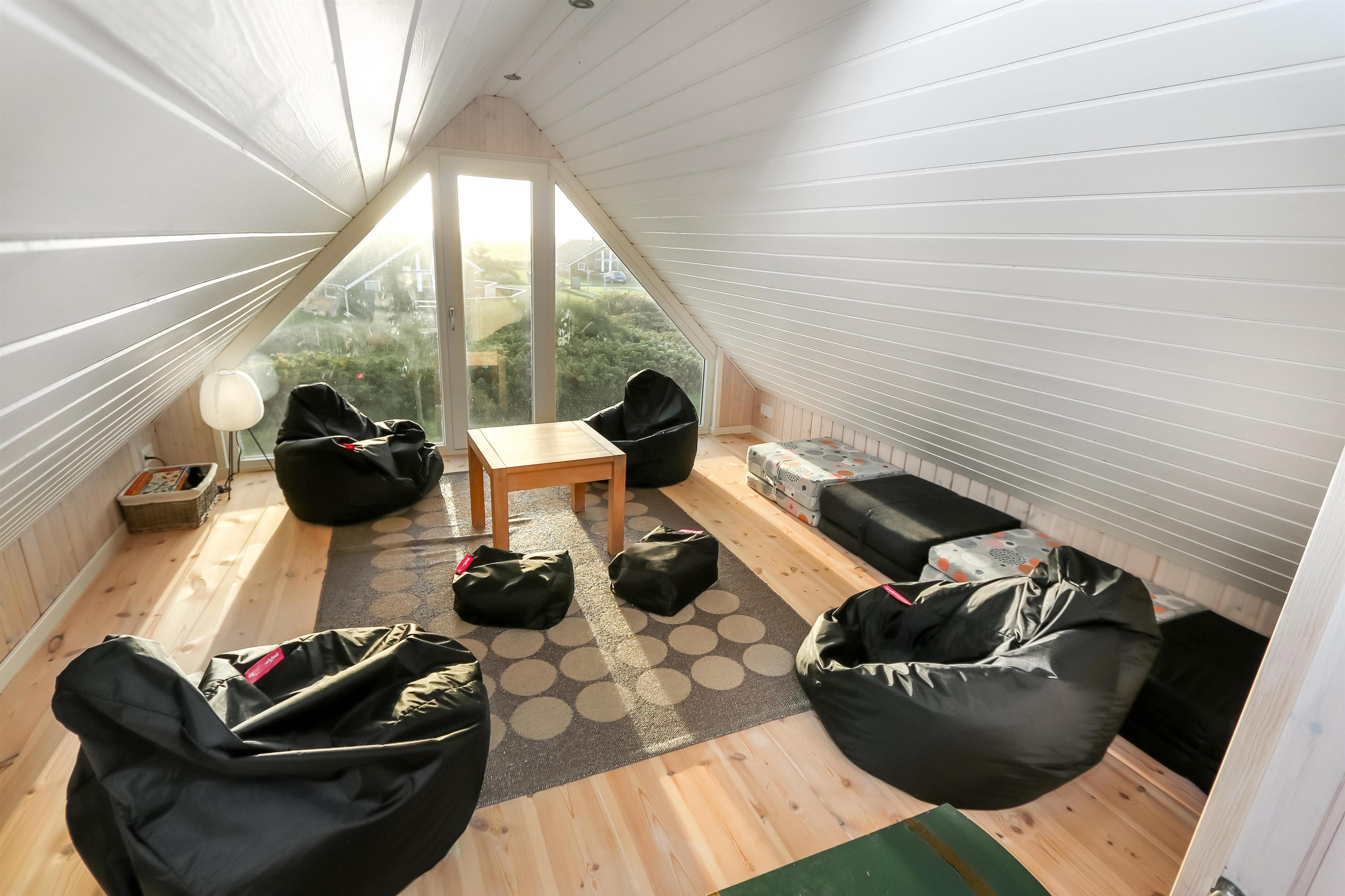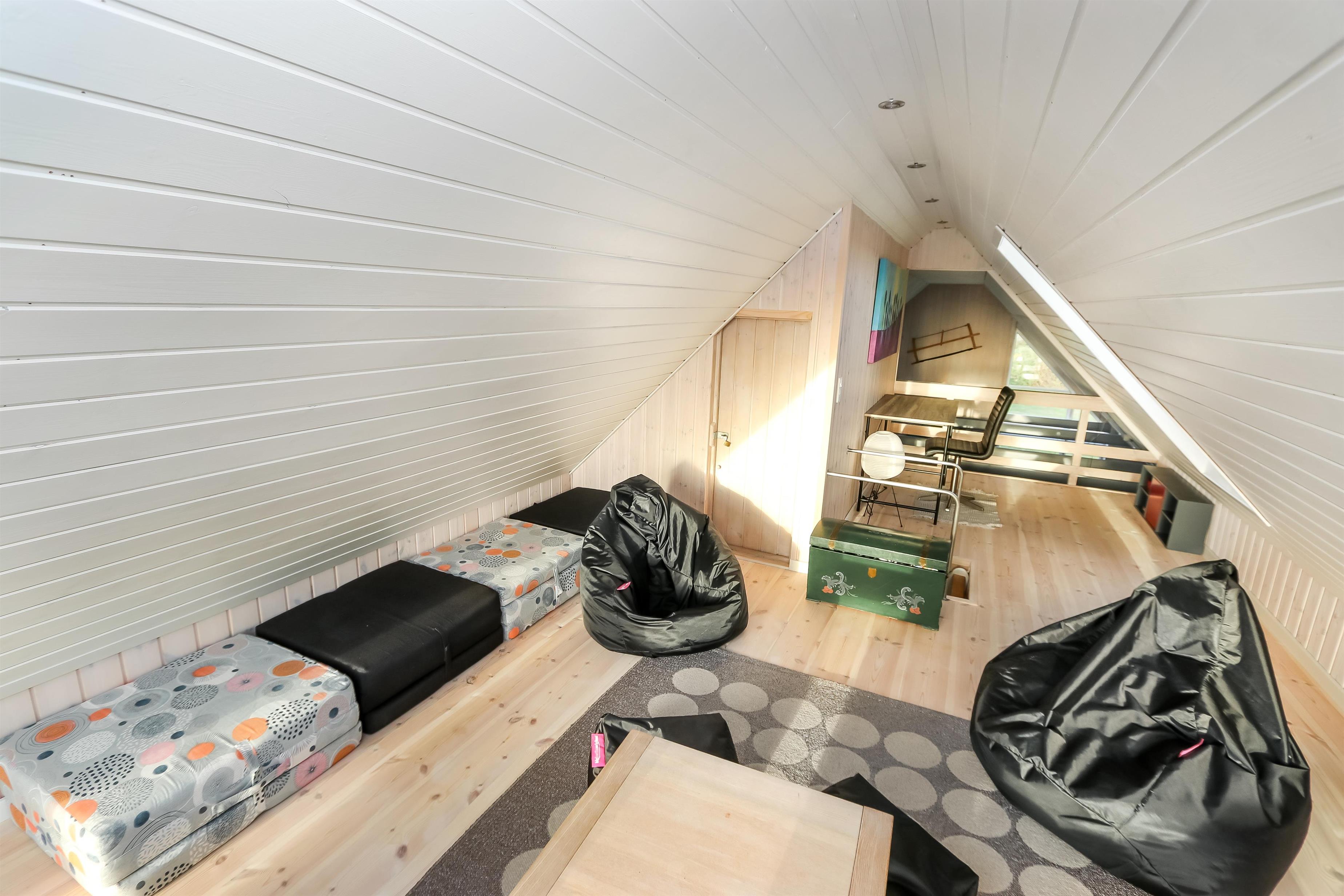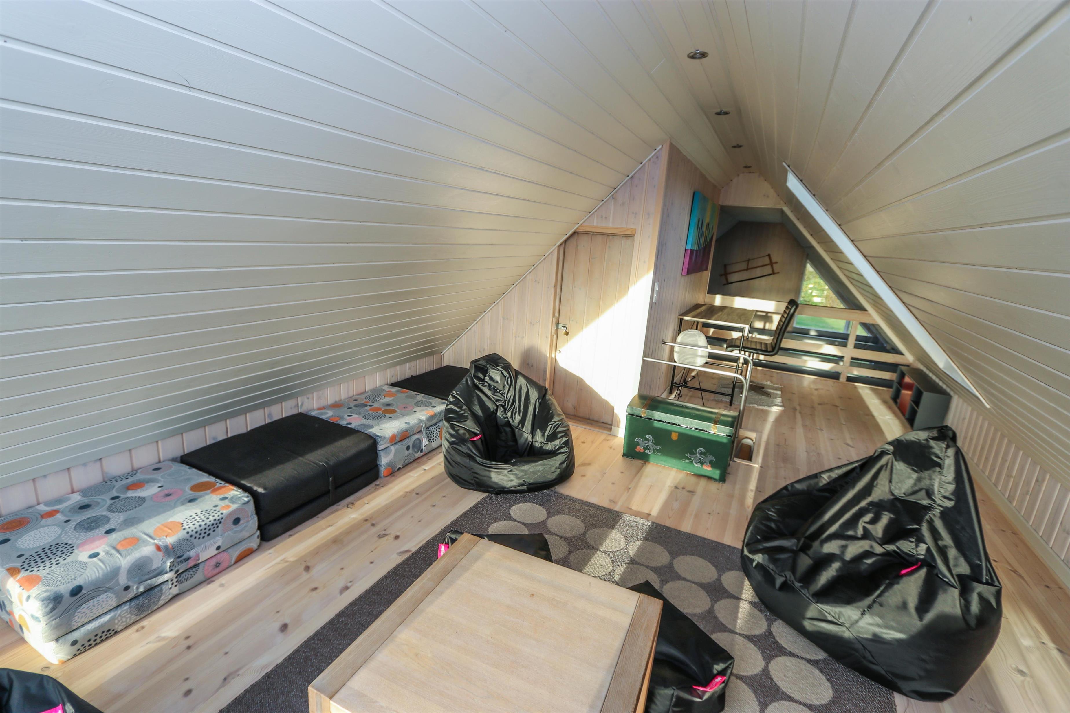 Feriehuset er fordelt på to etager. På 1. sal finder I en hyggelig stue med flot udsigt over området. Bemærk, at stigen til stuen er ret stejl. Stuen har klinkegulv og en lys og venlig indretning med åbent til kip og synlige bjælker.