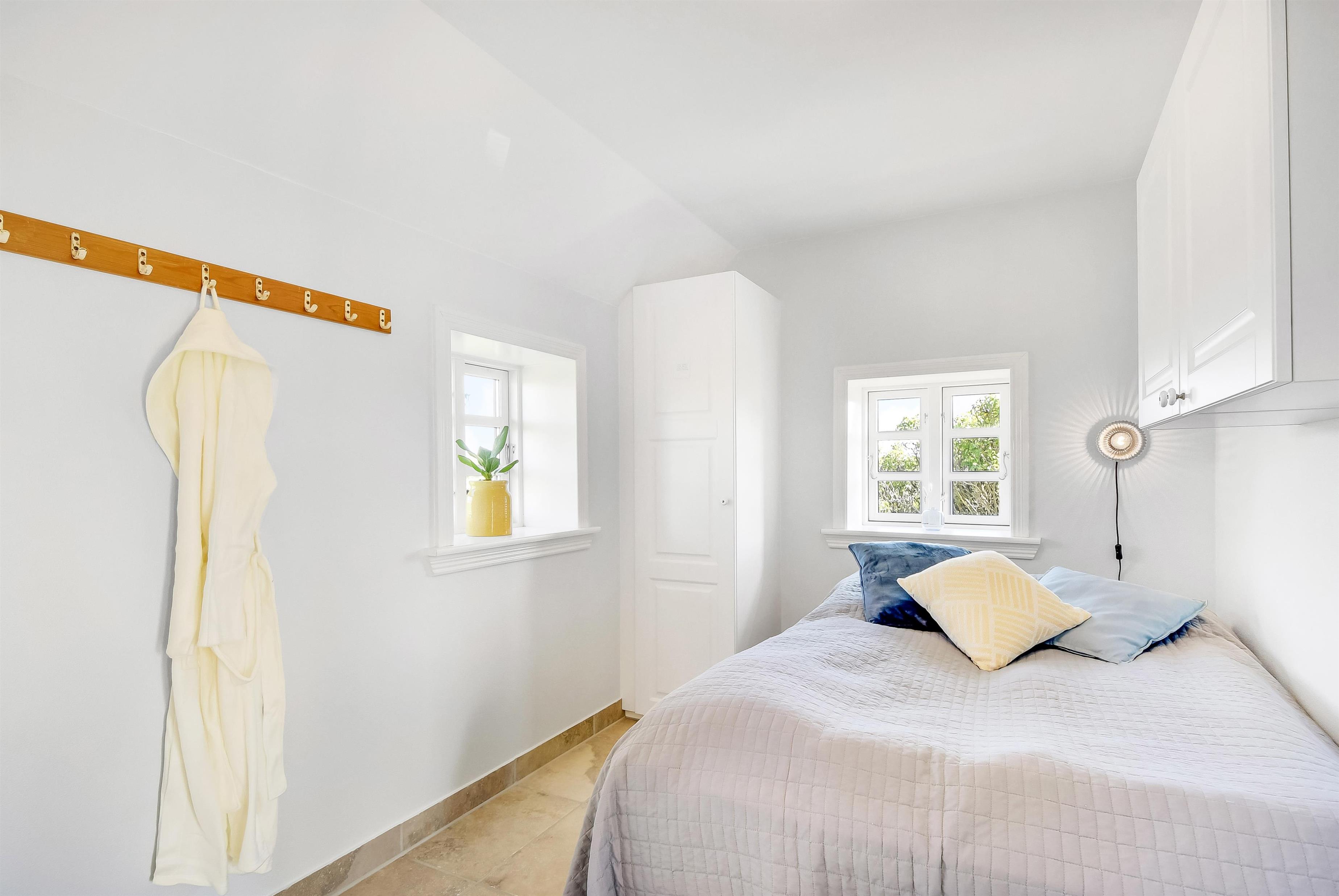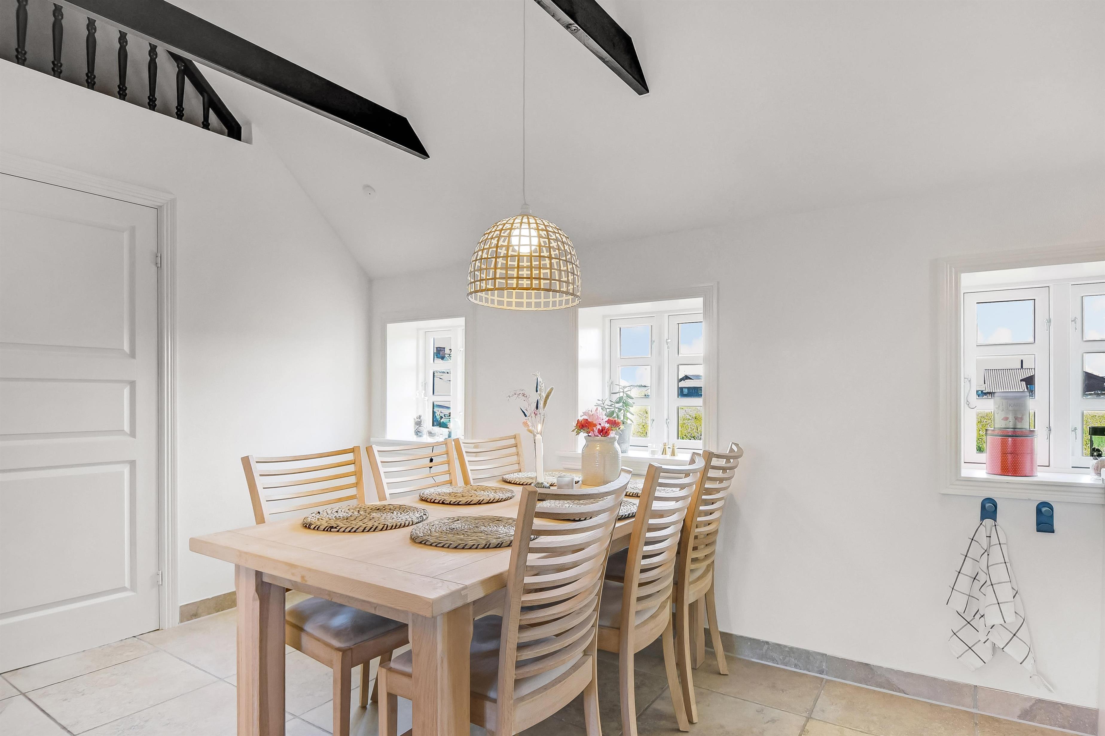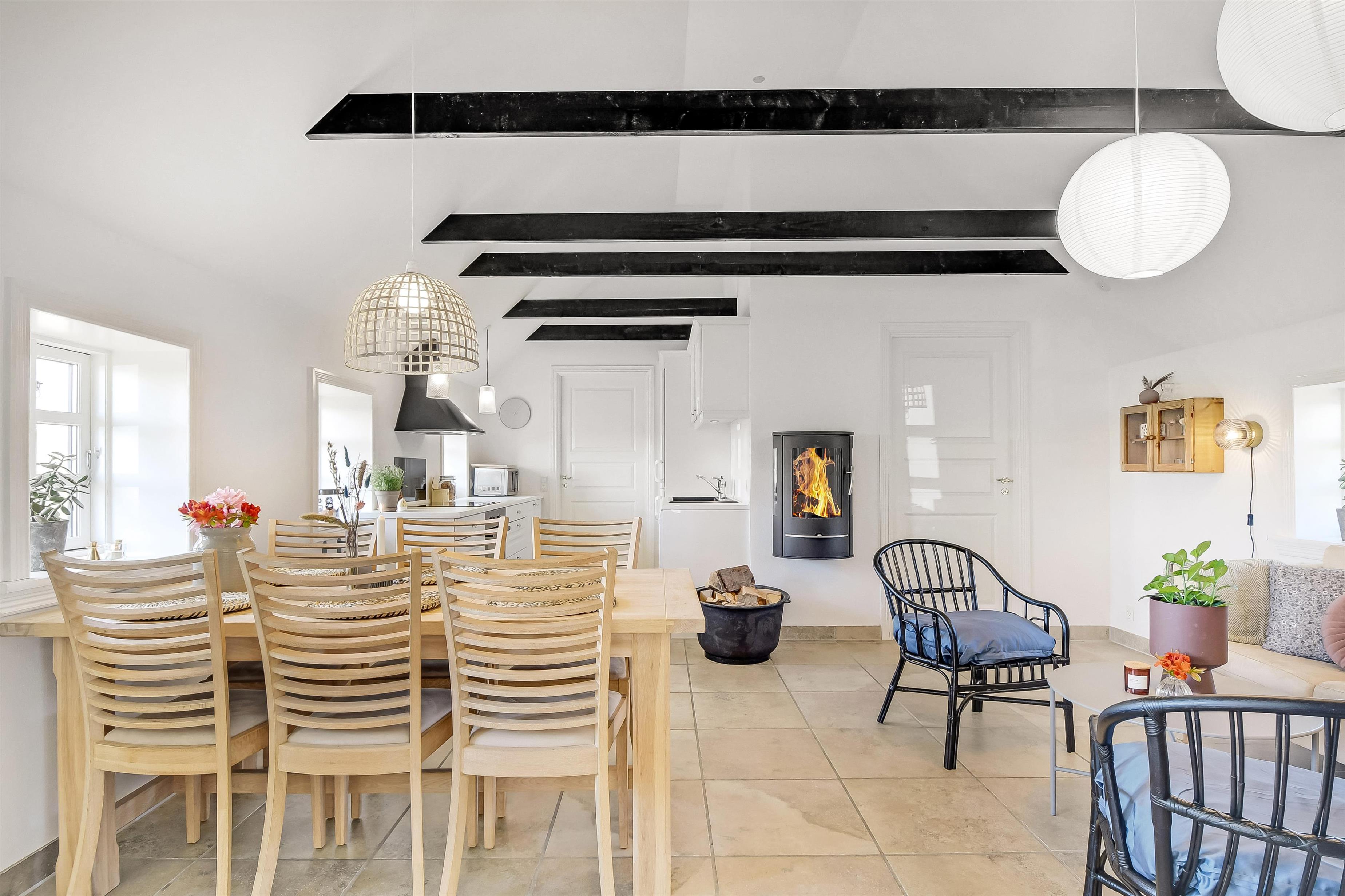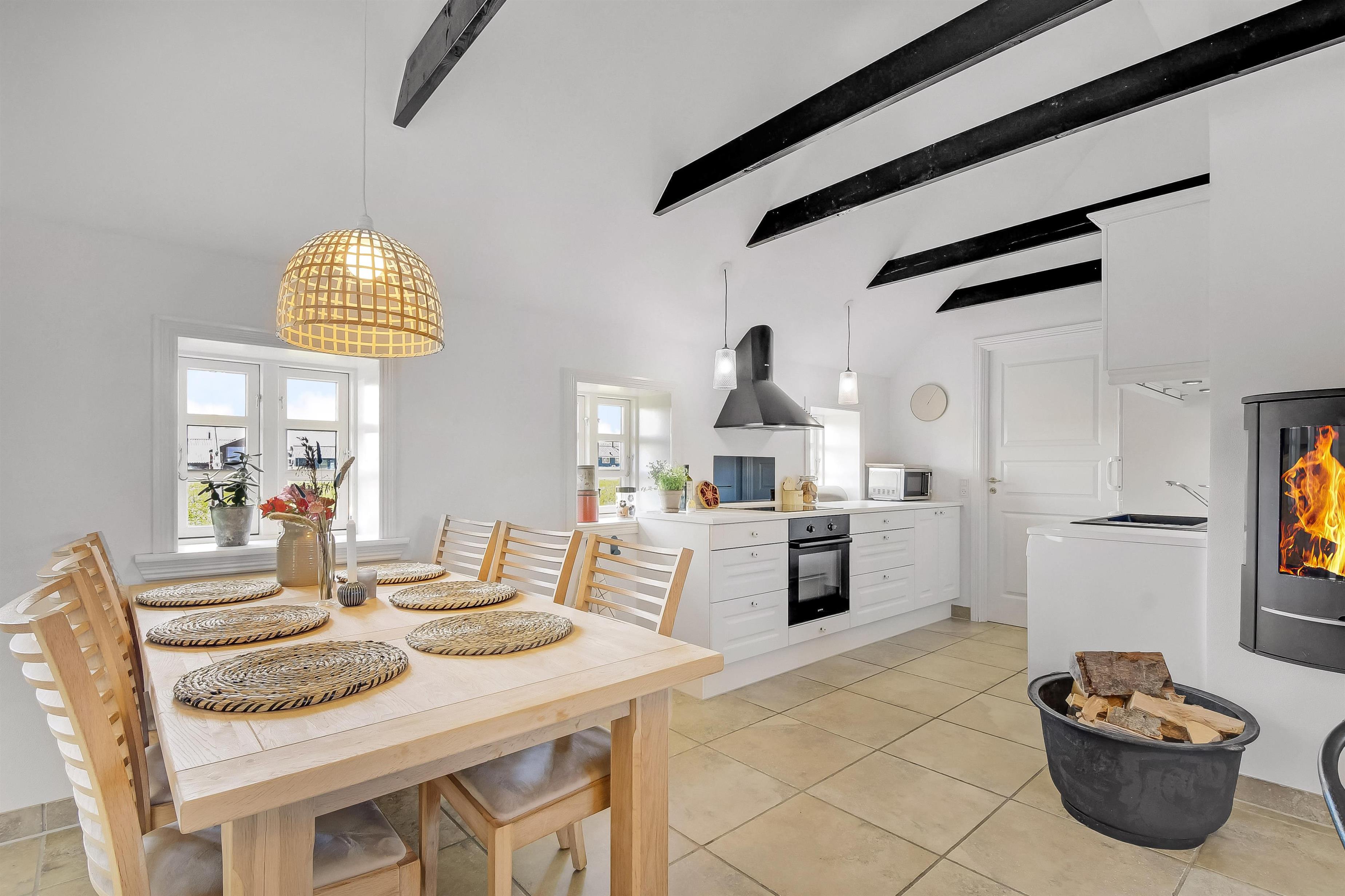 Allerede når bilen rammer grusvejen, med få meter til huset, bliver det klart at belliggenhed og hus er noget ganske særligt. Når man drejer ind på grunden og parkerer bilen begynder ferien. En dejlig entre byder velkommen (men pas på – døren er lav). Dejlig opholdsstue kombineret med et flot køkkenhjørne byder jer velkommen. Køkkenet har alt i service og køkkengrej og er også udstyret med keramisk kogeplade, indbygningsovn, emhætte, køleskab med fryseboks og opvaskemaskine. Tæt ved køkkenet står spisebordet til 6 personer, som hele familien kan samles ved når sulten skal stilles. Opholdsstuen har en polstersofa, fibernet-TV som også har en Chromecast så der er mulighed for streaming af radio og TV programmer samt adgang via en stige til en hyggelig hems – som de små helt sikkert sætter stor pris på. En flot væghængt brændeovn kan opvarme huset, så man kan holde varmen på de kolde efterårsdage. 3 flotte værelser (1DS, 1DS, 1DS). Fantastisk badeværelse med muret bruseniche, vaskesøjle med vaskemaskine og tørretumbler, toilet, håndvask og klinkegulv med gulvvarme samt lækkert spabad. Hele huset har klinkegulv med gulvvarme, så du aldrig fryser om fødderne, ligesom det er meget rengøringsvenligt. Opholdsrummet er bygget i kip og det føles rummeligt og luftigt. Ikke ryger hus. Husdyr ikke tilladt.