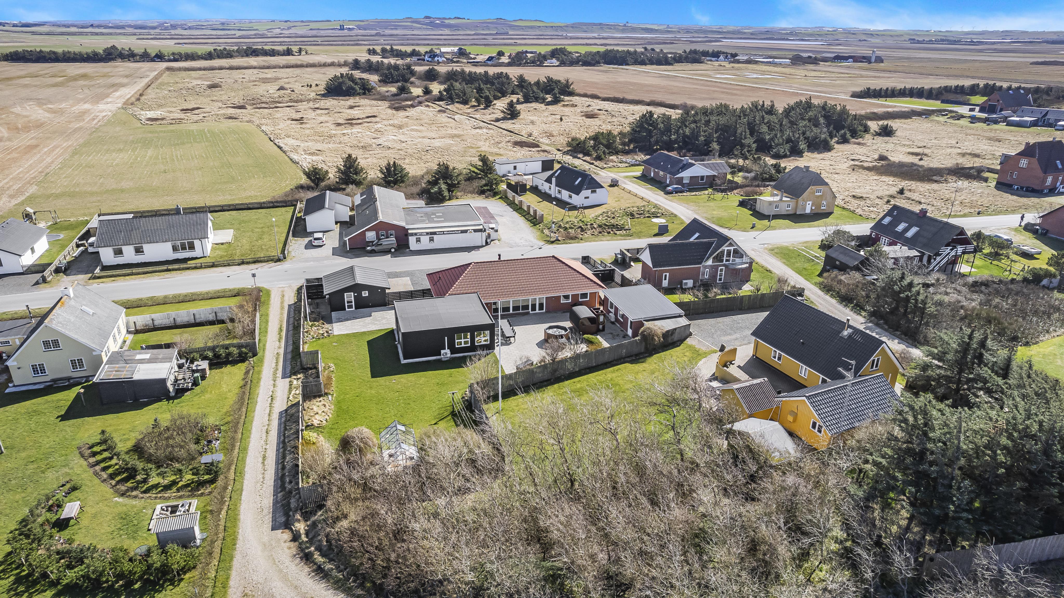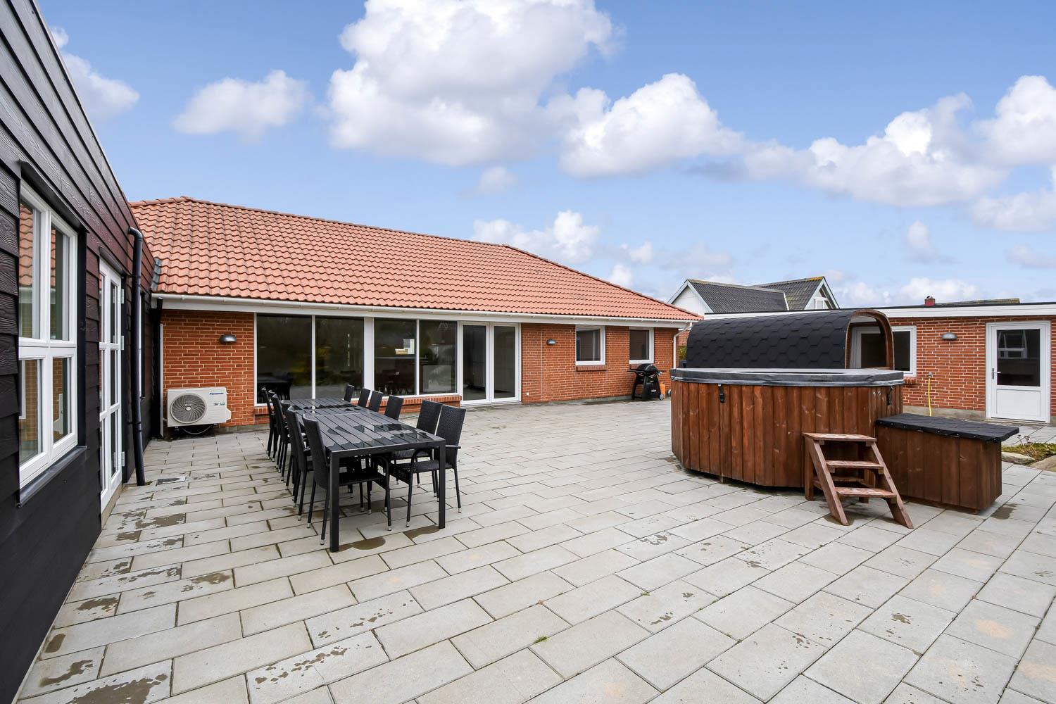 Der er masser af plads på 1.340 m2 indhegnet, store grund og på det pragtfulde terrasseanlæg er der masser af muligheder for en plads i solen eller i skyggen, da en del af terrassen er delvis overdækket. Der er naturligvis havemøbler og solvogne samt gasgrill. Hvad med en tur i den udendørs spa eller den udendørs sauna som også er ved terrassen. Helt speciel oplevelse at sidde i den udendørs spa på de mørke aftener med den klare stjernehimmel, ren terapi for sjæl og krop eller måske en frisk dukkert i Vesterhavet og så hjem og en tur ind i udendørs sauna, der er en udendørs bruser med koldt vand. I haven er der også et pragtfuldt orangeri med havemøbler, som er perfekt til en hyggestund uanset vejret. 5 - 10 min fra huset ligger Vesterhavet, der altid inviterer til en frisk gå- eller løbetur. Lige på den anden side af vejen ligger områdets købmand som har sæsonåbent og som i sæsonen byder på frisk morgenbrød. Her kan de daglige indkøb også klares. Området madsted ligger ca. 3.000 fra huset. Inden for 25-30 minutter kan flere aktiviteter og shopping muligheder nås. Ideelt indrettet hus til op til 15 personer. Så hvad enten I er til aktiv ferie eller total afslapning, danner dette flotte feriehus en dejlig ramme både hvad angår hus, beliggenhed og omgivelser