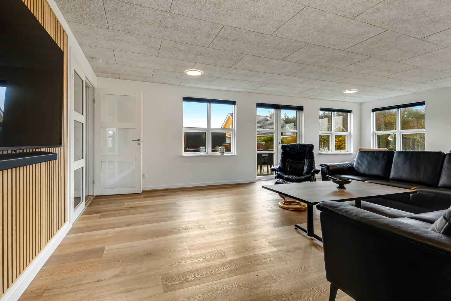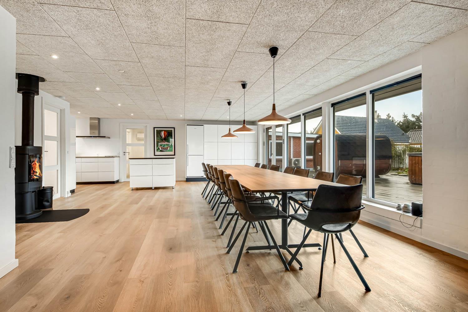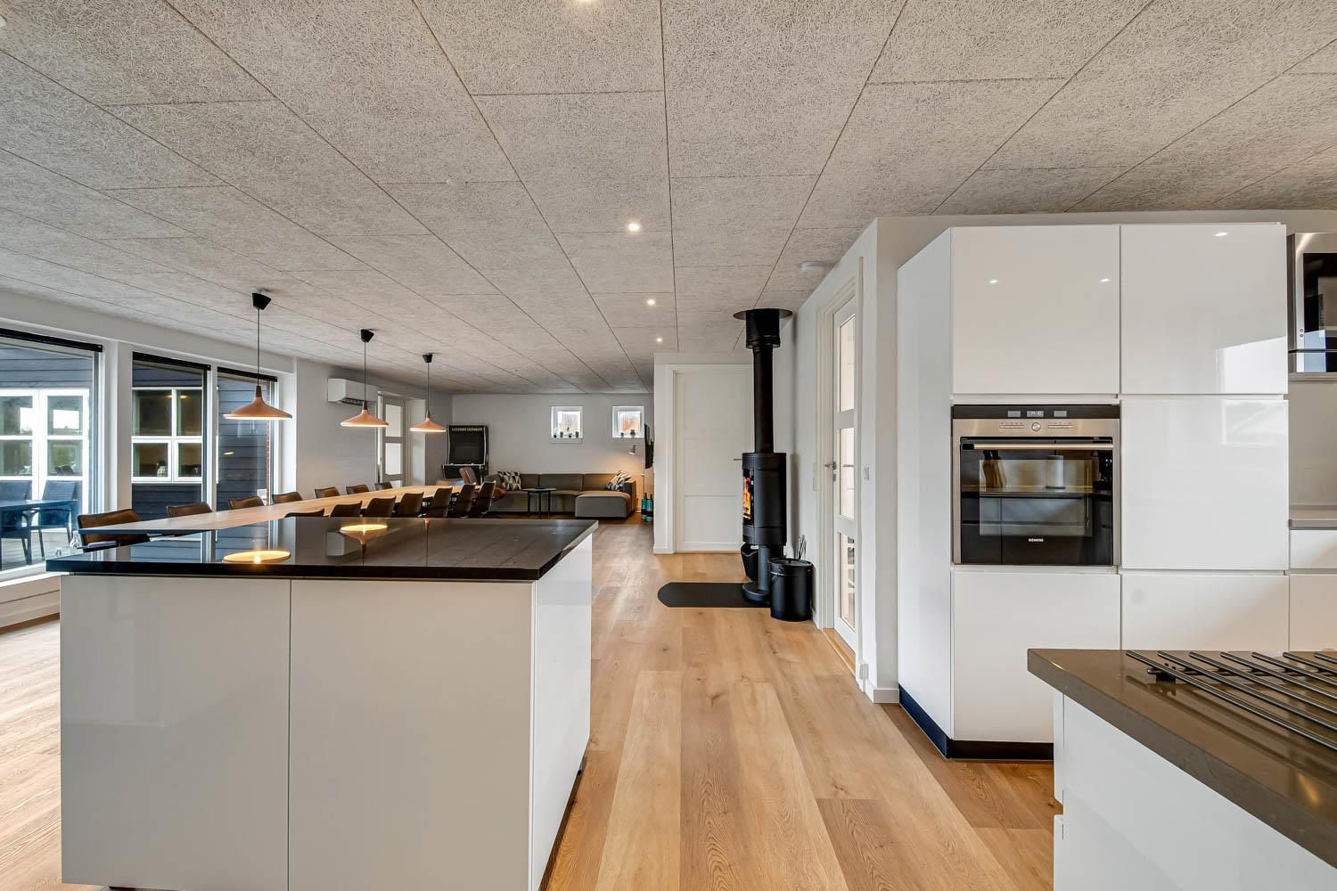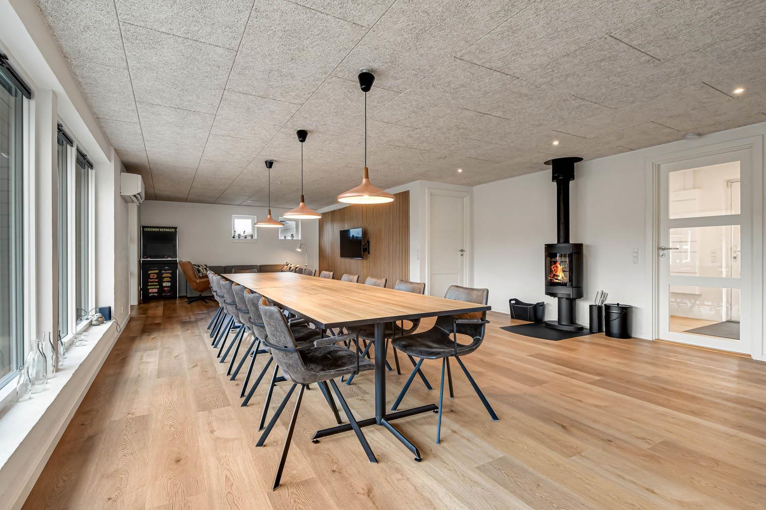 Feriehus på 240 m2. Huset er bygget i 1997 – men er i 2022 blevet totalt istandsat. Huset er minimalistisk i sit udtryk, praktisk indrettet og holdt i lyse, venlige og indbydense farver og materialer. Stor Entrè med vaskemaskine, tørretumbler og indbyggede skabe med loft til gulv låger byder velkommen. Fra entréen åbenbarer der sig et flot kombineret spisestue- og køkkenhjørne med gulvvarme. Helt nyt og indbydende køkkenhjørne med alt i service og køkkengrej, opvaskemaskine, keramiske kogeplader, indbygningsovn, emhætte Køle- / fryseskab, mikroovn. I køkkenafdelingen er der også en helt ny brændeovn ligesom den første af huset i alt 3 varmepumper hænger. Alt sammen optimeringer som gør huset særdeles energioptimeret og billigt i forbrug. En forlængelse af køkkenet er det store spisebord praktisk placeret, hvor der er rigeligt plads til alle gæster. Opholdsstuen med, nye lækre lædermøbler, Smart-TV med danske og tyske programmer samt mulighed for streaming af TV / radio / Apps via Chromecast. I huset er der 6 gode soverum med gode nye senge (1DS, 1DS, 1DS, 1DS, 1DS+1ES, 1DS+1ES). Flotte og lækre badeværelser med klinkegulv med gulvvarme, toilet, håndvask og bruser. Ekstra badeværelse med klinkegulv med gulvvarme, toilet, håndvask og bruser. Ikke ryger hus. Max 1 husdyr tilladt.