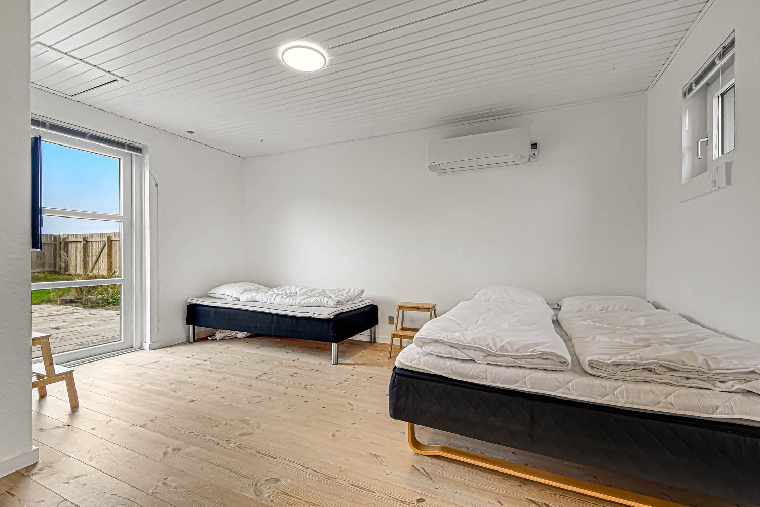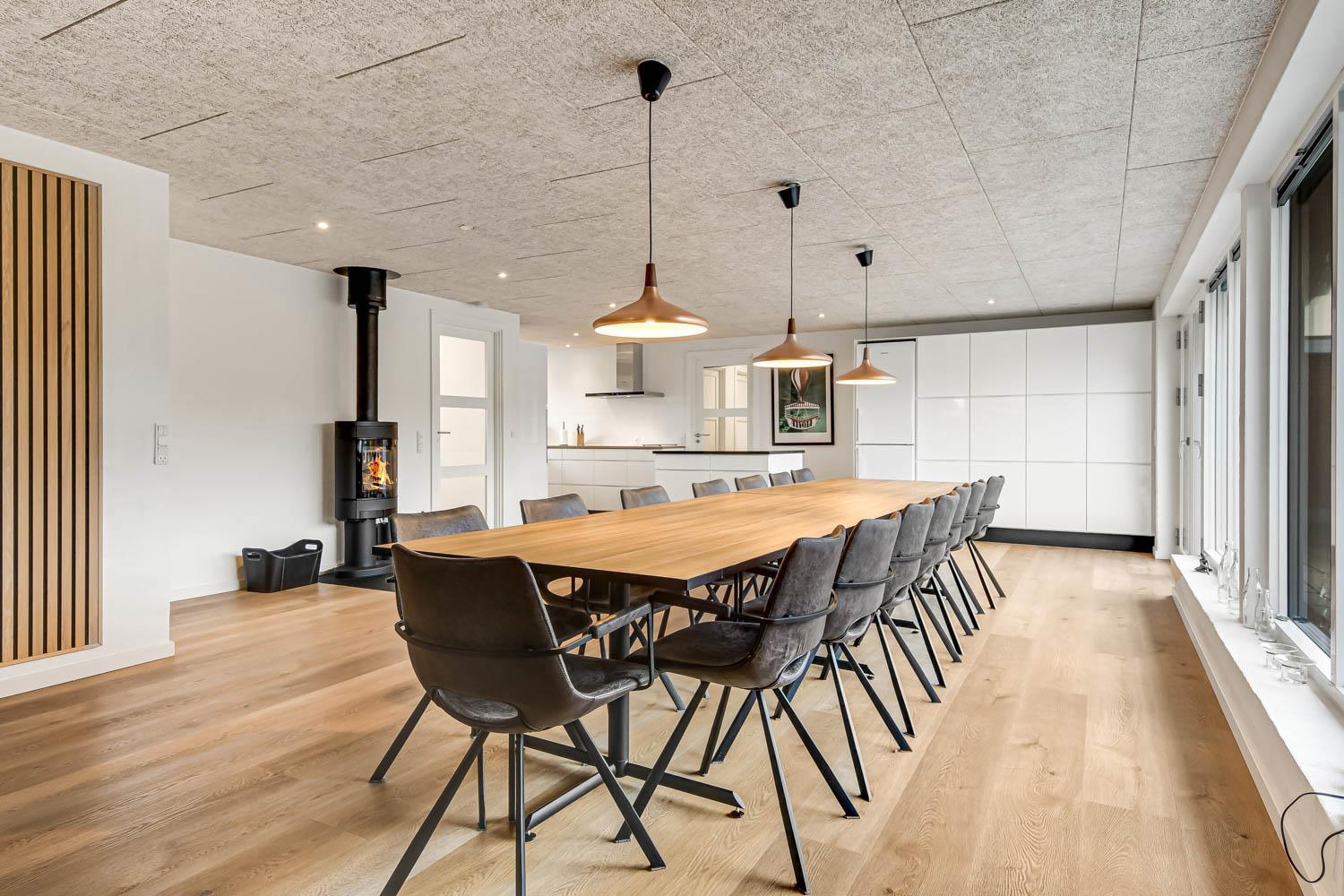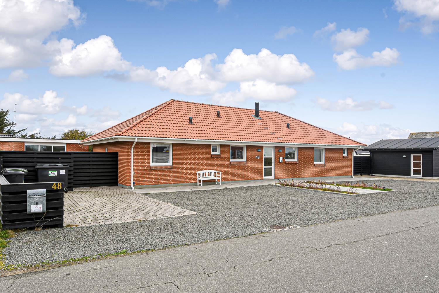 Feriehus på 240 m2. Huset er bygget i 1997 – men er i 2022 blevet totalt istandsat. Huset er minimalistisk i sit udtryk, praktisk indrettet og holdt i lyse, venlige og indbydense farver og materialer. Stor Entrè med vaskemaskine, tørretumbler og indbyggede skabe med loft til gulv låger byder velkommen. Fra entréen åbenbarer der sig et flot kombineret spisestue- og køkkenhjørne med gulvvarme. Helt nyt og indbydende køkkenhjørne med alt i service og køkkengrej, opvaskemaskine, keramiske kogeplader, indbygningsovn, emhætte Køle- / fryseskab, mikroovn. I køkkenafdelingen er der også en helt ny brændeovn ligesom den første af huset i alt 3 varmepumper hænger. Alt sammen optimeringer som gør huset særdeles energioptimeret og billigt i forbrug. En forlængelse af køkkenet er det store spisebord praktisk placeret, hvor der er rigeligt plads til alle gæster. Opholdsstuen med, nye lækre lædermøbler, Smart-TV med danske og tyske programmer samt mulighed for streaming af TV / radio / Apps via Chromecast. I huset er der 6 gode soverum med gode nye senge (1DS, 1DS, 1DS, 1DS, 1DS+1ES, 1DS+1ES). Flotte og lækre badeværelser med klinkegulv med gulvvarme, toilet, håndvask og bruser. Ekstra badeværelse med klinkegulv med gulvvarme, toilet, håndvask og bruser. Ikke ryger hus. Max 1 husdyr tilladt.