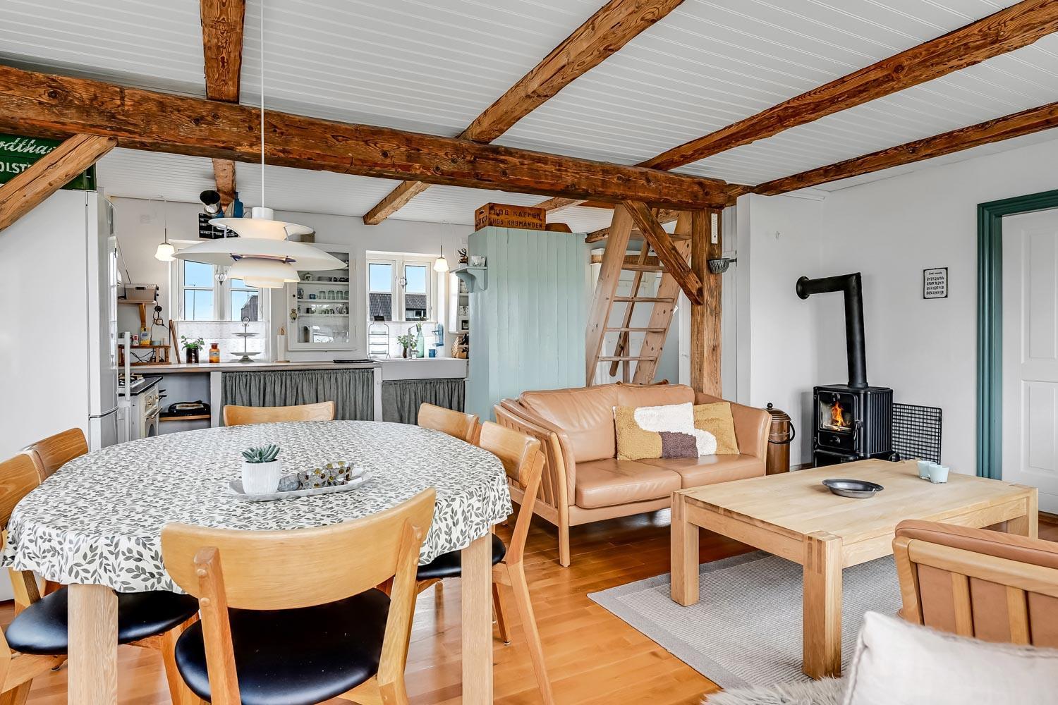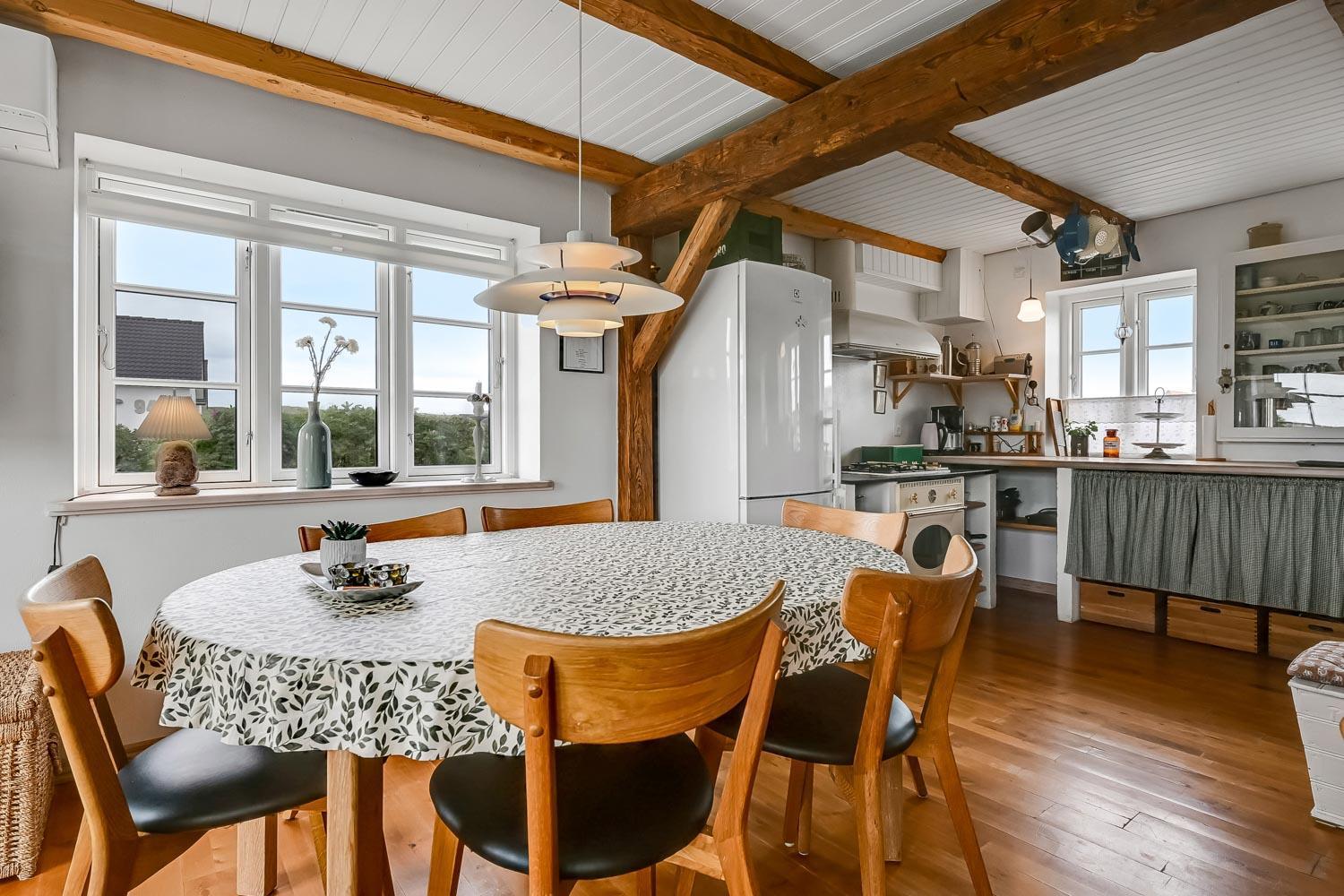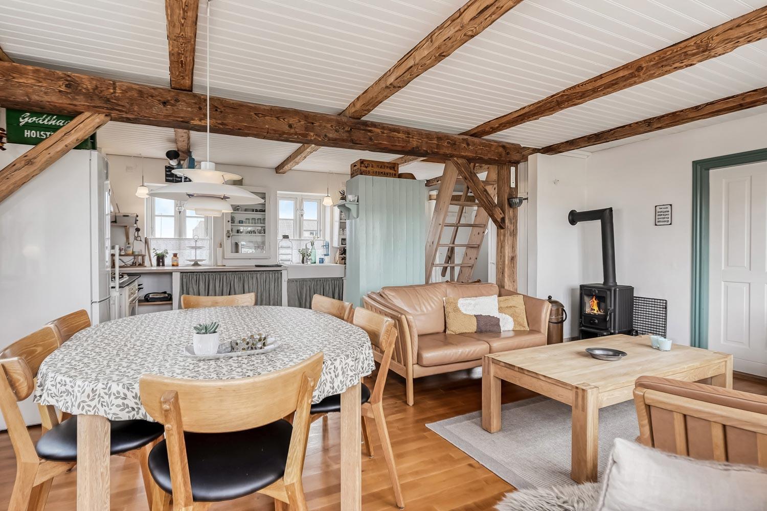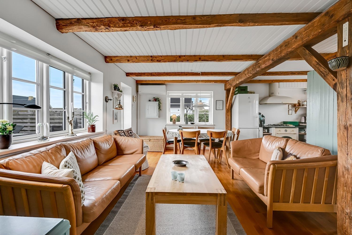 Der hersker ægte sommerhusstemning i hele huset med synlige bjælker i stue og køkken samt trægulve overalt – undtagen på badeværelset.