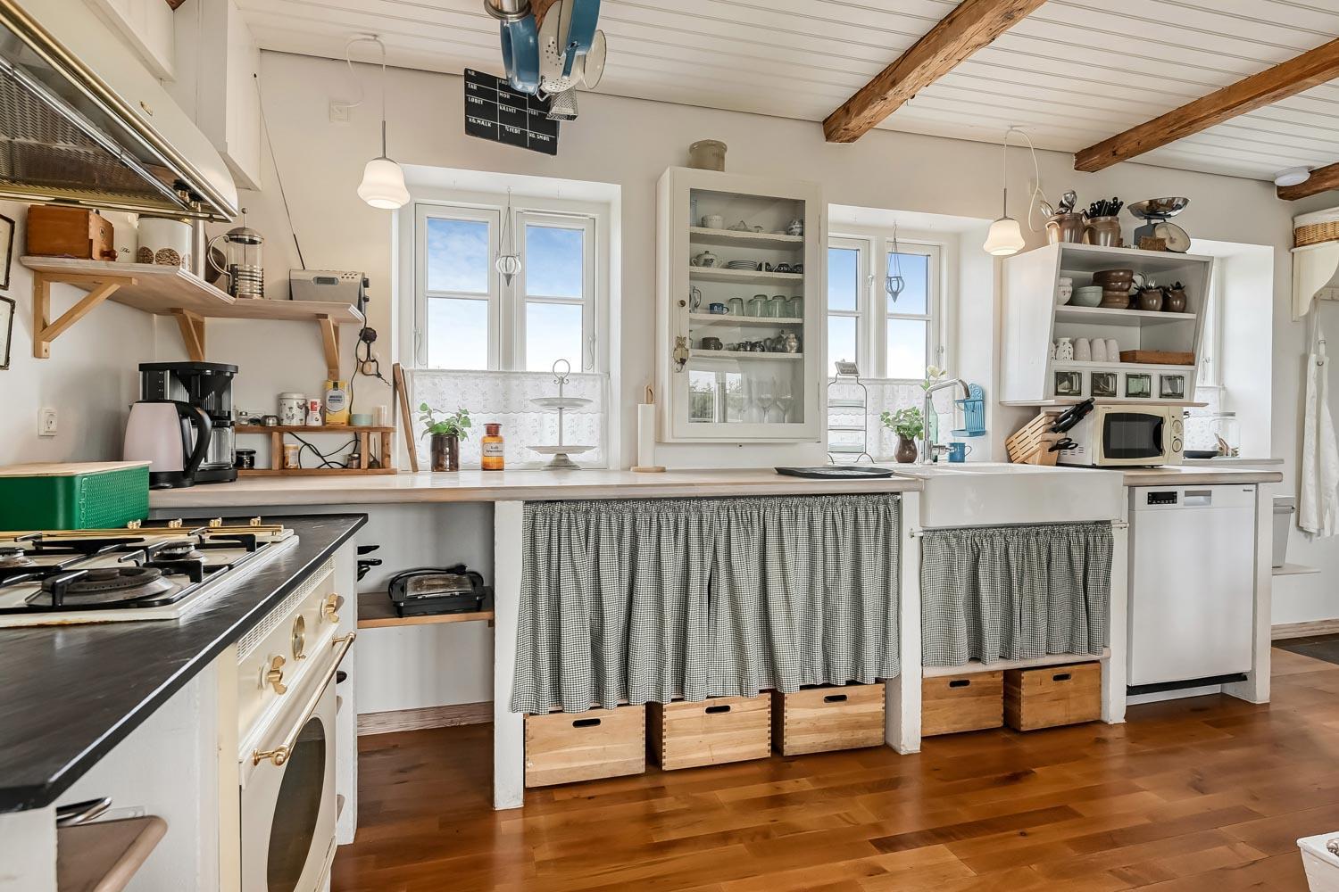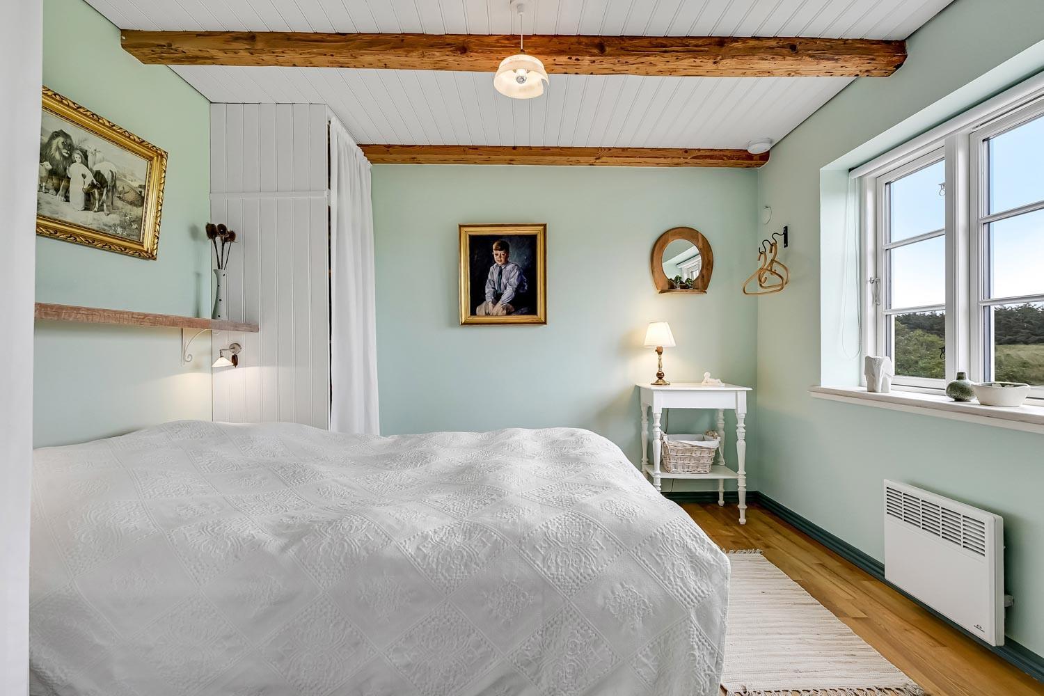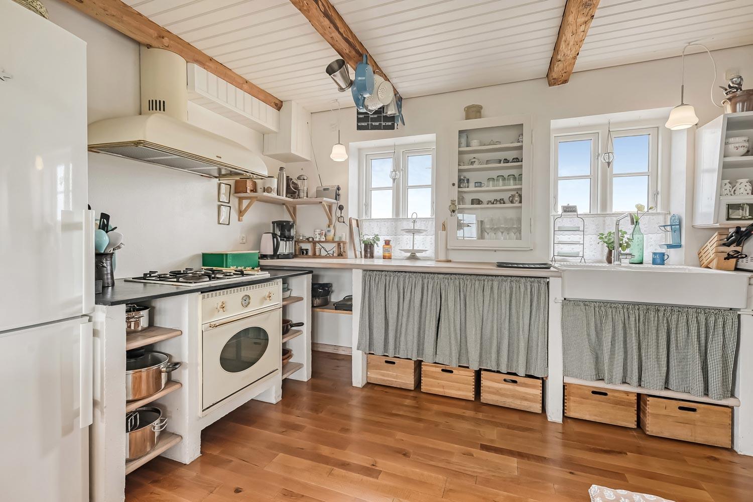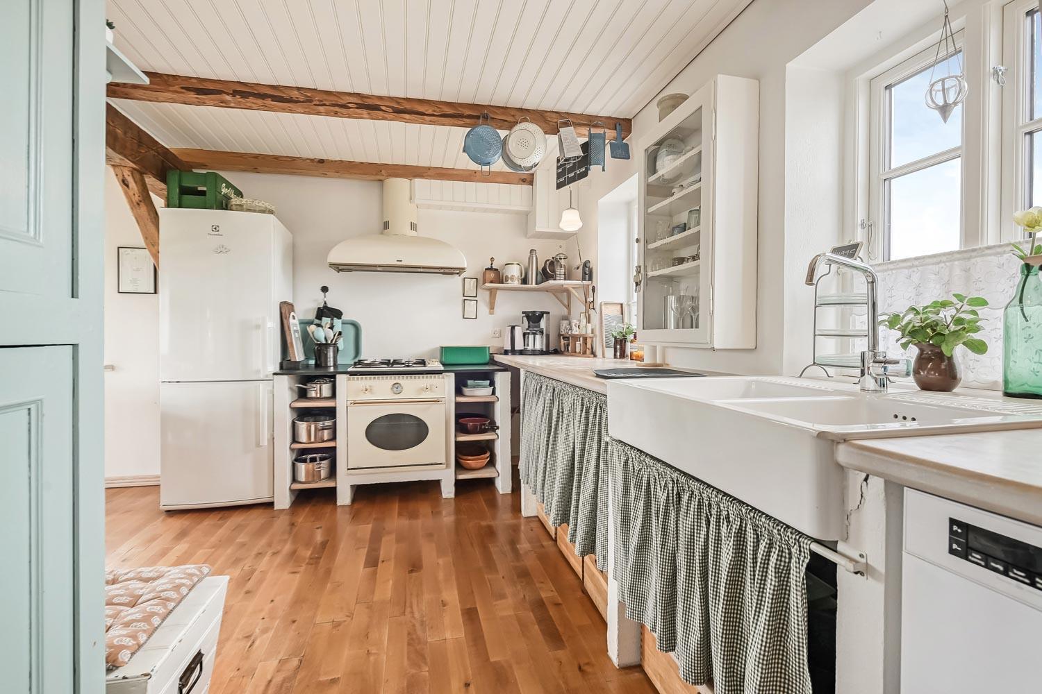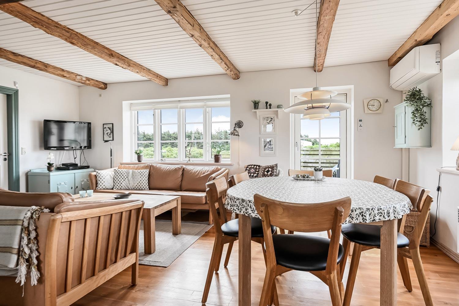Der hersker ægte sommerhusstemning i hele huset med synlige bjælker i stue og køkken samt trægulve overalt – undtagen på badeværelset.