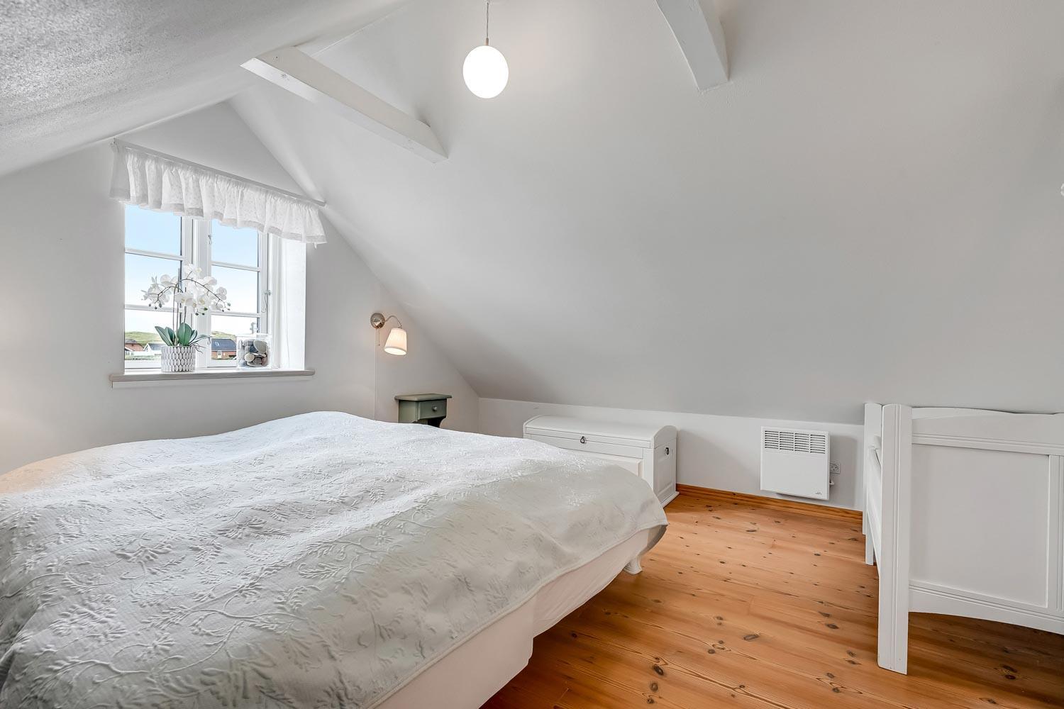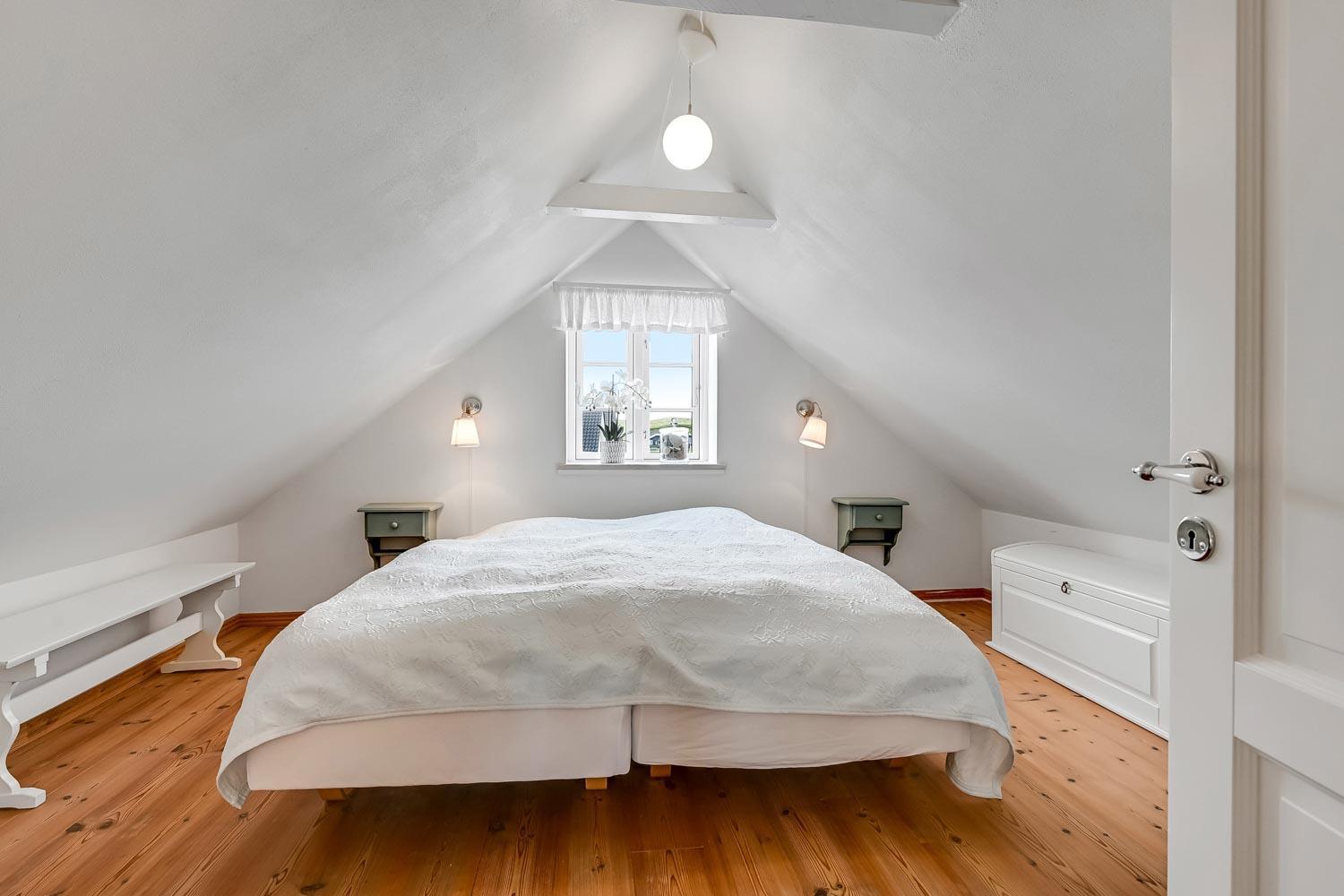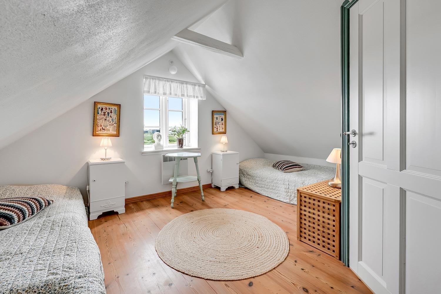 Huset er i to etager. På første sal, som nås via en stejl trappe fra køkken-/stueområdet, finder du to soveværelser med henholdsvis en dobbeltseng og to meget lave enkeltsenge. I stueetagen er der et hyggeligt, kombineret køkken og opholdsstue, et soveværelse med dobbeltseng samt et badeværelse med toilet, håndvask, bruseniche, vaskemaskine og gulvvarme.