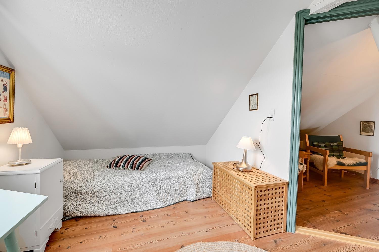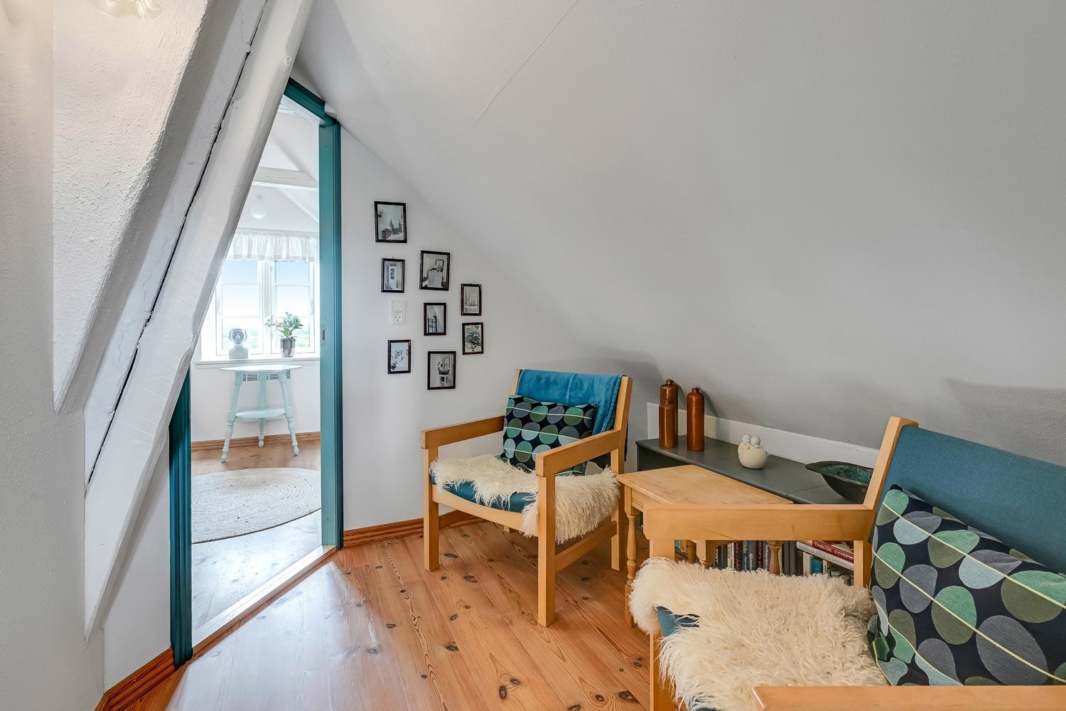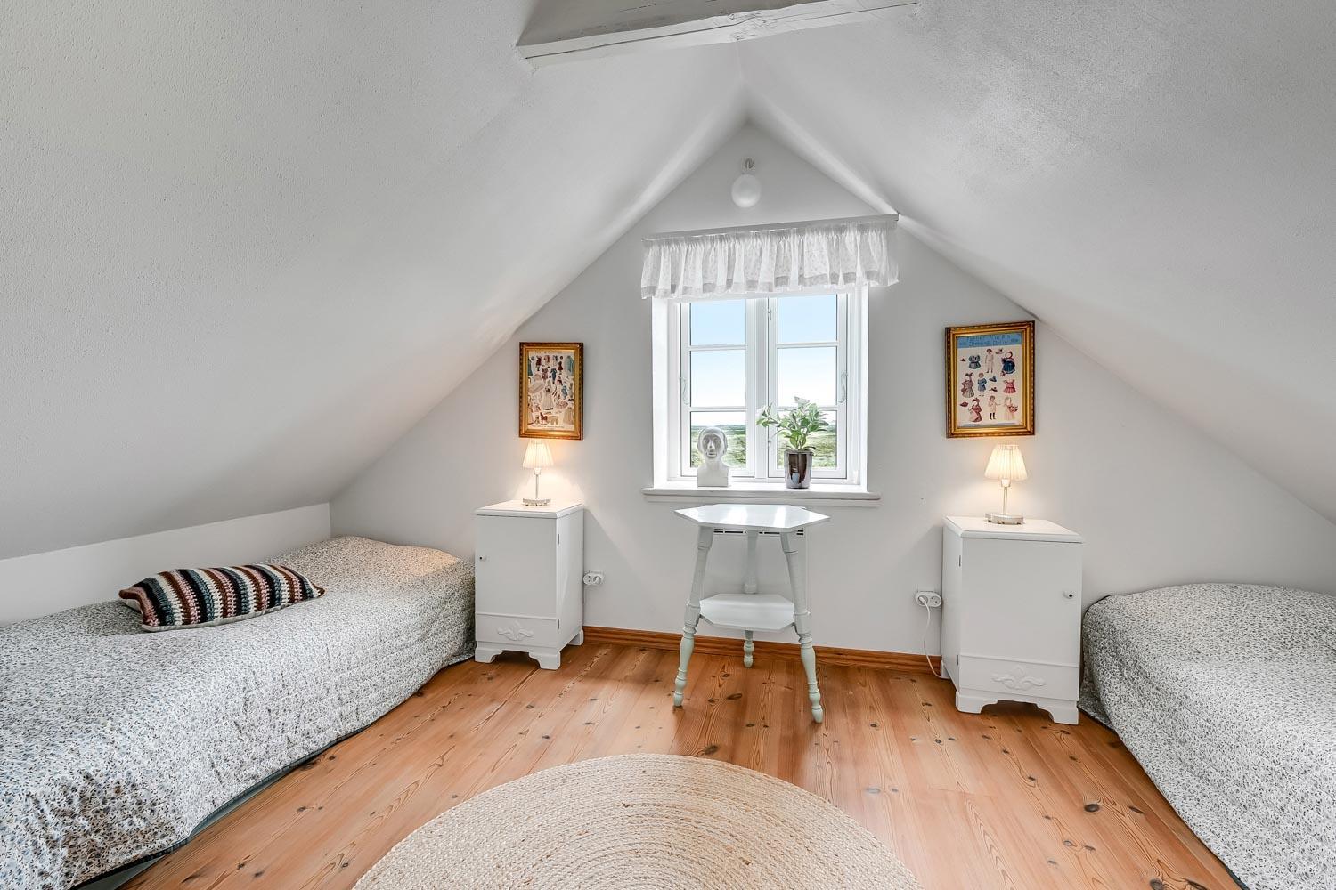 Huset er i to etager. På første sal, som nås via en stejl trappe fra køkken-/stueområdet, finder du to soveværelser med henholdsvis en dobbeltseng og to meget lave enkeltsenge. I stueetagen er der et hyggeligt, kombineret køkken og opholdsstue, et soveværelse med dobbeltseng samt et badeværelse med toilet, håndvask, bruseniche, vaskemaskine og gulvvarme.