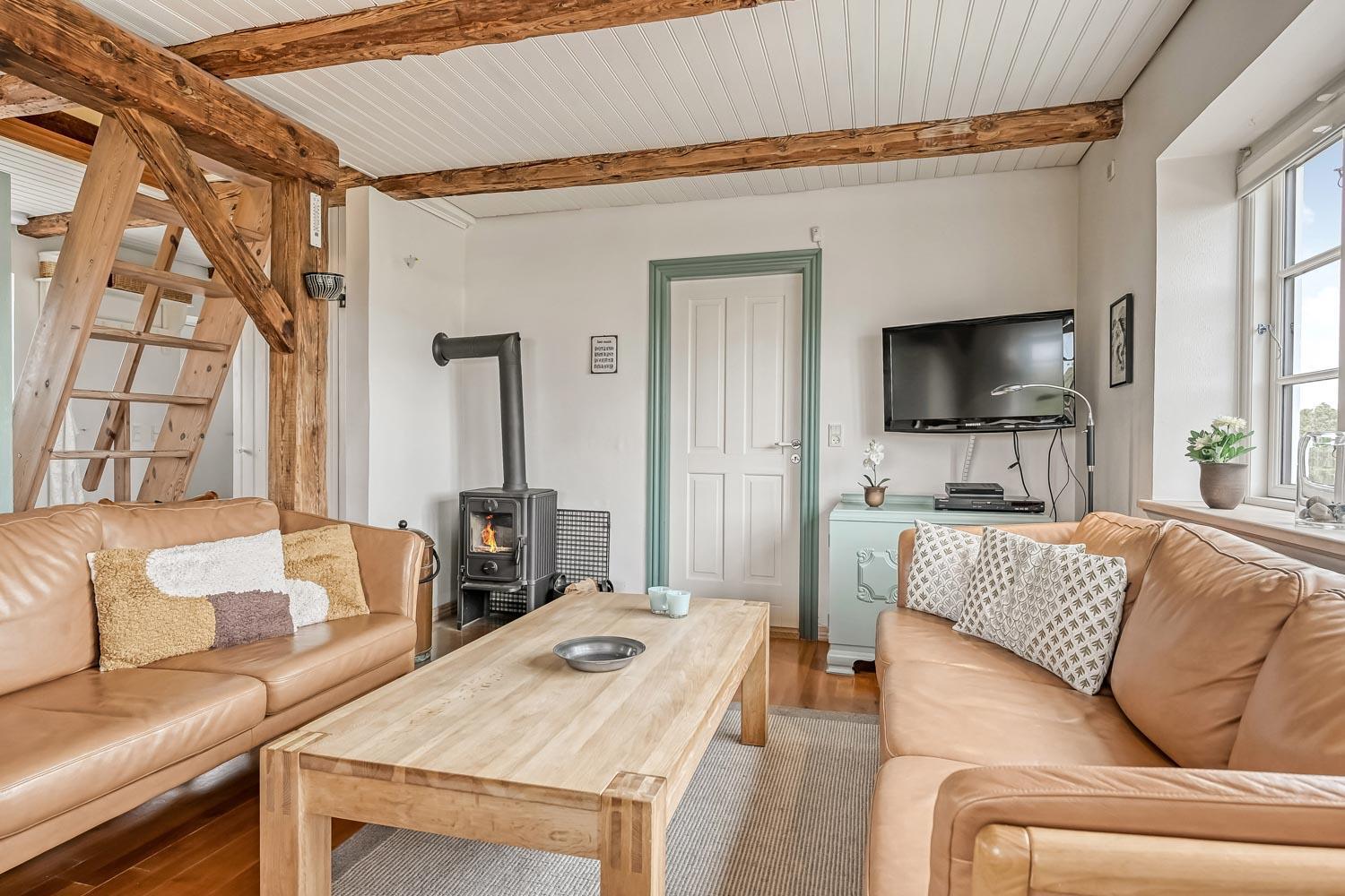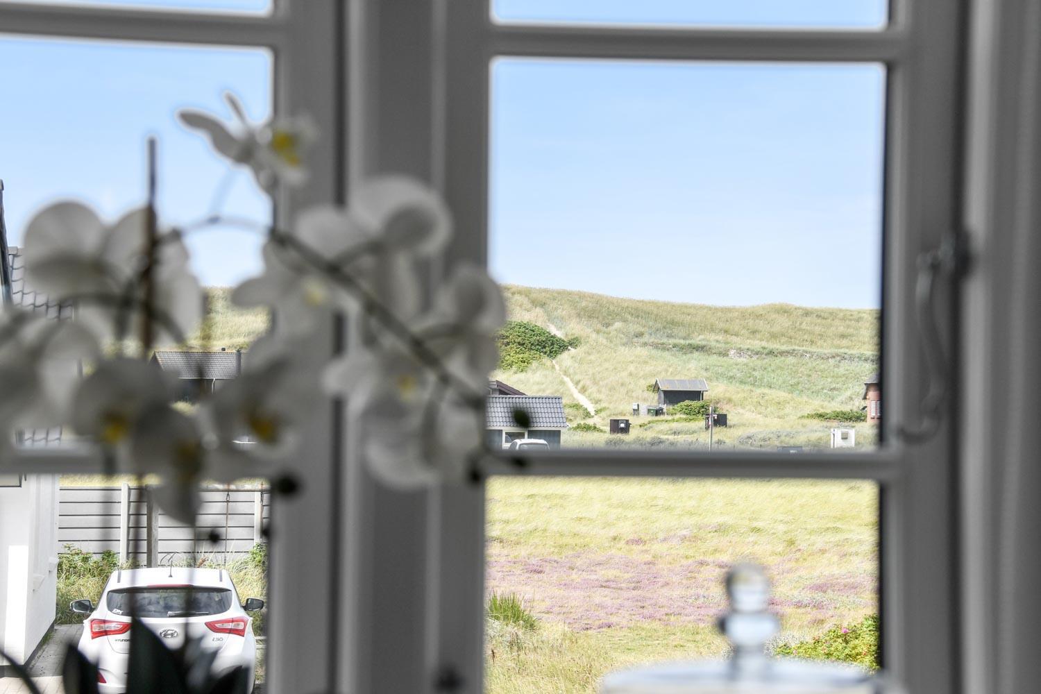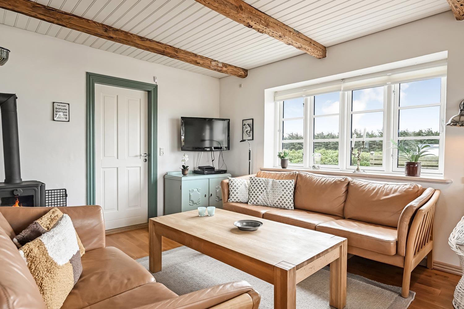 Det flotte køkken er udstyret med gaskomfur, køle-/fryseskab, mikroovn og opvaskemaskine. Stuen byder på komfortable lædermøbler, spiseplads, TV med mulighed for streaming af egne tjenester, varmepumpe og brændeovn – begge bidrager til en behagelig varme og lavere energiforbrug. Fra stuen er der en skøn udsigt til klitterne og direkte udgang til en åben terrasse.
