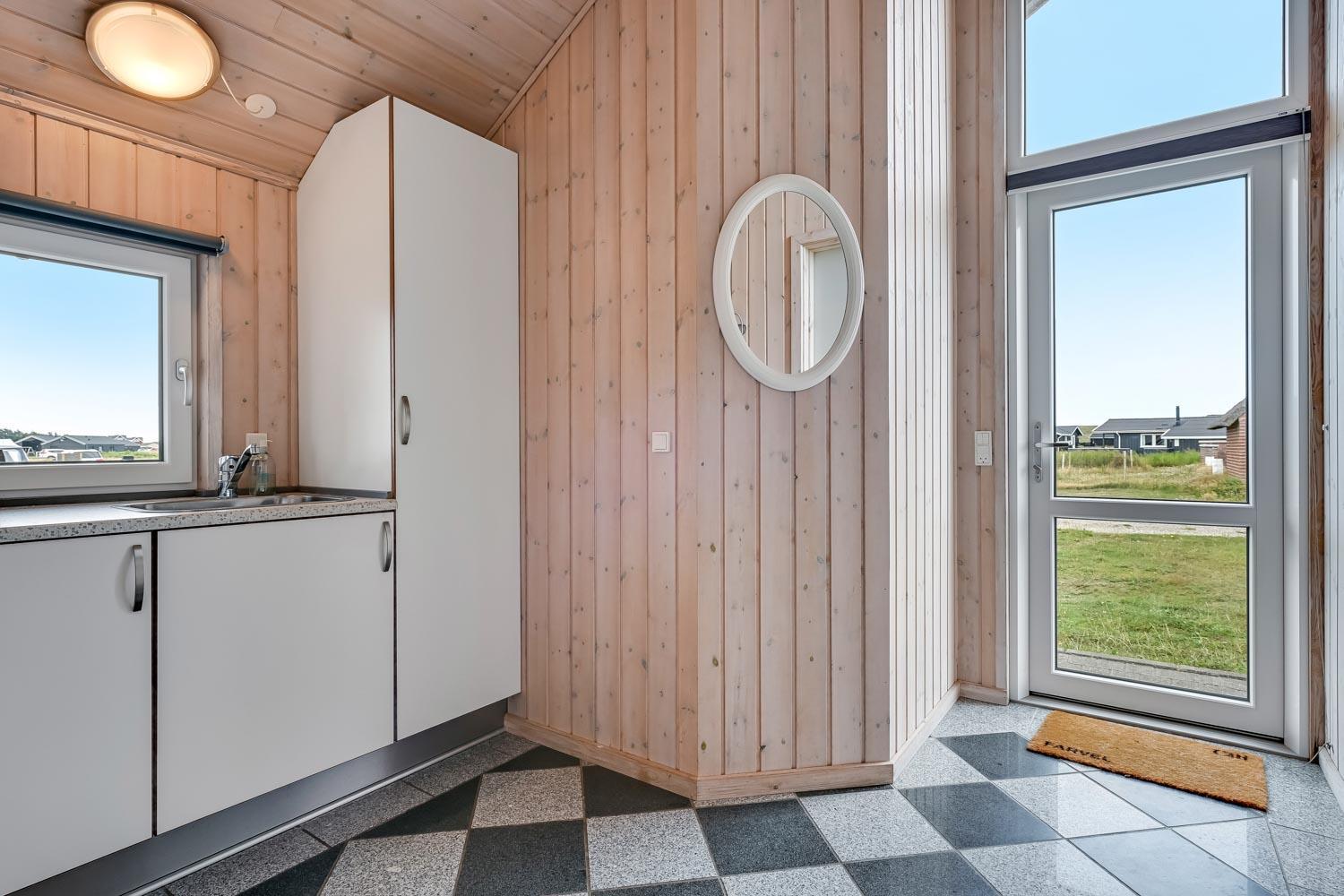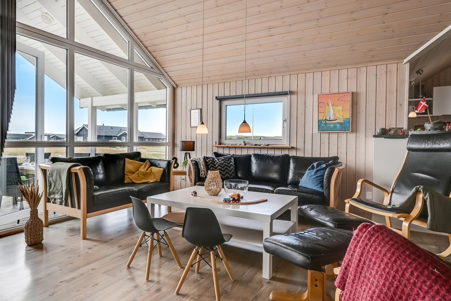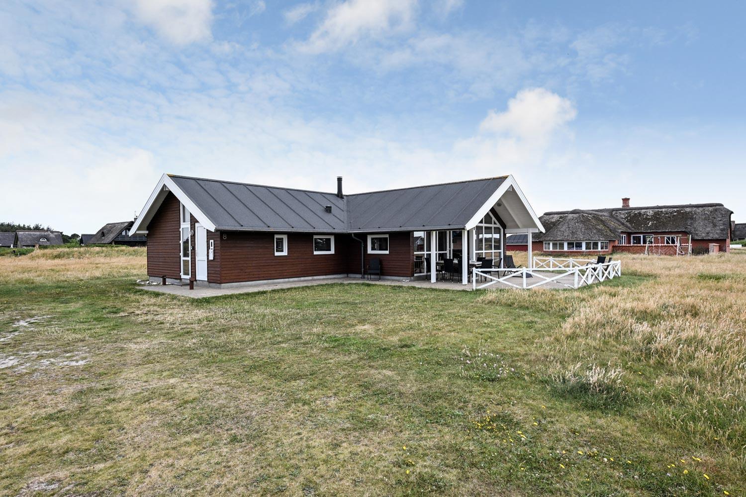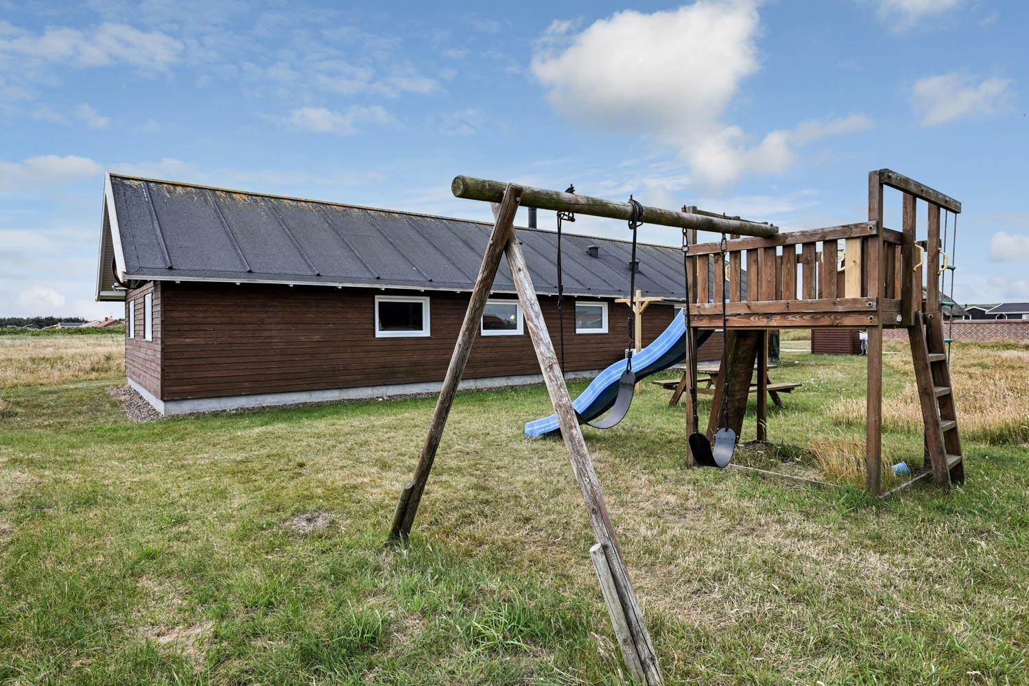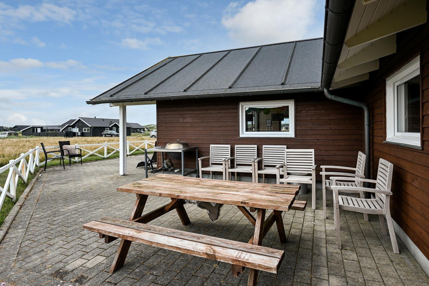 Kun 400 meter fra huset ligger det brusende Vesterhav og fra huset kan de høje klitter ses og nydes. Stort delvist overdækket terrasseanlæg giver unikke muligheder for en plads i solen hele dagen. Der er grill og liggestole som kan flyttes efter behov. Til de mindste gæster er der gynger og legestativ. Hver dag byder Vesterhavet på nye maleriske oplevelse, der inviterer til en frisk gå- eller løbetur. Eller hvad med en lille tur på ca. 10 - 15 min op til områdets lille købmand som i sæsonen har åbent og byder på frisk morgenbrød og hvor de daglige indkøb også kan klares. Så hvad enten du er til aktiv ferie eller total afslapning danner dette flotte feriehus den perfekte ramme både hvad angår hus, beliggenhed og omgivelser.