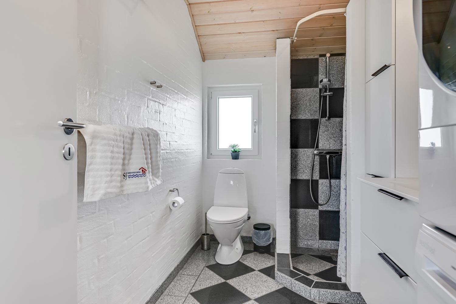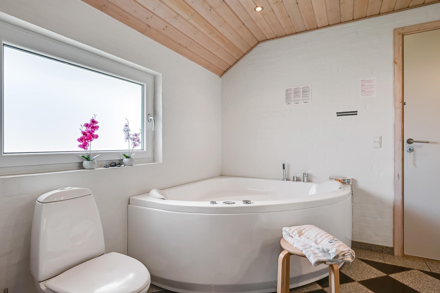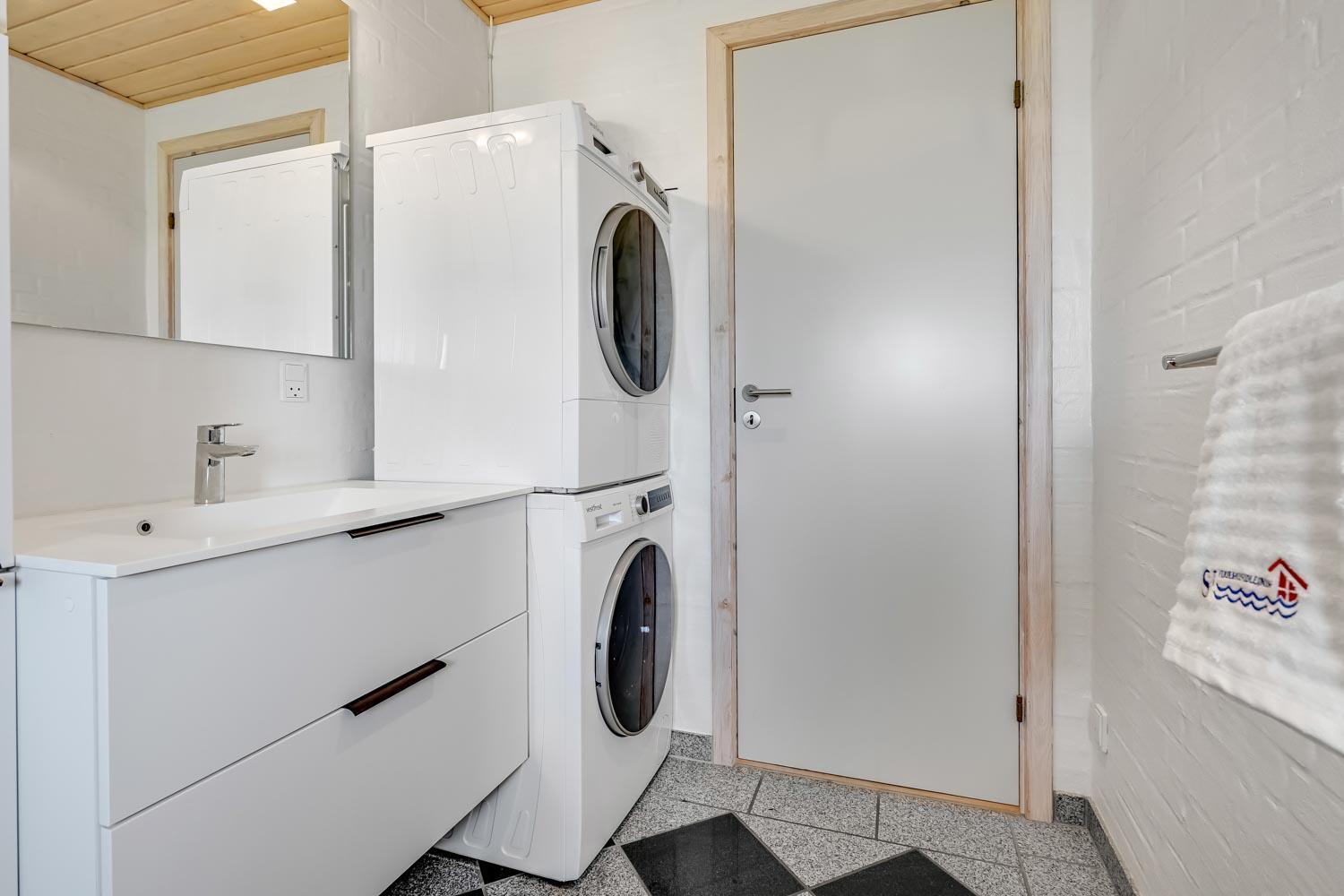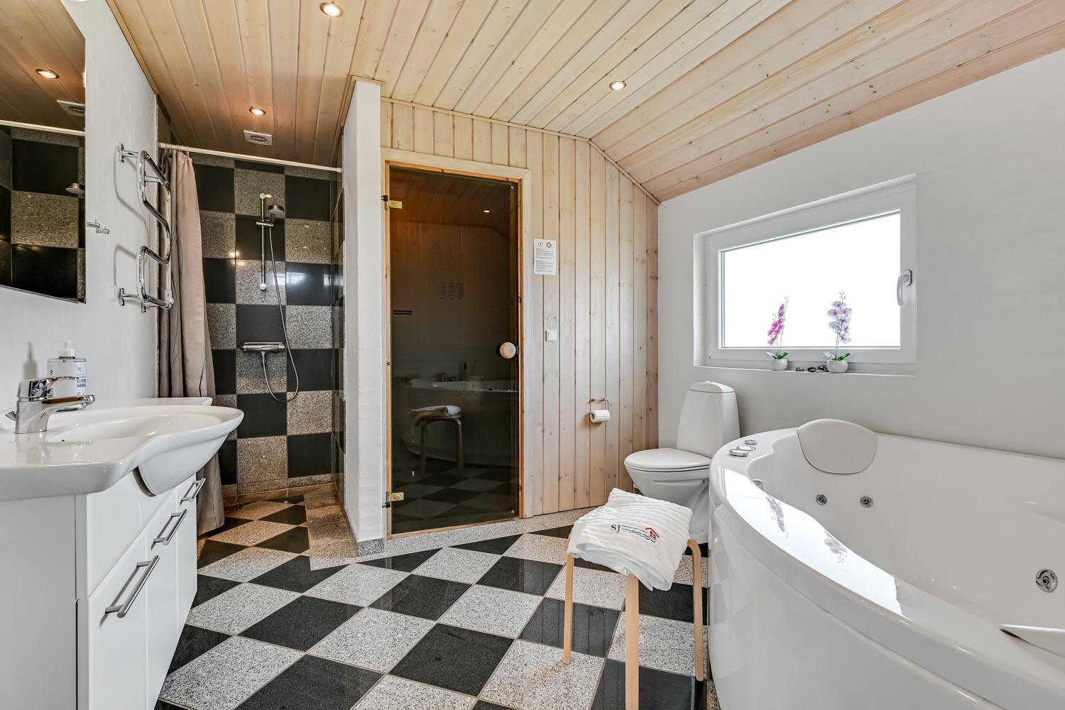 Det store, rummelige badeværelse har spabad, direkte adgang til saunaen, toilet, håndvask, klinkegulv med gulvvarme og bruseniche. Gæstetoilet med toilet, håndvask, bruseniche, klinkegulv med gulvvarme og vaskesøjle med vaskemaskine og tørretumbler.