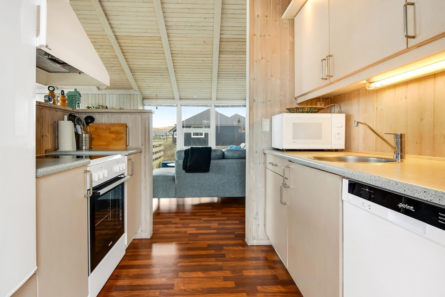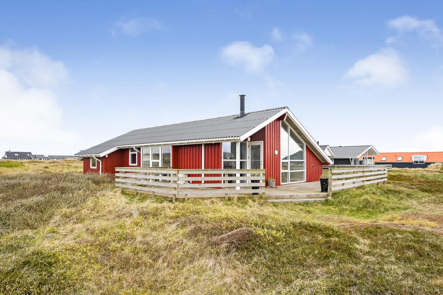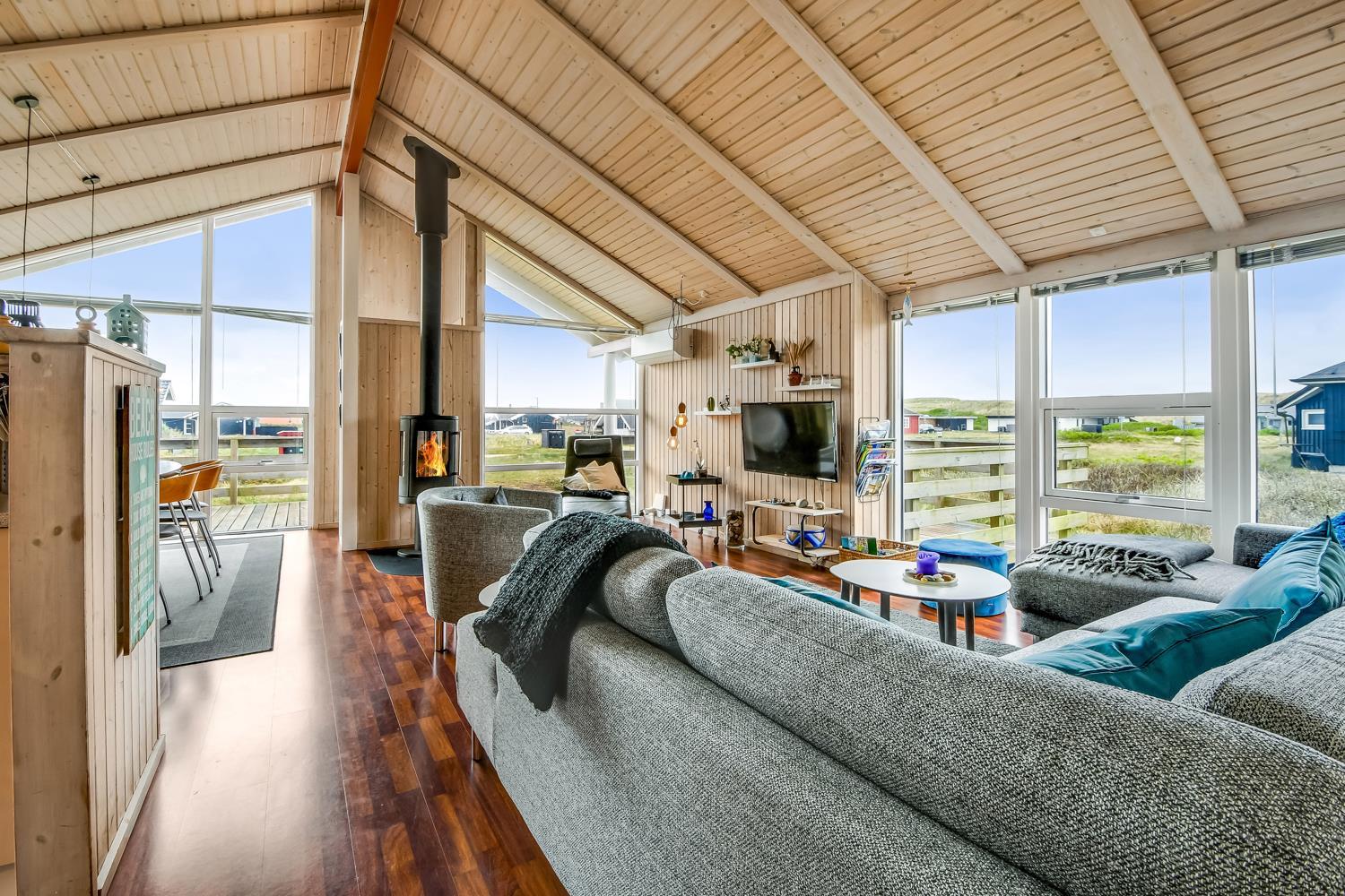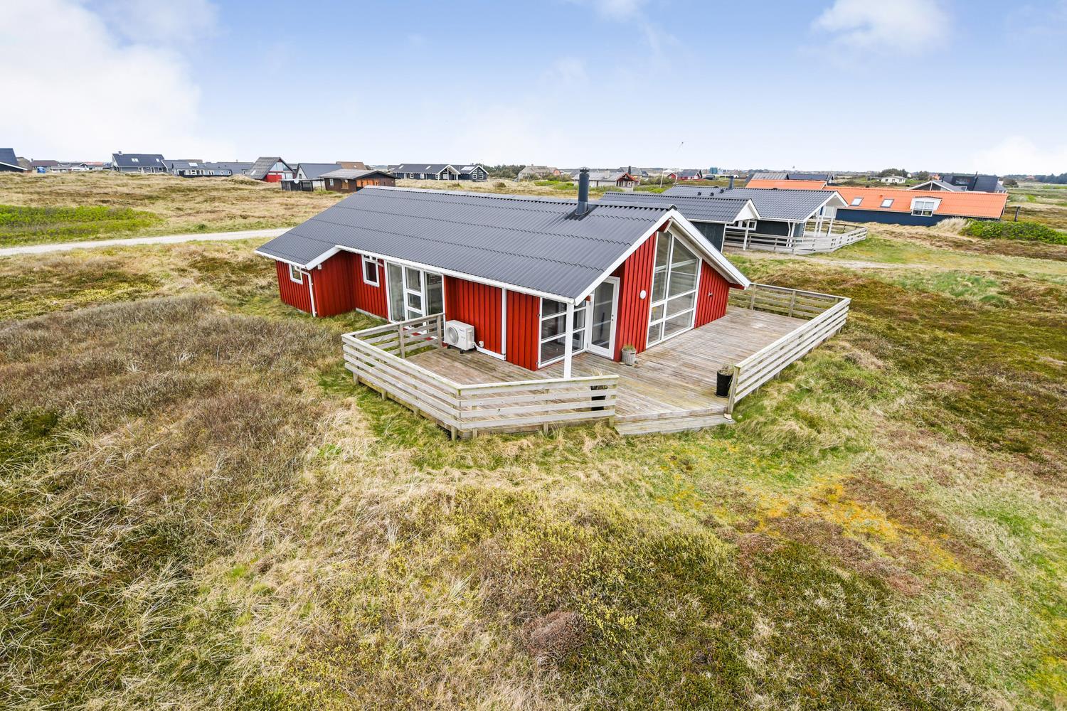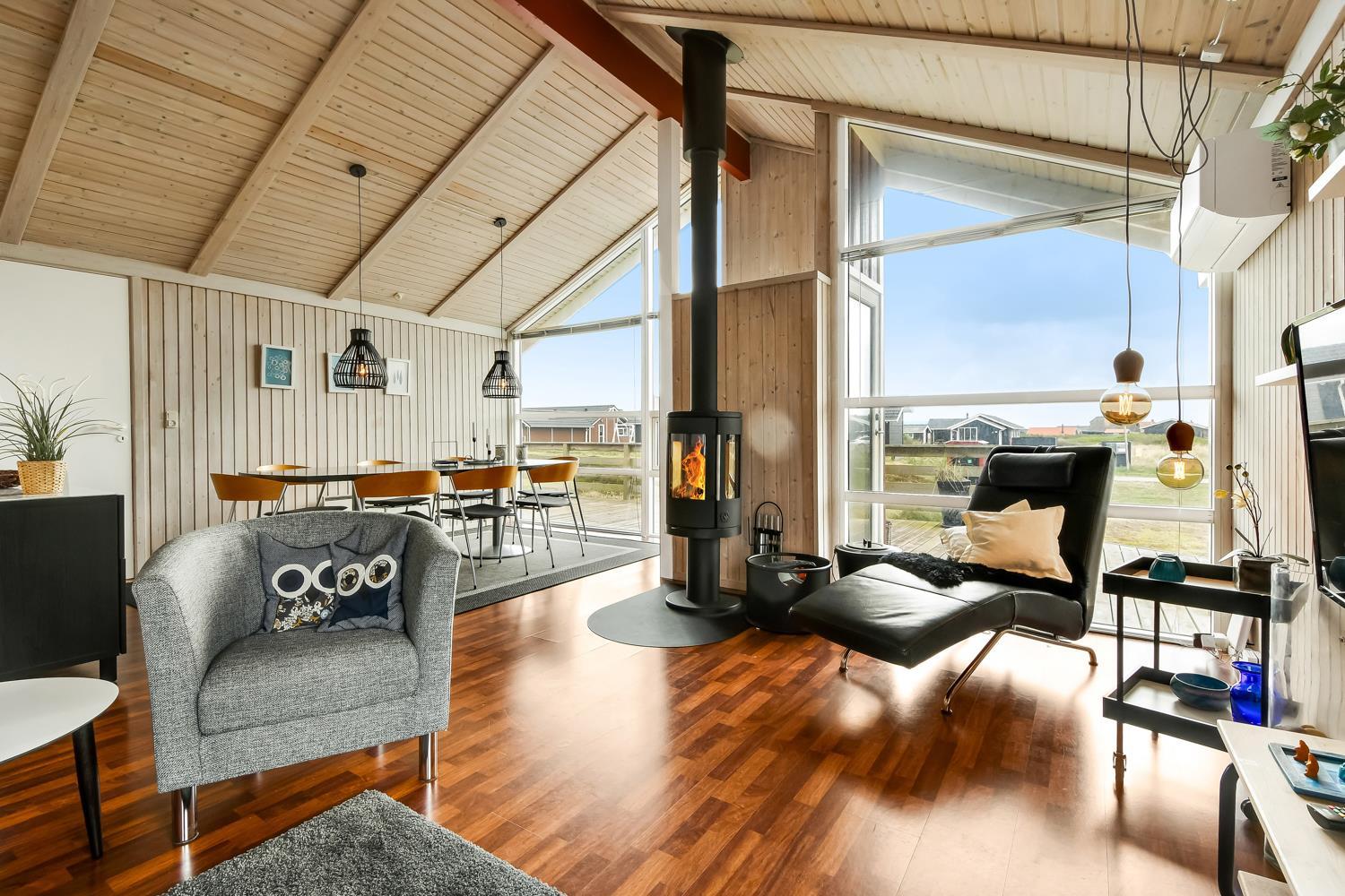 96 m2 stort feriehus, som er bygget i 1997 og siden løbende vedligeholdt så alt fremstår flot og funktionelt. Rummeligt og komfortabelt indrettet. Opholdsstuen er åben til kip. Opholdsstuen er opdelt i spisestue, som er kombineret med det åbne køkkenhjørne. Opholdsstuen med, flotte polstermøbler, spisebord, TV med danske og tyske programmer via fibernet. Nyd udsigten til de høje klitter ved Vesterhavet, over området og slap af foran den knitrende brændeovn som sammen med varmepumpen hjælper med at reducere udgiften til varmeregningen. Flot mørkt trægulv i opholdsrum, køkkenhjørne. 2 gode soverum (1DS, 1DS, 2 KS som også kan bruges som enkeltsenge) – huset må dog max bebos af 6 personer. Der er også trægulve i soverummene. Køkkenhjørne med alt i service / køkkengrej samt elektrisk komfur med kogeplader, emhætte, opvaskemaskine, køleskab med fryseboks og mikroovn. Dejligt badeværelse toilet, håndvask, bruser, vaskemaskine, spabad og direkte adgang til saunaen. Ekstra badeværelse med toilet, håndvask, bruser. Der er klinkegulv med gulvvarme på begge badeværelser. Ikke ryger hus. Husdyr er ikke tilladt.