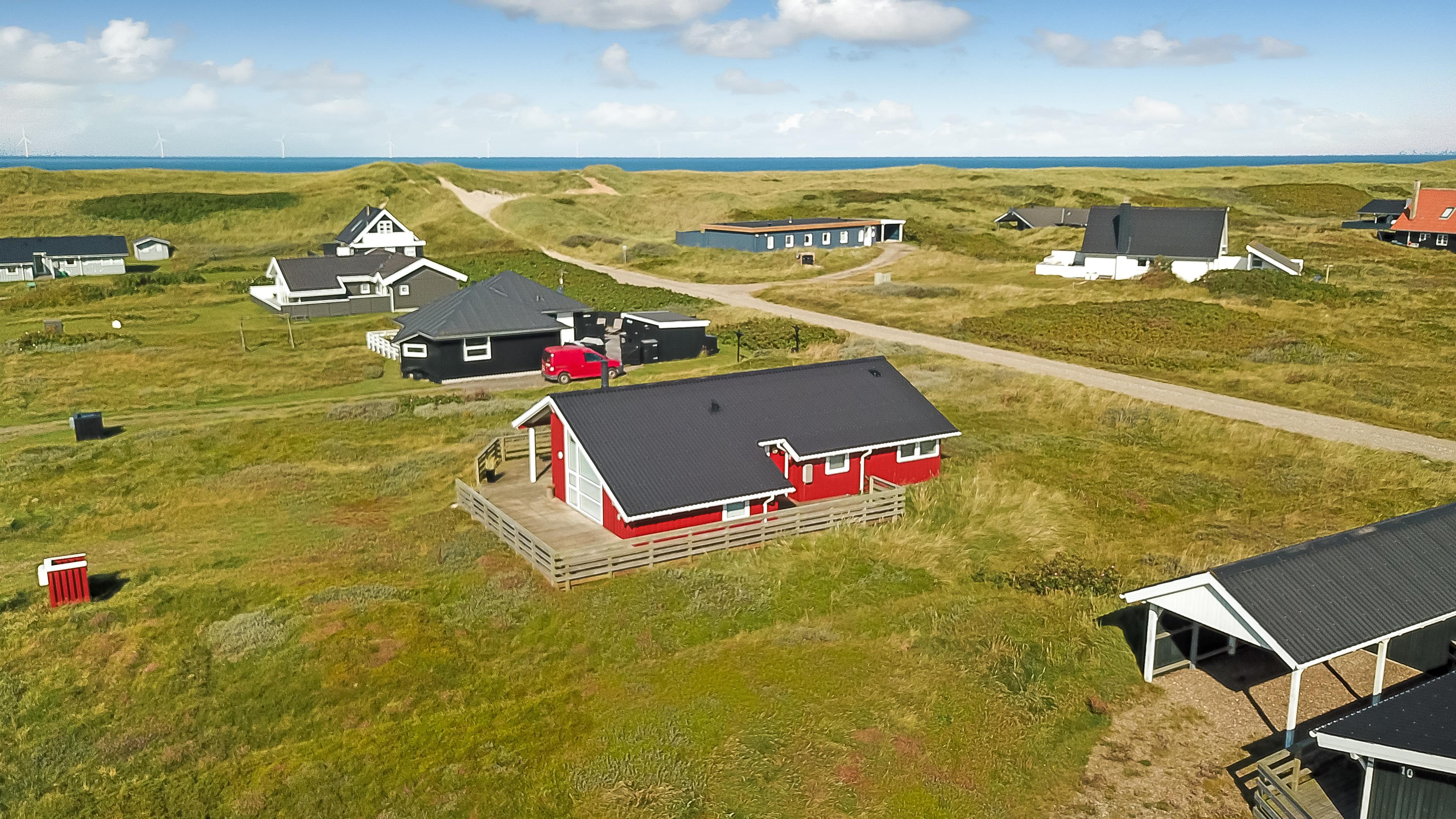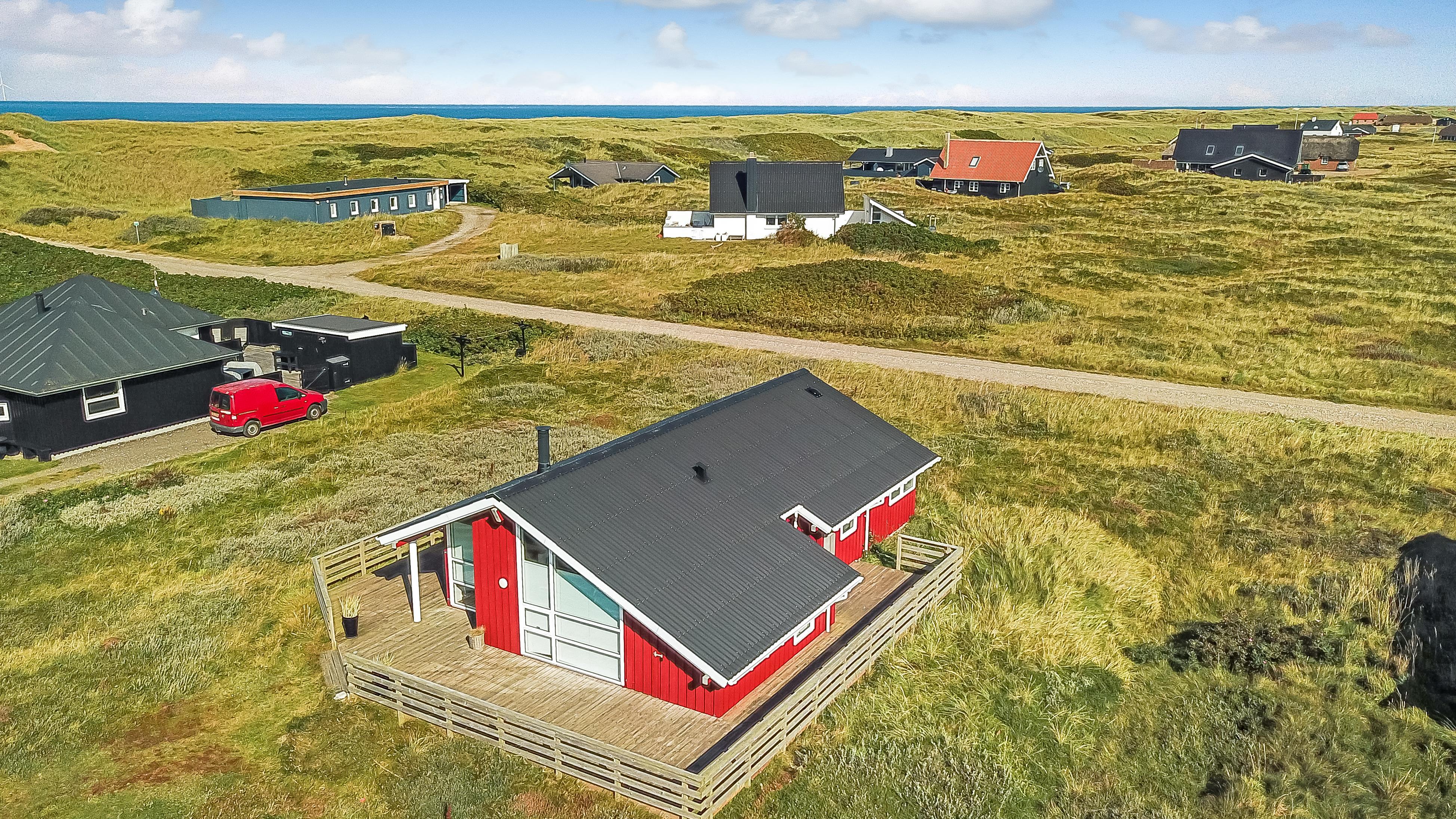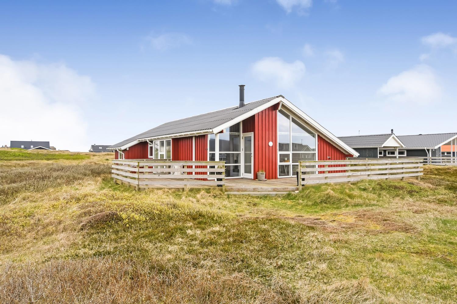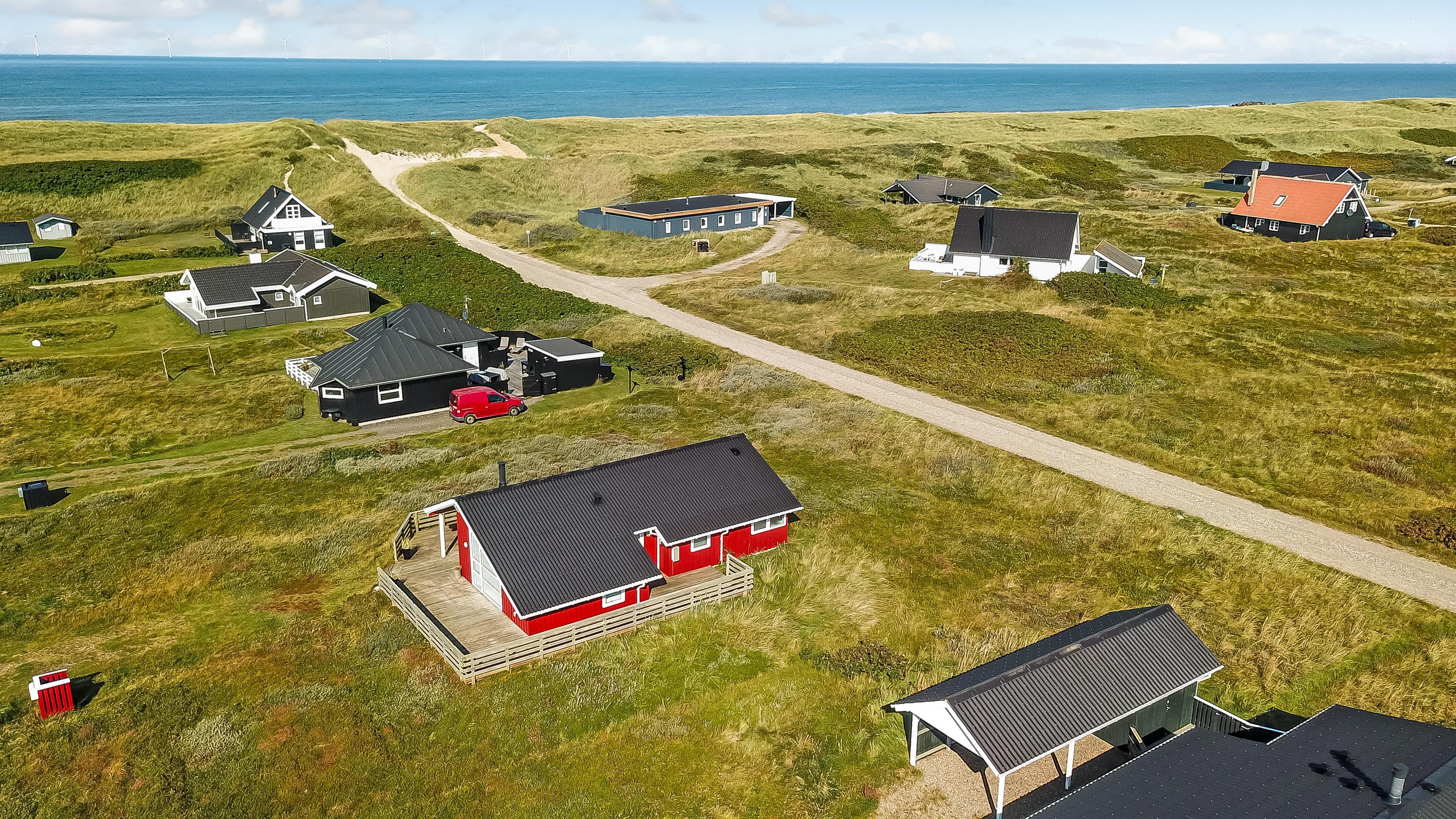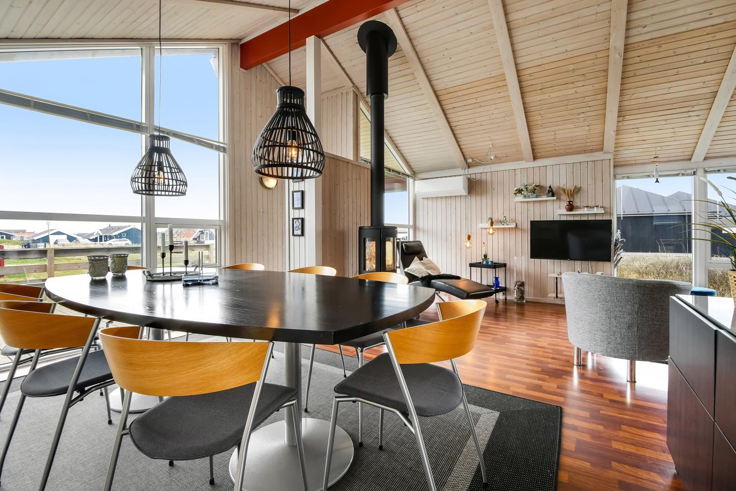 96 m2 stort feriehus, som er bygget i 1997 og siden løbende vedligeholdt så alt fremstår flot og funktionelt. Rummeligt og komfortabelt indrettet. Opholdsstuen er åben til kip. Opholdsstuen er opdelt i spisestue, som er kombineret med det åbne køkkenhjørne. Opholdsstuen med, flotte polstermøbler, spisebord, TV med danske og tyske programmer via fibernet. Nyd udsigten til de høje klitter ved Vesterhavet, over området og slap af foran den knitrende brændeovn som sammen med varmepumpen hjælper med at reducere udgiften til varmeregningen. Flot mørkt trægulv i opholdsrum, køkkenhjørne. 2 gode soverum (1DS, 1DS, 2 KS som også kan bruges som enkeltsenge) – huset må dog max bebos af 6 personer. Der er også trægulve i soverummene. Køkkenhjørne med alt i service / køkkengrej samt elektrisk komfur med kogeplader, emhætte, opvaskemaskine, køleskab med fryseboks og mikroovn. Dejligt badeværelse toilet, håndvask, bruser, vaskemaskine, spabad og direkte adgang til saunaen. Ekstra badeværelse med toilet, håndvask, bruser. Der er klinkegulv med gulvvarme på begge badeværelser. Ikke ryger hus. Husdyr er ikke tilladt.