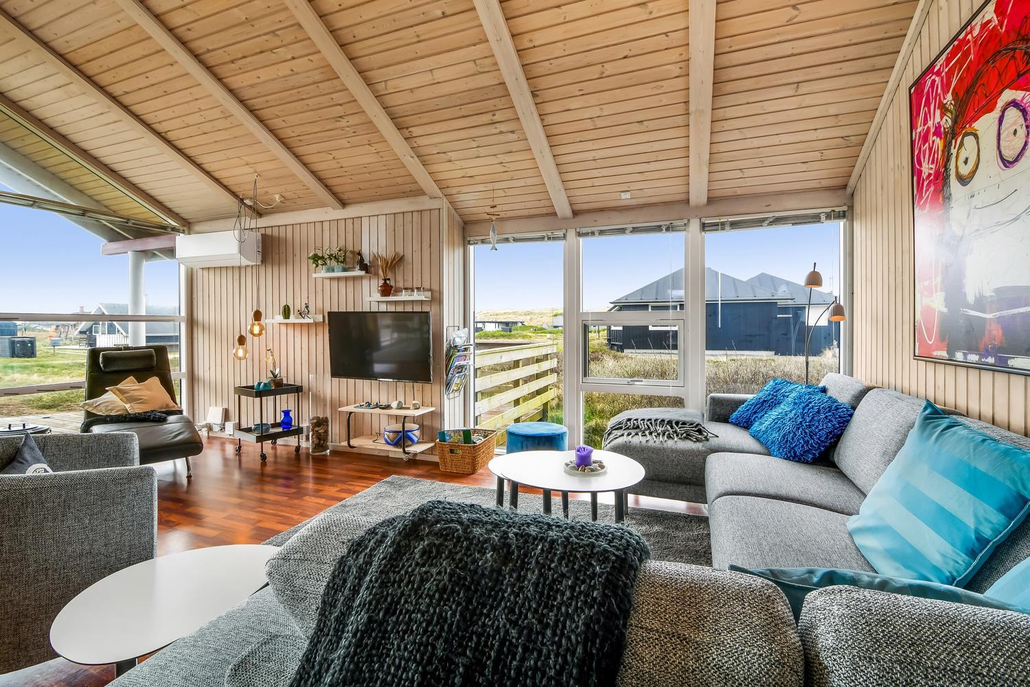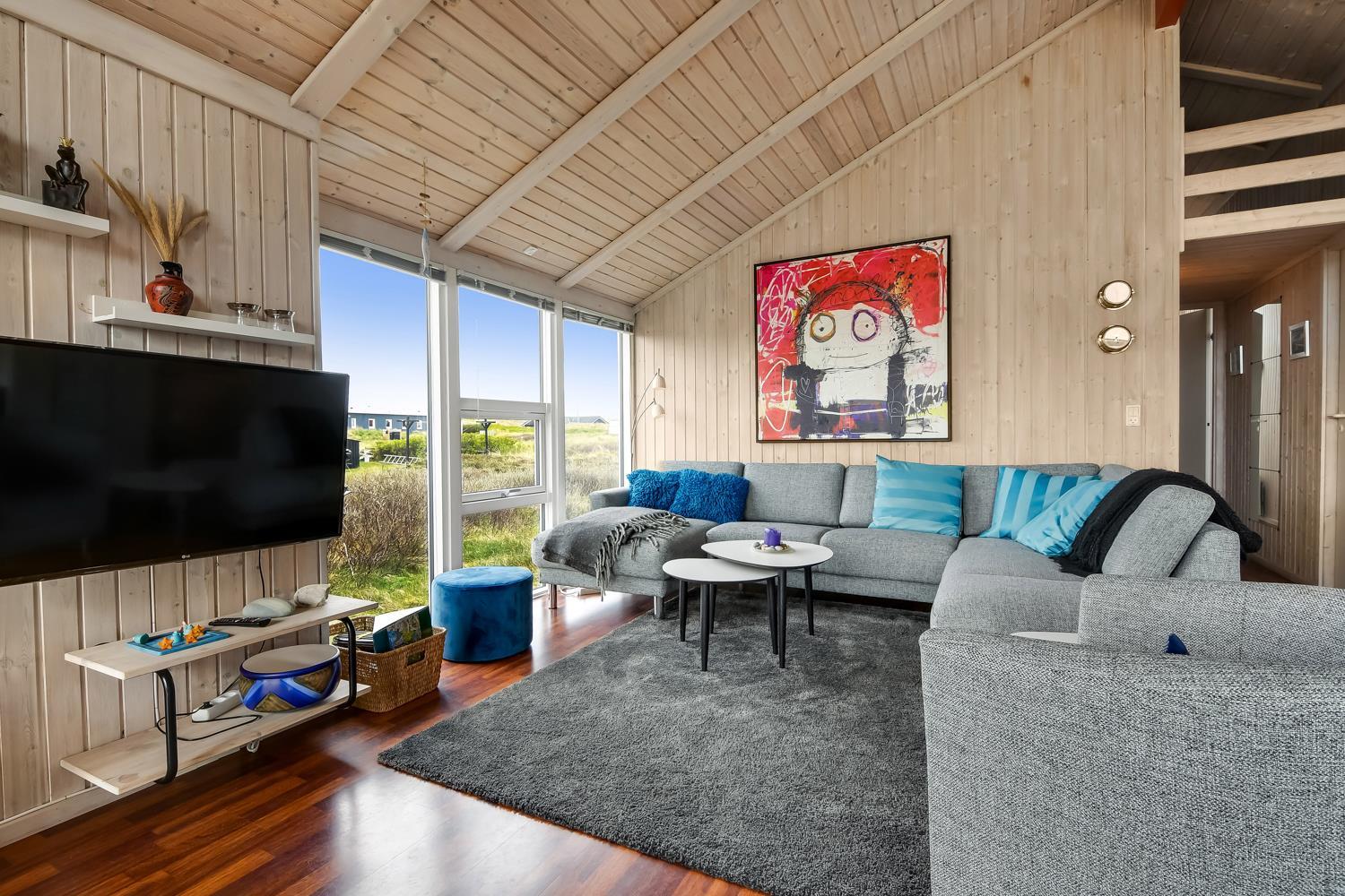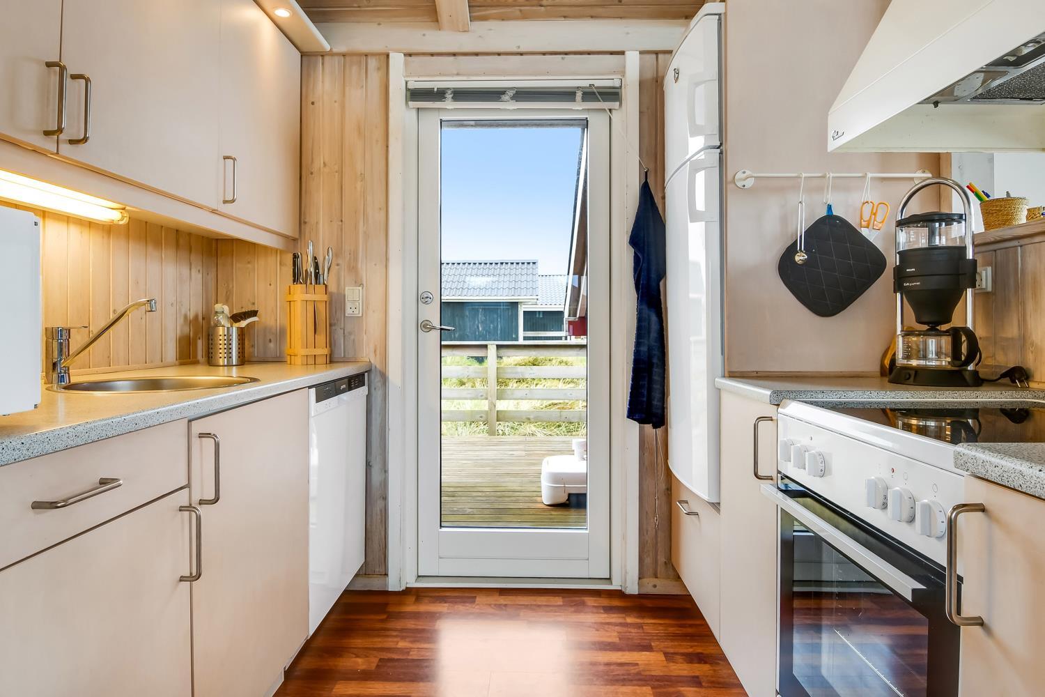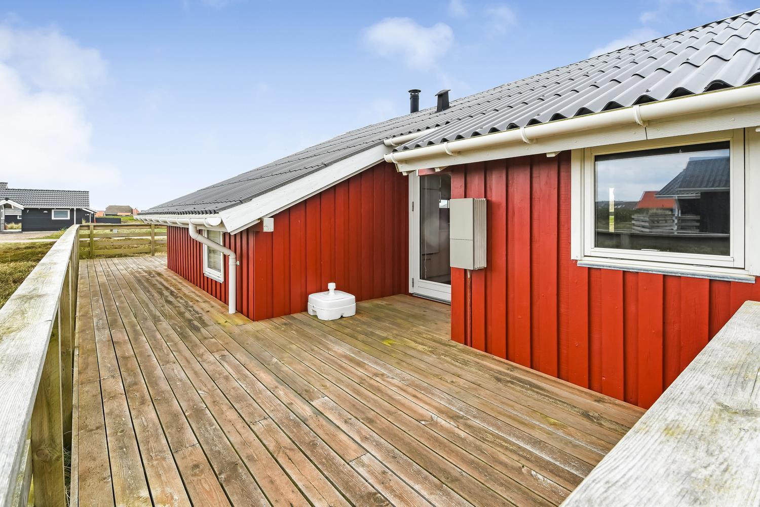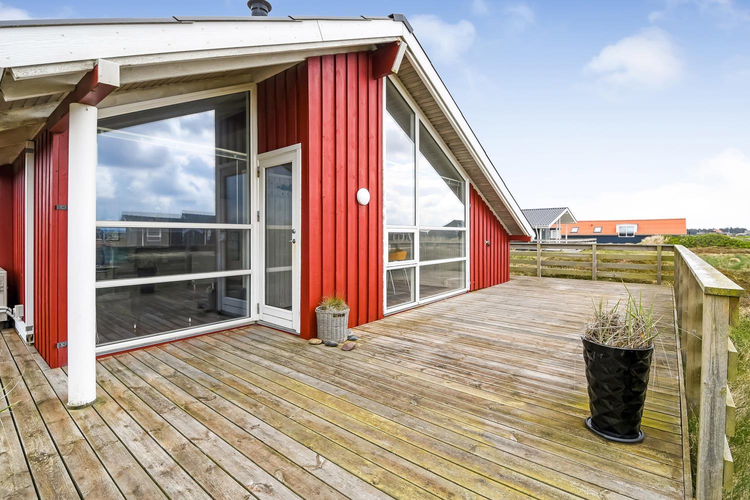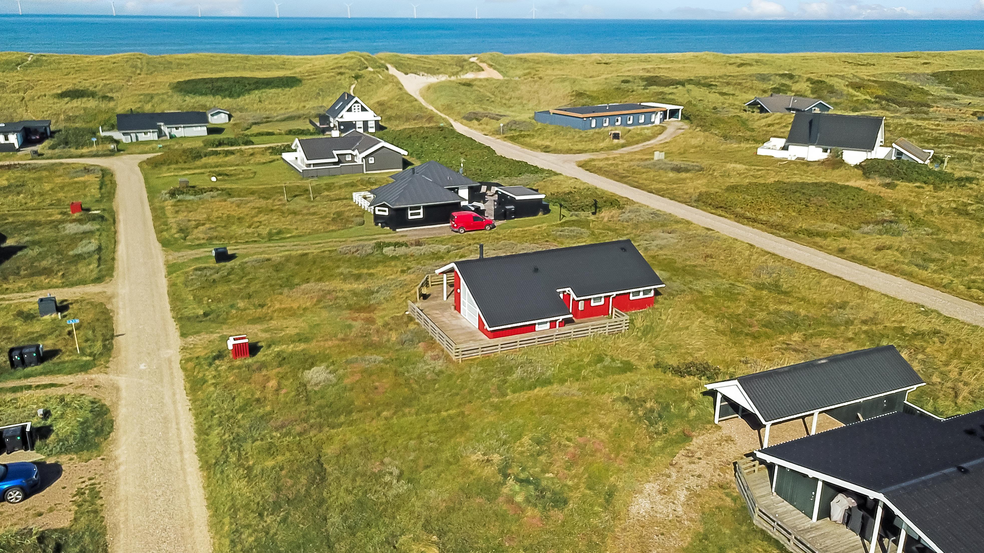 96 m2 stort feriehus, som er bygget i 1997 og siden løbende vedligeholdt så alt fremstår flot og funktionelt. Rummeligt og komfortabelt indrettet. Opholdsstuen er åben til kip. Opholdsstuen er opdelt i spisestue, som er kombineret med det åbne køkkenhjørne. Opholdsstuen med, flotte polstermøbler, spisebord, TV med danske og tyske programmer via fibernet. Nyd udsigten til de høje klitter ved Vesterhavet, over området og slap af foran den knitrende brændeovn som sammen med varmepumpen hjælper med at reducere udgiften til varmeregningen. Flot mørkt trægulv i opholdsrum, køkkenhjørne. 2 gode soverum (1DS, 1DS, 2 KS som også kan bruges som enkeltsenge) – huset må dog max bebos af 6 personer. Der er også trægulve i soverummene. Køkkenhjørne med alt i service / køkkengrej samt elektrisk komfur med kogeplader, emhætte, opvaskemaskine, køleskab med fryseboks og mikroovn. Dejligt badeværelse toilet, håndvask, bruser, vaskemaskine, spabad og direkte adgang til saunaen. Ekstra badeværelse med toilet, håndvask, bruser. Der er klinkegulv med gulvvarme på begge badeværelser. Ikke ryger hus. Husdyr er ikke tilladt.