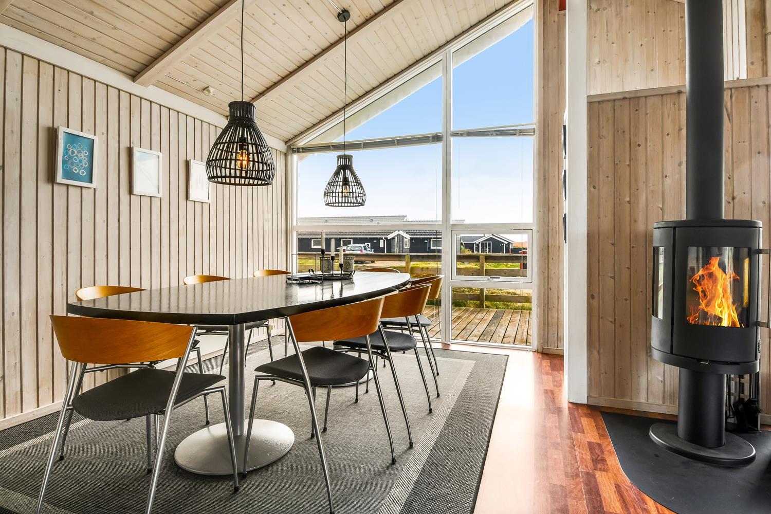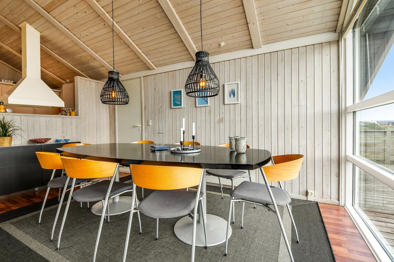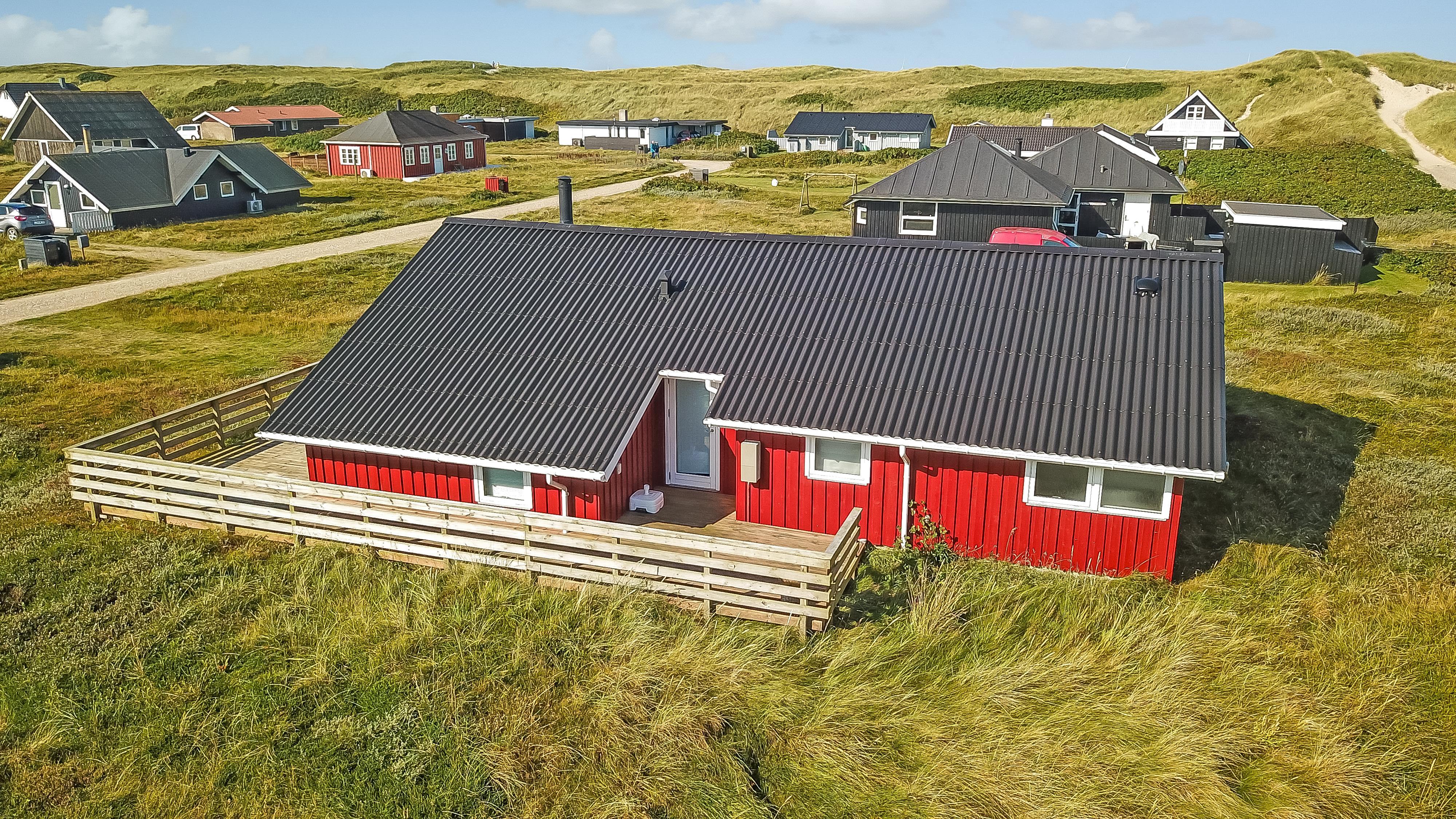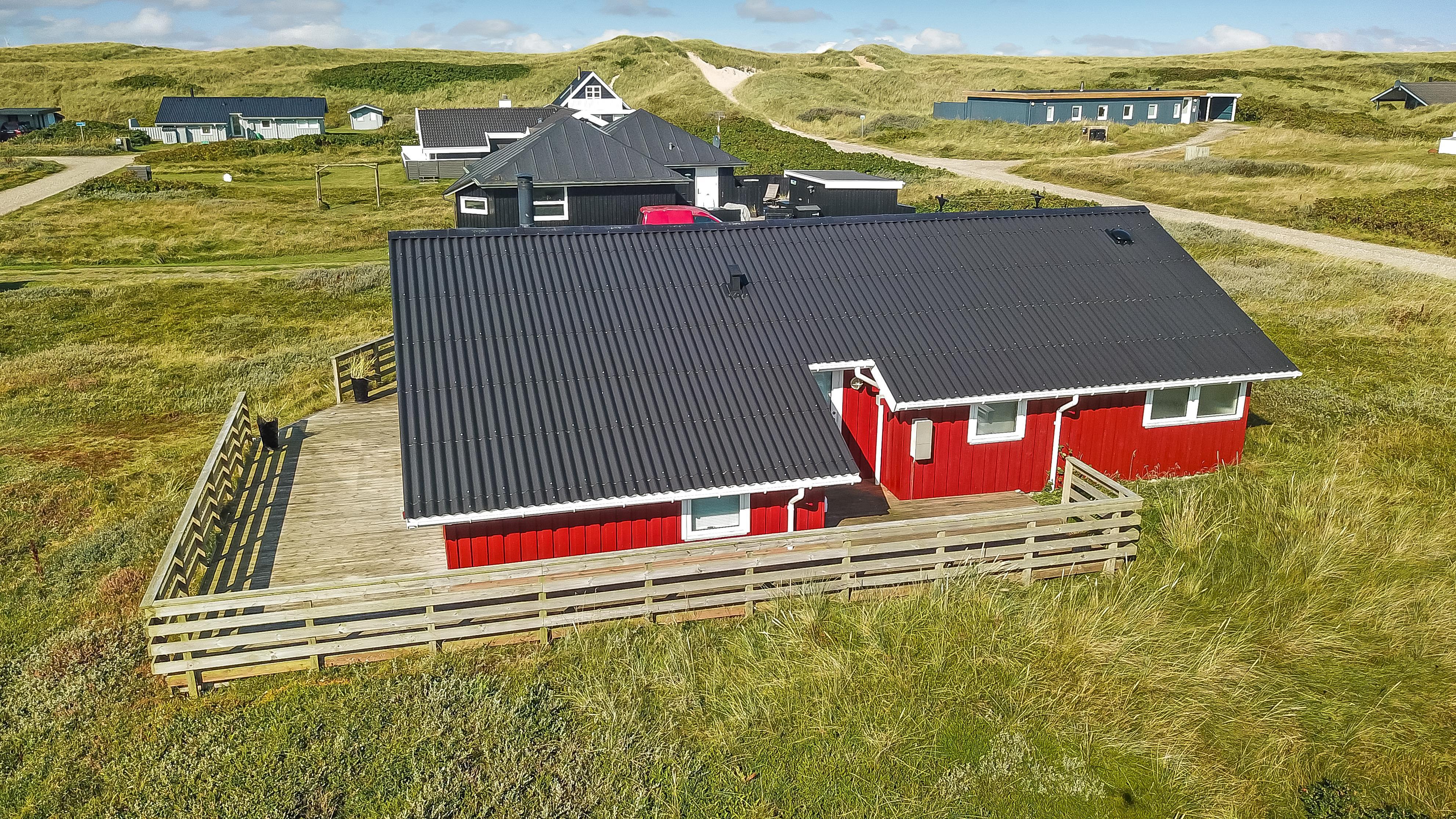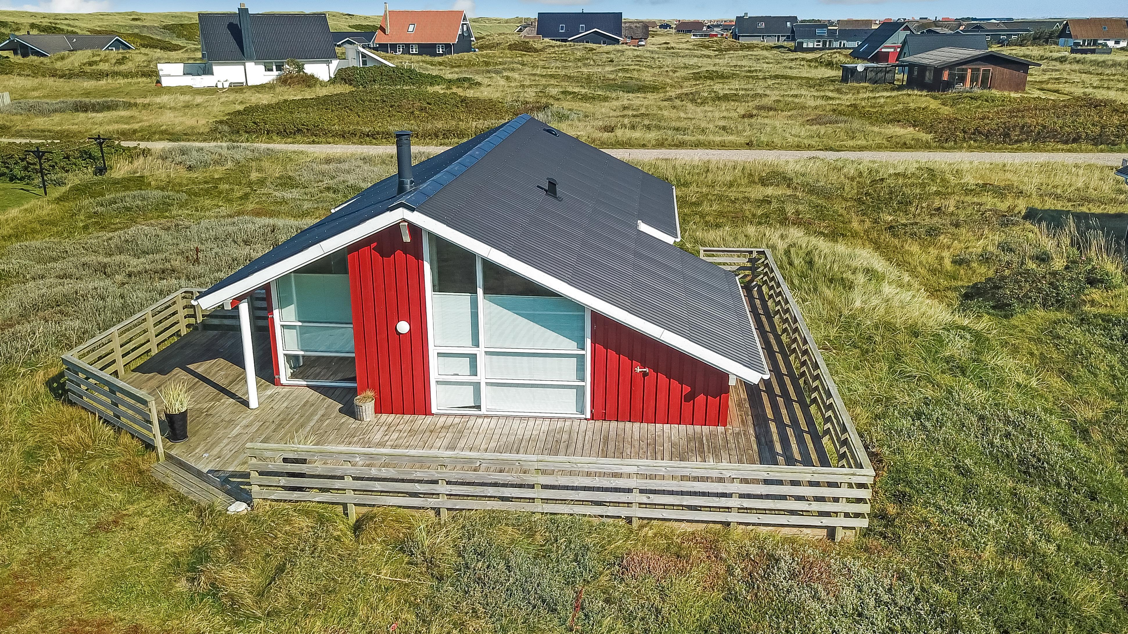 96 m2 stort feriehus, som er bygget i 1997 og siden løbende vedligeholdt så alt fremstår flot og funktionelt. Rummeligt og komfortabelt indrettet. Opholdsstuen er åben til kip. Opholdsstuen er opdelt i spisestue, som er kombineret med det åbne køkkenhjørne. Opholdsstuen med, flotte polstermøbler, spisebord, TV med danske og tyske programmer via fibernet. Nyd udsigten til de høje klitter ved Vesterhavet, over området og slap af foran den knitrende brændeovn som sammen med varmepumpen hjælper med at reducere udgiften til varmeregningen. Flot mørkt trægulv i opholdsrum, køkkenhjørne. 2 gode soverum (1DS, 1DS, 2 KS som også kan bruges som enkeltsenge) – huset må dog max bebos af 6 personer. Der er også trægulve i soverummene. Køkkenhjørne med alt i service / køkkengrej samt elektrisk komfur med kogeplader, emhætte, opvaskemaskine, køleskab med fryseboks og mikroovn. Dejligt badeværelse toilet, håndvask, bruser, vaskemaskine, spabad og direkte adgang til saunaen. Ekstra badeværelse med toilet, håndvask, bruser. Der er klinkegulv med gulvvarme på begge badeværelser. Ikke ryger hus. Husdyr er ikke tilladt.