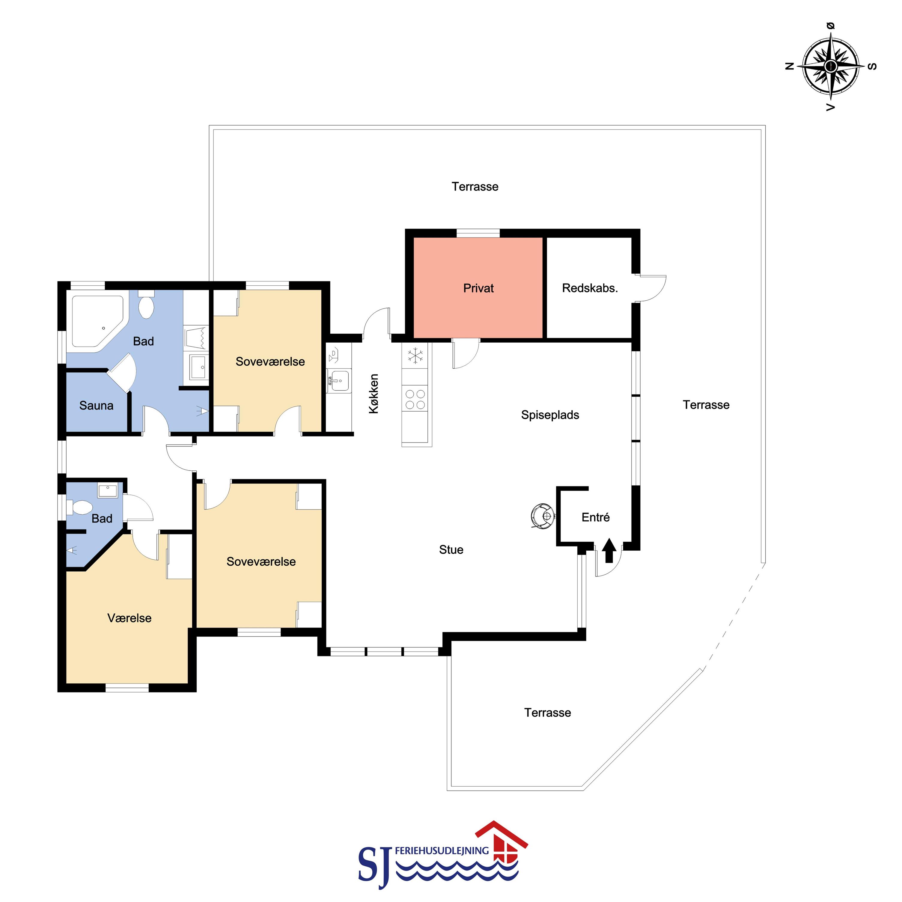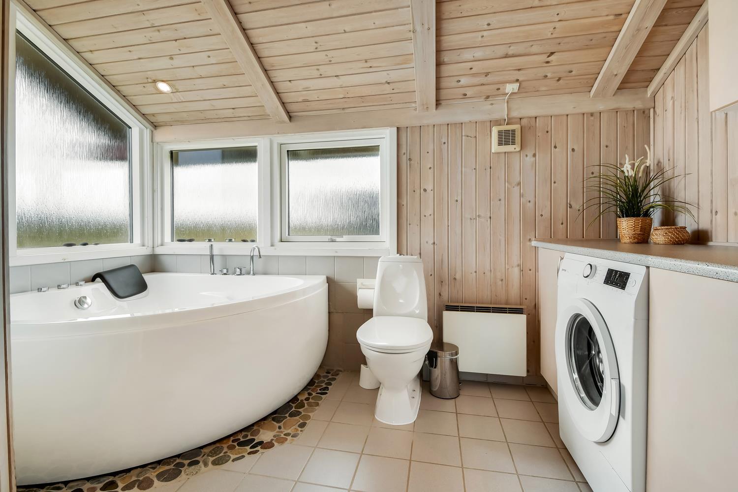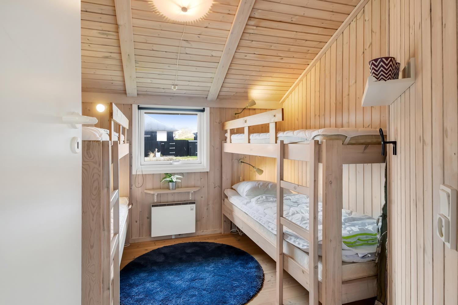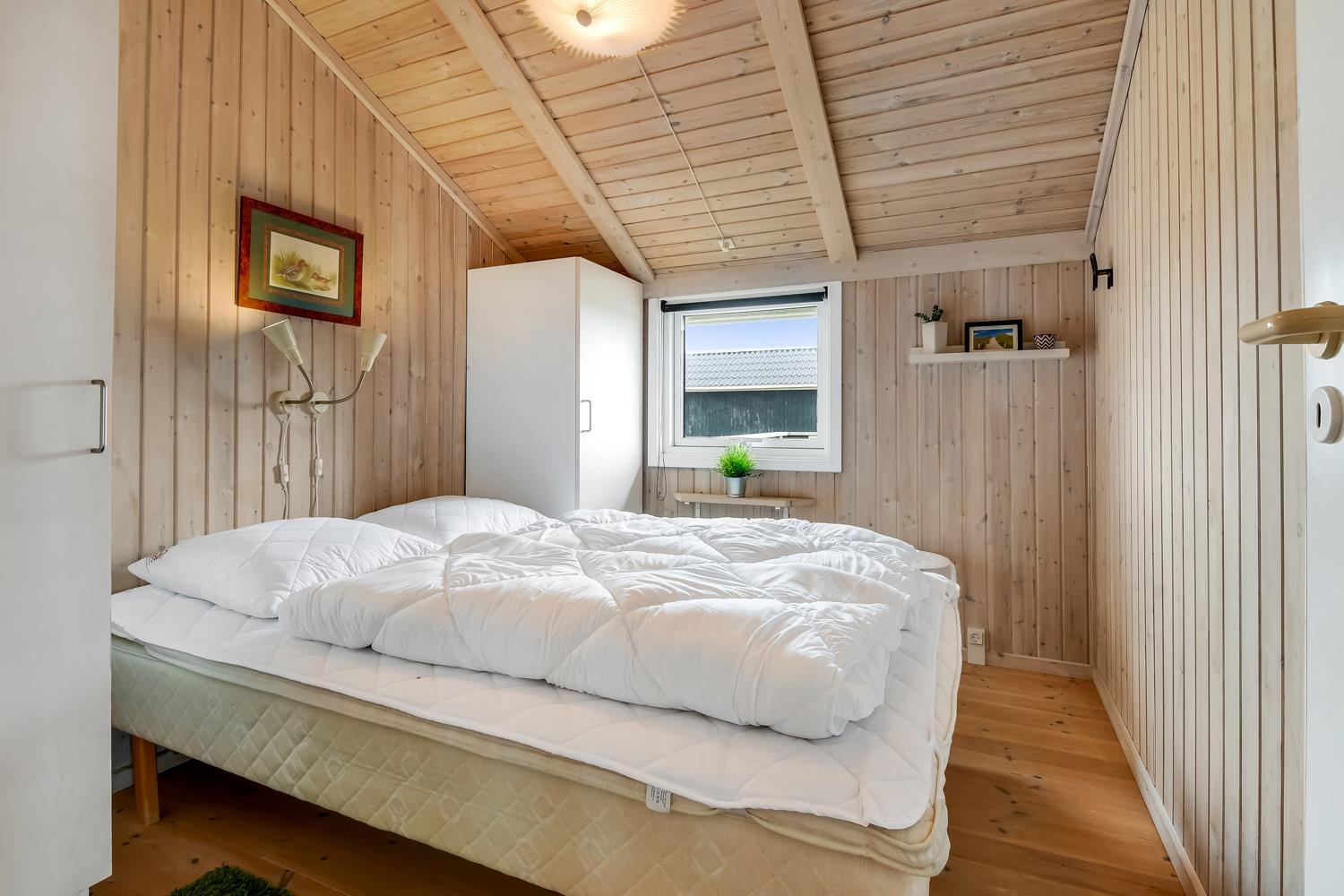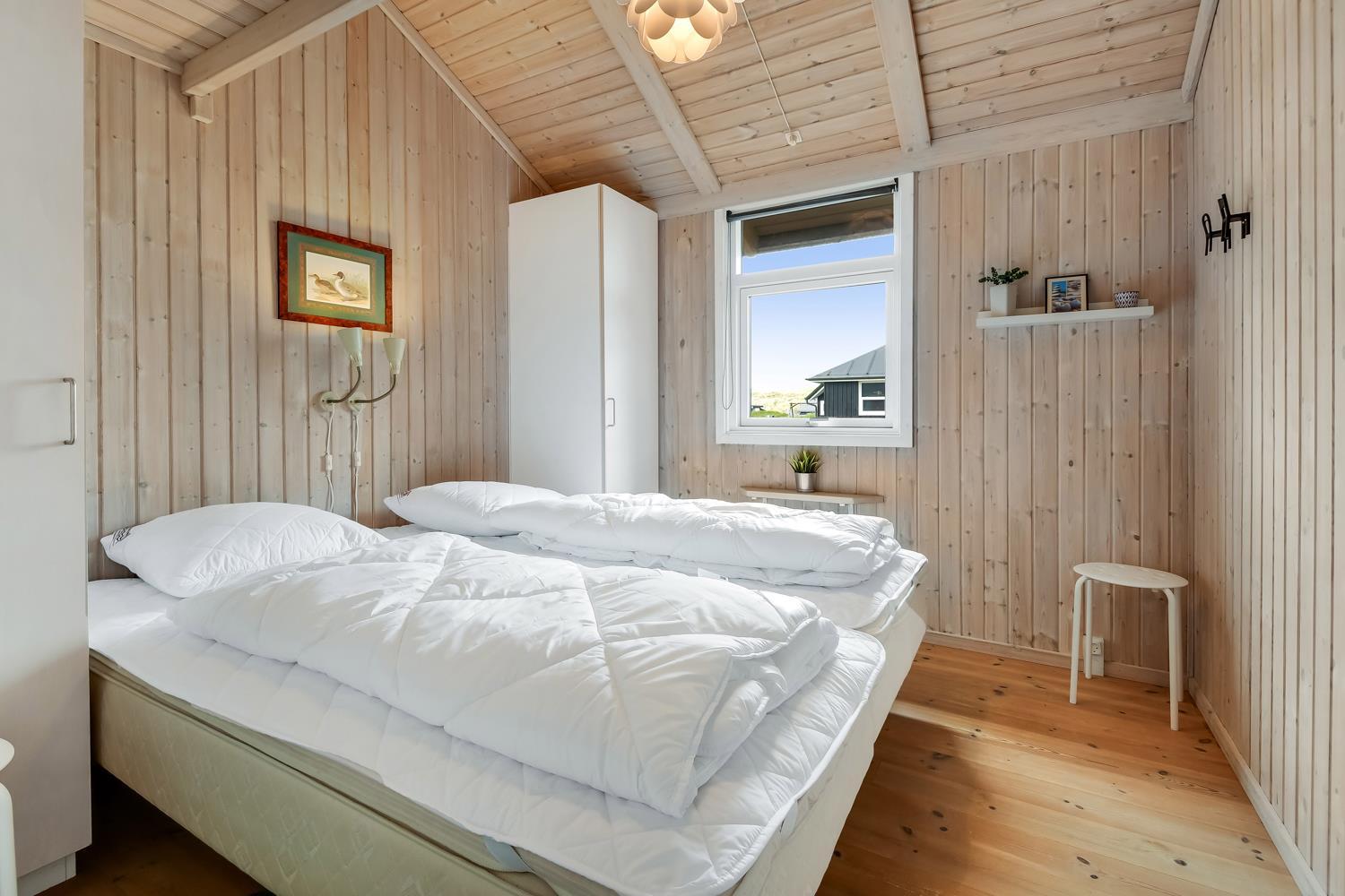 96 m2 stort feriehus, som er bygget i 1997 og siden løbende vedligeholdt så alt fremstår flot og funktionelt. Rummeligt og komfortabelt indrettet. Opholdsstuen er åben til kip. Opholdsstuen er opdelt i spisestue, som er kombineret med det åbne køkkenhjørne. Opholdsstuen med, flotte polstermøbler, spisebord, TV med danske og tyske programmer via fibernet. Nyd udsigten til de høje klitter ved Vesterhavet, over området og slap af foran den knitrende brændeovn som sammen med varmepumpen hjælper med at reducere udgiften til varmeregningen. Flot mørkt trægulv i opholdsrum, køkkenhjørne. 2 gode soverum (1DS, 1DS, 2 KS som også kan bruges som enkeltsenge) – huset må dog max bebos af 6 personer. Der er også trægulve i soverummene. Køkkenhjørne med alt i service / køkkengrej samt elektrisk komfur med kogeplader, emhætte, opvaskemaskine, køleskab med fryseboks og mikroovn. Dejligt badeværelse toilet, håndvask, bruser, vaskemaskine, spabad og direkte adgang til saunaen. Ekstra badeværelse med toilet, håndvask, bruser. Der er klinkegulv med gulvvarme på begge badeværelser. Ikke ryger hus. Husdyr er ikke tilladt.