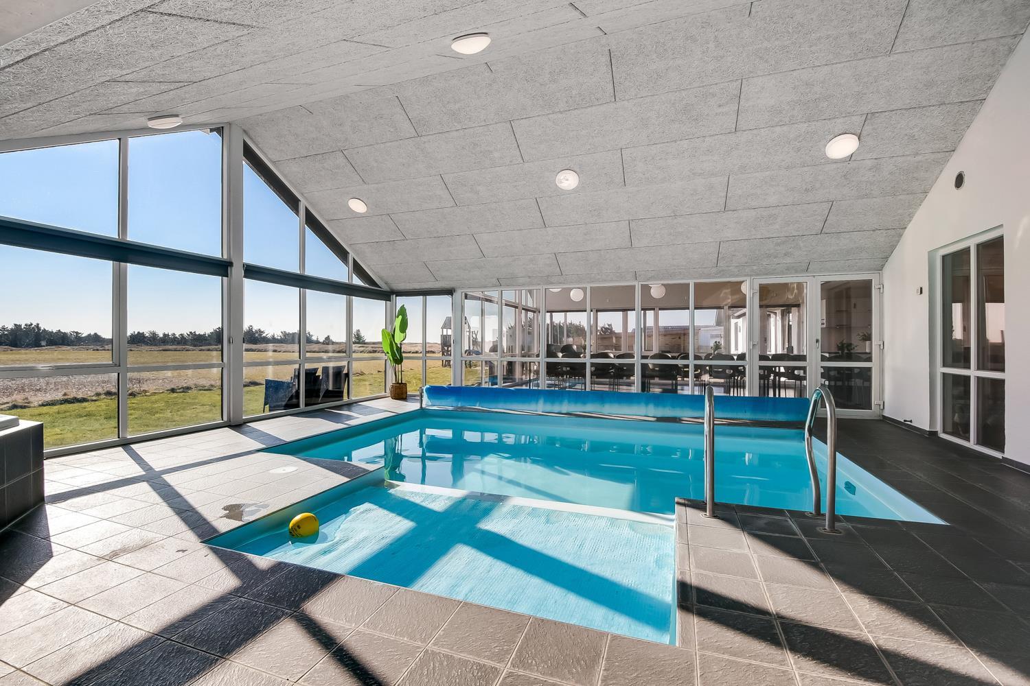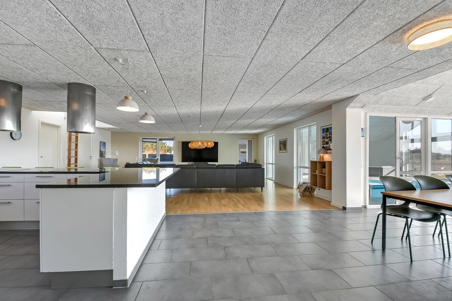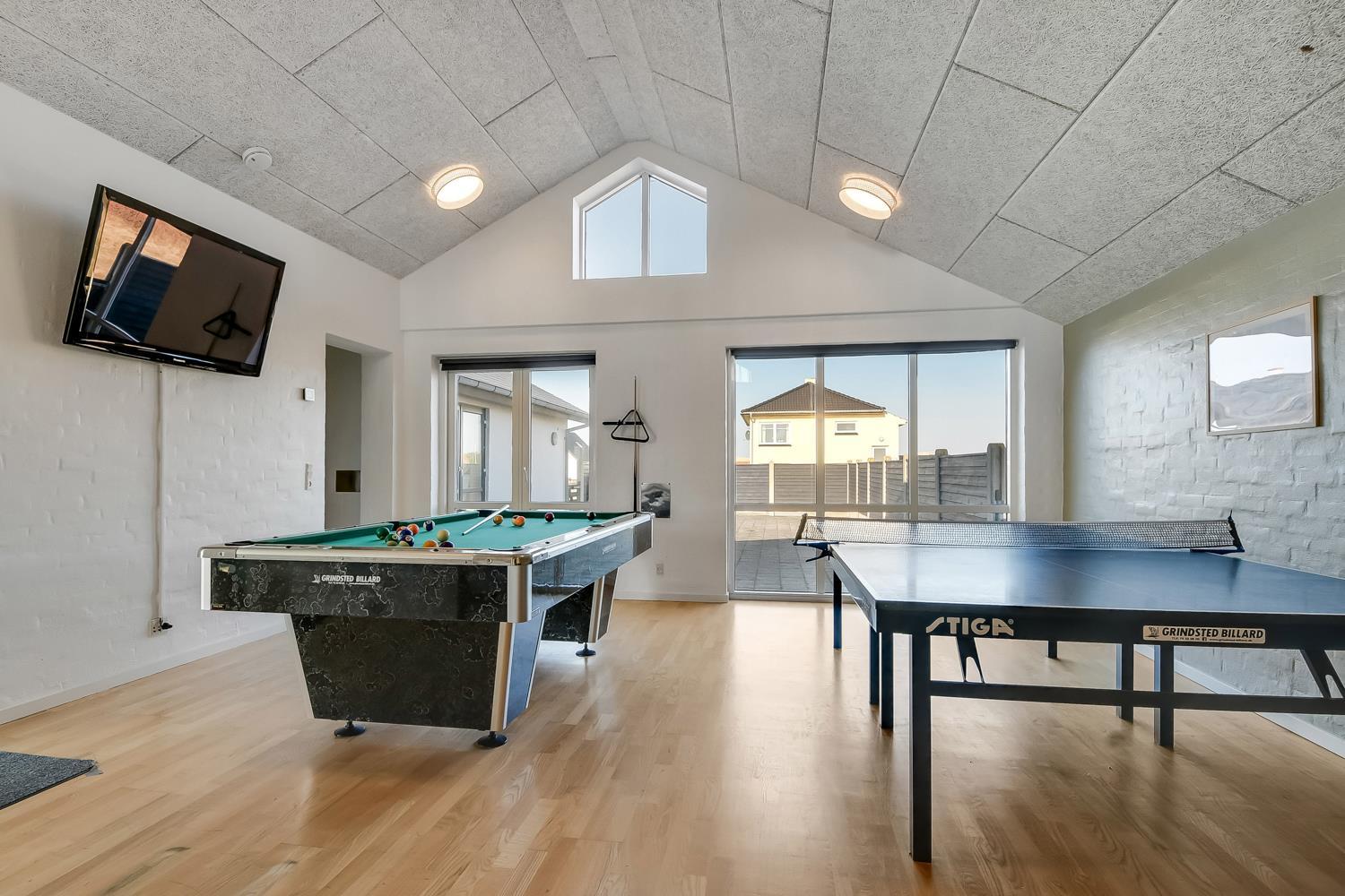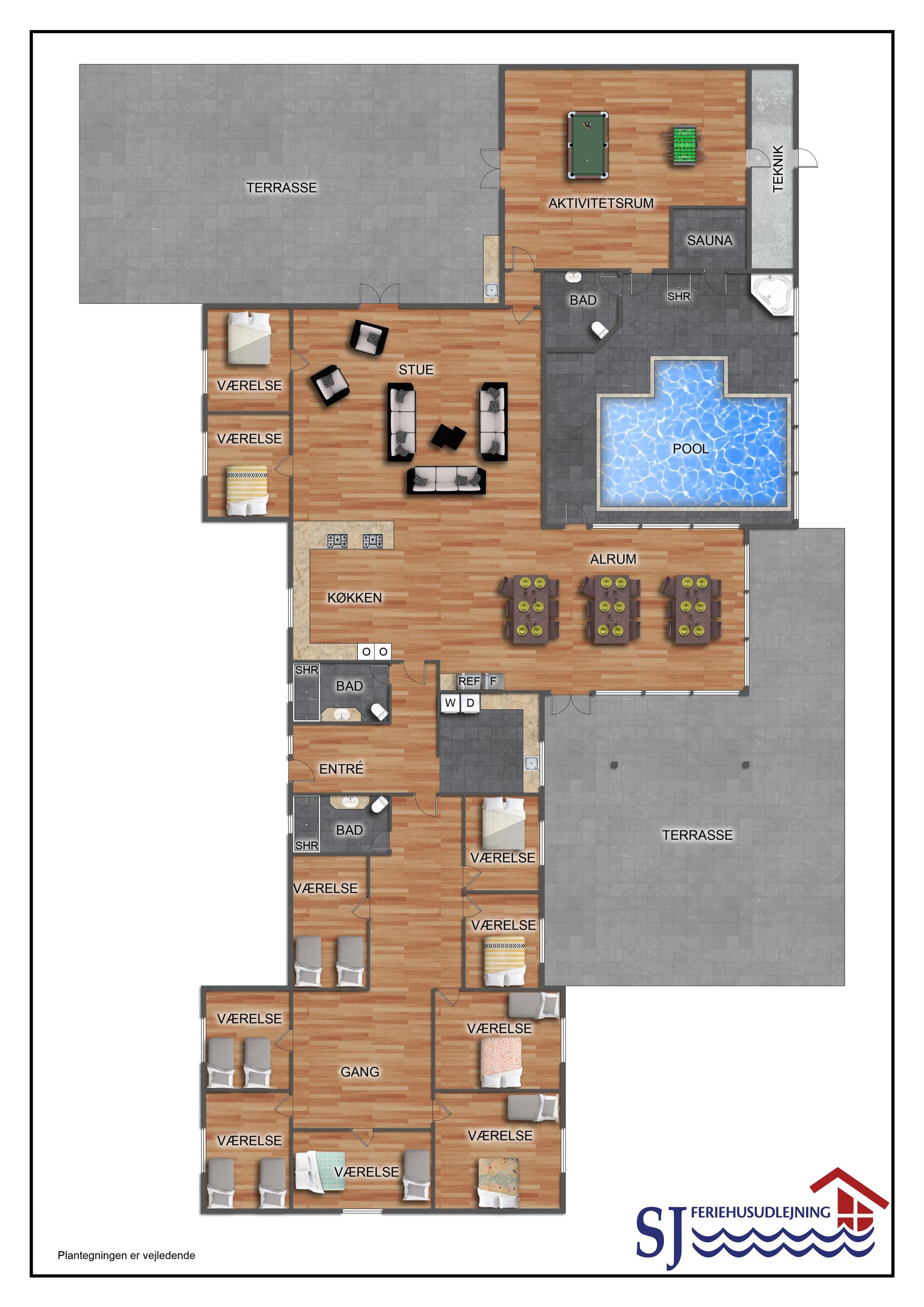 10 soverum: (DS + 1E) + (DS + 1E) + (DS + 1E) + (DS) + (DS) + (DS) + (DS) + (DS) + (DS) + (DS) og dertil kommer 4 store hemse alle med 3 sovepladser. Det 425 m2 store luksushus er indrettet med alle tænkelige, moderne faciliteter og er særdeles veludstyret for såvel en som flere familier der ønsker at tilbringe en afslappende ferie i et wellness-luksushus sammen. Rummelig, lys og venlig opholdsstue med store vinduespartier, fladskærm, parabol med danske, tyske, norske og svenske programmer. Radio. Meget veludstyret og velindrettet køkken med stor spiseplads, 2 håndvaske, 2 opvaskemaskiner, 2 komfure med ovne, mikroovn samt 3 køleskabe med fryser. Huset er indrettet med et stort aktivitetsrum med billard, bordtennisbord, bordfodbold, fladskærm, parabol og Playstation. Flot pool-wellnesrum hvor familien rigtig kan slappe af og more sig i den 24m2 store pool med ekstra, lille børnepool samt svømmetræner, i det indbydende spabad til 6 personer eller under koldtvandskarret. Fra poolrummet er der adgang til husets sauna samt til et badeværelse med bruser. Derudover er der endnu 2 badeværelser, begge med toilet, håndvask og bruser og et dejligt, rummeligt bryggers med vaskemaskine og tørretumbler. Indgangsdørenes bredde til badeværelserne er hhv. 60 cm, 60 cm og 80 cm. Huset er dels med gulvopvarmede klinker og dels med trægulve. Til de små er der 2 højstole og 2 babysenge. Huset lejes ikke ud til ungdomsgrupper. Adgang til Harboøre Centeret . Huset er lavet som et energi rigtigt hus der opvarmes med jordvarme. Depositum vintersæson kr. 8000 og sommersæson kr. 5000