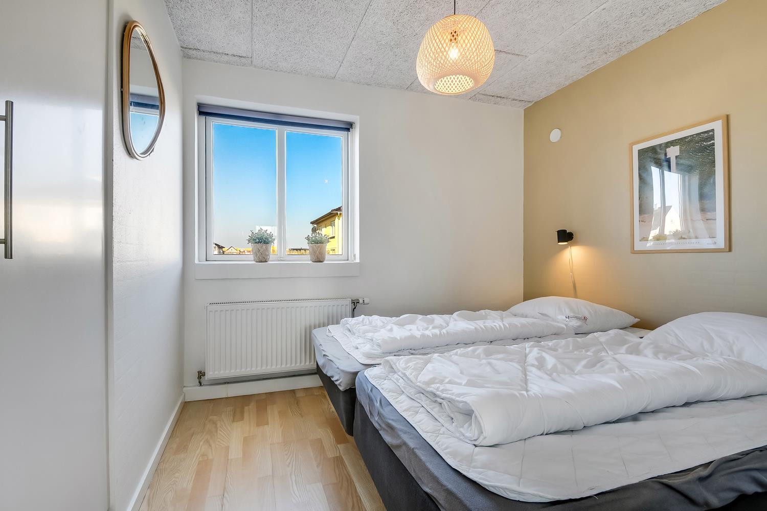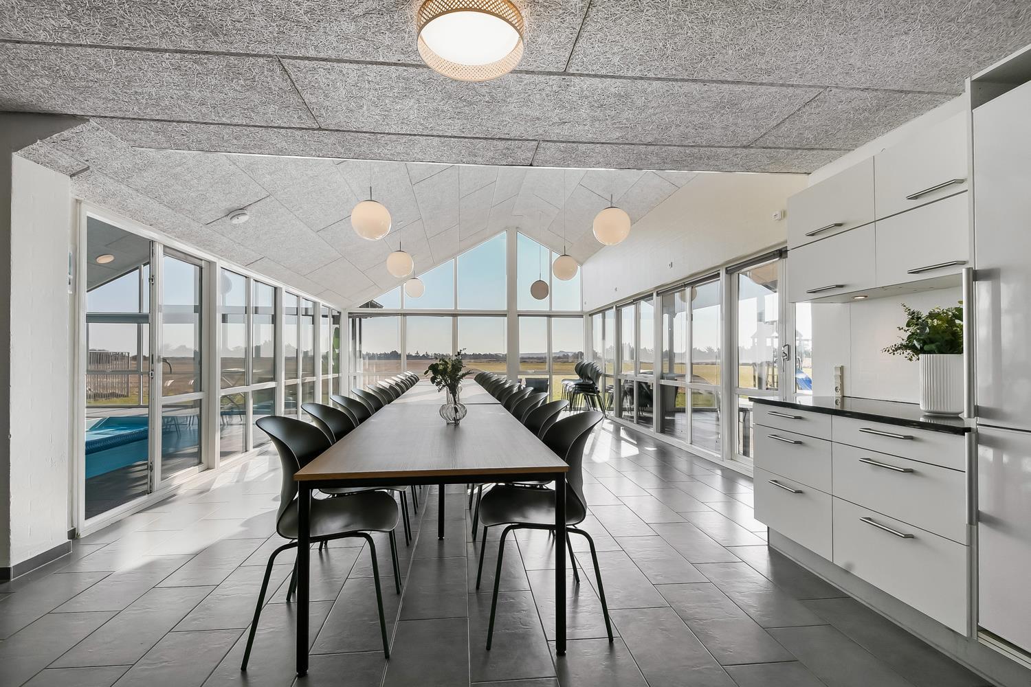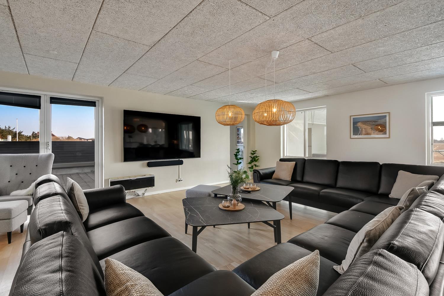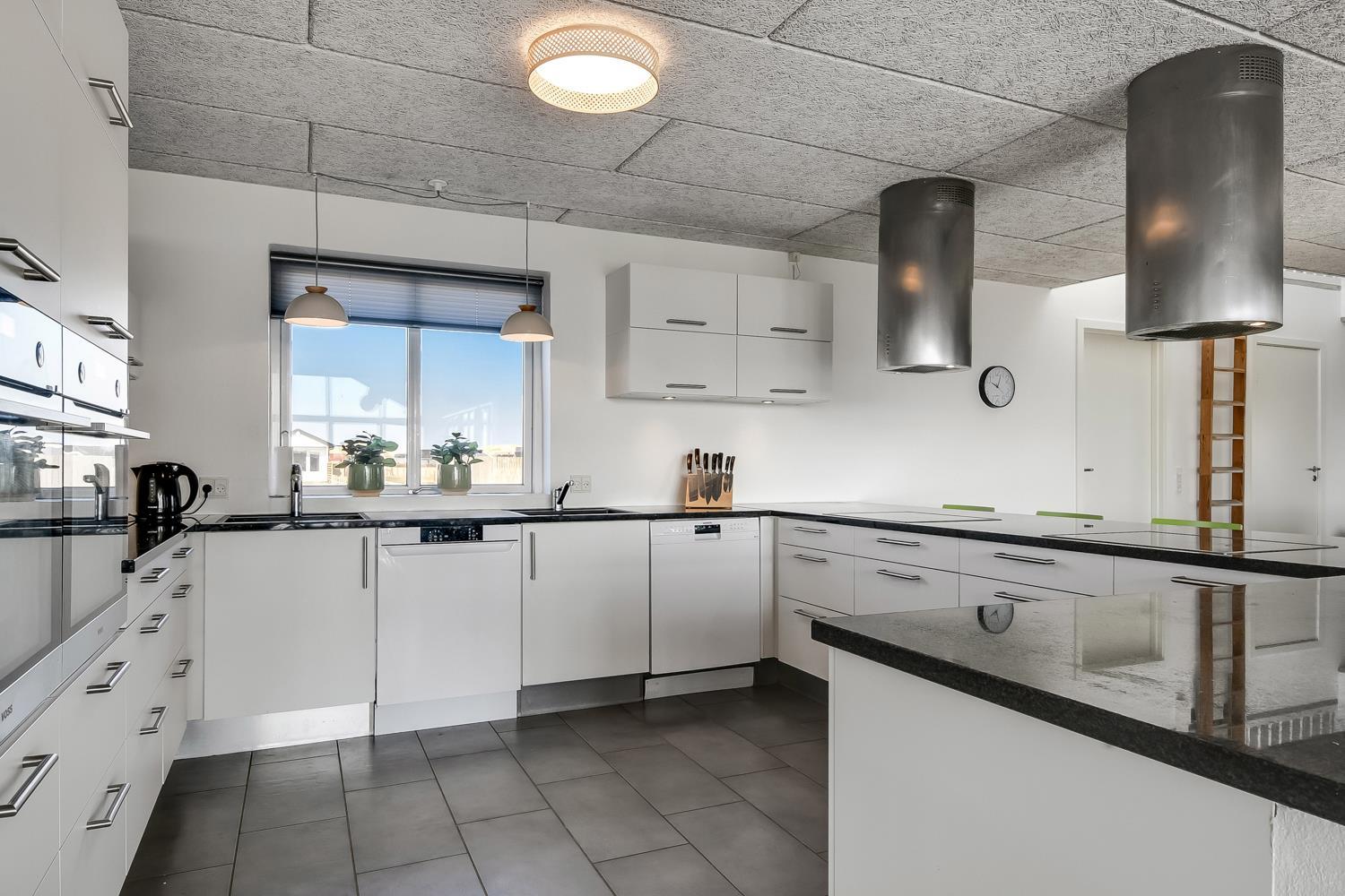 10 soverum: (DS + 1E) + (DS + 1E) + (DS + 1E) + (DS) + (DS) + (DS) + (DS) + (DS) + (DS) + (DS) og dertil kommer 4 store hemse alle med 3 sovepladser. Det 425 m2 store luksushus er indrettet med alle tænkelige, moderne faciliteter og er særdeles veludstyret for såvel en som flere familier der ønsker at tilbringe en afslappende ferie i et wellness-luksushus sammen. Rummelig, lys og venlig opholdsstue med store vinduespartier, fladskærm, parabol med danske, tyske, norske og svenske programmer. Radio. Meget veludstyret og velindrettet køkken med stor spiseplads, 2 håndvaske, 2 opvaskemaskiner, 2 komfure med ovne, mikroovn samt 3 køleskabe med fryser. Huset er indrettet med et stort aktivitetsrum med billard, bordtennisbord, bordfodbold, fladskærm, parabol og Playstation. Flot pool-wellnesrum hvor familien rigtig kan slappe af og more sig i den 24m2 store pool med ekstra, lille børnepool samt svømmetræner, i det indbydende spabad til 6 personer eller under koldtvandskarret. Fra poolrummet er der adgang til husets sauna samt til et badeværelse med bruser. Derudover er der endnu 2 badeværelser, begge med toilet, håndvask og bruser og et dejligt, rummeligt bryggers med vaskemaskine og tørretumbler. Indgangsdørenes bredde til badeværelserne er hhv. 60 cm, 60 cm og 80 cm. Huset er dels med gulvopvarmede klinker og dels med trægulve. Til de små er der 2 højstole og 2 babysenge. Huset lejes ikke ud til ungdomsgrupper. Adgang til Harboøre Centeret . Huset er lavet som et energi rigtigt hus der opvarmes med jordvarme. Depositum vintersæson kr. 8000 og sommersæson kr. 5000