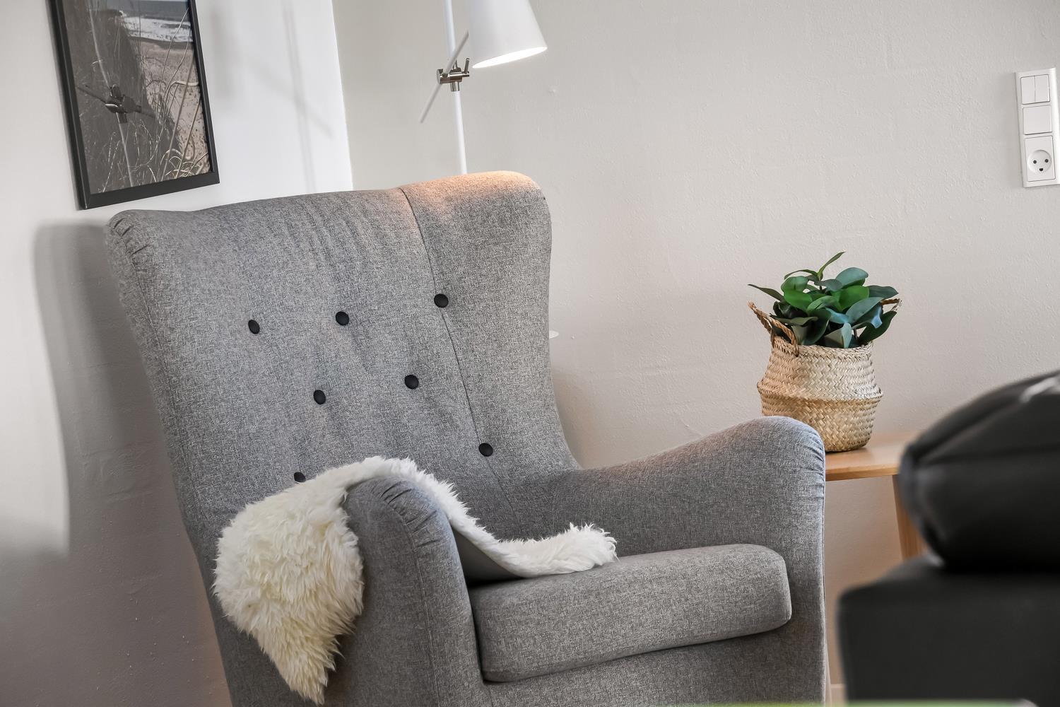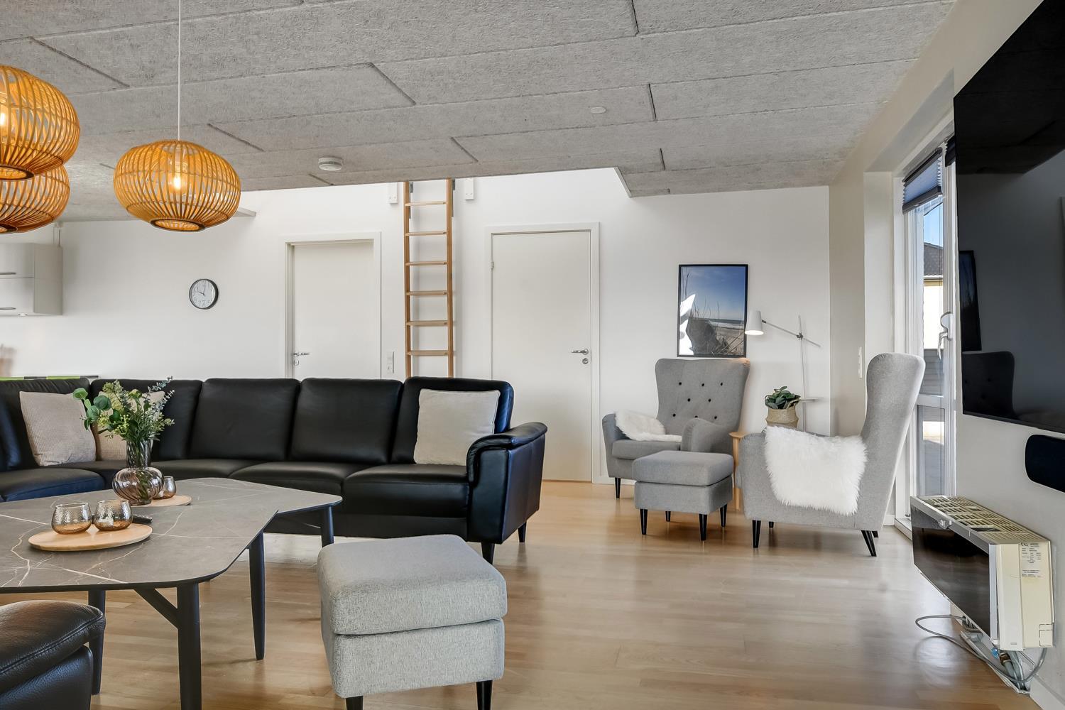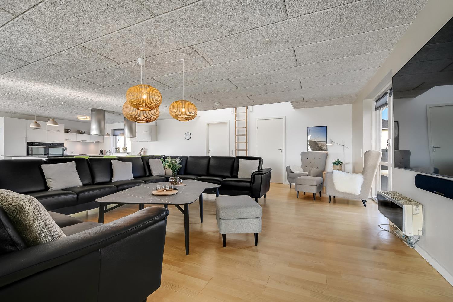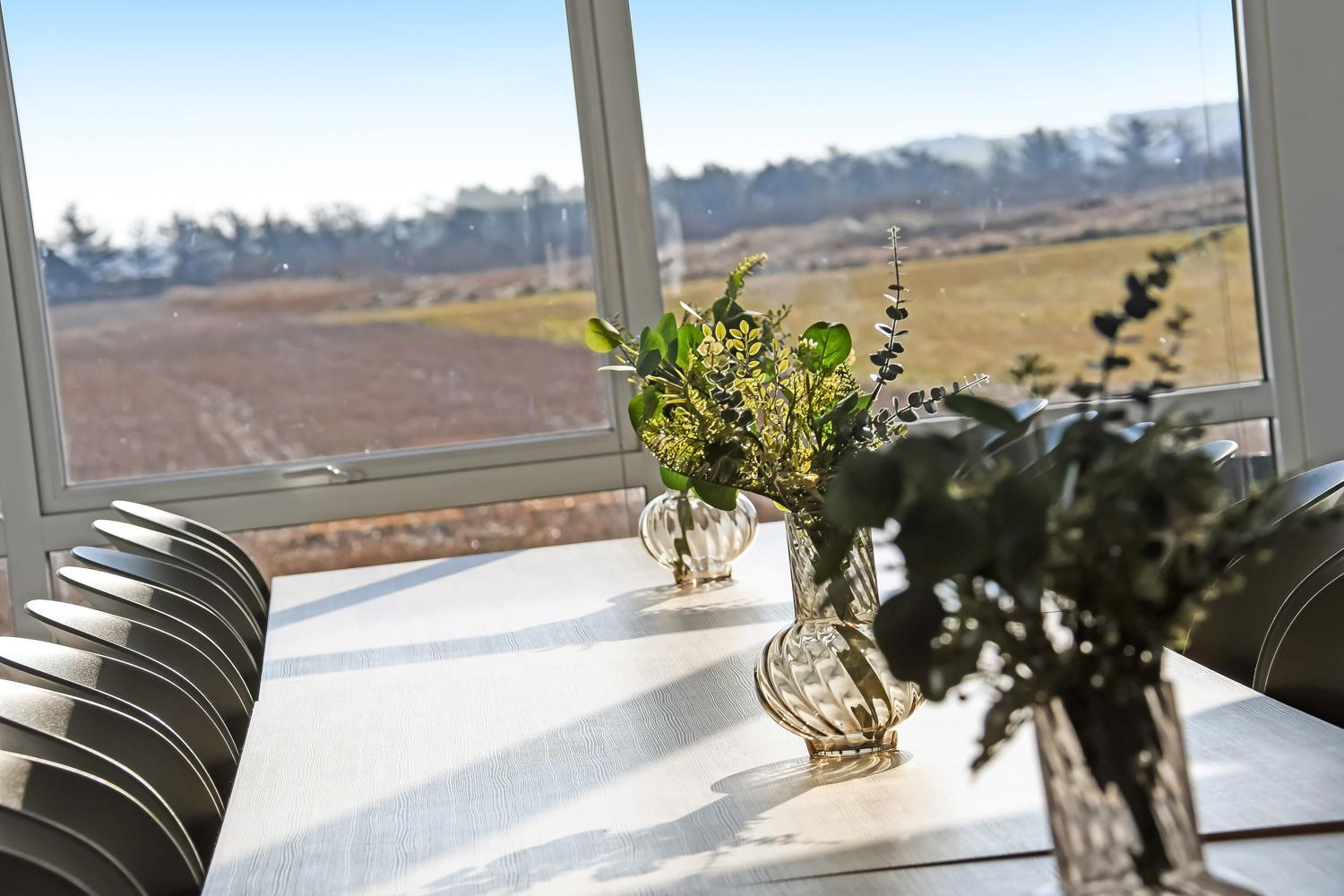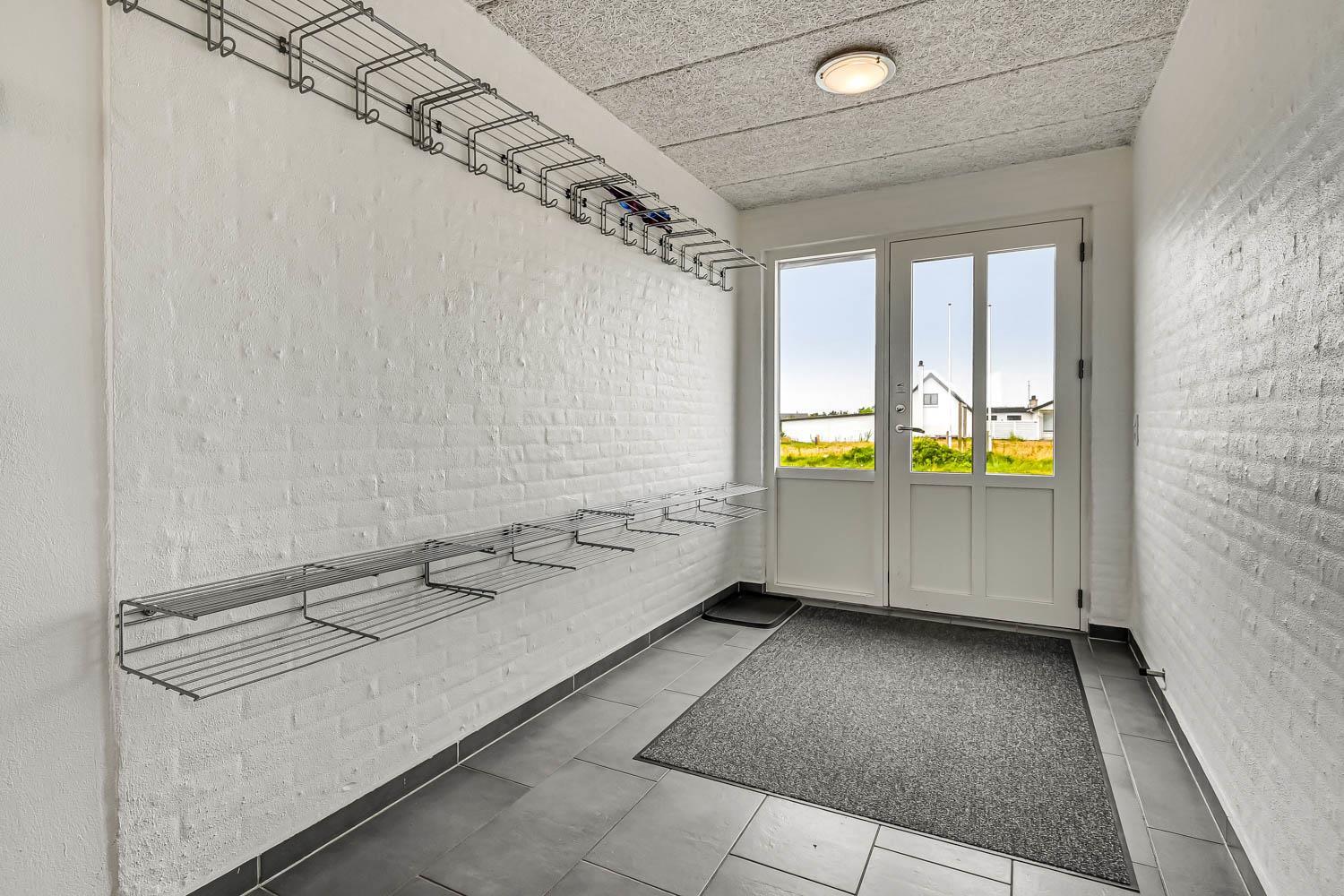 Huset er omgivet af flere terrasser, hvor man altid har mulighed for at finde læ på feriens solrige dage. Her finder man naturligvis havemøbler og liggestole og gasgrill. Til børnene er der desuden stor trampolin, sandkasse og gyngestativ. Dette storslåede feriehus er beliggende på en 1.700 m2 skøn naturgrund i Vrist kun 250 m fra stranden. Grunden er velbeliggende, centralt med kun 50 m til indkøb og samtidig ud til åbne markområder.