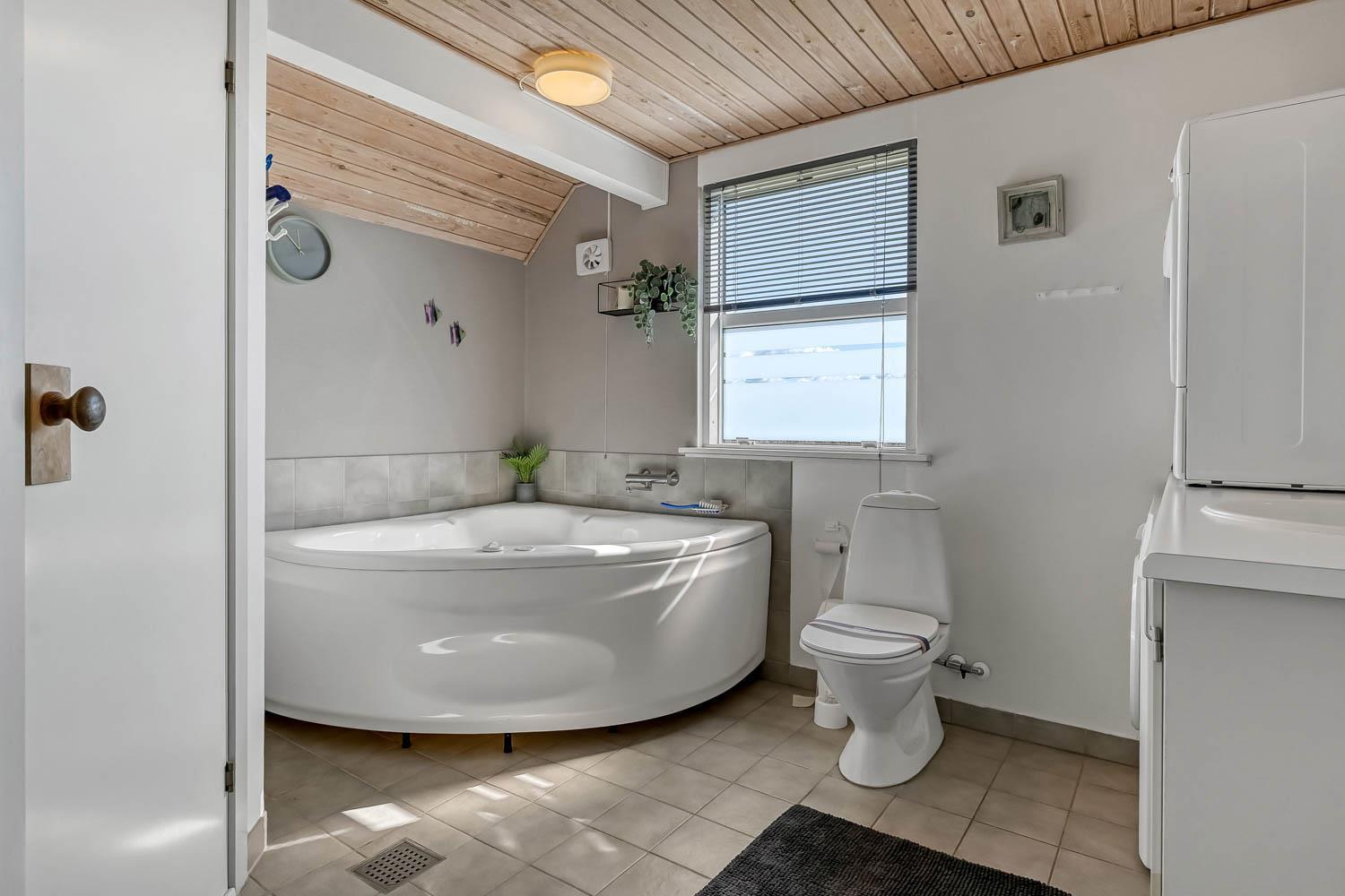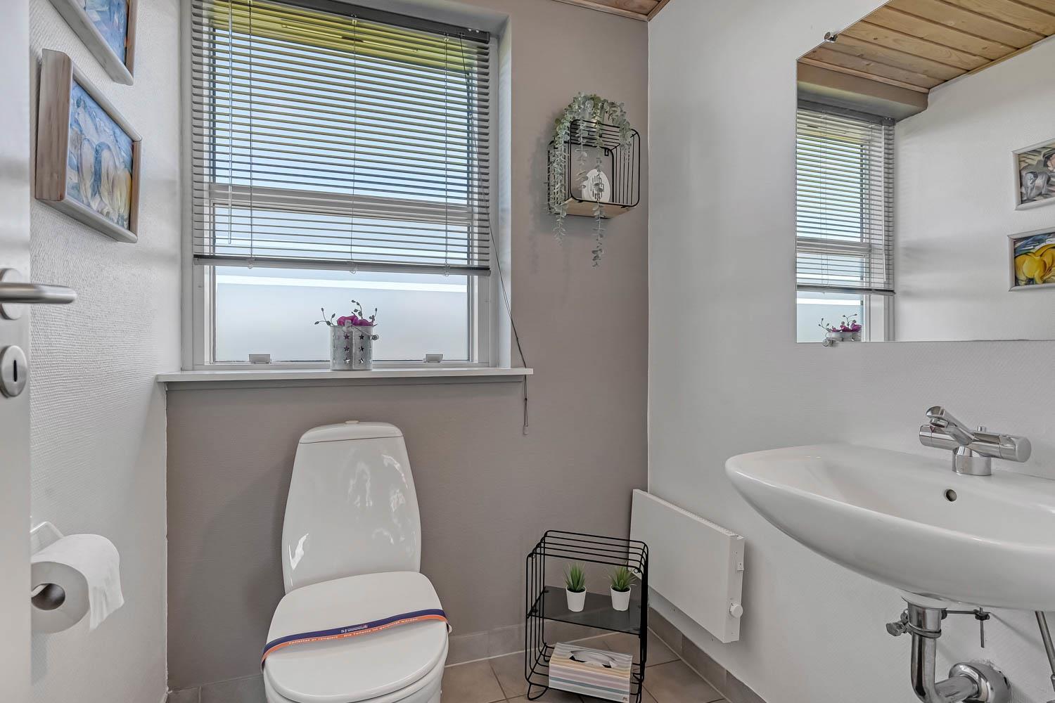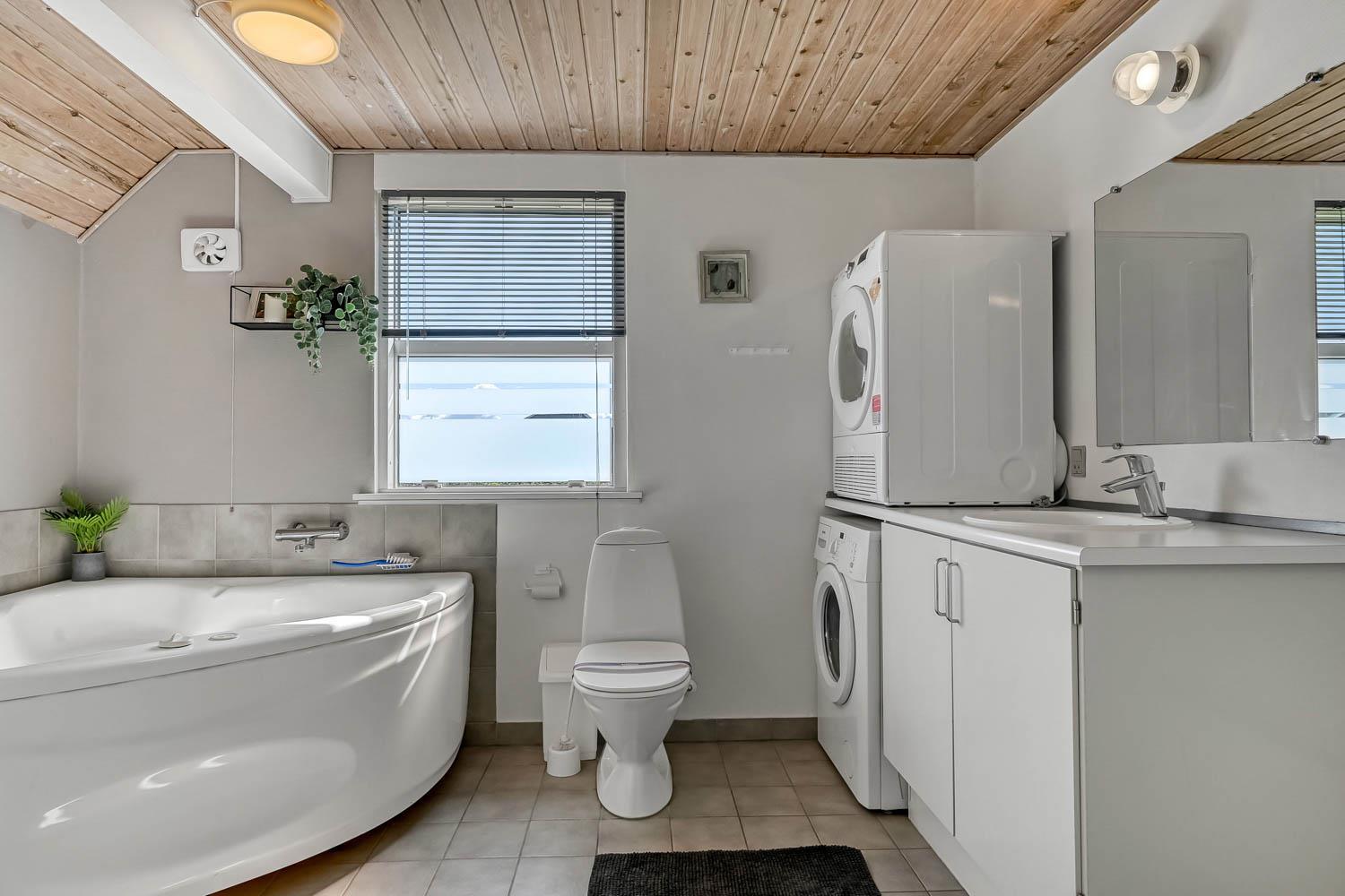 I stueetagen findes et stort badeværelse med 2-personers spa, bruseniche og gulvvarme. Her er også vaskemaskine og tørretumbler samt direkte adgang til saunaen. Derudover er der et gæstetoilet med håndvask. Køkkenet er veludstyret med opvaskemaskine, mikroovn og en 30 liters fryser. Opholdsstuen er kombineret med køkkenet og rummer både brændeovn, radio og fibernet-tv med danske og tyske kanaler samt Chromecast. Selvfølgelig er der også trådløst internet.