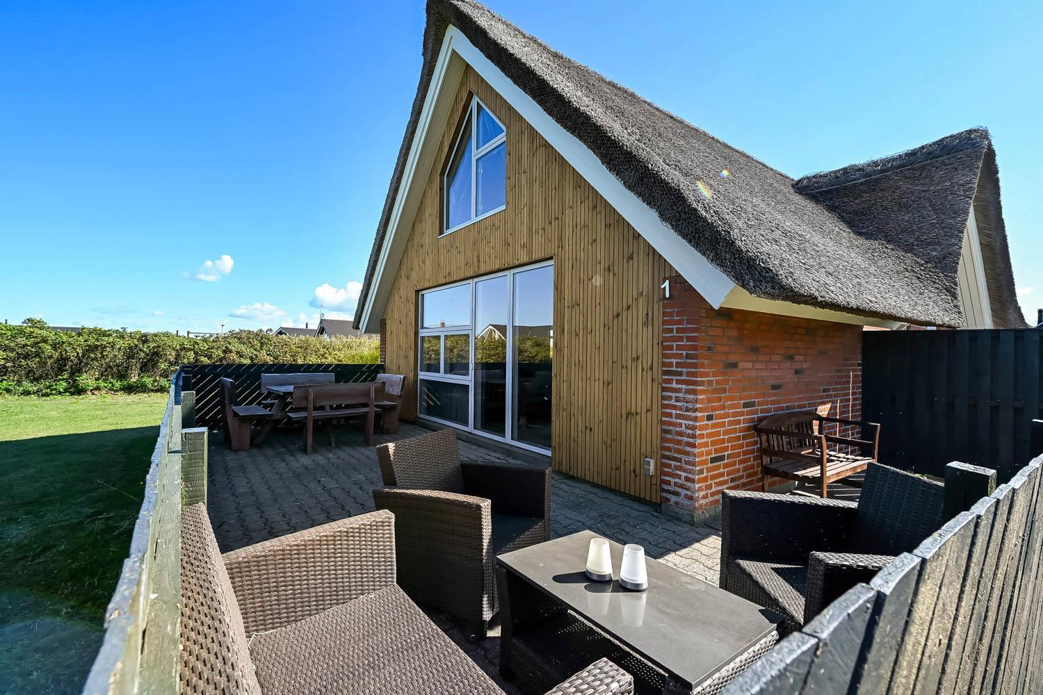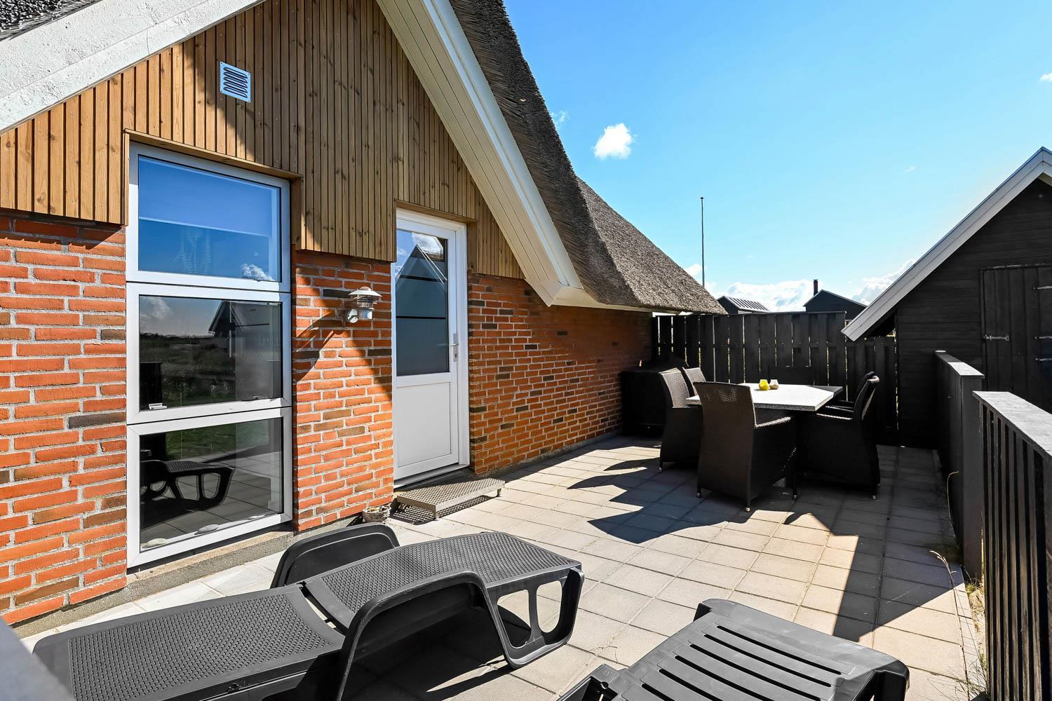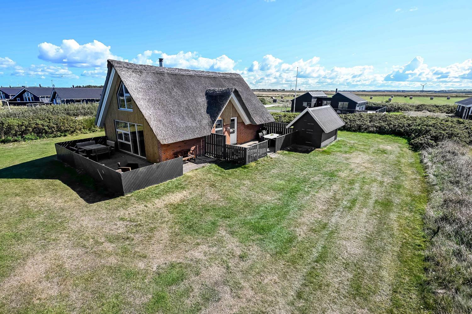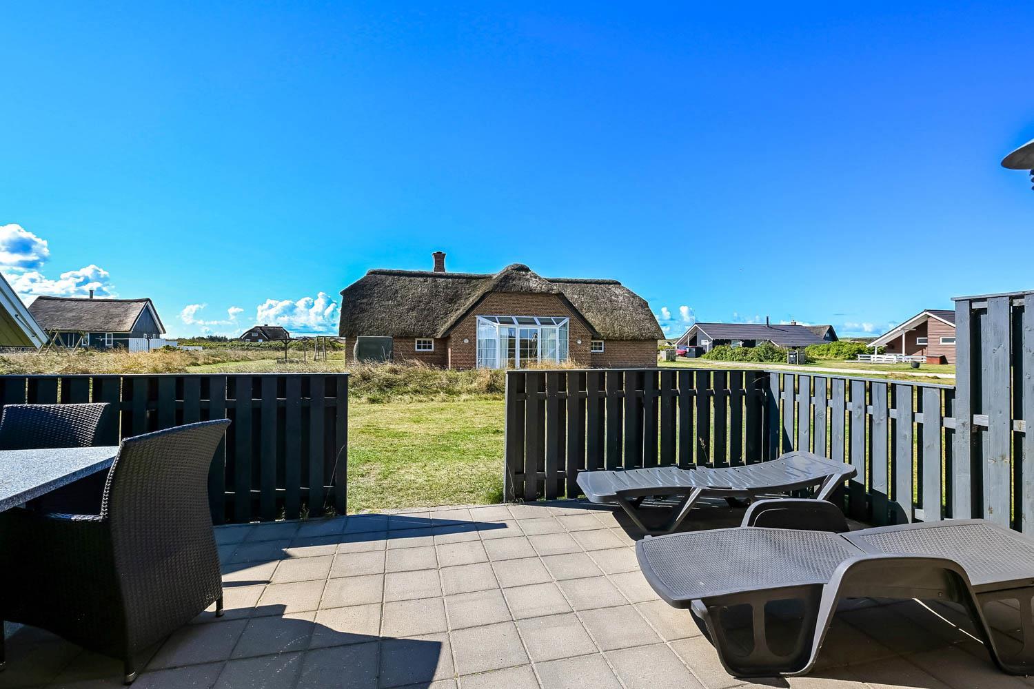 Huset ligger på en 1.200 m² stor naturgrund kun 300 meter fra Vesterhavet. Her er to dejlige, delvist lukkede terrasser med havemøbler, grill og solvogne, så der altid er mulighed for at finde et læsted eller en plads i solen.