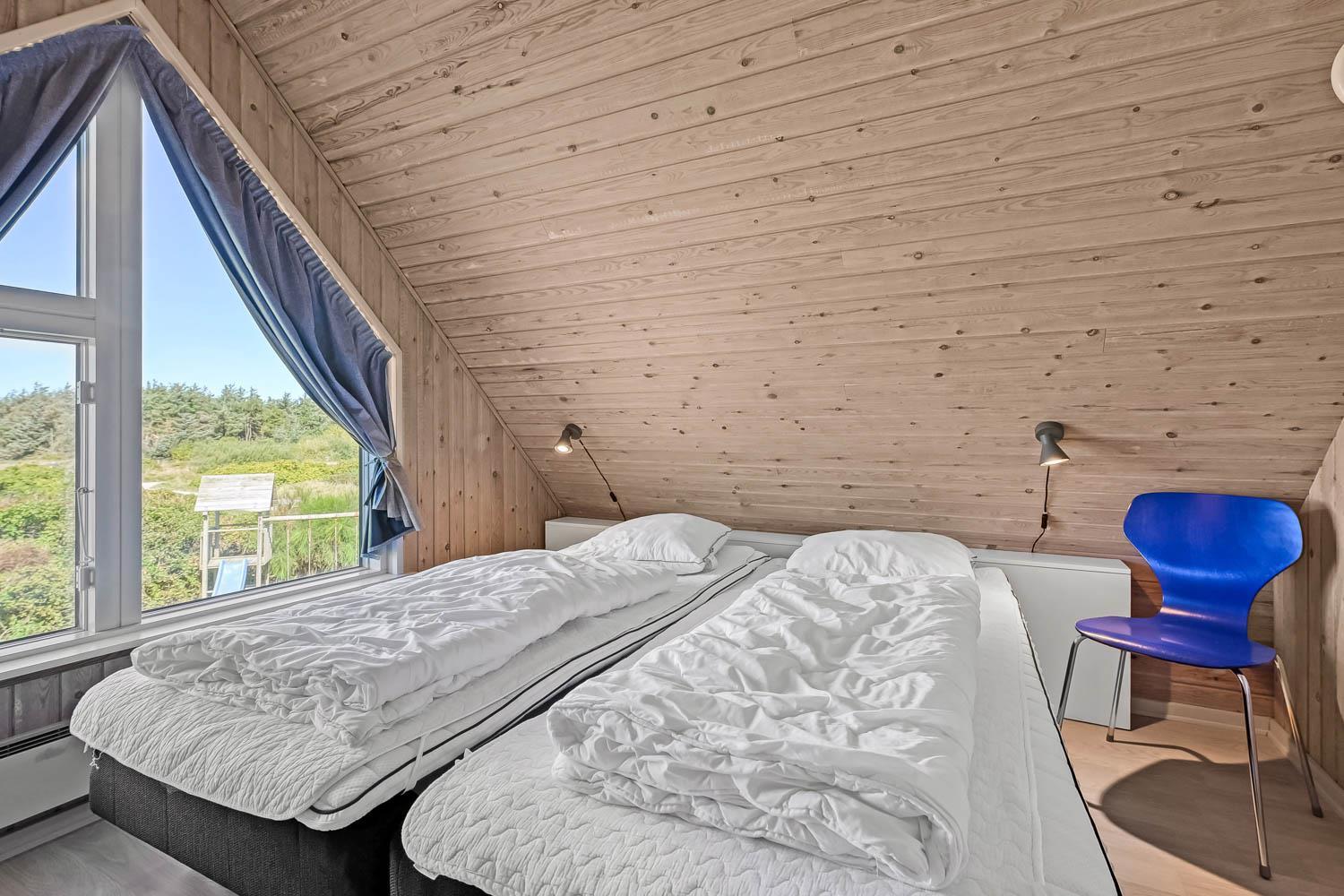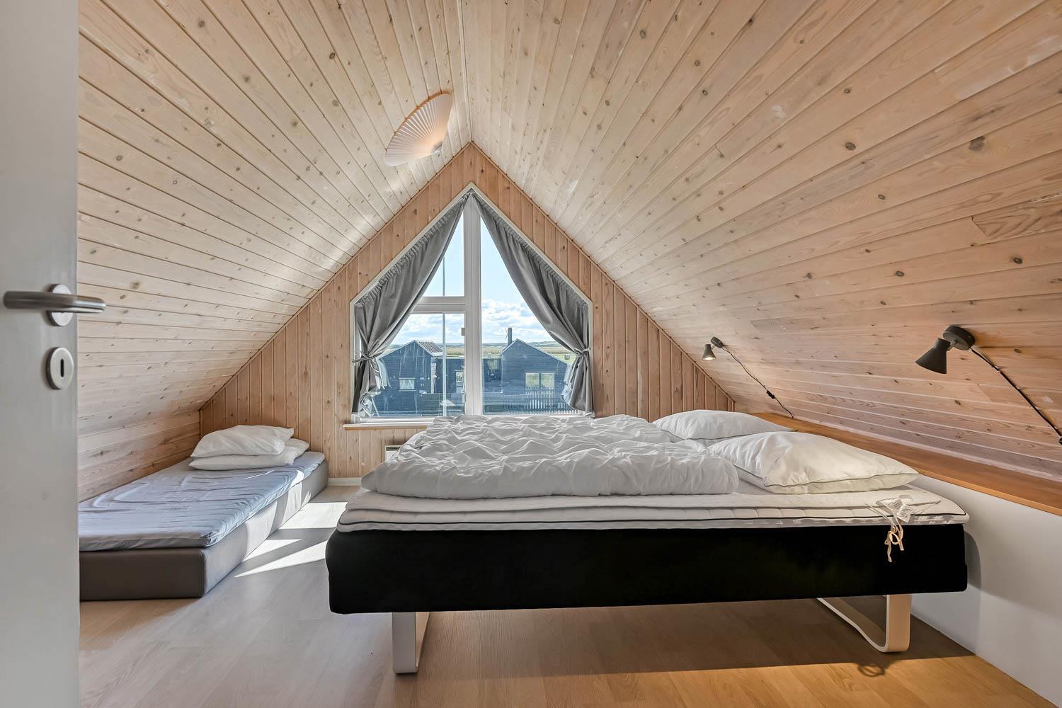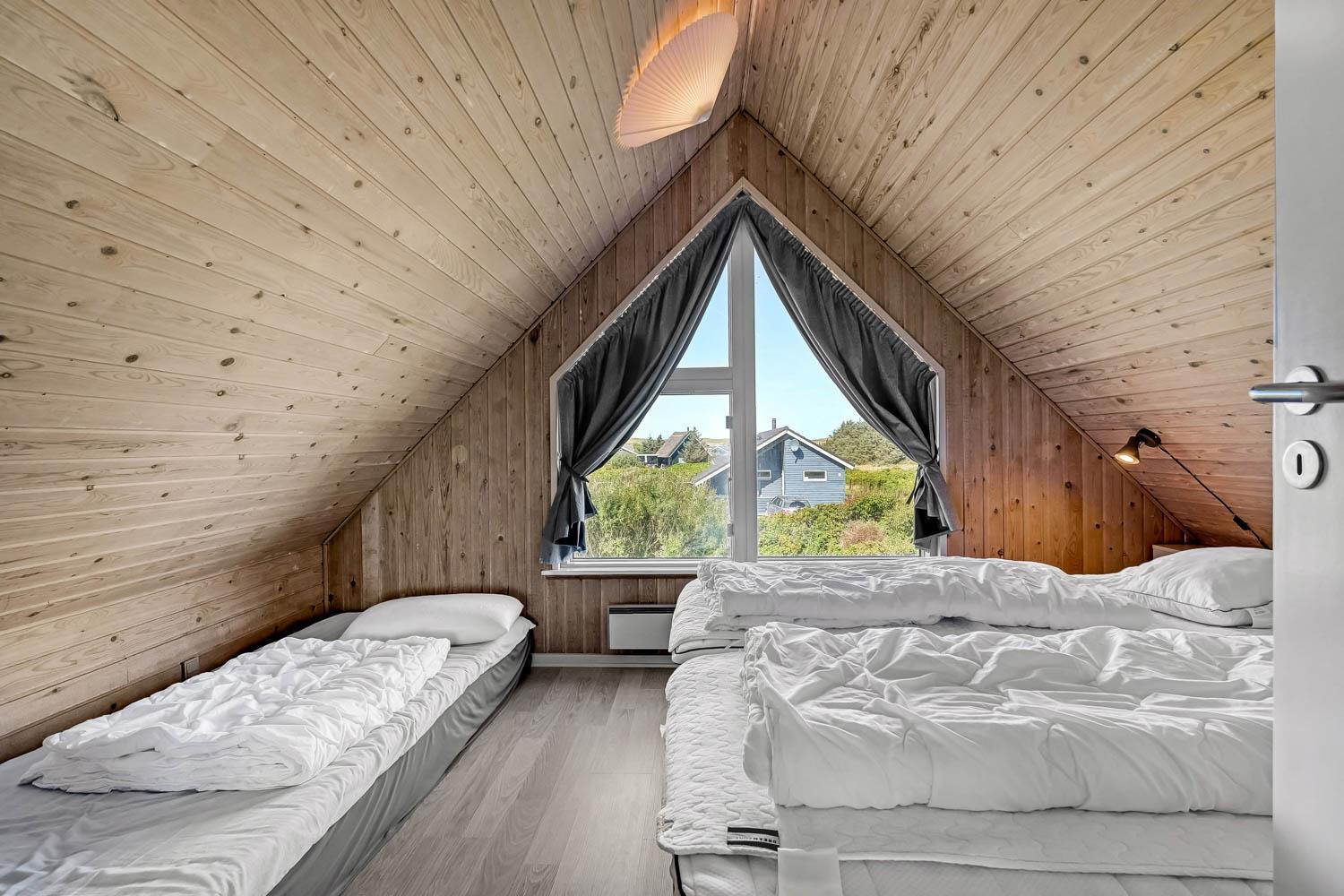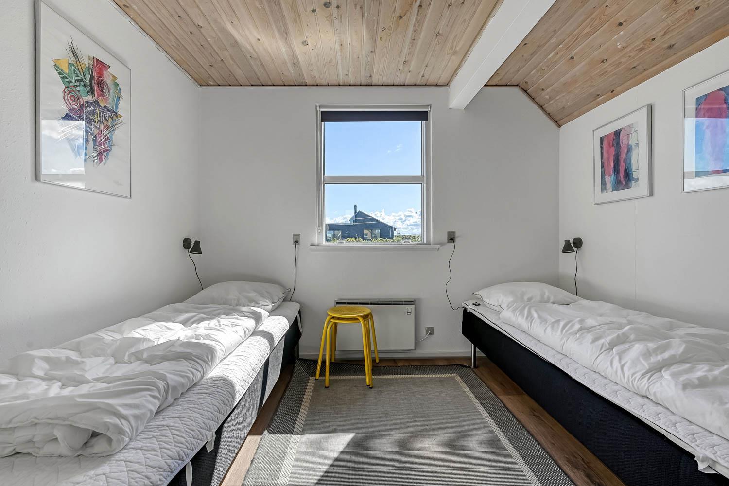 Huset har tre soverum: to værelser på første sal med hver to enkeltsenge, samt et værelse i stueetagen med to enkeltsenge.