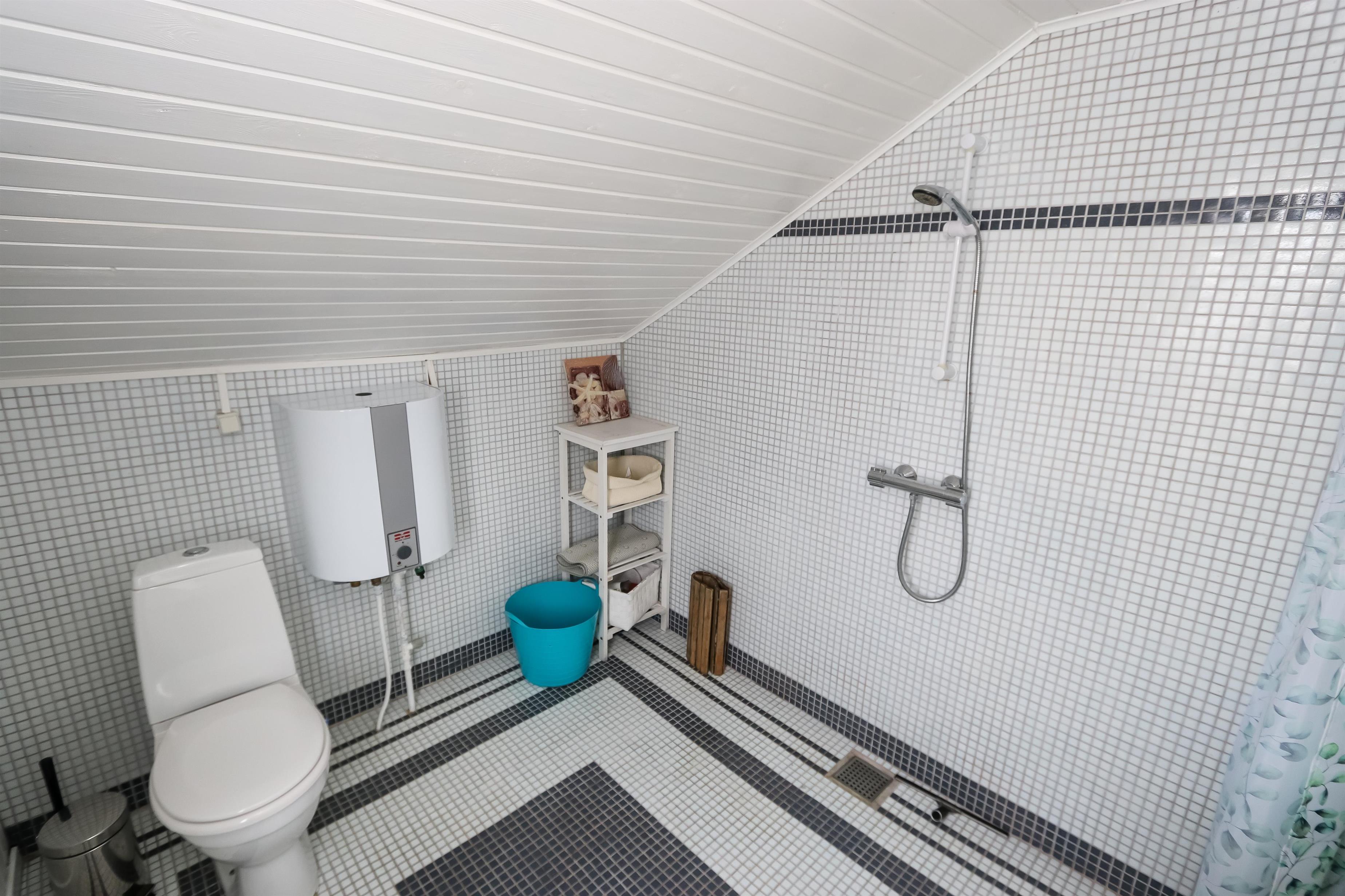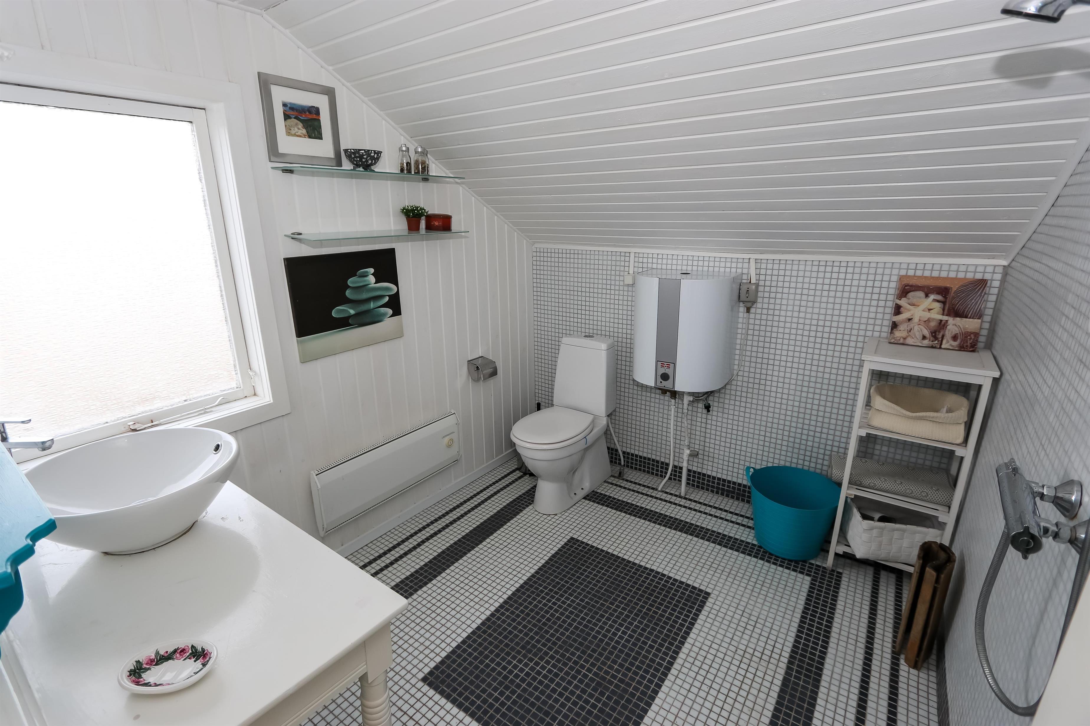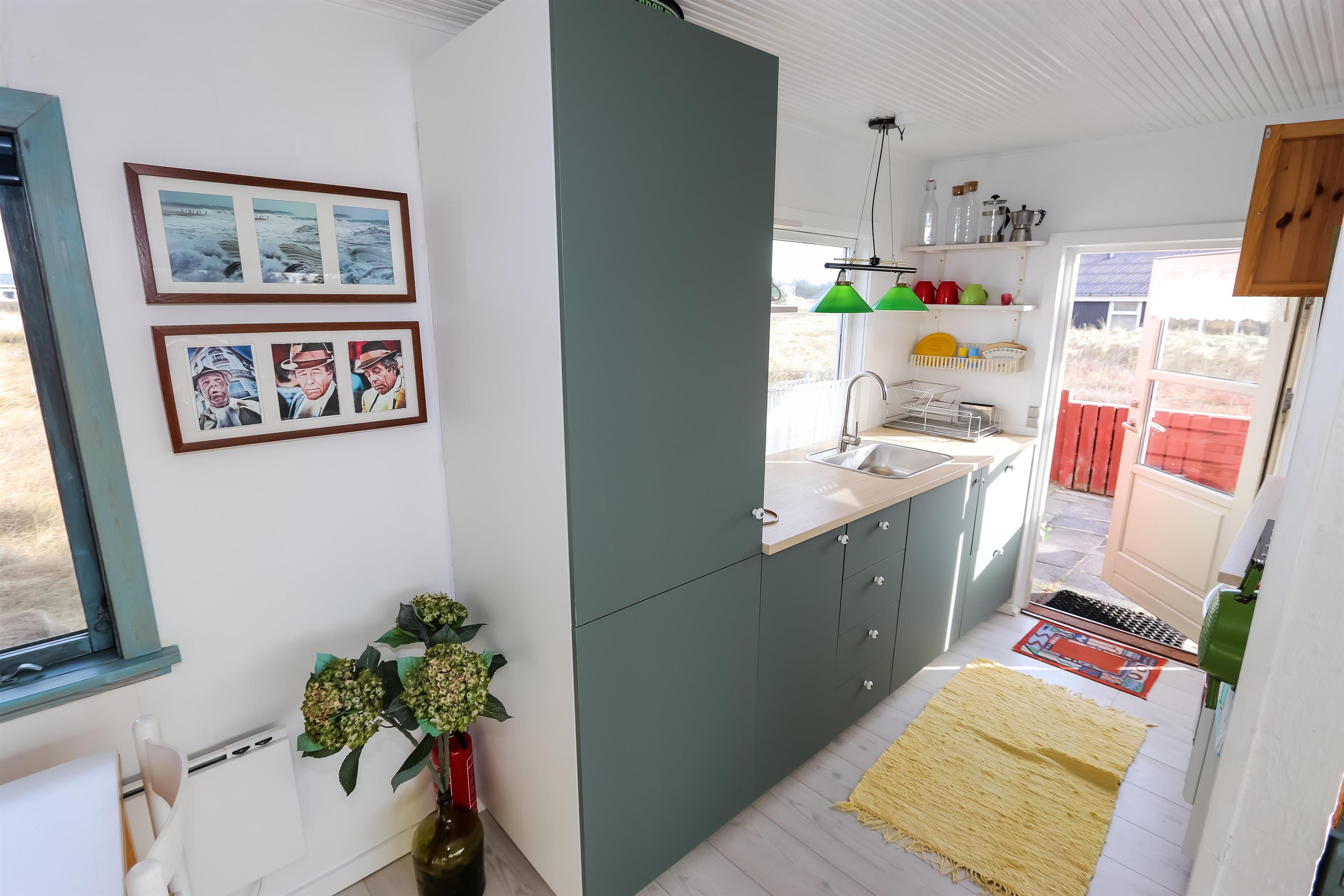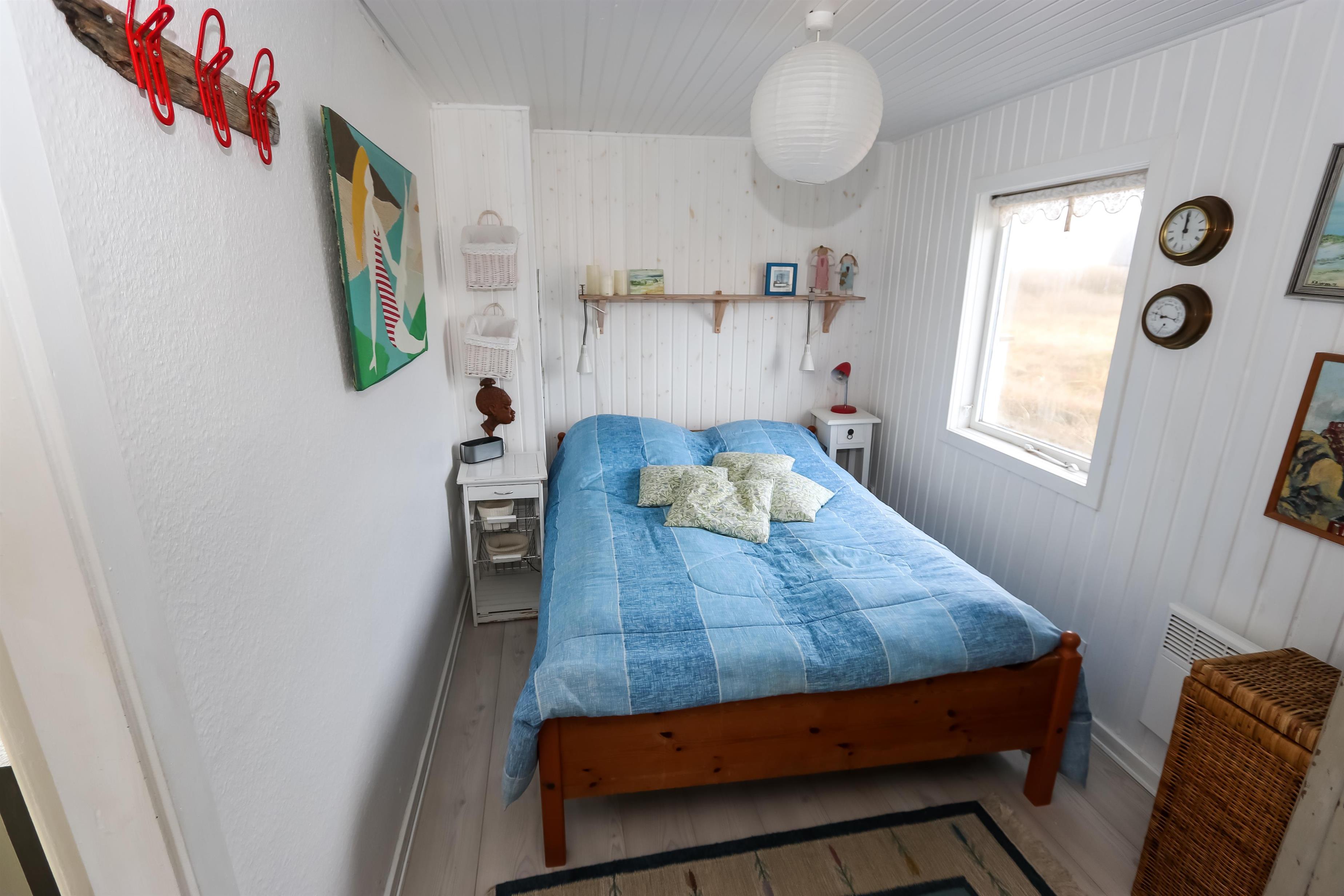 Det nyere køkken er enkelt og funktionelt indrettet med el-komfur og køleskab og giver gode muligheder for at tilberede feriens måltider. Huset har ét soveværelse med en god dobbeltseng. Badeværelset er udstyret med toilet, bruser og håndvask.