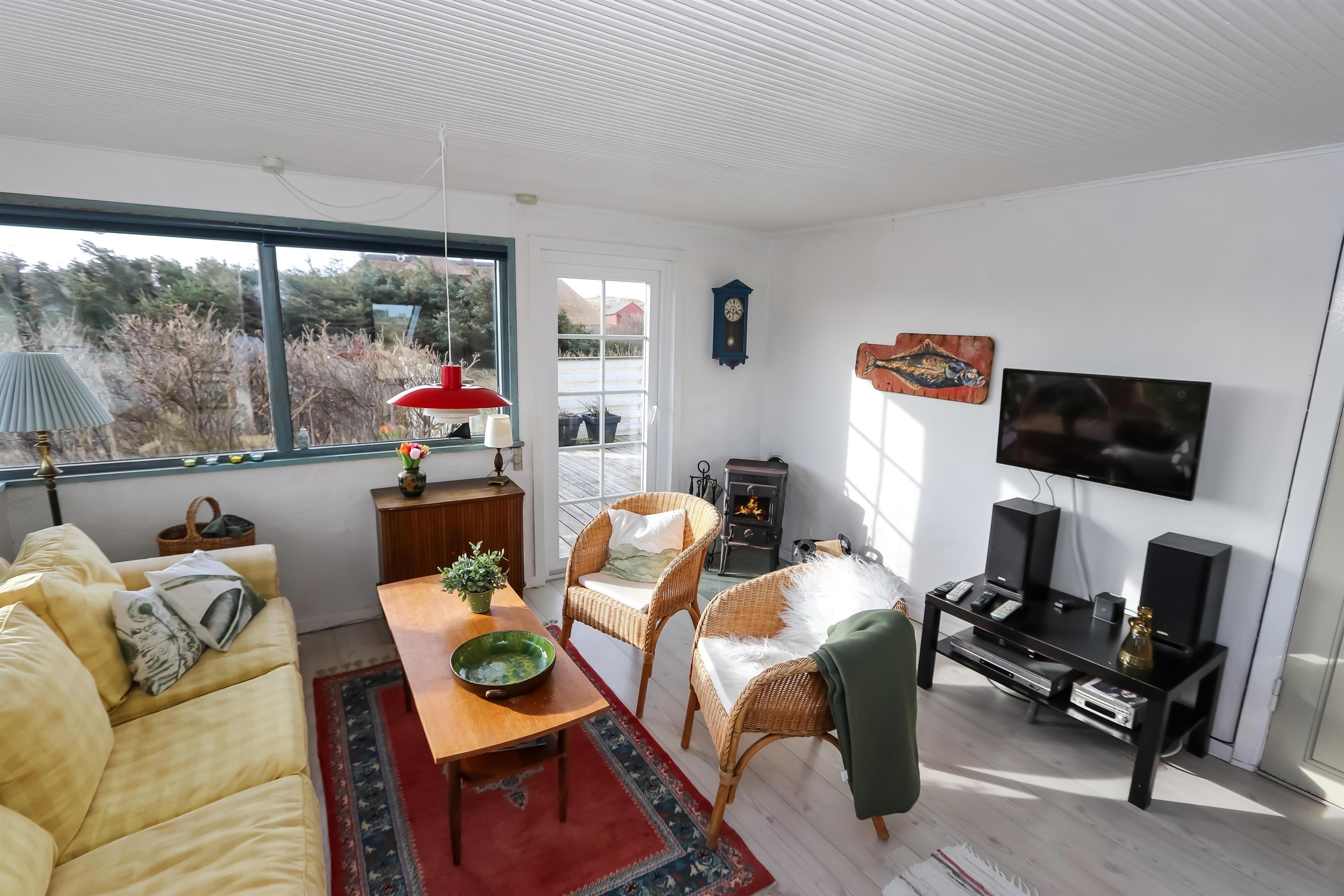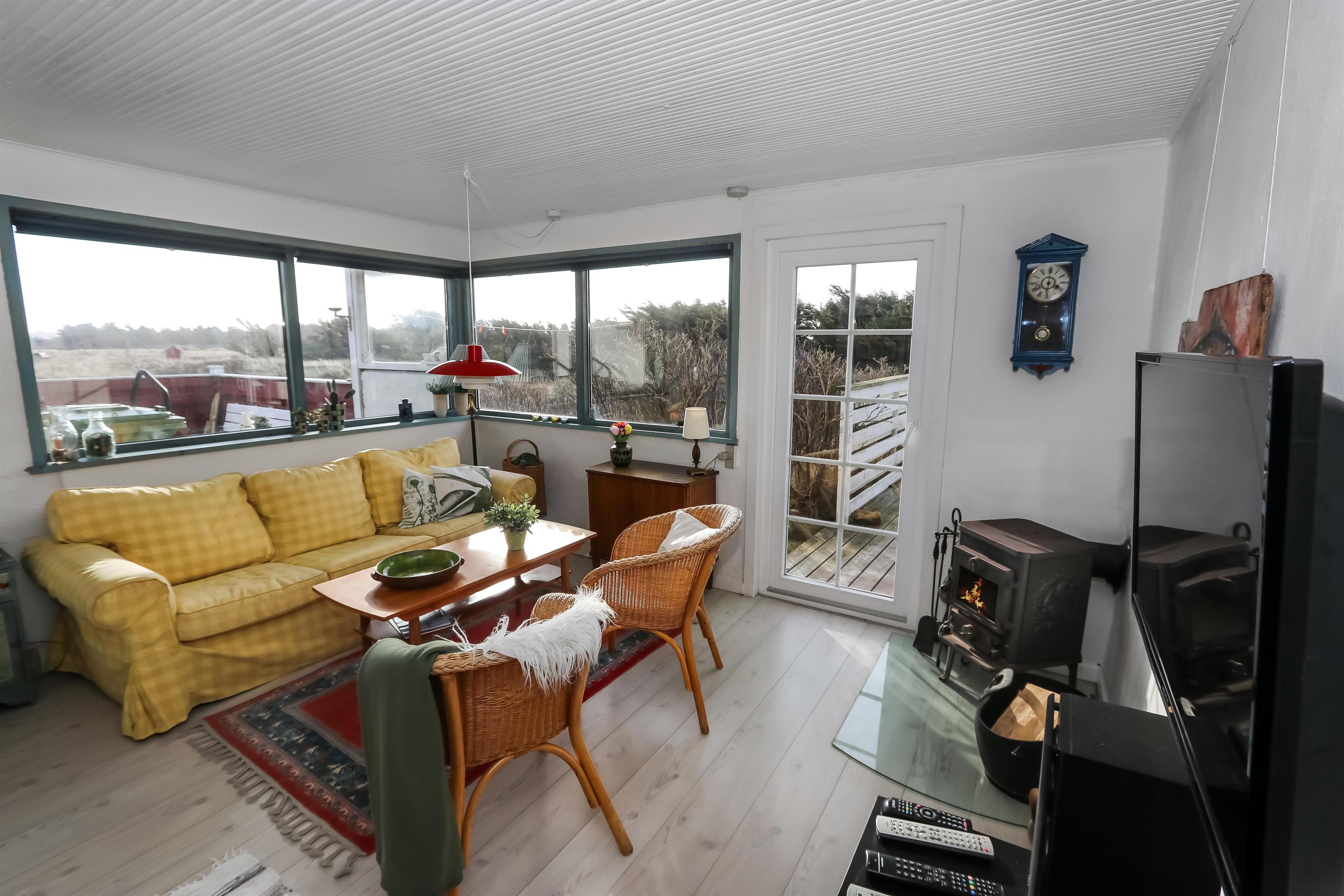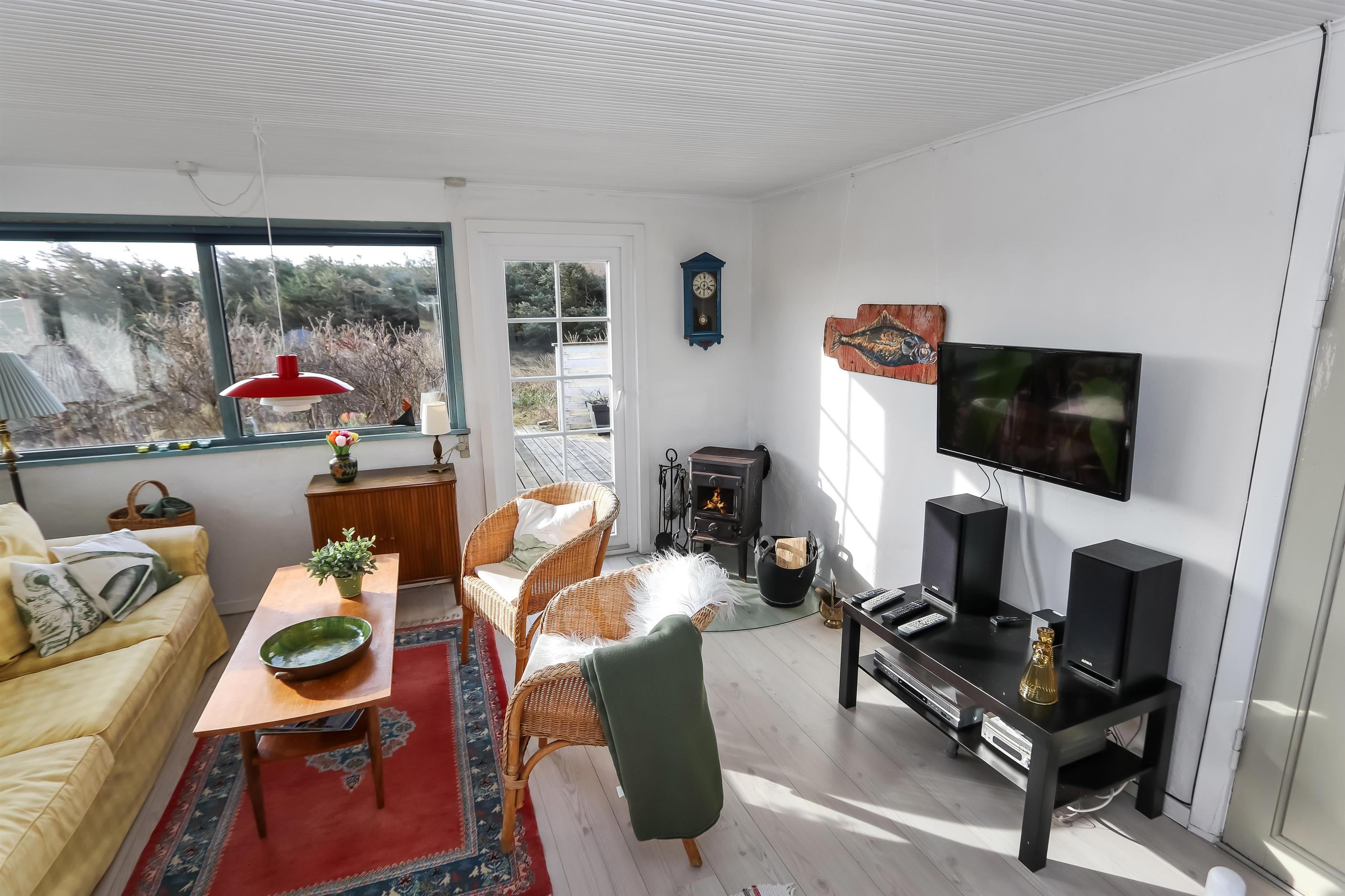 Husets opholdsstue har trægulv og er indrettet med pæne og komfortable møbler. Her kan I nyde varmen fra brændeovnen på køligere dage eller slappe af foran 32" fladskærms-tv med DR-kanalerne. Der er også dvd-afspiller og stereoanlæg, og gratis internetadgang er til rådighed.
