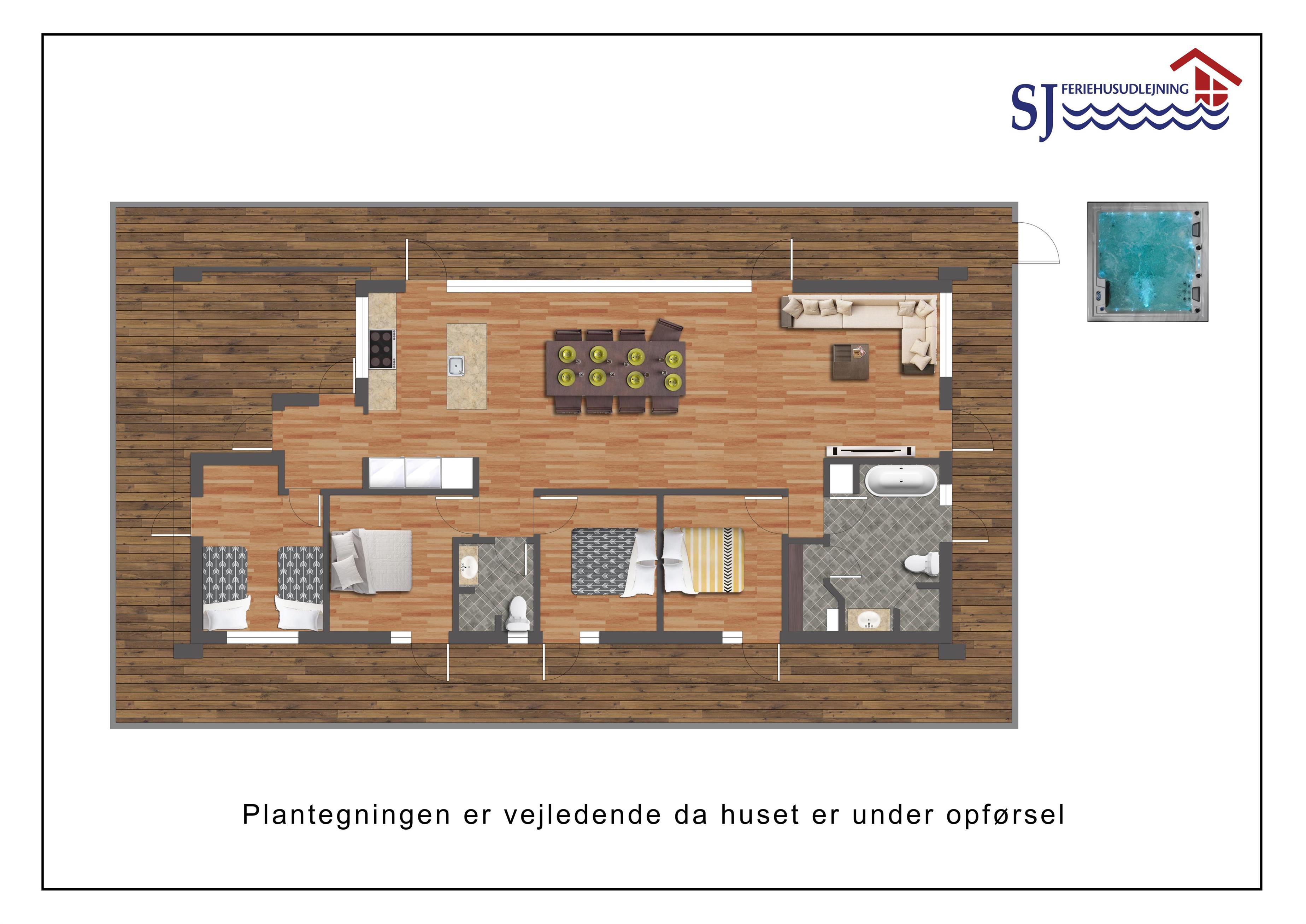 Huset rummer fire gode soveværelser, alle indrettet med boksmadrasser som både kan skubbes sammen til dobbeltsenge eller stilles som enkeltsenge. Derudover en åben hems med ekstra TV – ideel til børn og barnlige sjæle. Der er to flotte badeværelser med bruser, toilet og håndvask, begge med gulvvarme. I det store badeværelse findes også et badekar og vaskesøjle med vaskemaskine og tørretumbler. Der er også direkte adgang til husets indendørs sauna. Fra det store badeværelse er der direkte udgang til terrassen og lige udenfor er udebruseren, hvilket gør det oplagt at kombinere en varm sauna med frisk havluft og et koldt brusebad under udendørsbruseren.