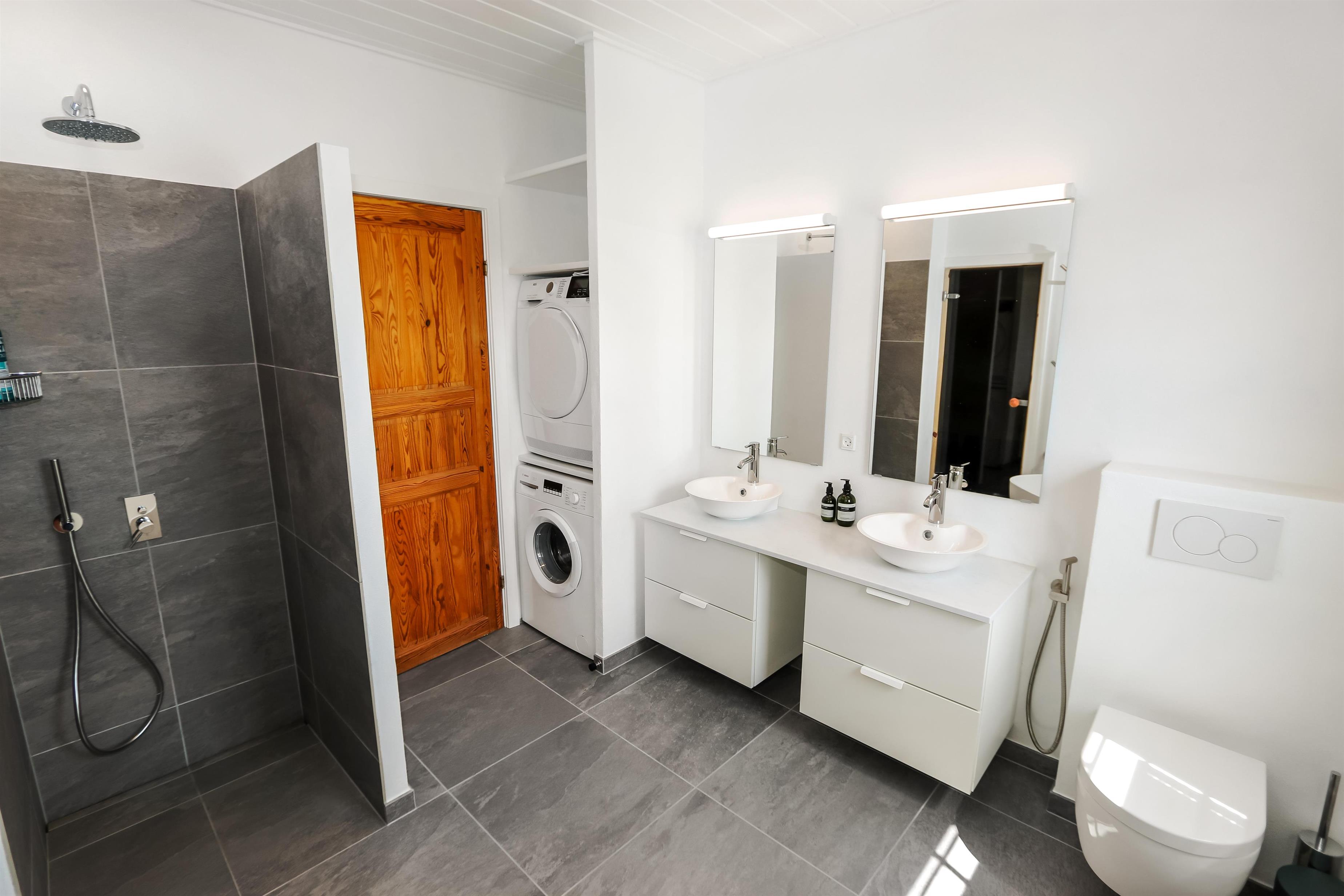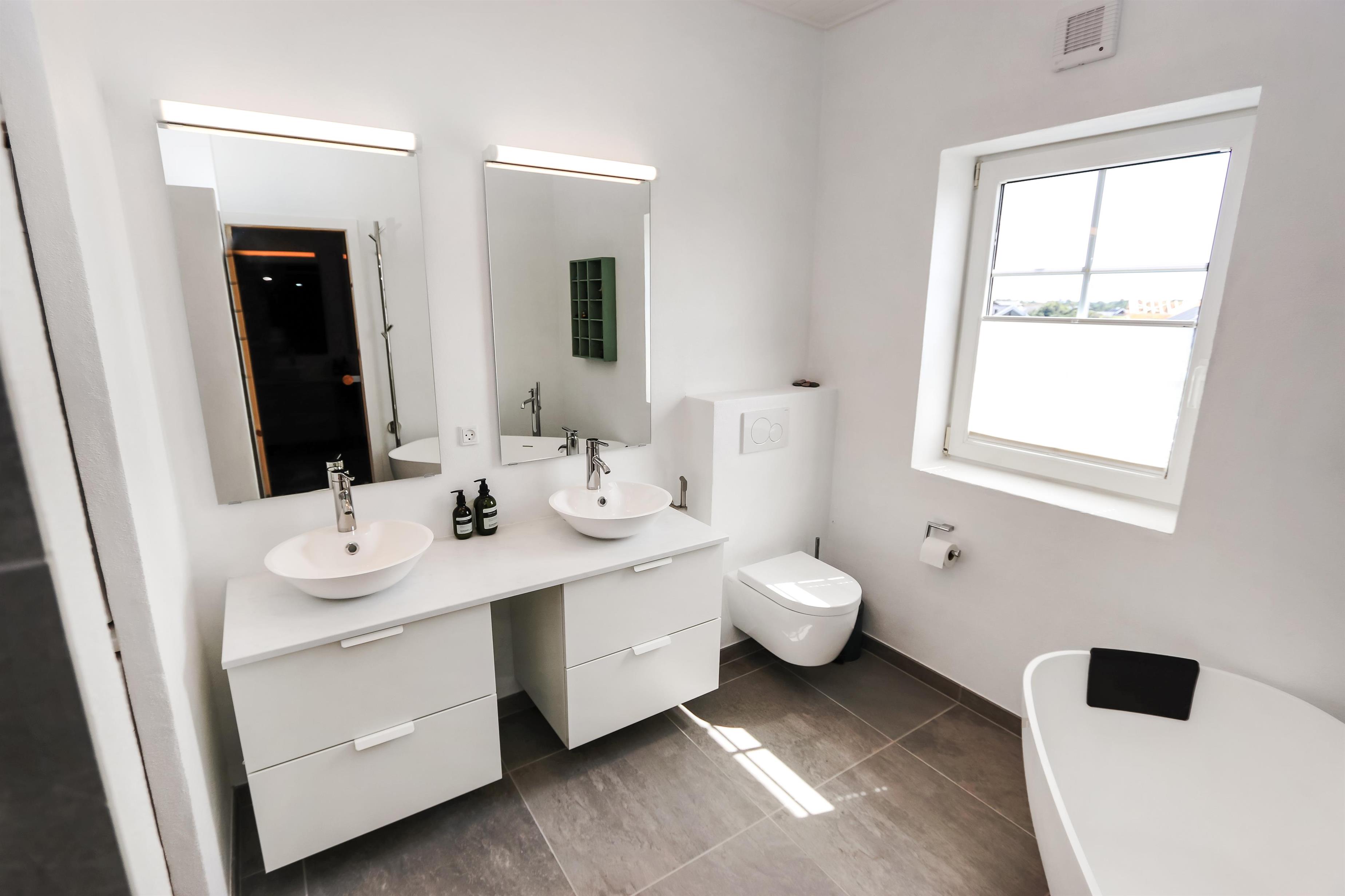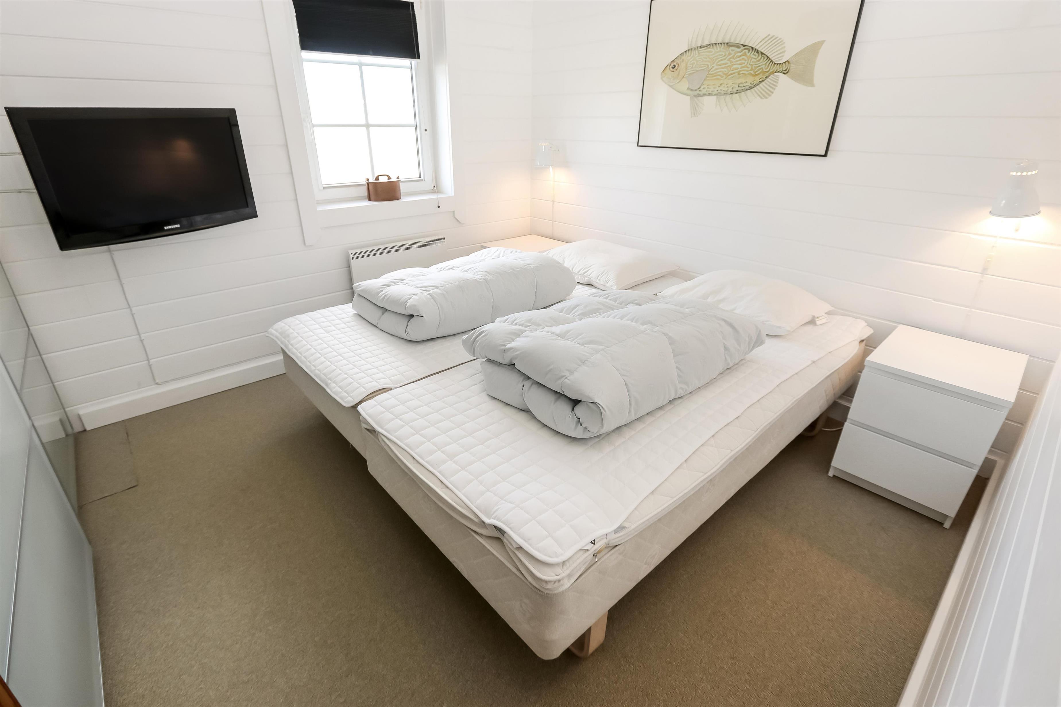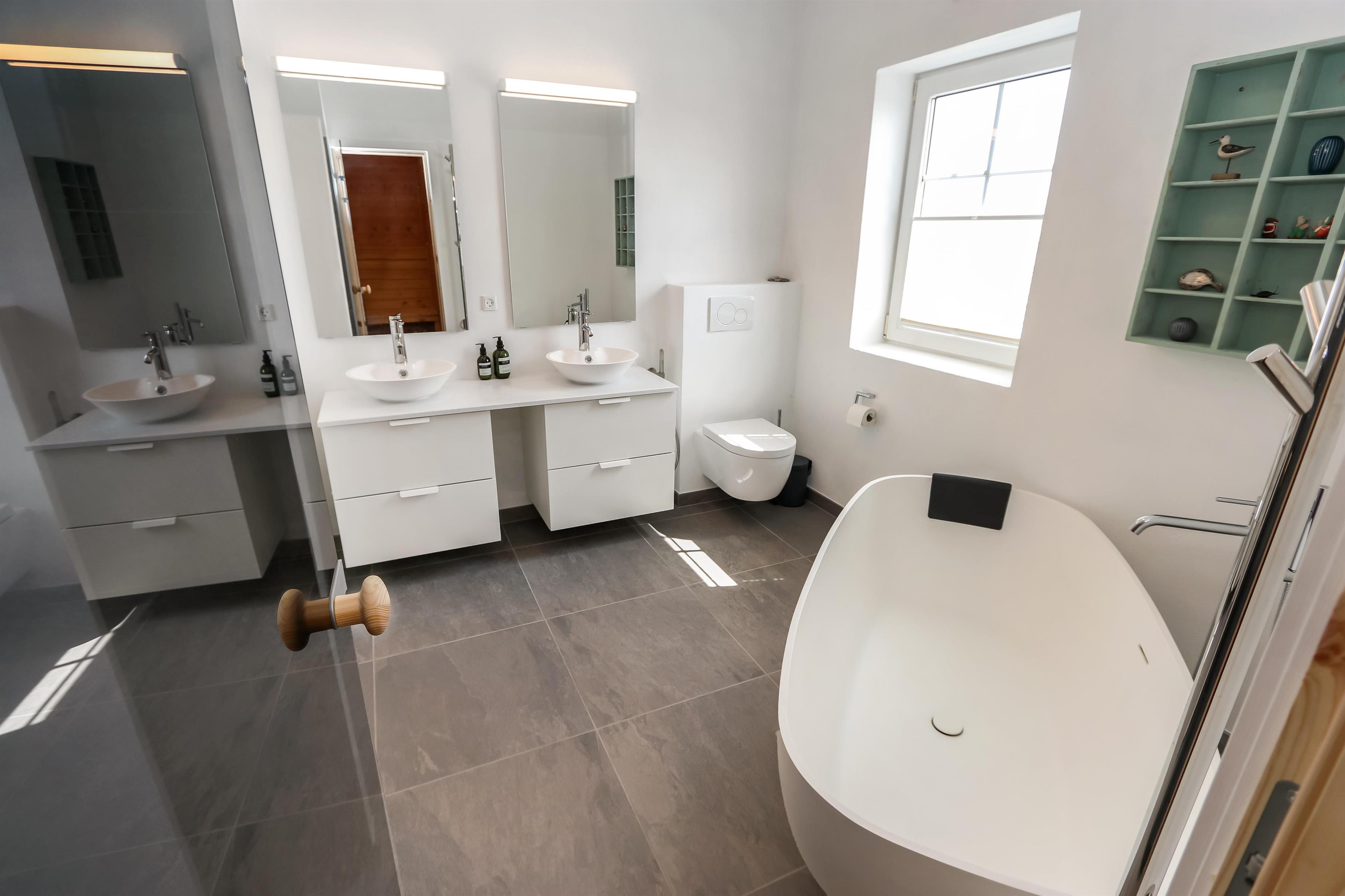 Indendørs finder I en hyggelig stue med brændeovn, fladskærms-TV med tyske kanaler, DVD og stereoanlæg med CD. Køkkenet er fuldt udstyret med el-komfur, køle-/fryseskab, mikroovn og opvaskemaskine, så madlavningen bliver enkel og fornøjelig. Huset har fire komfortable soveværelser, tre badeværelser – herunder et med sauna, gulvvarme og fritstående badekar – samt gæstetoilet, vaskemaskine, tørretumbler og klimaanlæg. Gratis trådløst internet gør det nemt at holde forbindelsen, mens I nyder ferien. Huset tillader to husdyr og er røgfrit.