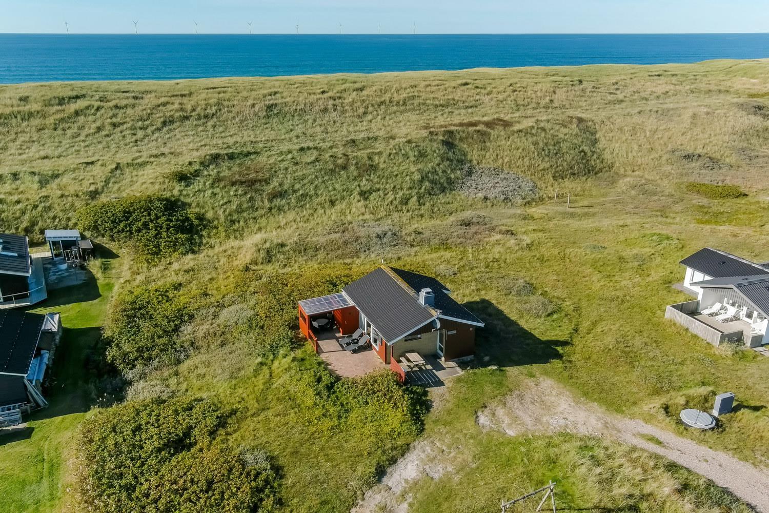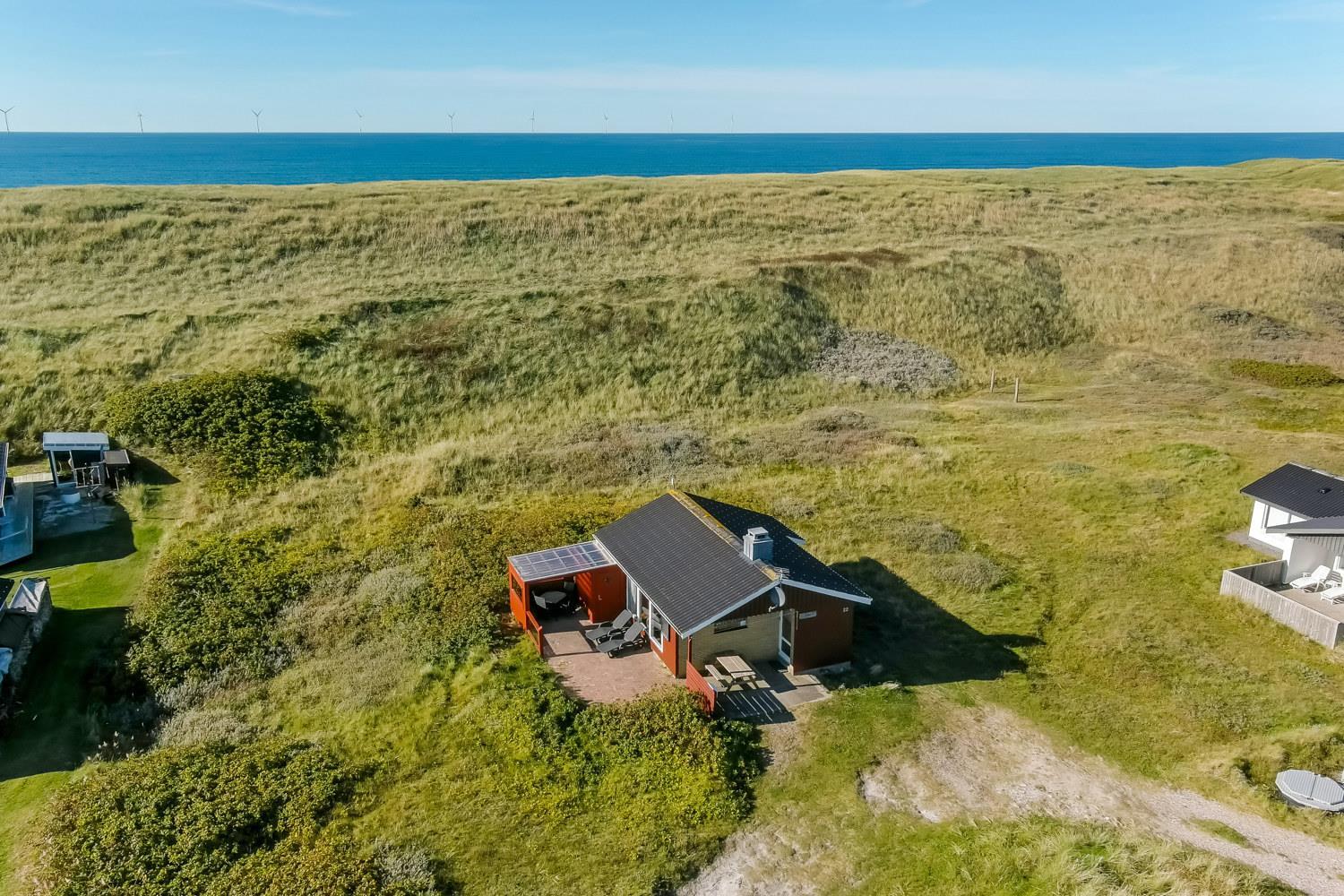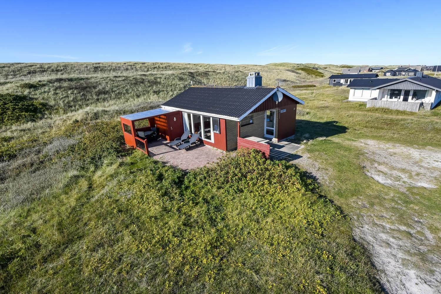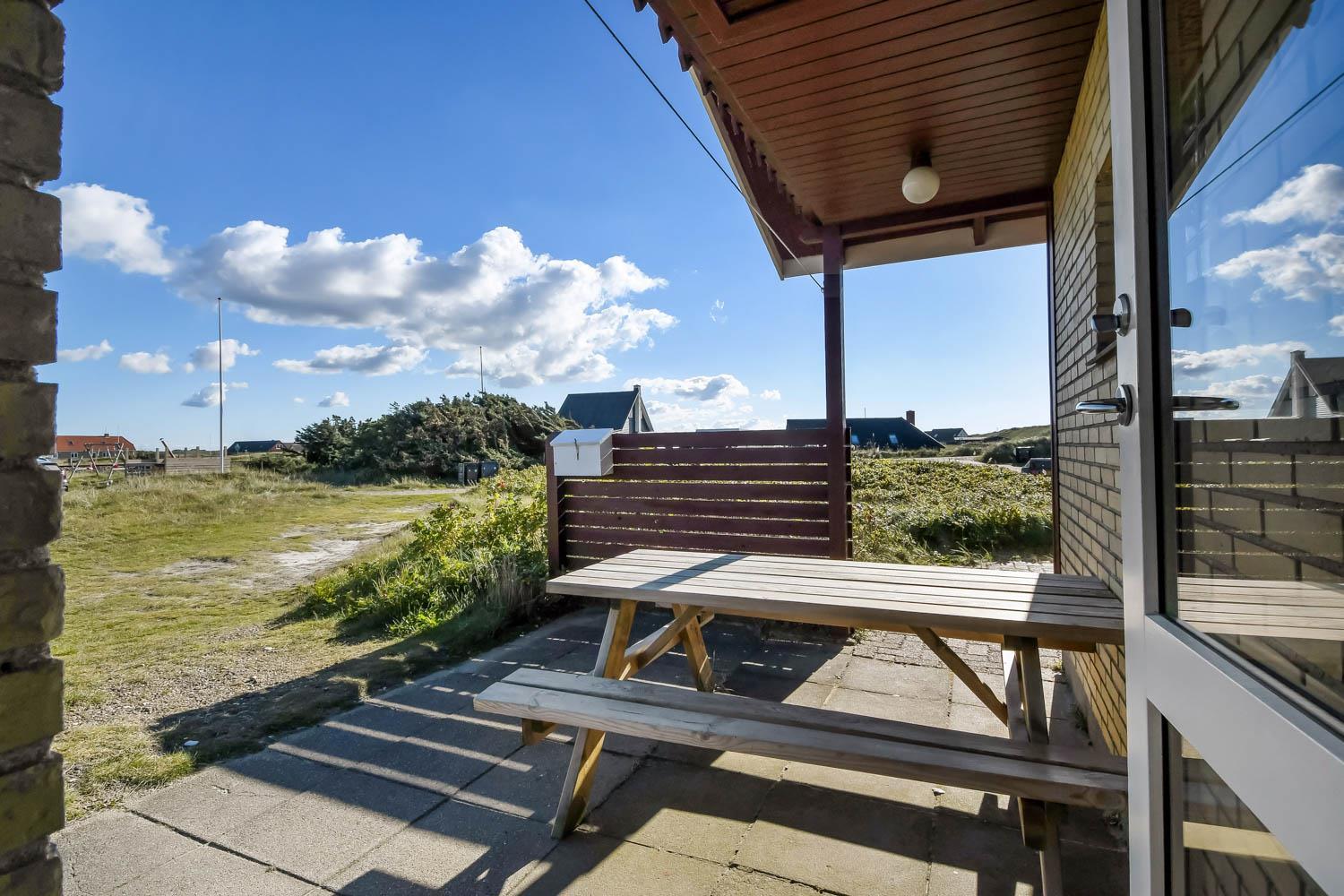 Fra køkkenhjørnet er der udgang til en lille terrasse med havemøbler og grill. Huset ligger på en ca. 3000 m2 stor klitgrund kun 50 fra Vesterhavet. Nyd en ferie i et lille, nyrenoveret feriehus med en helt unik beliggenhed. Parker bilen og nyd at I resten af ferien kan gå til stranden på under 5 minutter.