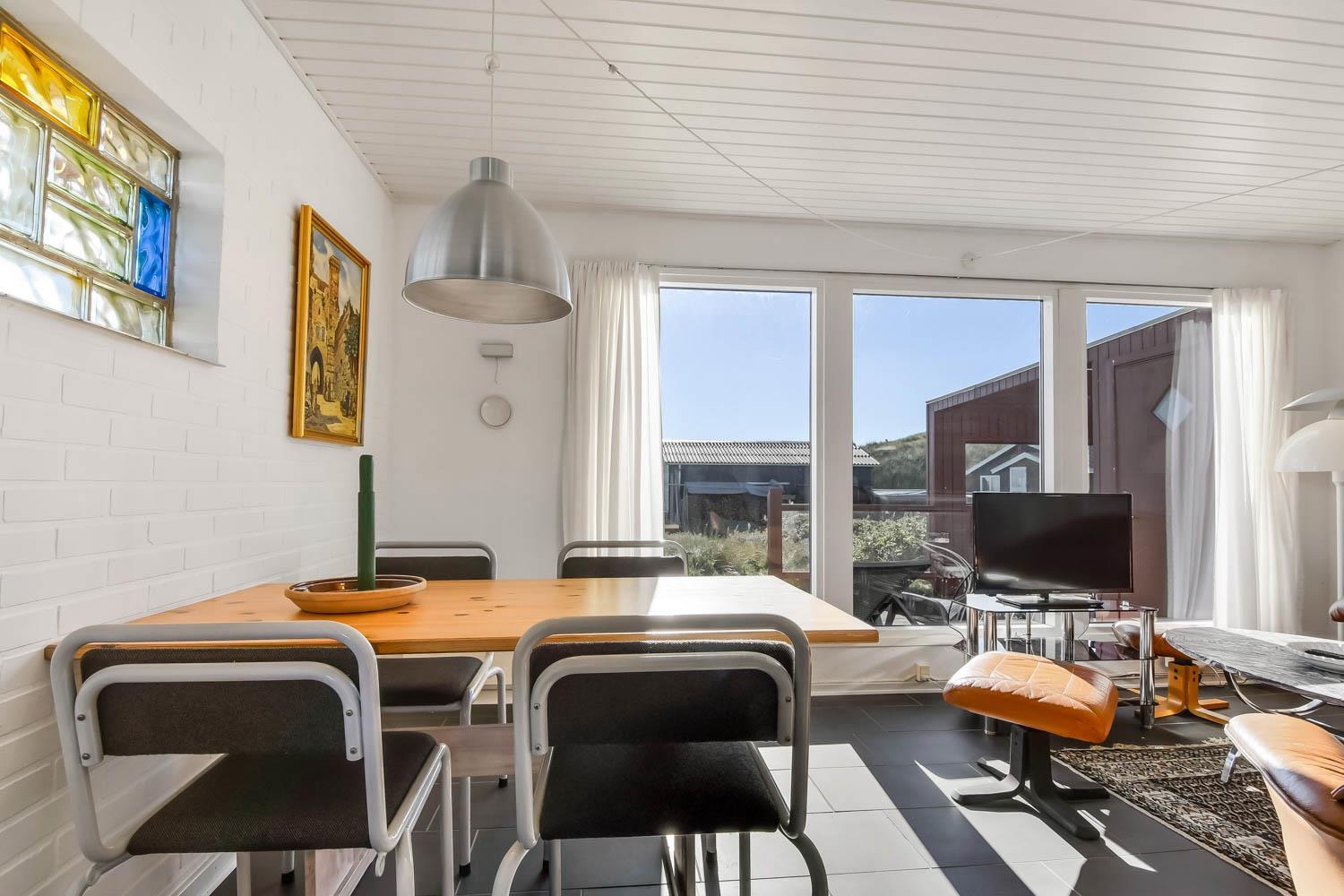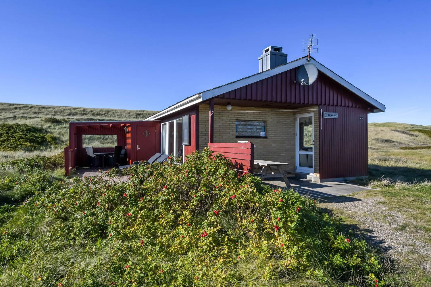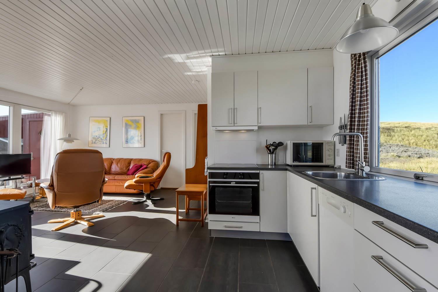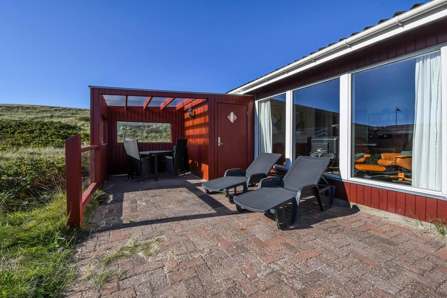 Fra køkkenhjørnet er der udgang til en lille terrasse med havemøbler og grill. Huset ligger på en ca. 3000 m2 stor klitgrund kun 50 fra Vesterhavet. Nyd en ferie i et lille, nyrenoveret feriehus med en helt unik beliggenhed. Parker bilen og nyd at I resten af ferien kan gå til stranden på under 5 minutter.