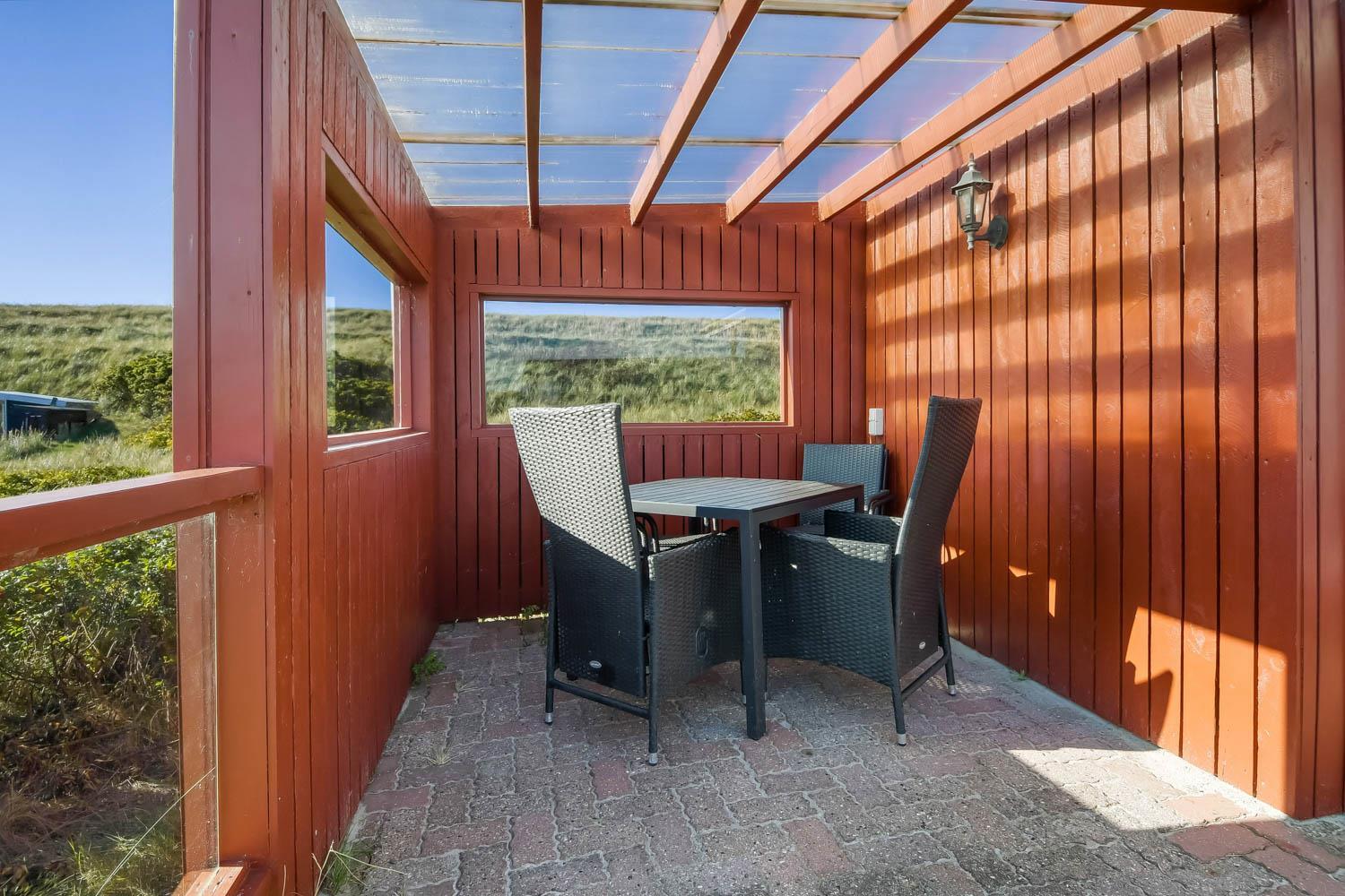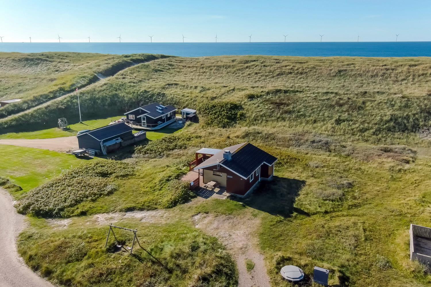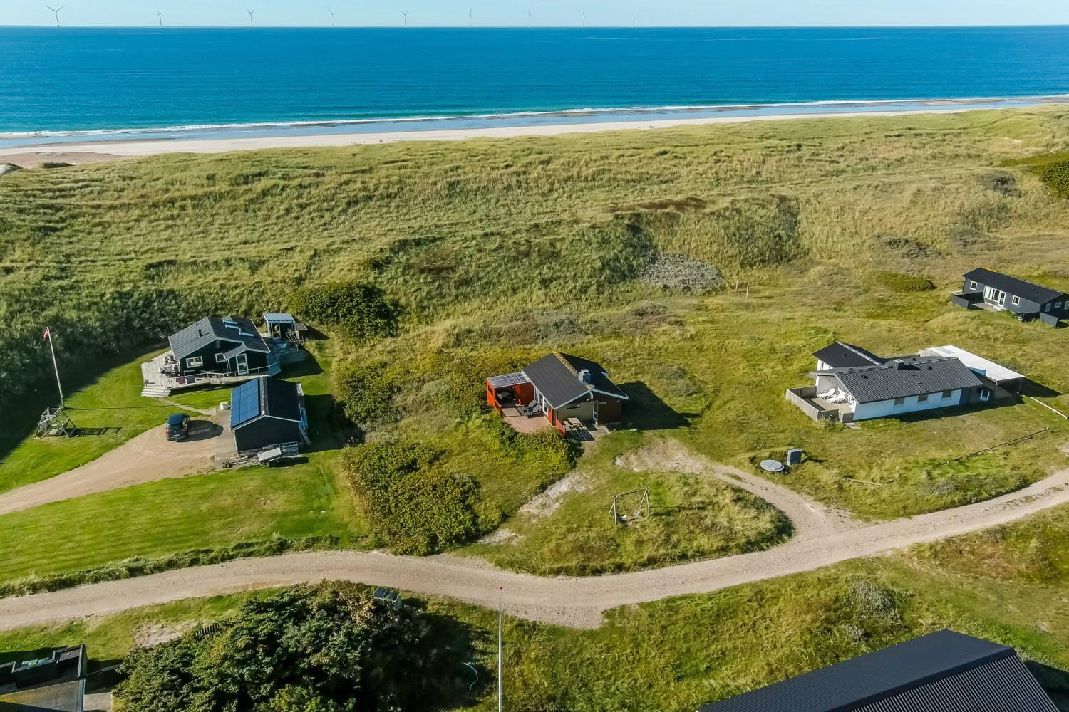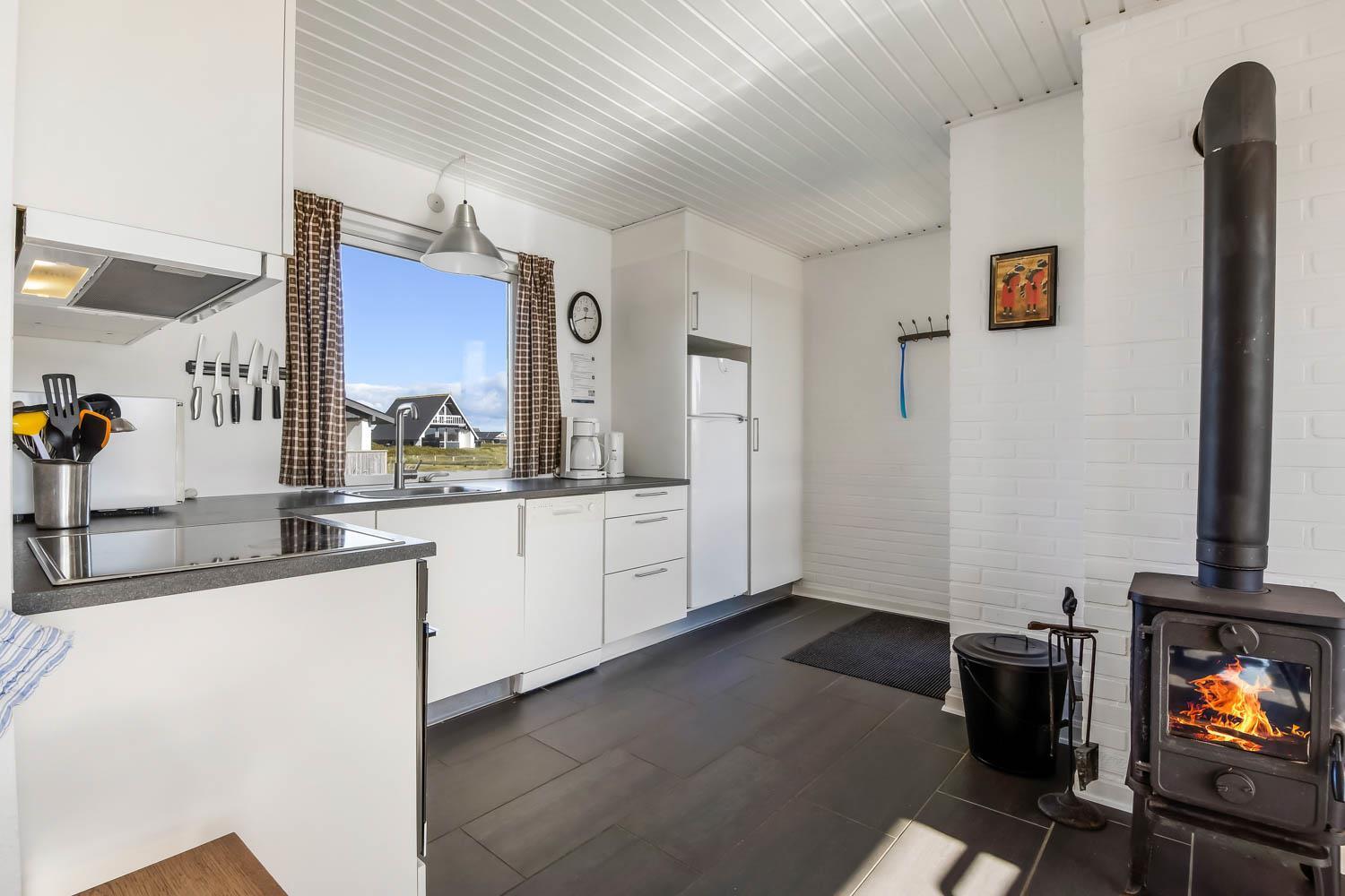 Fra køkkenhjørnet er der udgang til en lille terrasse med havemøbler og grill. Huset ligger på en ca. 3000 m2 stor klitgrund kun 50 fra Vesterhavet. Nyd en ferie i et lille, nyrenoveret feriehus med en helt unik beliggenhed. Parker bilen og nyd at I resten af ferien kan gå til stranden på under 5 minutter.