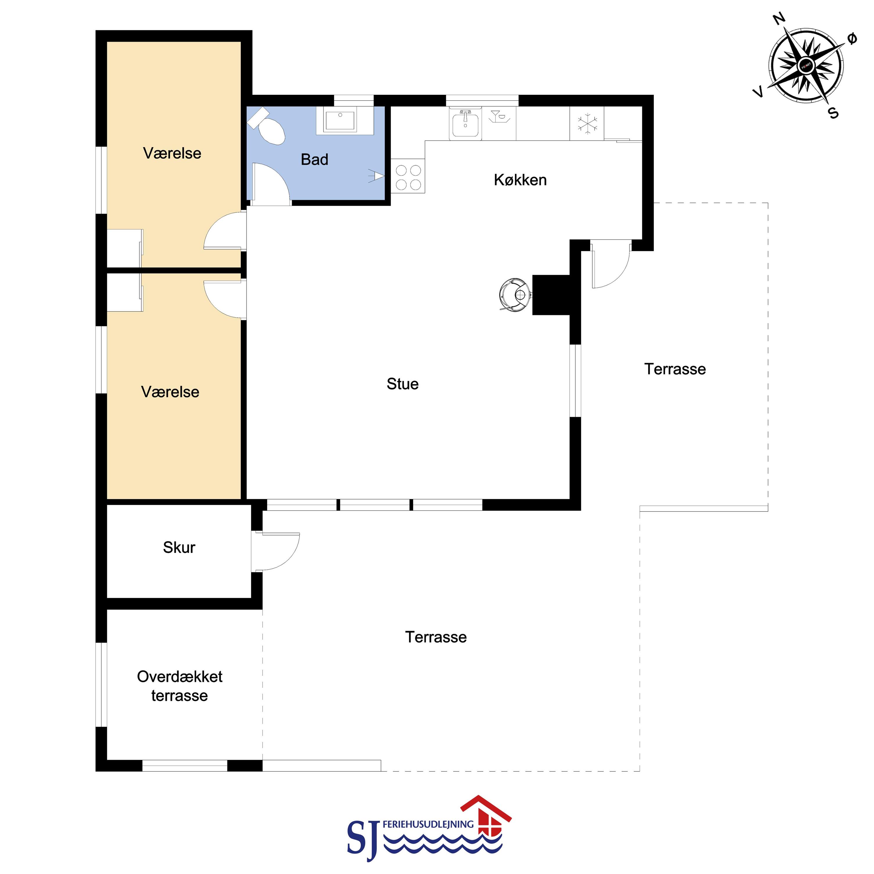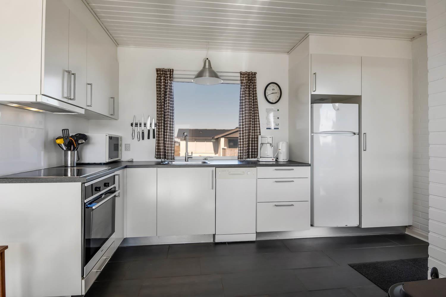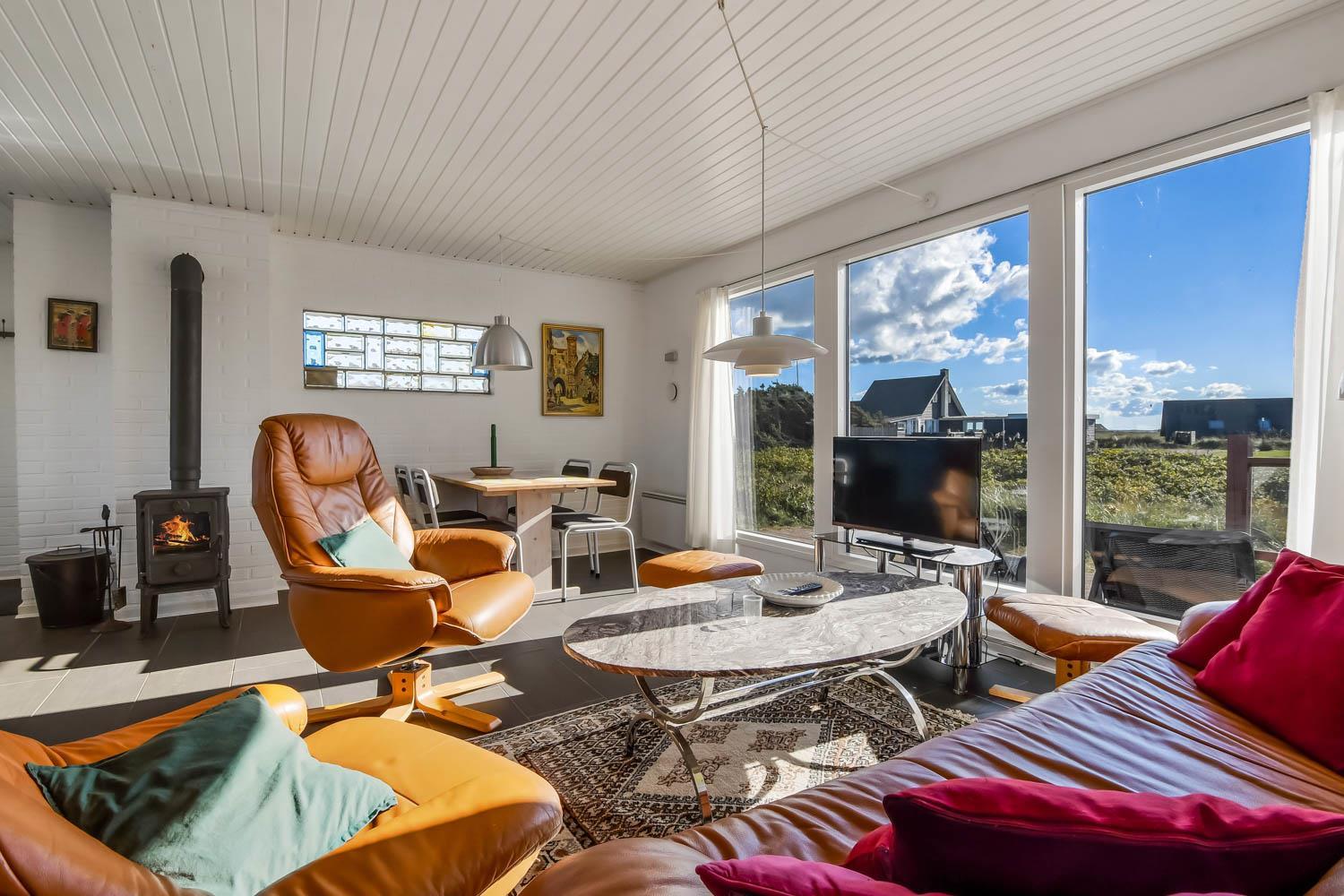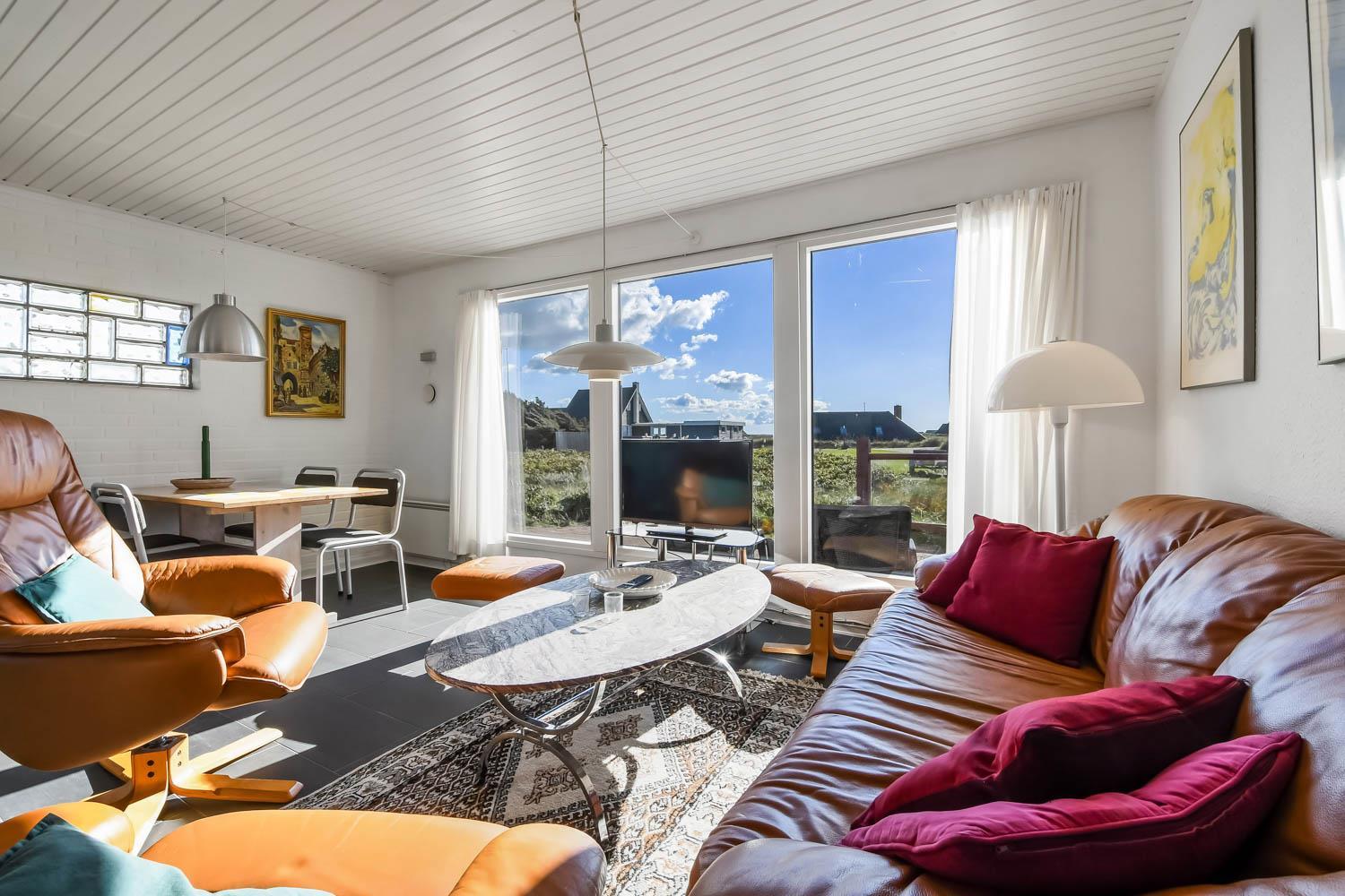 Fra køkkenhjørnet er der udgang til en lille terrasse med havemøbler og grill. Huset ligger på en ca. 3000 m2 stor klitgrund kun 50 fra Vesterhavet. Nyd en ferie i et lille, nyrenoveret feriehus med en helt unik beliggenhed. Parker bilen og nyd at I resten af ferien kan gå til stranden på under 5 minutter.