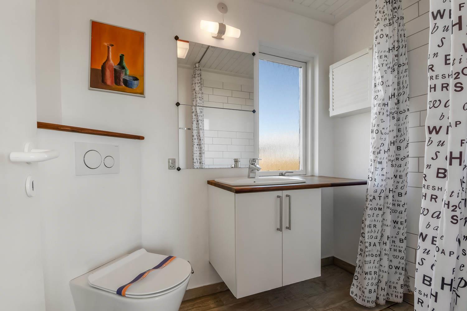 Mindre sommerhus med 2 soverum (2ES, 2ES). Flot nyrenoveret badeværelse med bruser, toilet, håndvask og klinkegulv med gulvvarme. Hygelig opholdsstue med flot klinkegulv, og ældre læder og polstermøbler, spiseplads, TV med danske og tyske programmer, radio, CD-afspiller og brændeovn. Nyt køkkenhjørne med klinkegulv, keramiske kogeplader, emhætte, indbygningsovn, opvaskemaskine og køleskab med lille fryseboks. Ikke ryger hus. 2 husdyr tilladt.