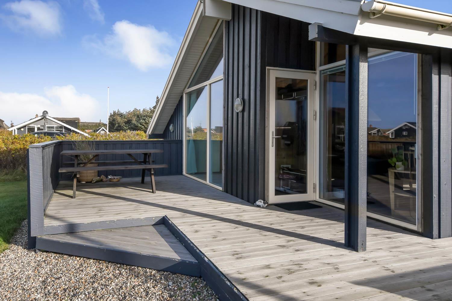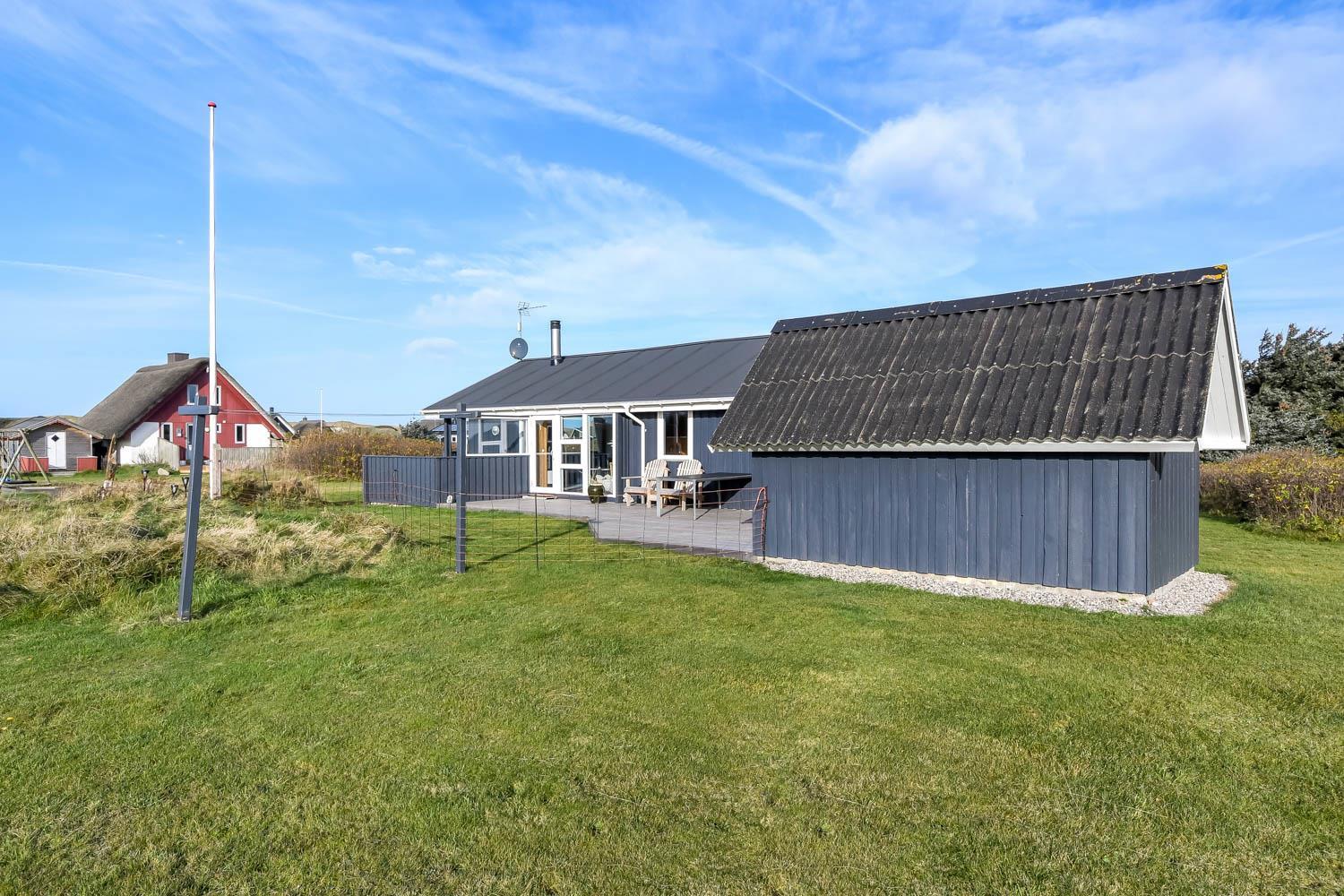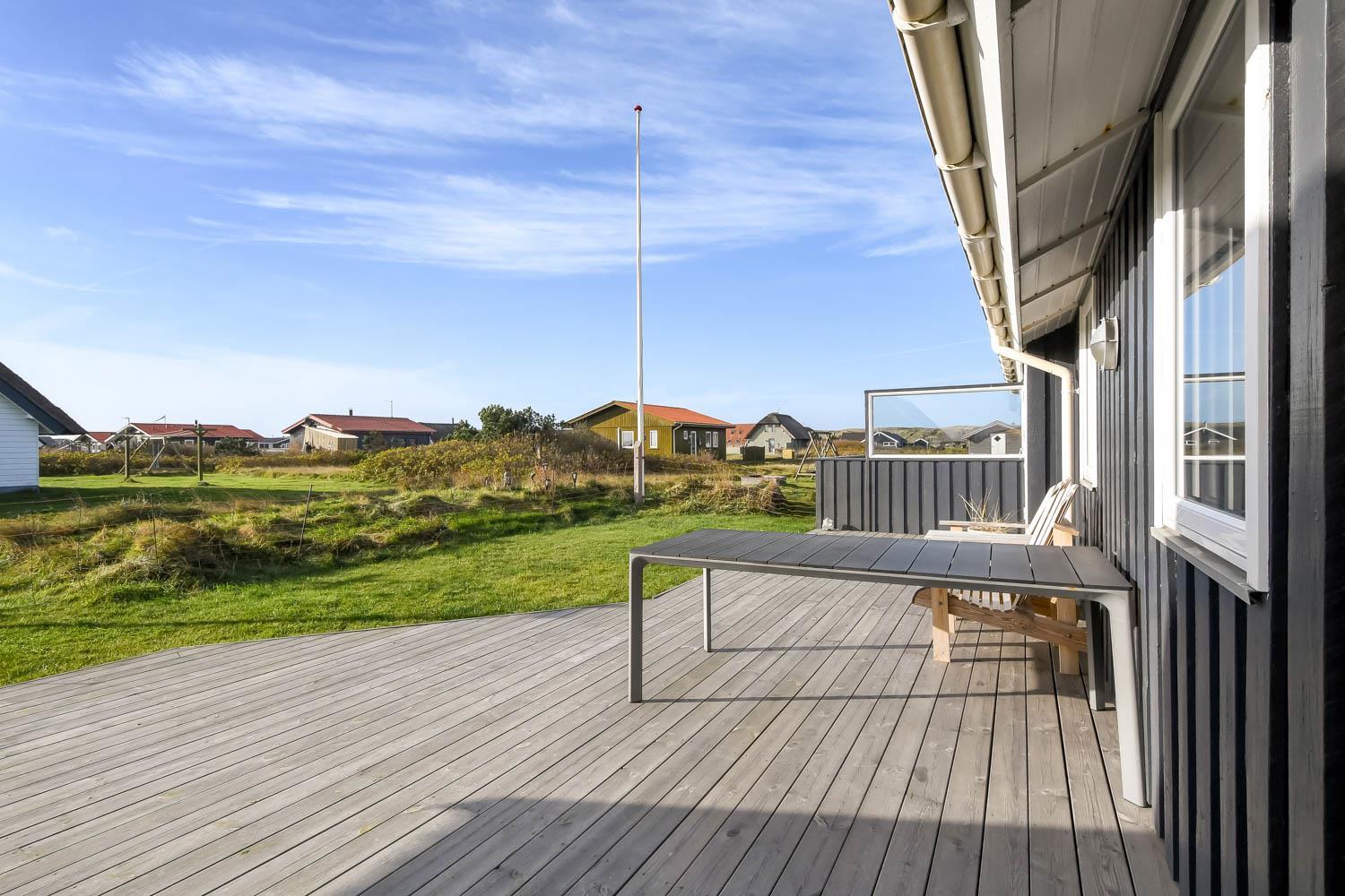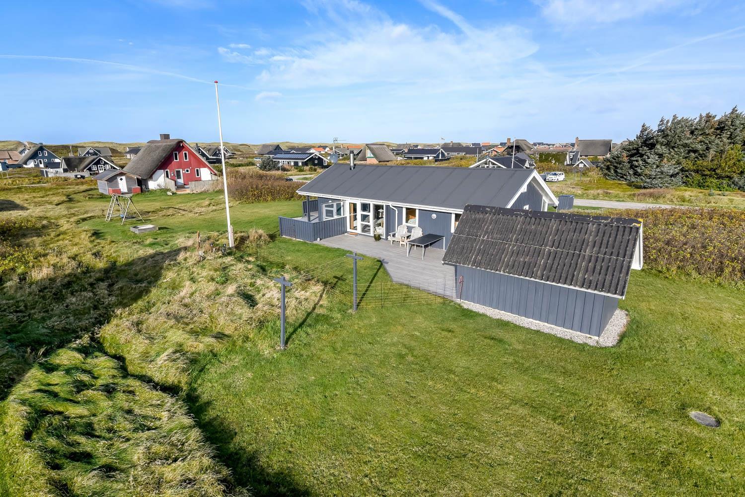 Huset er beliggende på en åben grund tæt ved Vesterhavet og har et dejlig terrasseanlæg med havemøbler, liggestole og grill. Nyd at der altid er mulighed for at finde en plads i solen og nyd udsigten til de høje klitter. Et dejligt feriehus kun ca. 250m fra det brusende Vesterhav, som hver dag byder på nye maleriske oplevelse. Så hvad enten I er til aktiv ferie eller total afslapning danner dette flotte hus en fantastisk ramme både hvad angår hus, beliggenhed og omgivelse