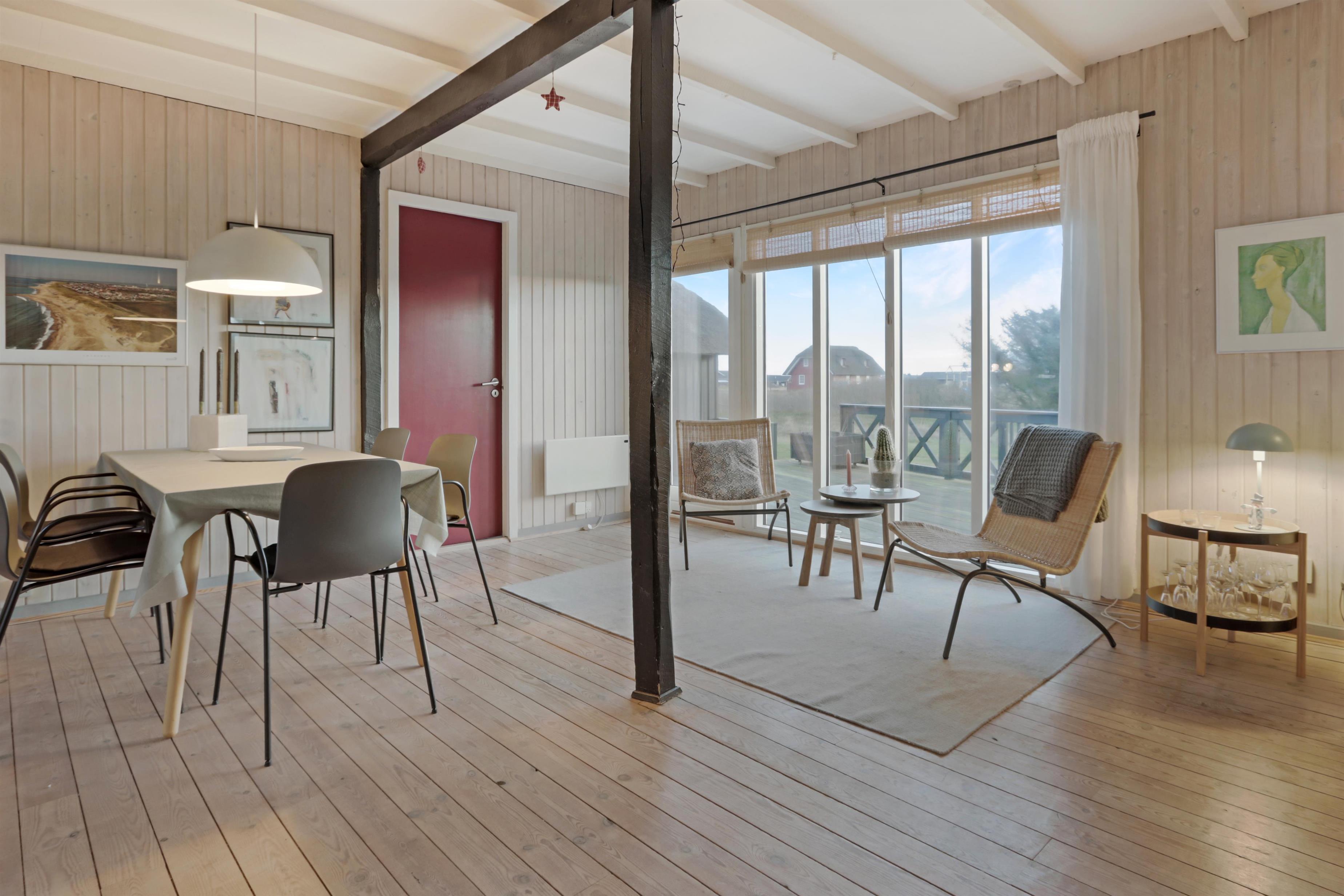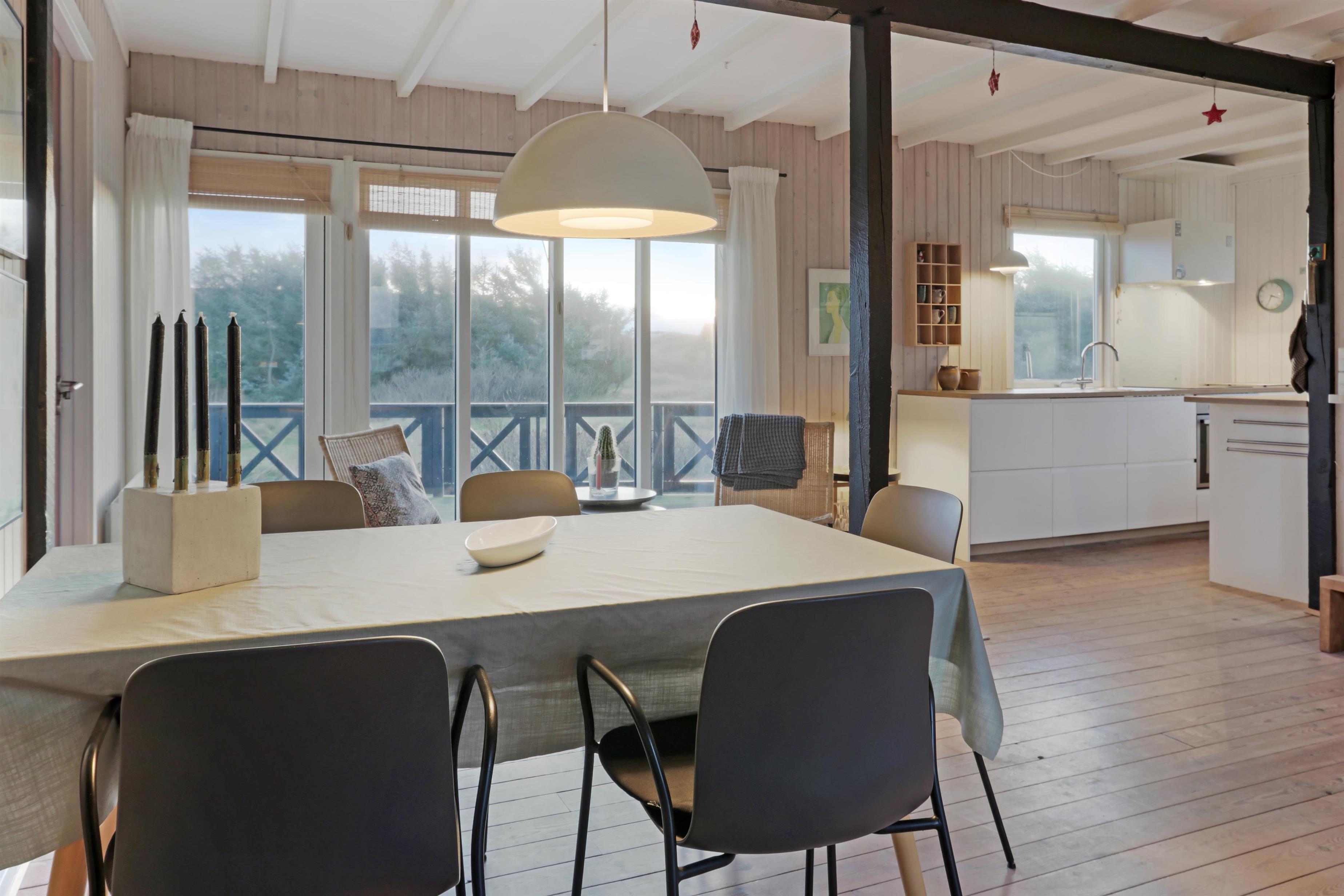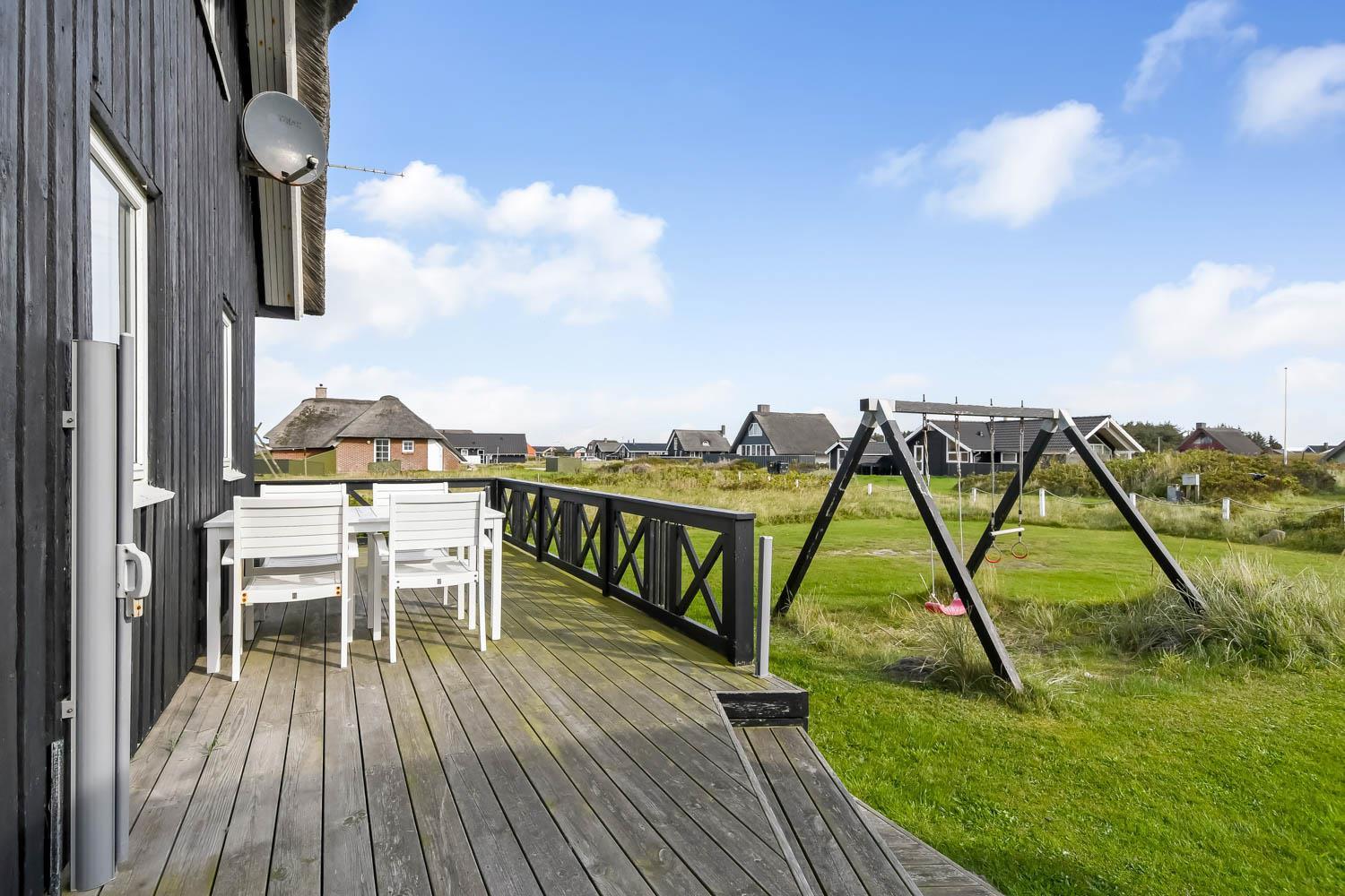 Feriehuset er beliggende på en 2.616 m2 stor klitgrund kun 100 meter fra Vesterhavet. Dejligt, romantisk terrasseanlæg med havemøbler, solvogne og grill. Nyd den helt unikke mulighed det er at sidde på terrassen samtidig med, at man kan høre Vesterhavet lige på den anden side af klitterne, Der er også rig mulighed for at nyde solen, hinanden eller en god grillaften. Gå en tur med hunden i det rolige feriehusområde, henover de høje klitter og straks derefter åbenbarer Vesterhavet sig. Hver dag byder Vesterhavet på nye maleriske oplevelse, der invitere til en frisk gå- eller løbetur. Eller hvad med en lille tur på ca. 10 - 15 min op til områdets lille købmand, som i sæsonen har åbent og byder på frisk morgenbrød og hvor de daglige indkøb også kan klares. Så hvad enten du er til aktiv ferie eller total afslapning danner dette flotte feriehus den perfekte ramme både hvad angår hus, beliggenhed og omgivelser. Indenfor kort køreafstand nås både den aktive handelsby i Lemvig med flere specialbutikker eller den unikke fiskerby Thyborøn, som udover den aktive fiskerihavn også byder på badestrand og op til flere aktivitetstilbud, som alle er et besøg værd.