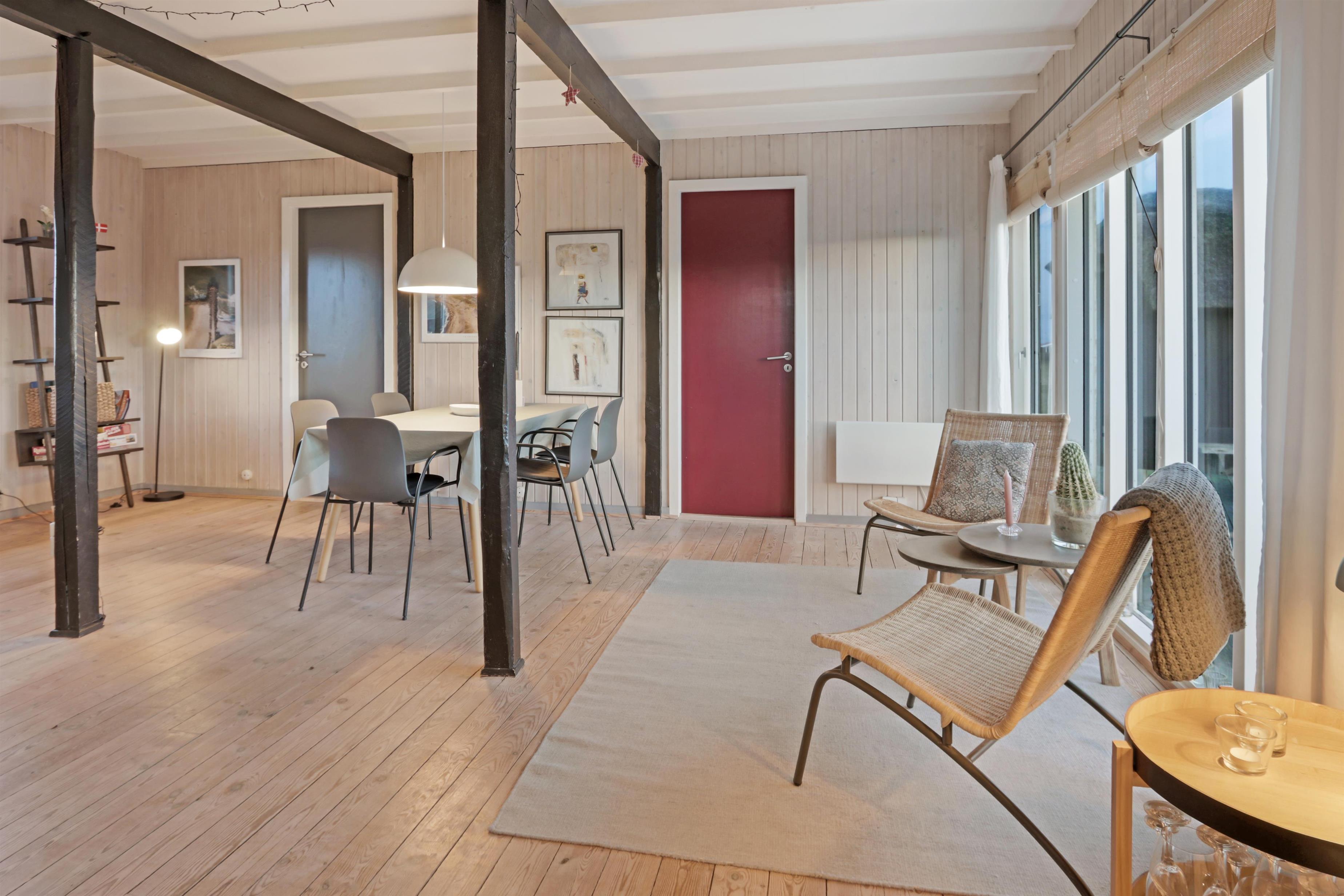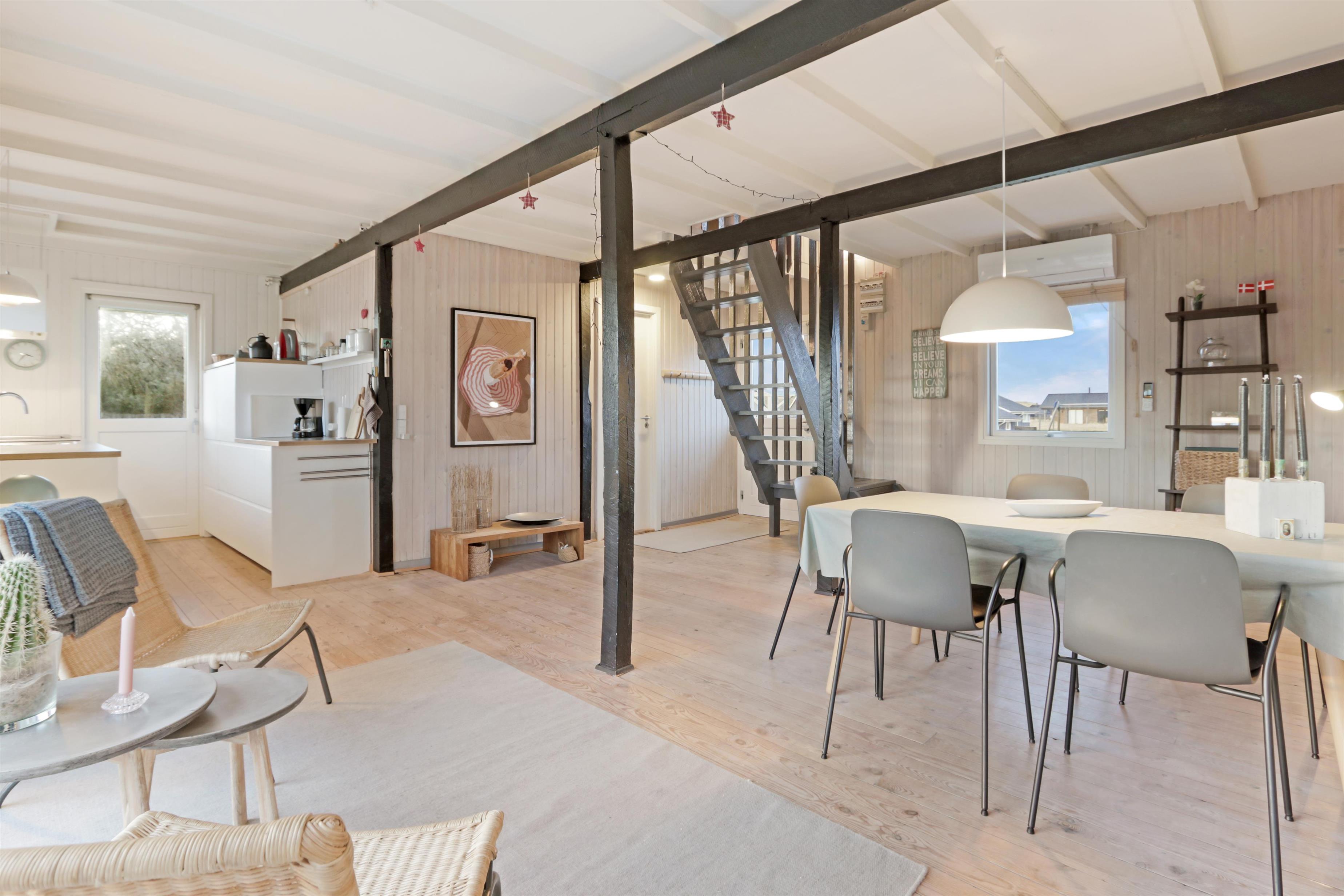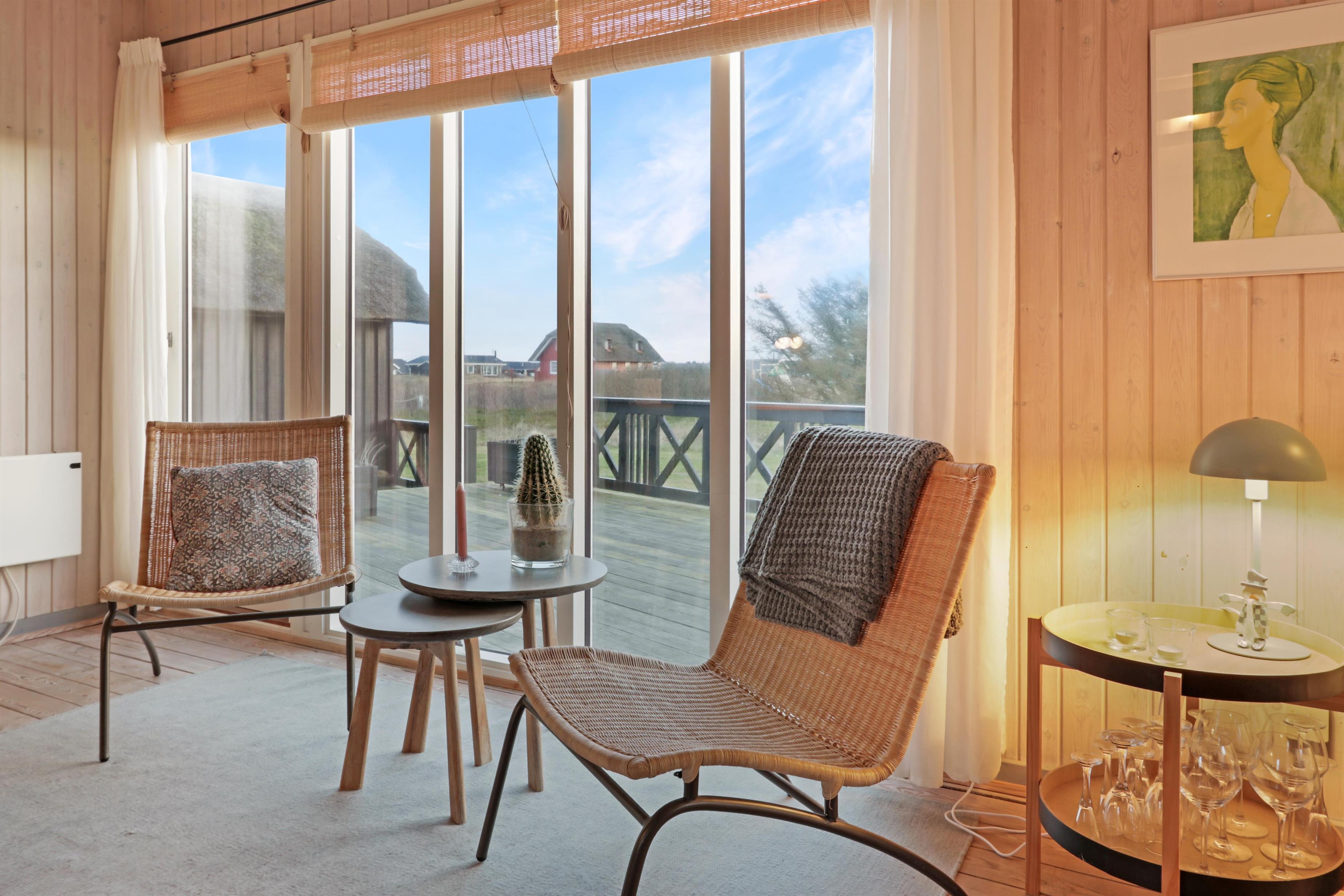 Feriehuset er beliggende på en 2.616 m2 stor klitgrund kun 100 meter fra Vesterhavet. Dejligt, romantisk terrasseanlæg med havemøbler, solvogne og grill. Nyd den helt unikke mulighed det er at sidde på terrassen samtidig med, at man kan høre Vesterhavet lige på den anden side af klitterne, Der er også rig mulighed for at nyde solen, hinanden eller en god grillaften. Gå en tur med hunden i det rolige feriehusområde, henover de høje klitter og straks derefter åbenbarer Vesterhavet sig. Hver dag byder Vesterhavet på nye maleriske oplevelse, der invitere til en frisk gå- eller løbetur. Eller hvad med en lille tur på ca. 10 - 15 min op til områdets lille købmand, som i sæsonen har åbent og byder på frisk morgenbrød og hvor de daglige indkøb også kan klares. Så hvad enten du er til aktiv ferie eller total afslapning danner dette flotte feriehus den perfekte ramme både hvad angår hus, beliggenhed og omgivelser. Indenfor kort køreafstand nås både den aktive handelsby i Lemvig med flere specialbutikker eller den unikke fiskerby Thyborøn, som udover den aktive fiskerihavn også byder på badestrand og op til flere aktivitetstilbud, som alle er et besøg værd.