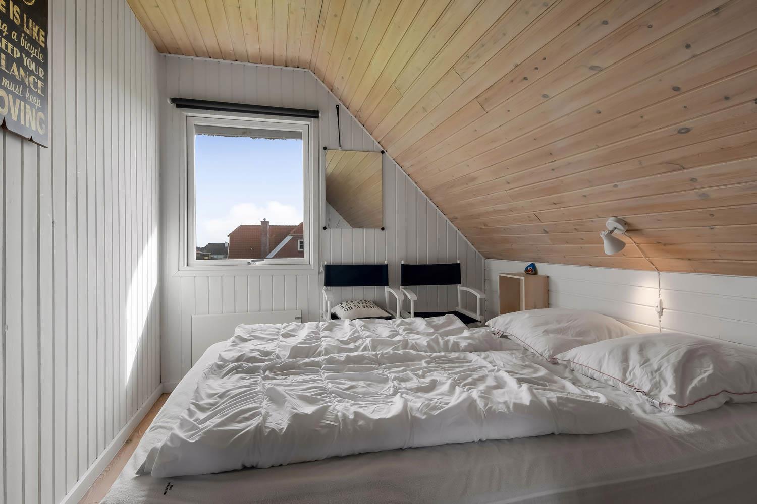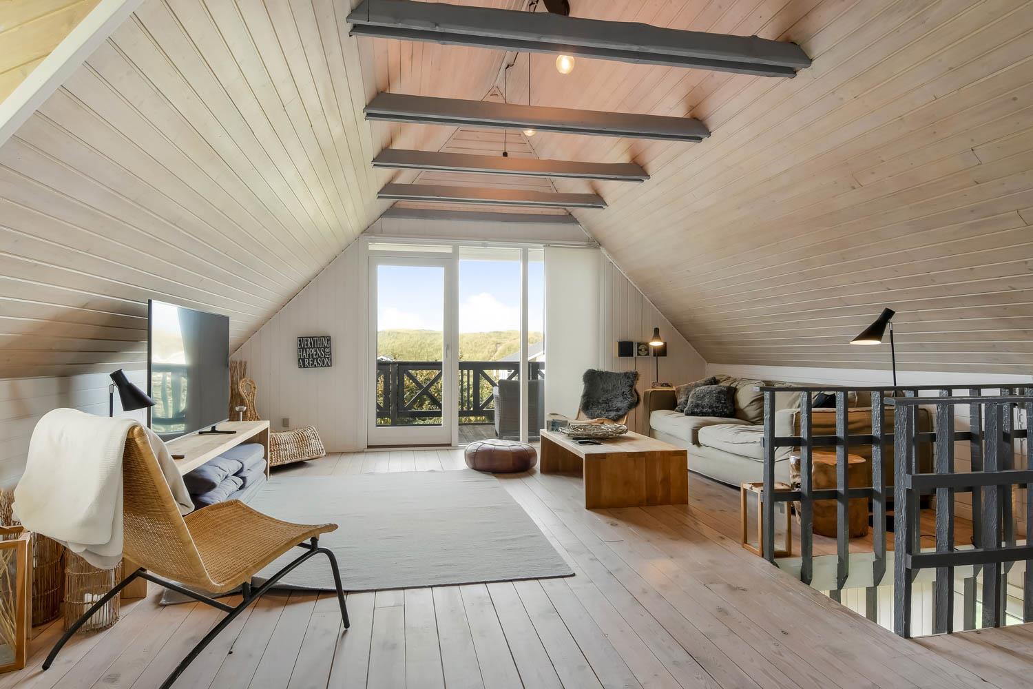 Via den brugervenlige trappe i opholdsstuen kommer I let op på 1. Etage. Her er der endnu et dejligt opholdsrum. FRA ET 55” SMARTTV KAN DER NYDES UNDERHOLDING FRA BLANDT ANDET DANSK TV1 OG TV 2 OG FRA DE UTALLIGE TYSKE OG ANDRE UDENLANDSKE SATELLIT PROGRAMMER. SMARTTV’ET GIVER ENDVIDERE MULIGHED FOR STREAMING AF EGNE ABONNEMENTER AF BLANDT ANDET NETFLIX, HBO OG VIAPLAY. DER ER OGSÅ MULIGHED FOR AT LYTTE TIL MUSIK FRA HUSETS BLUETOOTH-HØJTTALER. Nyd flammerne ved den hyggelige brændeovn som sammen med den opsatte varmepumpe i stueetagen sørger for et minimalt forbrug til opvarmning. Udgang til balkon med unik udsigt til Vesterhavet. På 1. etage findes også 2 af de dejlige soverum (1DS, 1DS)