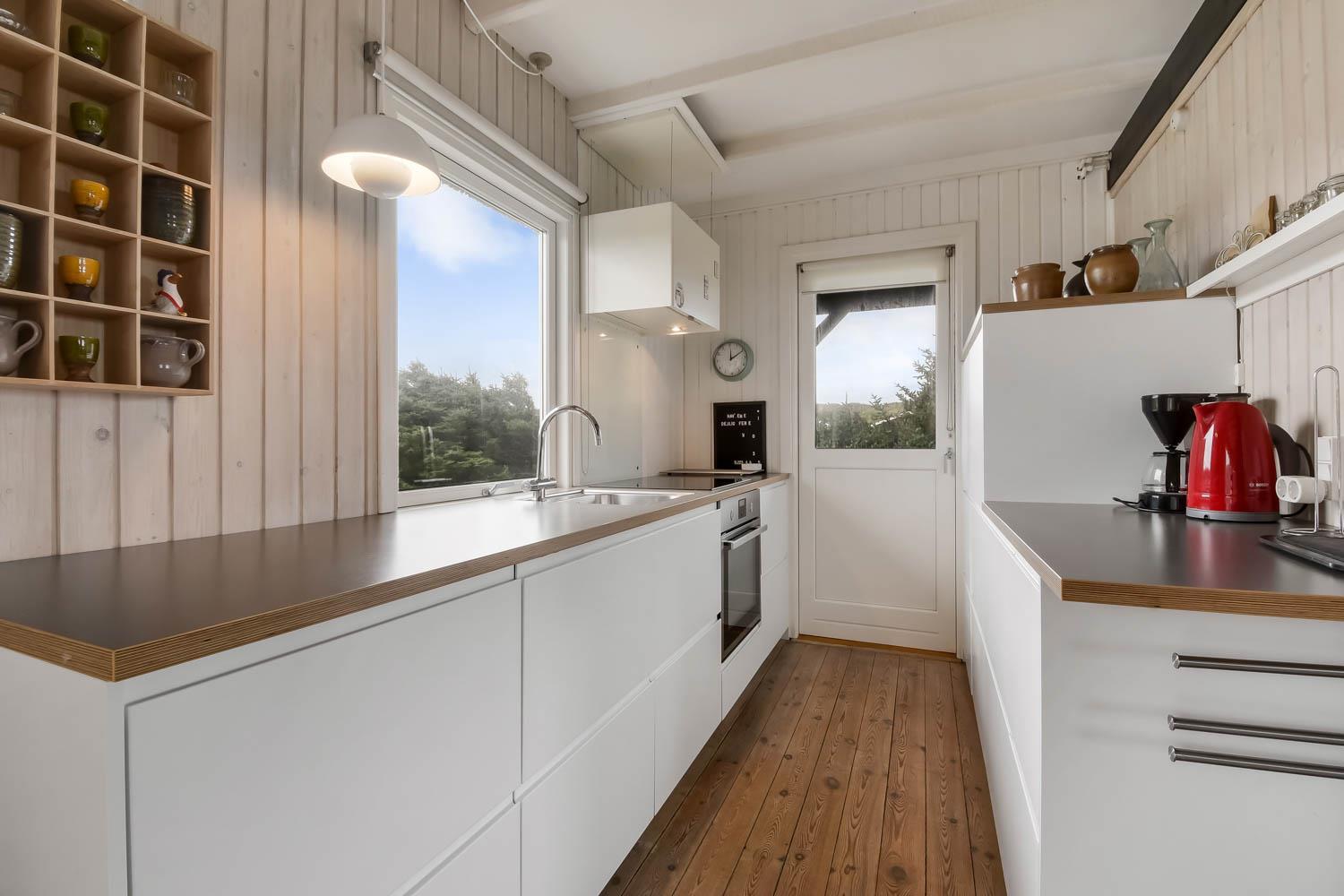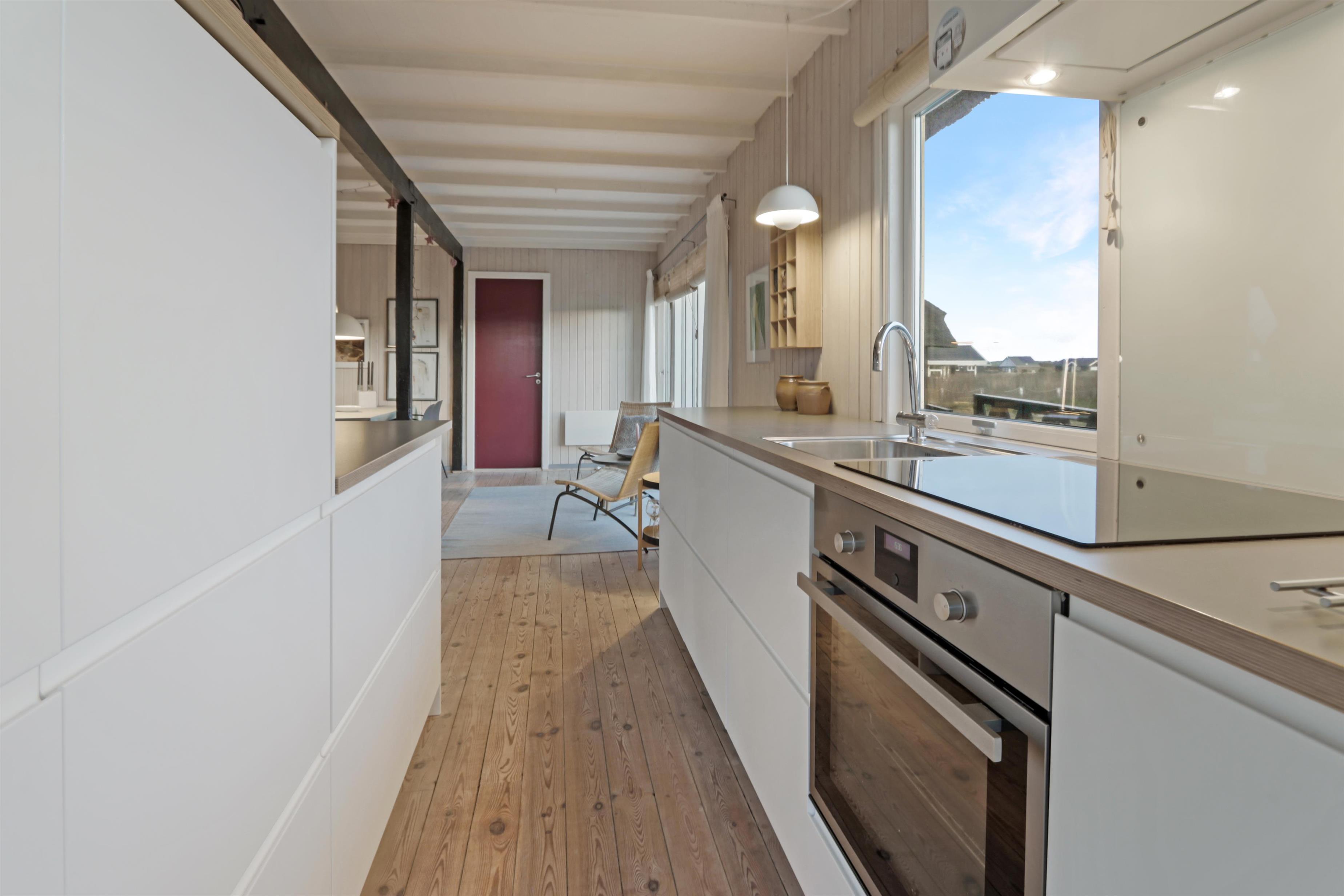 Allerede undervejs ud til dette flotte feriehus, fornemmer man husets fantastiske beliggenhed ved Vesterhavets store klitter. Huset er 104 m2 fordelt på 2 etager. 4 dejlige soverum (1DS, 1DS, 1DS, 1DS) – men må max bebos af 6 personer. Flot, veludstyret køkken / alrum med alt i service / køkkengrej og alt i hårde hvidevarer. Køkkenhjørnet har bl.a. Induktionskomfur, indbygningsovn, mikroovn, emhætte, opvaskemaskine og køleskab med fryseboks. Nyd maden ved spisebordet, kig ud af vinduet og se de store høje klitter direkte ved Vesterhavet eller slap af i de bløde kvalitetsmøbler.