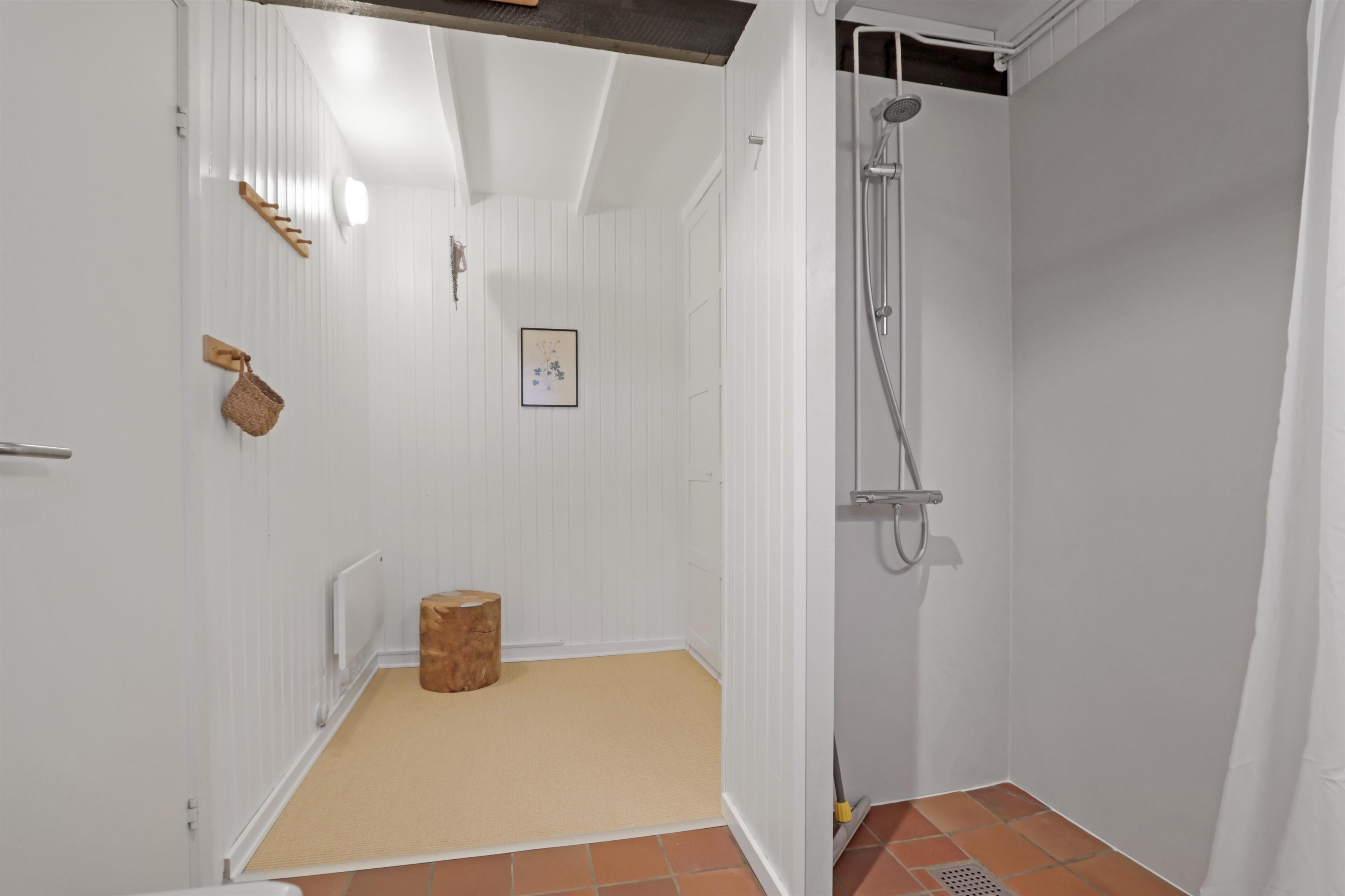 Badeværelse med toilet, bruser, håndvask, vaskemaskine og klinkegulv med gulvvarme. Max. 1 husdyr er tilladt. Ikke-ryger hus.