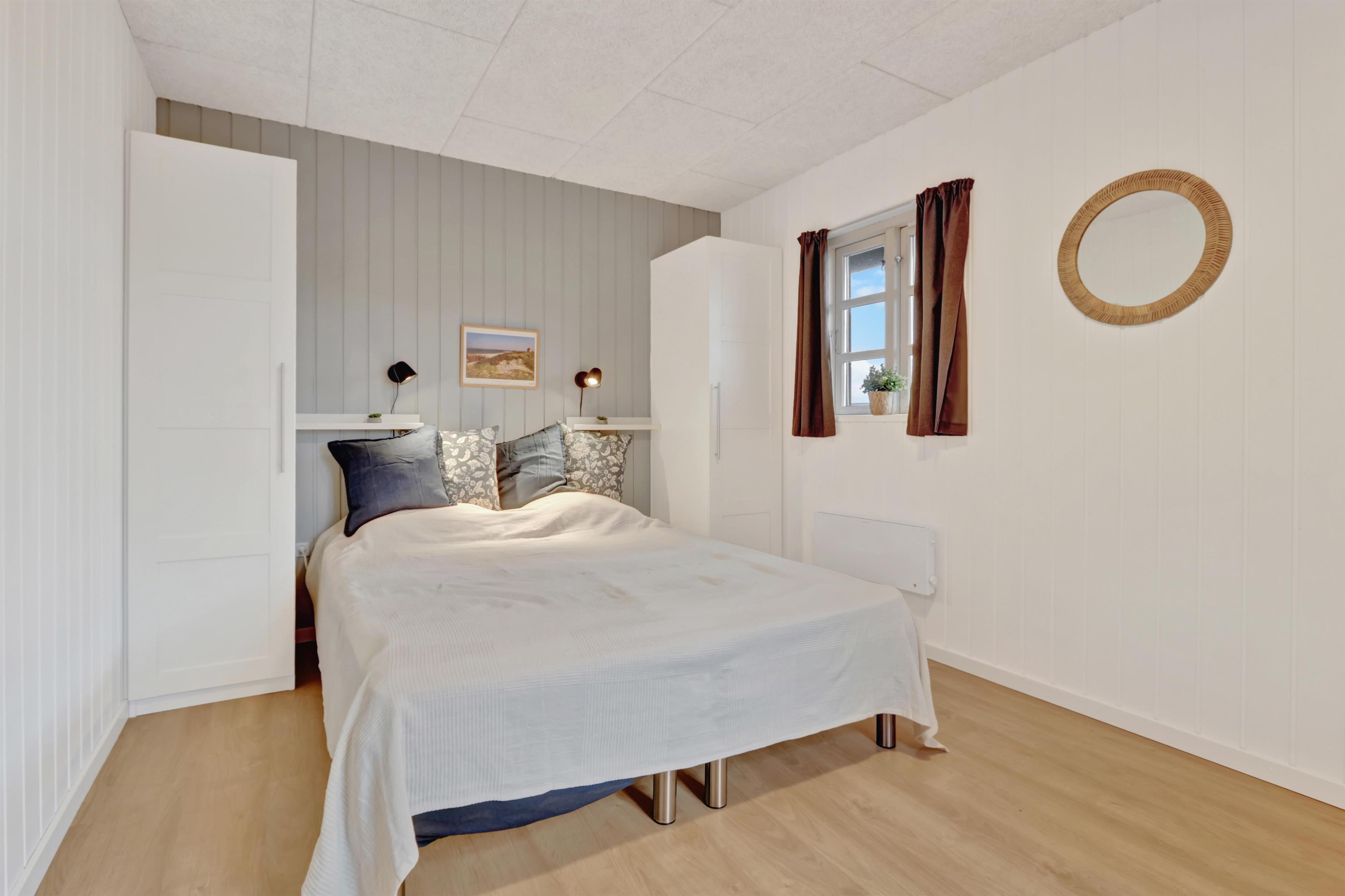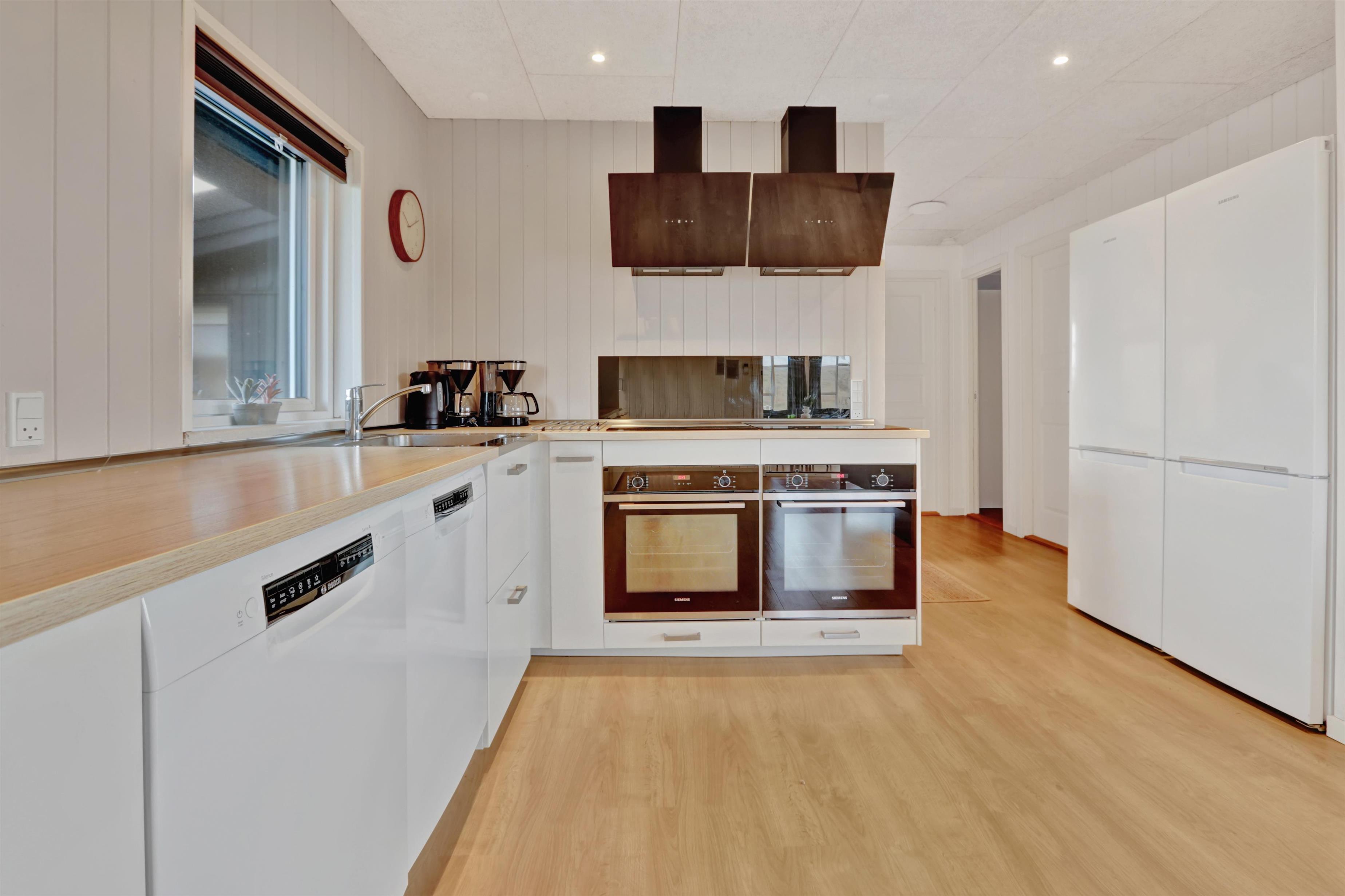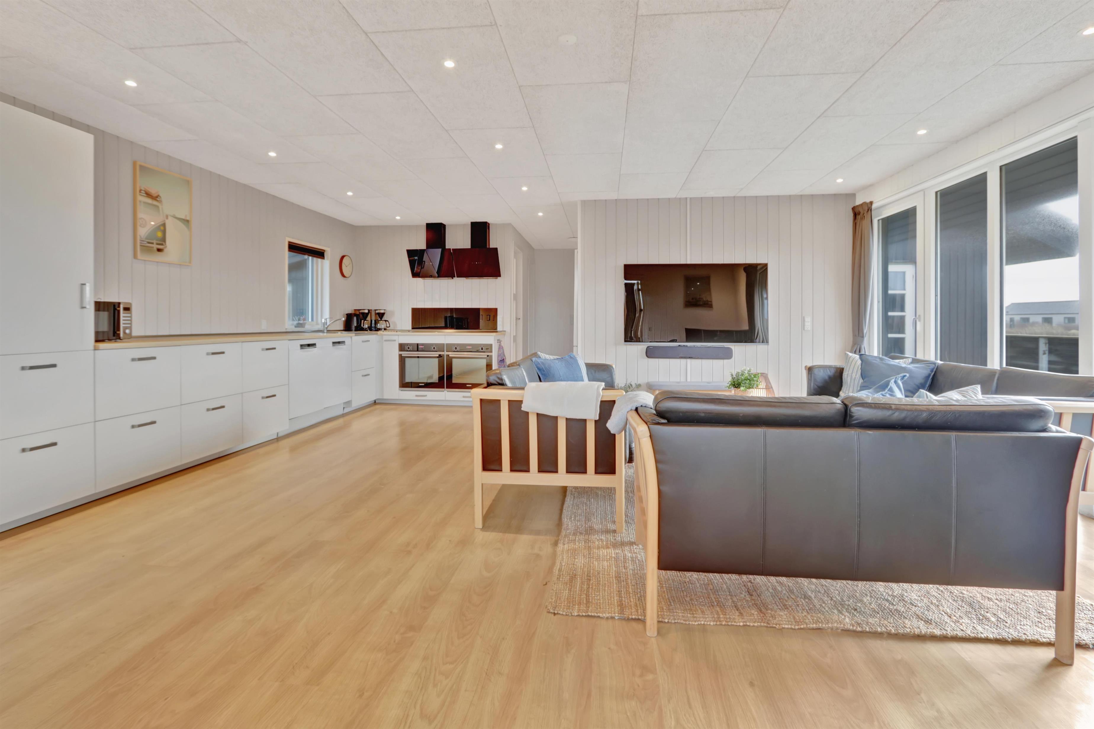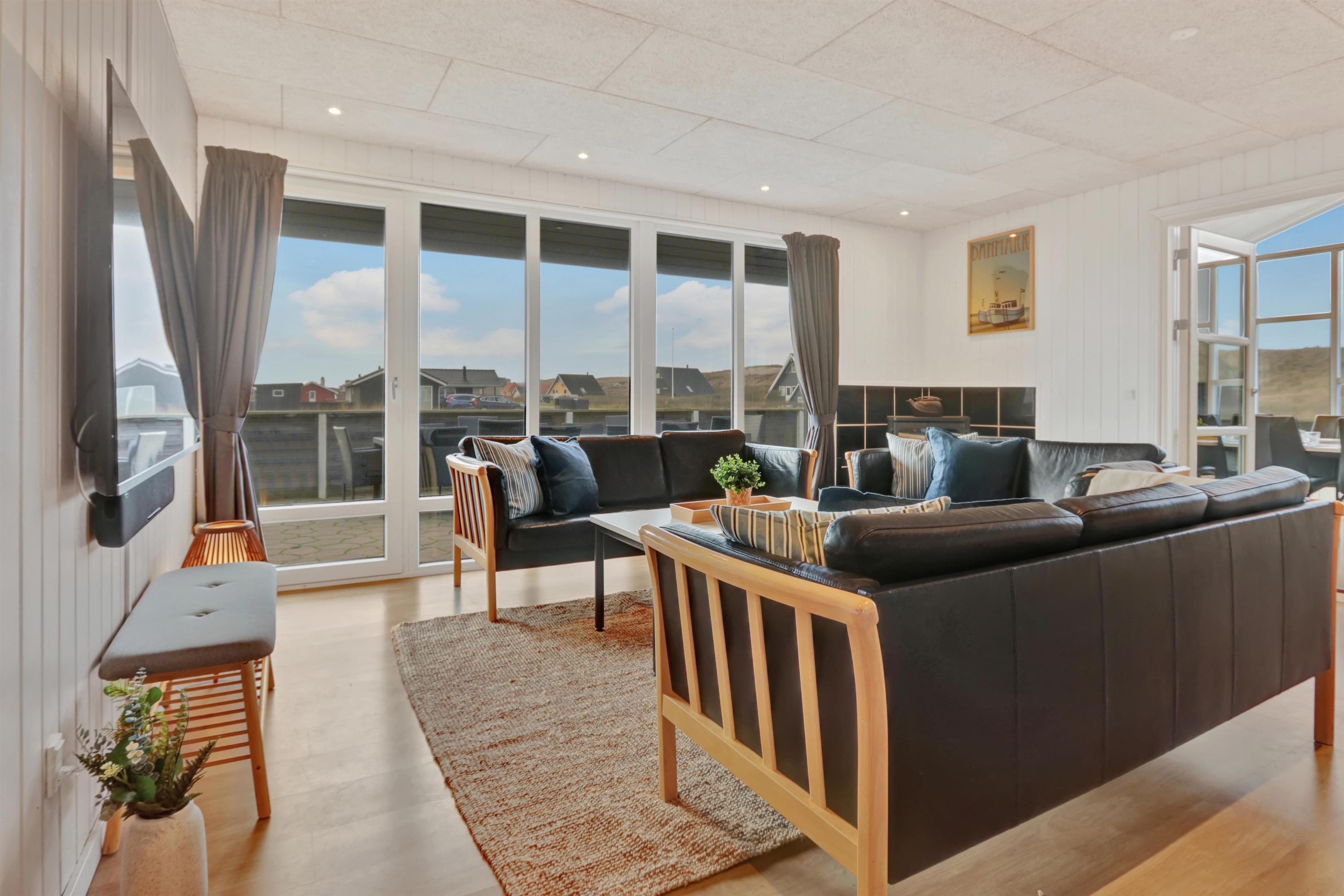 Huset er indrettet med 4 soverum i selve huset, derudover findes der et anneks med plads til to personer. Ligeledes forefindes der en hems i forbindelse med aktivitetsrummet til to personer. Huset indeholder 3 dobbeltsenge samt 4 enkeltsenge og to madrasser på hemsen. Sommerhuset er hele 182m2 stort, og der er derfor rigelig med plads til flere familier. Huset er indrettet med en lille entré med plads til overtøj, derefter går man ind i det store køkken fra 2022 hvor der er dobbelt op på samtlige hvidevarer, to ovne, to opvaskemaskiner, to kogeplader, stort køleskab og fryseskab mm. Køkkenet er kombineret med tv stue med sofagruppe samt 65t fjernsyn og brændeovn. Fra køkkenet er der direkte adgang til spisestuen hvor de store vinduer gør at man kigger direkte op mod klitterne. Huset er ligeledes indrettet med to gode badeværelser med gulvvarme i hver sin ende af huset. i badeværelset ved aktivitetsrummet er der direkte adgang til saunaen. I mellemgangen findes det lille bryggers hvor der findes vaskesøjle med vaskemaskine og tørretumbler. I enden af huset finder man det store aktivitetsrum hvor der er kombibord med poolbord/bordtennis, bordfodbold, sofagruppe med 55t fjernsyn, brændeovn mm. Det er ligeledes herfra der er direkte adgang til husets hems med 2 sovepladser. Huset fremstår lyst over det hele med hvide vægge og lyse laminatgulve samt hvide akustik lofter, så det ikke virker så højlydt når man sidder 12 rundt om spisebordet. Til børnene er der 1 barneseng og 2 barnestole. 2 stk husdyr er tilladt. Huset lejes ikke ud til ungdomsgrupper. Huset har ligeledes Fibernet installeret. Obligatorisk slutrengøring