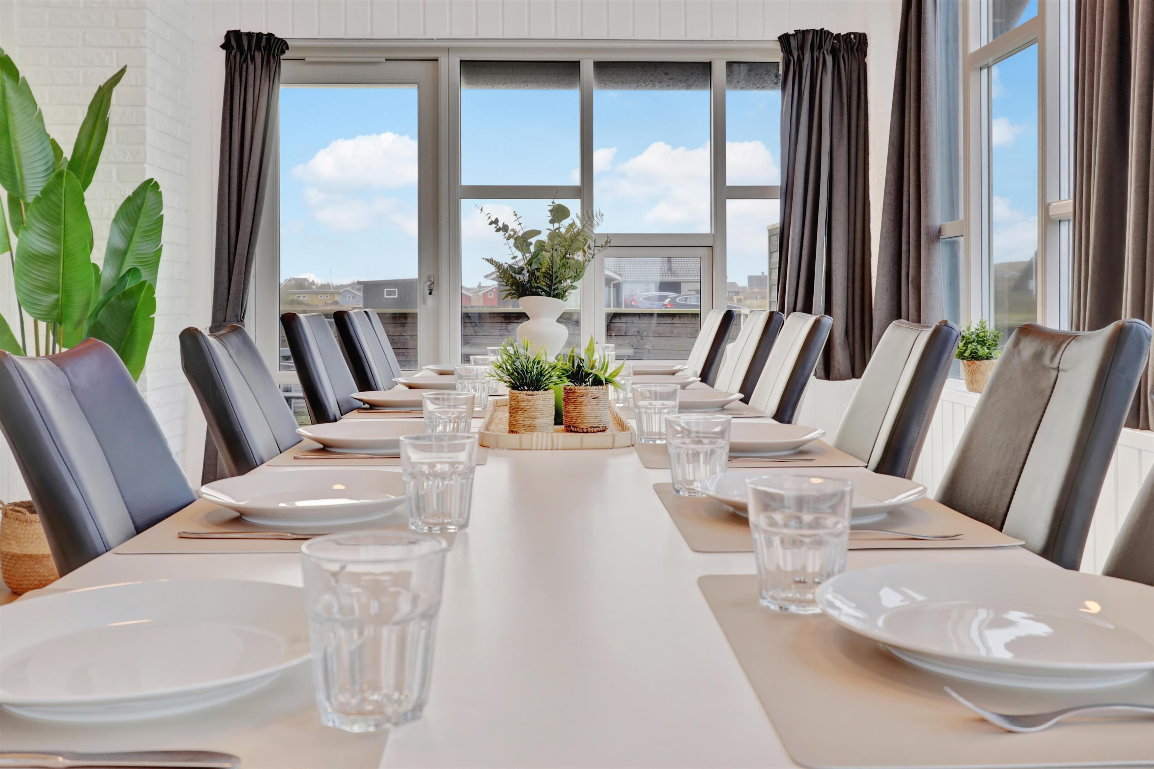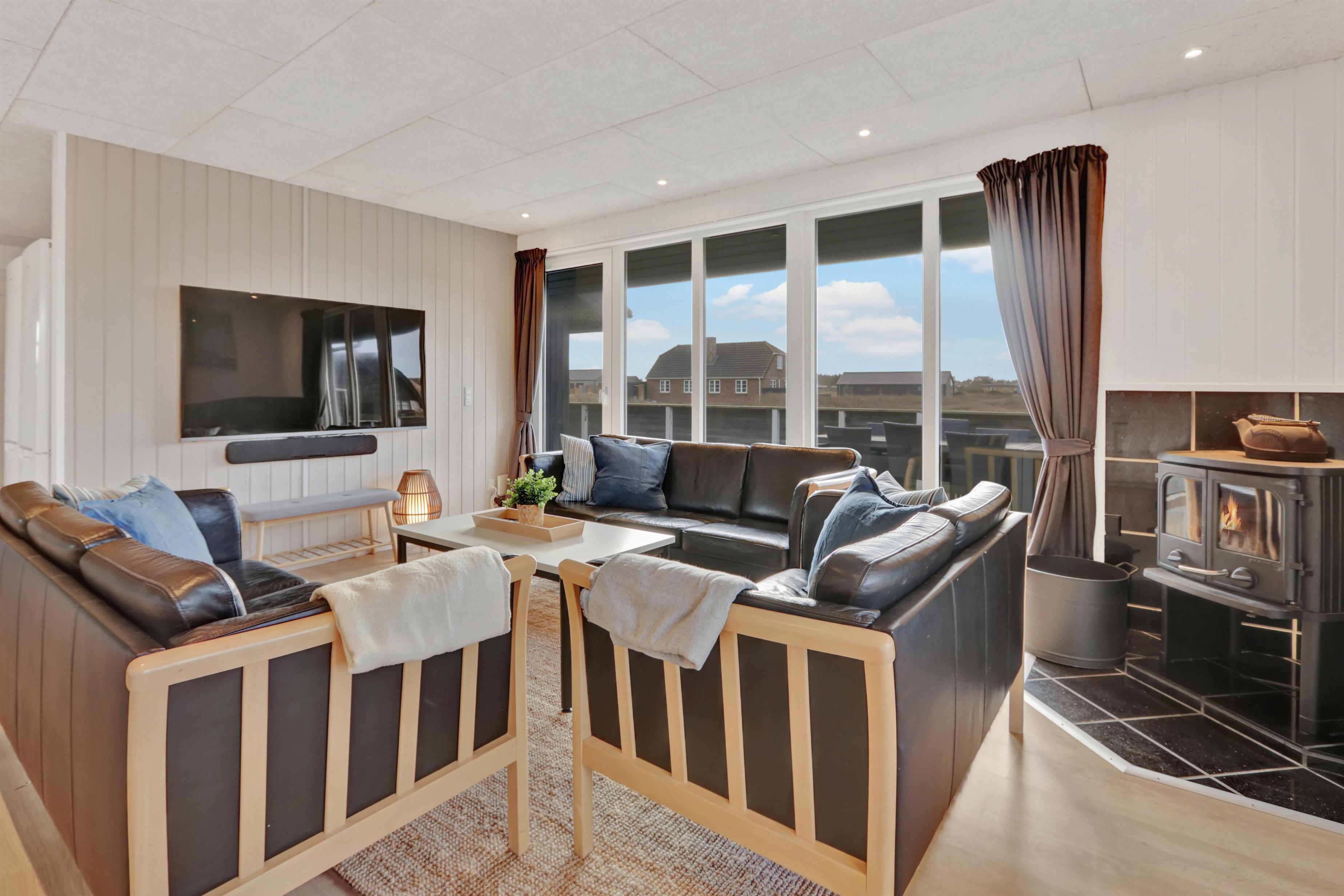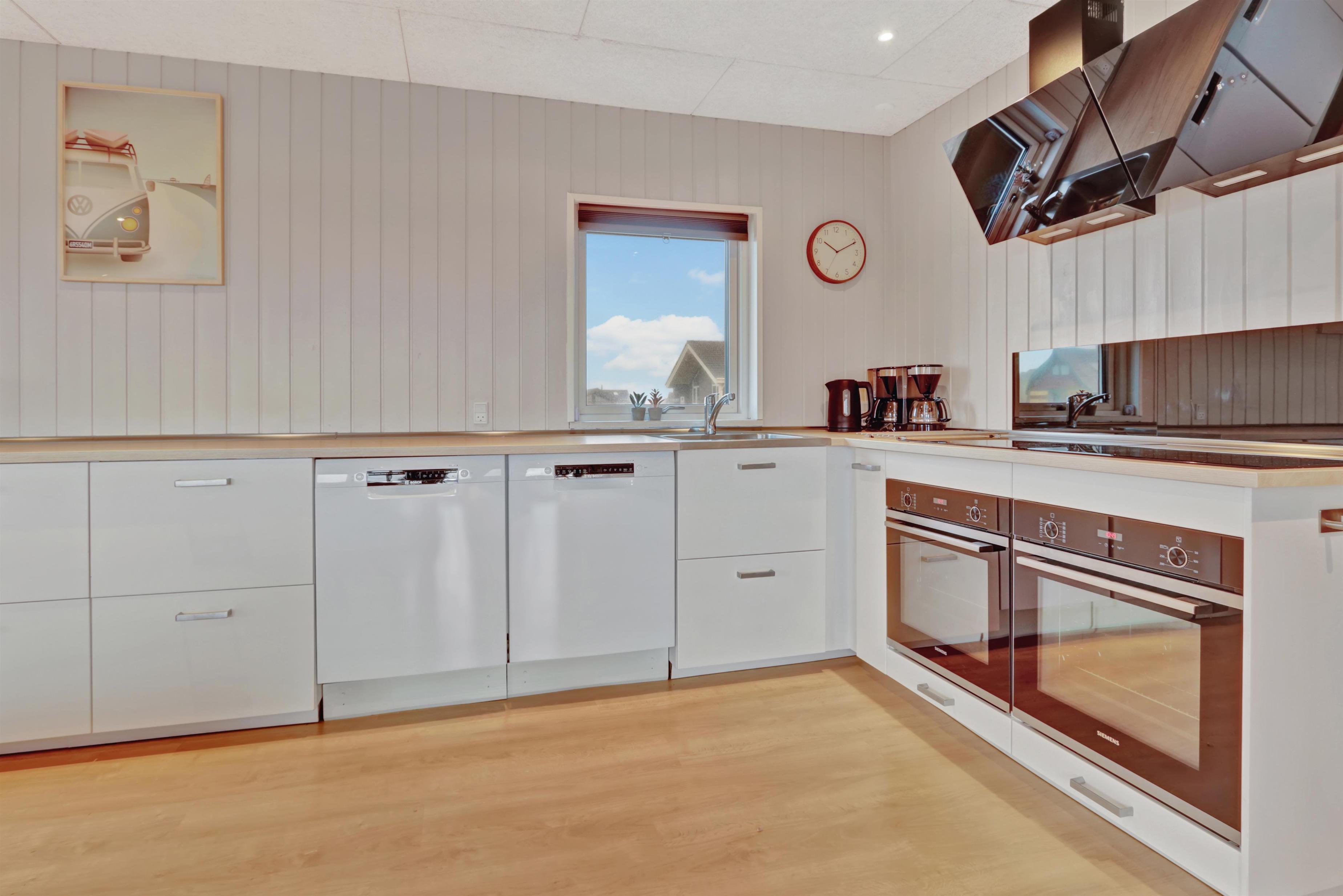 Huset er indrettet med 4 soverum i selve huset, derudover findes der et anneks med plads til to personer. Ligeledes forefindes der en hems i forbindelse med aktivitetsrummet til to personer. Huset indeholder 3 dobbeltsenge samt 4 enkeltsenge og to madrasser på hemsen. Sommerhuset er hele 182m2 stort, og der er derfor rigelig med plads til flere familier. Huset er indrettet med en lille entré med plads til overtøj, derefter går man ind i det store køkken fra 2022 hvor der er dobbelt op på samtlige hvidevarer, to ovne, to opvaskemaskiner, to kogeplader, stort køleskab og fryseskab mm. Køkkenet er kombineret med tv stue med sofagruppe samt 65t fjernsyn og brændeovn. Fra køkkenet er der direkte adgang til spisestuen hvor de store vinduer gør at man kigger direkte op mod klitterne. Huset er ligeledes indrettet med to gode badeværelser med gulvvarme i hver sin ende af huset. i badeværelset ved aktivitetsrummet er der direkte adgang til saunaen. I mellemgangen findes det lille bryggers hvor der findes vaskesøjle med vaskemaskine og tørretumbler. I enden af huset finder man det store aktivitetsrum hvor der er kombibord med poolbord/bordtennis, bordfodbold, sofagruppe med 55t fjernsyn, brændeovn mm. Det er ligeledes herfra der er direkte adgang til husets hems med 2 sovepladser. Huset fremstår lyst over det hele med hvide vægge og lyse laminatgulve samt hvide akustik lofter, så det ikke virker så højlydt når man sidder 12 rundt om spisebordet. Til børnene er der 1 barneseng og 2 barnestole. 2 stk husdyr er tilladt. Huset lejes ikke ud til ungdomsgrupper. Huset har ligeledes Fibernet installeret. Obligatorisk slutrengøring