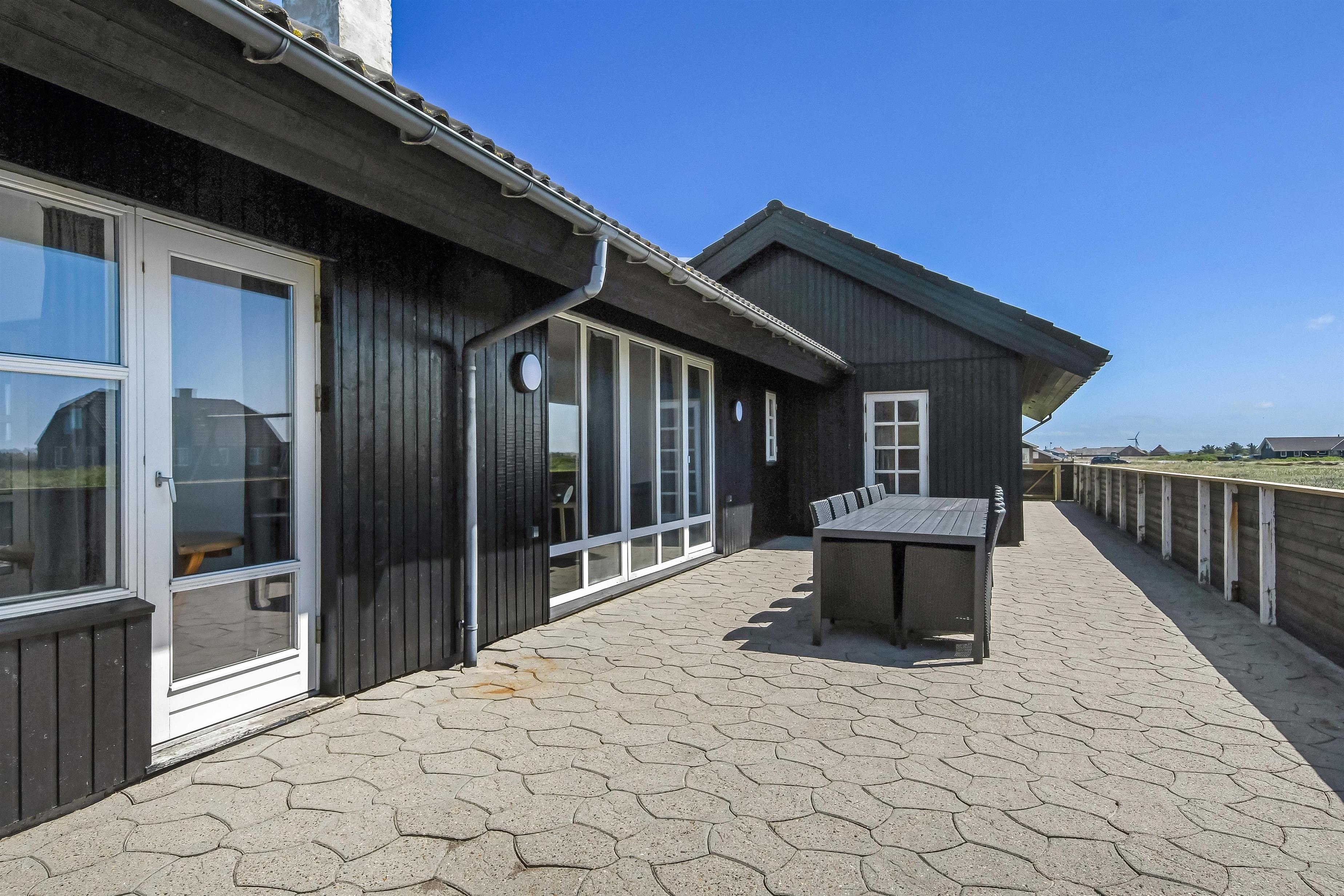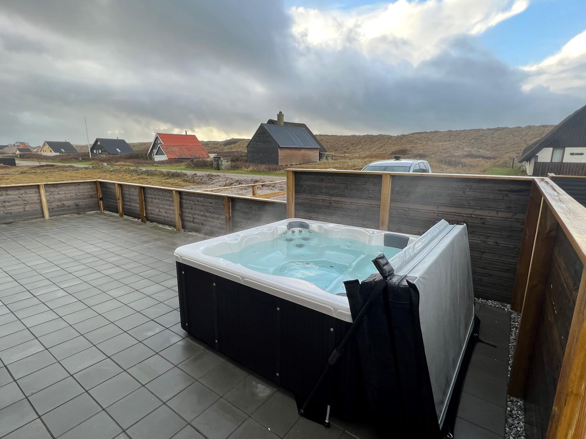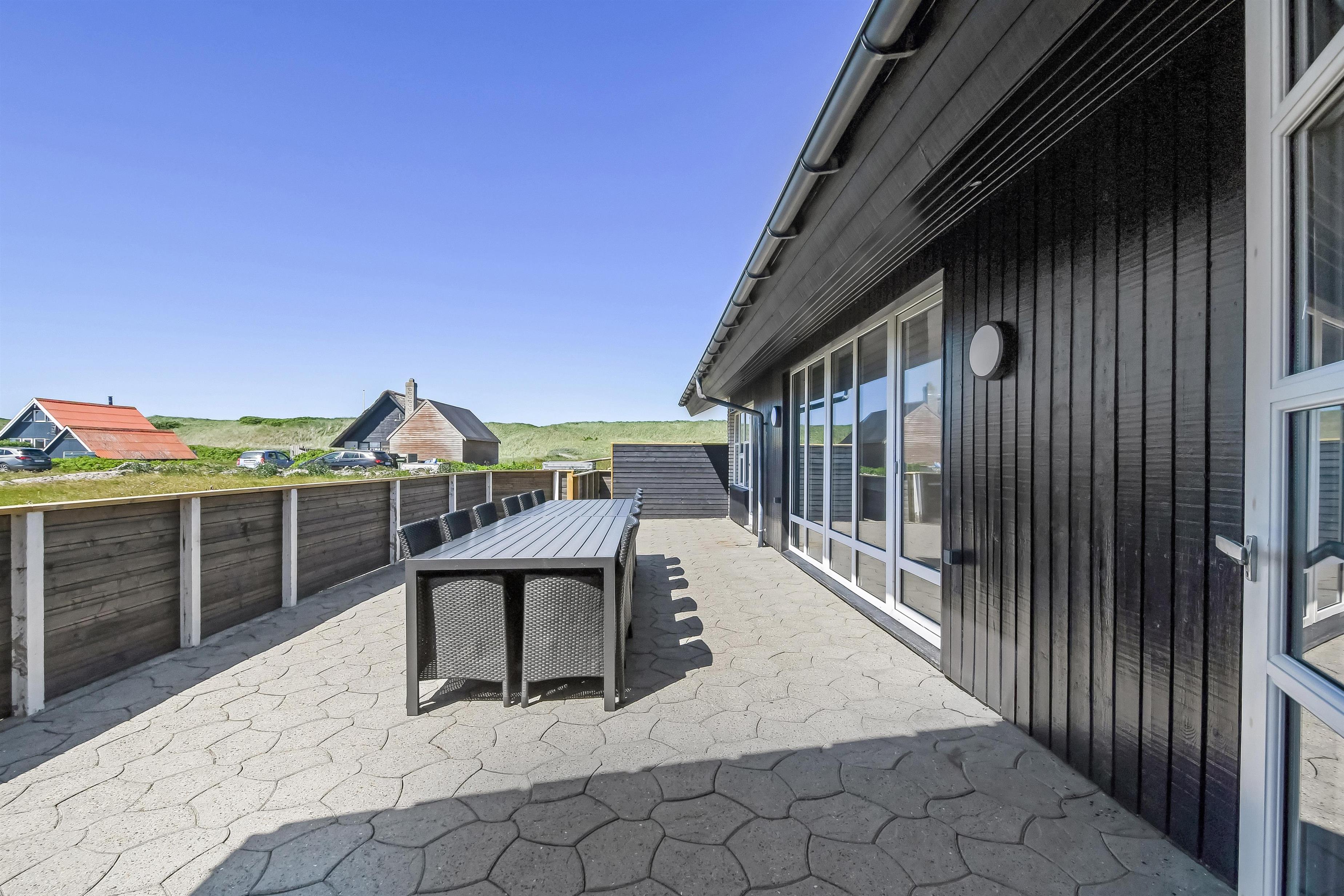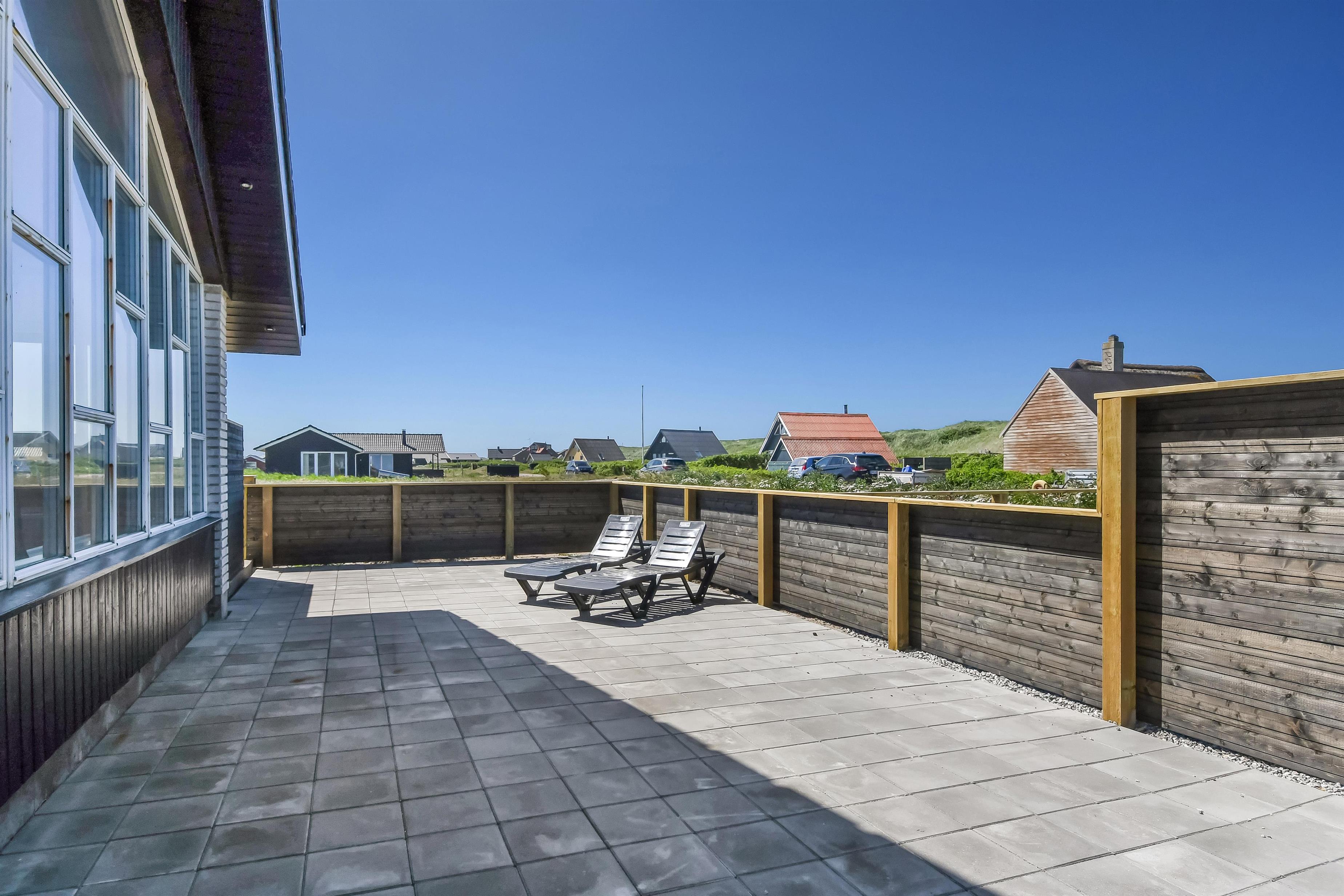 Huset er beliggende på en fantastisk 2500m2 stor naturgrund beliggende i 2. række til det brusende Vesterhav. Fra aktivitetsrummet samt fra stuen og spisestuen er der direkte adgang til husets 130m2 store flisebelagte terrasse. Terrassen er ligeledes lukket med en stakit højde på cirka 1 meter. Helt speciel oplevelse at sidde i den udendørs spa på de mørke aftener med den klare stjernehimmel, ren terapi for sjæl og krop eller måske en frisk dukkert i Vesterhavet som er lige på den ande side af klitterne. Der er 2 km til indkøb samt aktiviteter i Harboøre Hallen.
